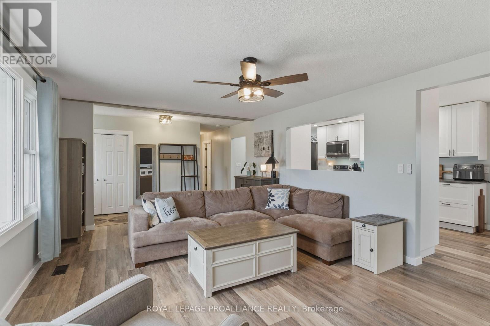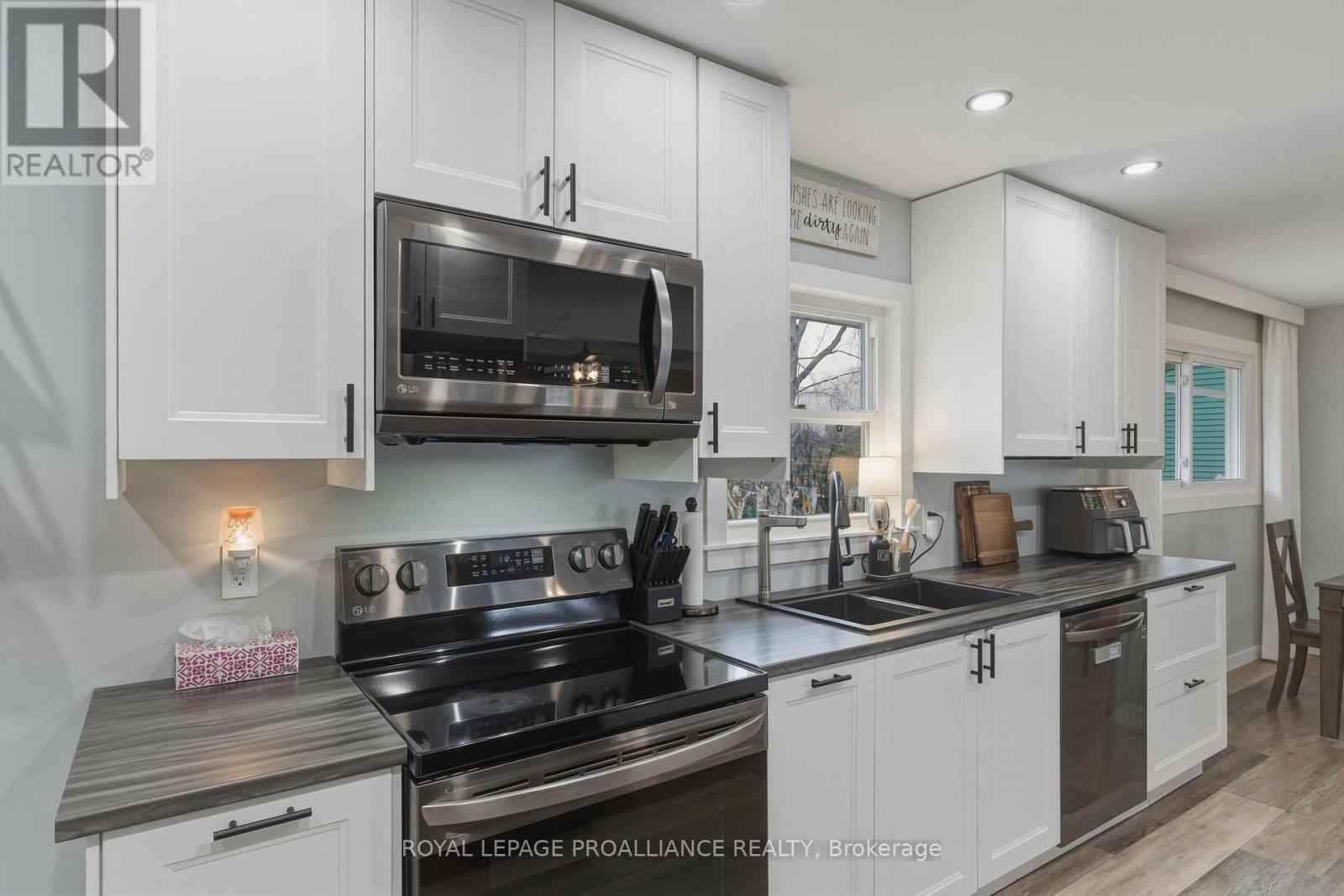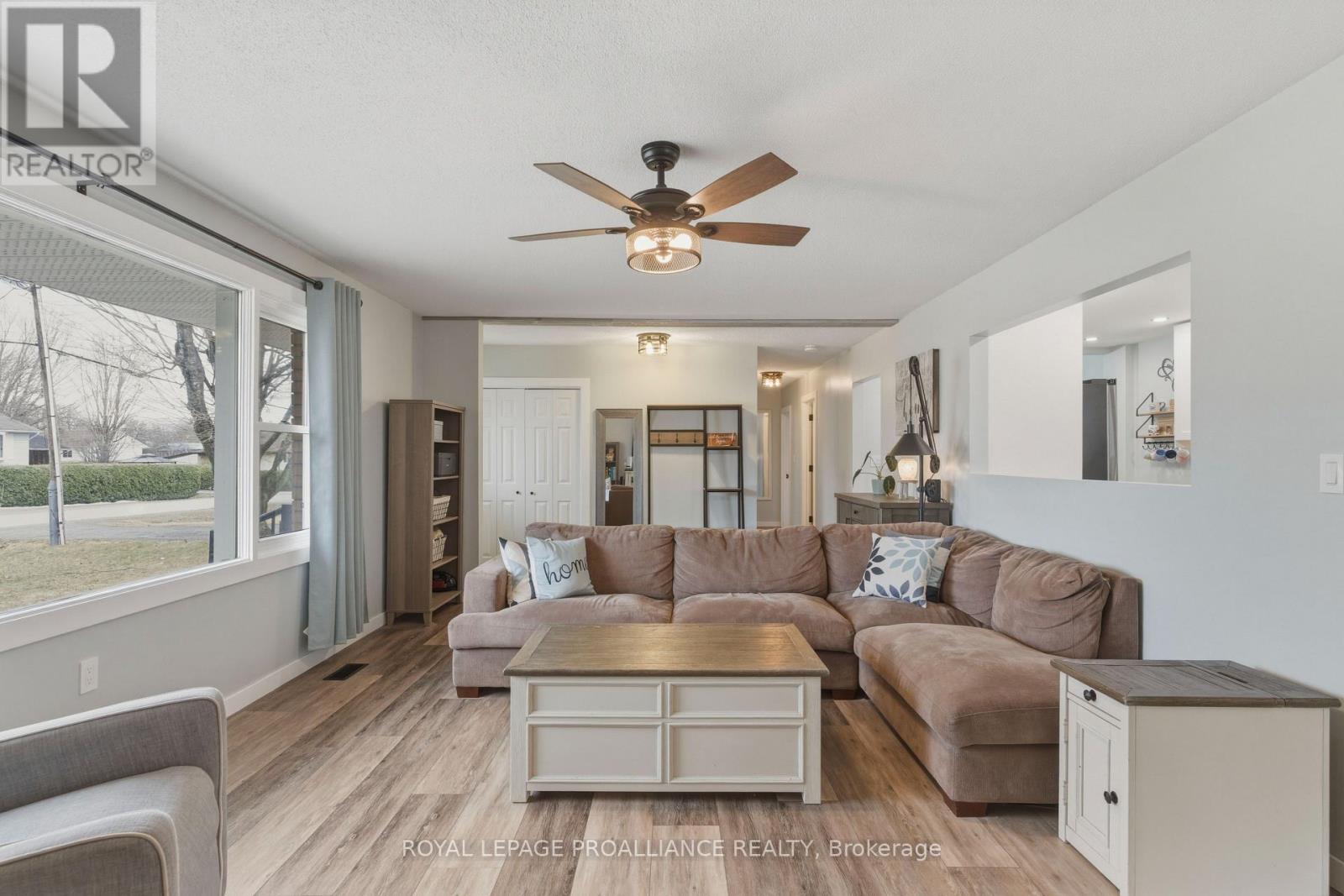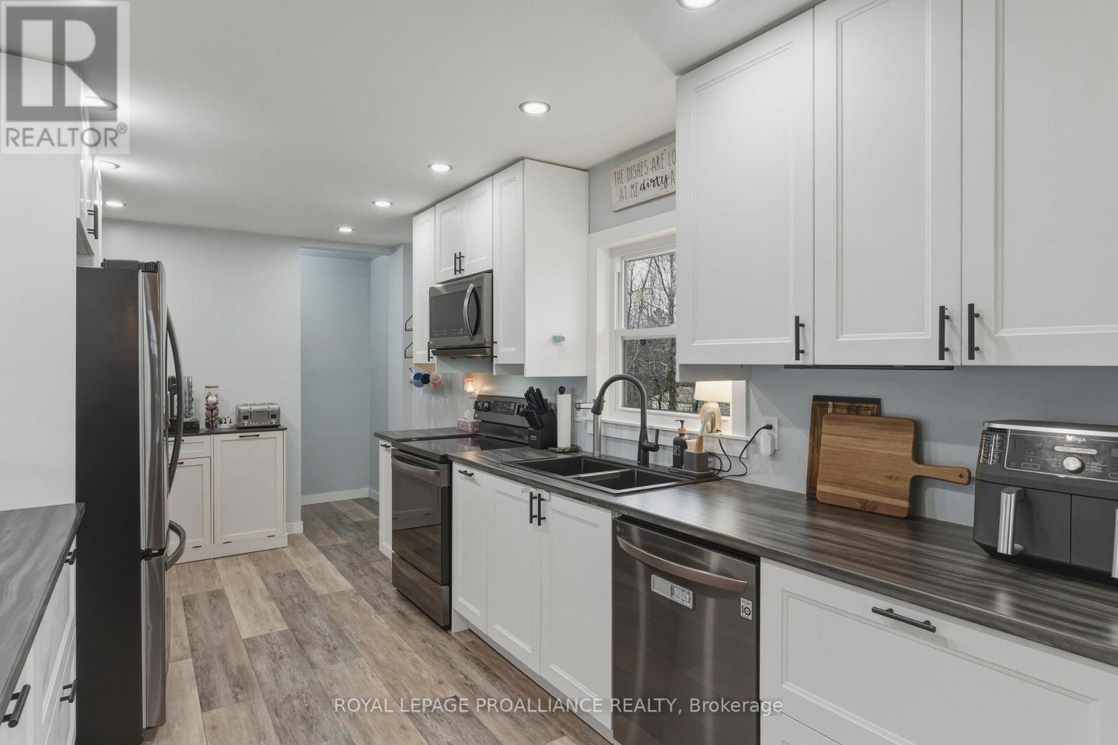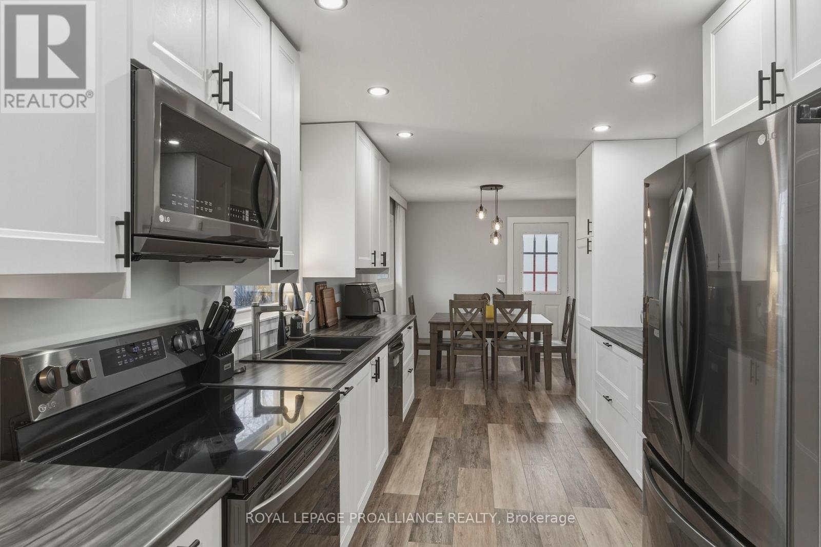 Beautifully updated in 2022, this 3-bedroom bungalow in Brockville's desirable north end offers functional and move-in ready living. The bright and spacious living room features a large front window that fills the space with natural light, while the modern kitchen is finished with soft-close cabinetry, dedicated pot and pan drawers, and updated stainless steel appliances. Wide vinyl plank flooring flows seamlessly throughout, creating a clean and cohesive feel. Additional updates include a forced air furnace (22'), metal roof, new shed (22'), and a fully renovated bathroom with a new vanity, LED mirror, and bathtub surround (22'). Motorized blackout blinds in 2 bedrooms, while all bedrooms are equipped with modern remote-controlled ceiling fans. A sump pump (22') provides added peace of mind, while the double-wide driveway adds everyday convenience. Ideally located close to schools, parks, and all of Brockville's amenities, this is a home you can simply move into and enjoy. (id:28469)