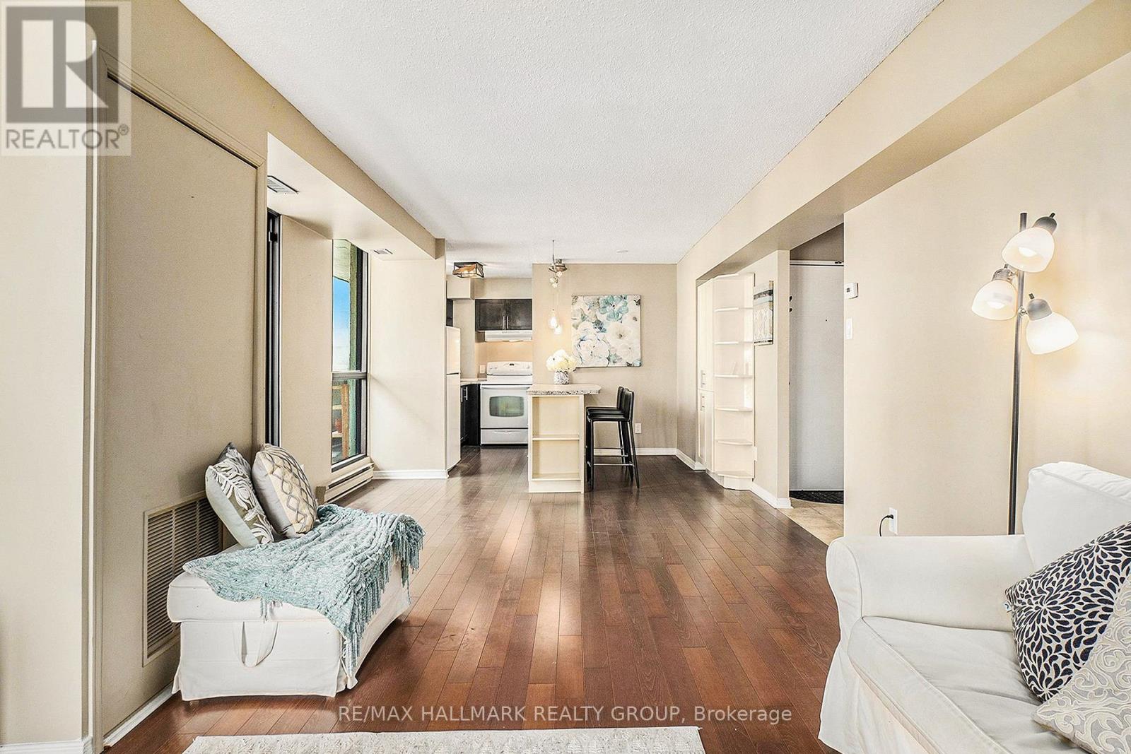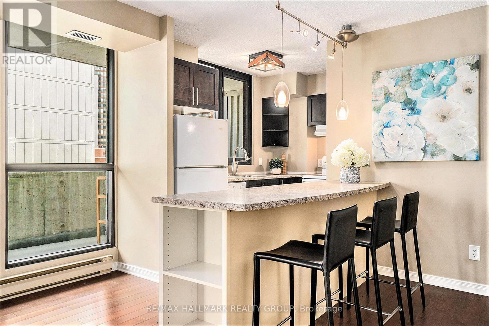 Welcome to downtown living with wonderful walkability to everything! This large, bright one bedroom and one bath home is moments from the LRT and walkable to Parliament Hill and now minutes away from a Food Basics just around the corner on Queen St. Updated kitchen features a large island for breakfast or as a work station. Extra built ins hold the essentials and much more. The open concept living and dining room space provide plenty of room for entertaining guests. With oversized windows and patio doors leading to a large balcony with great views of the downtown core - Ensuite laundry. Plus modern updated bath. Underground parking included. Pets are allowed with some restrictions. Windows (2016), new furnace/AC (2023), Hot Water Tank (2024) owned. Call today! (id:28469)
