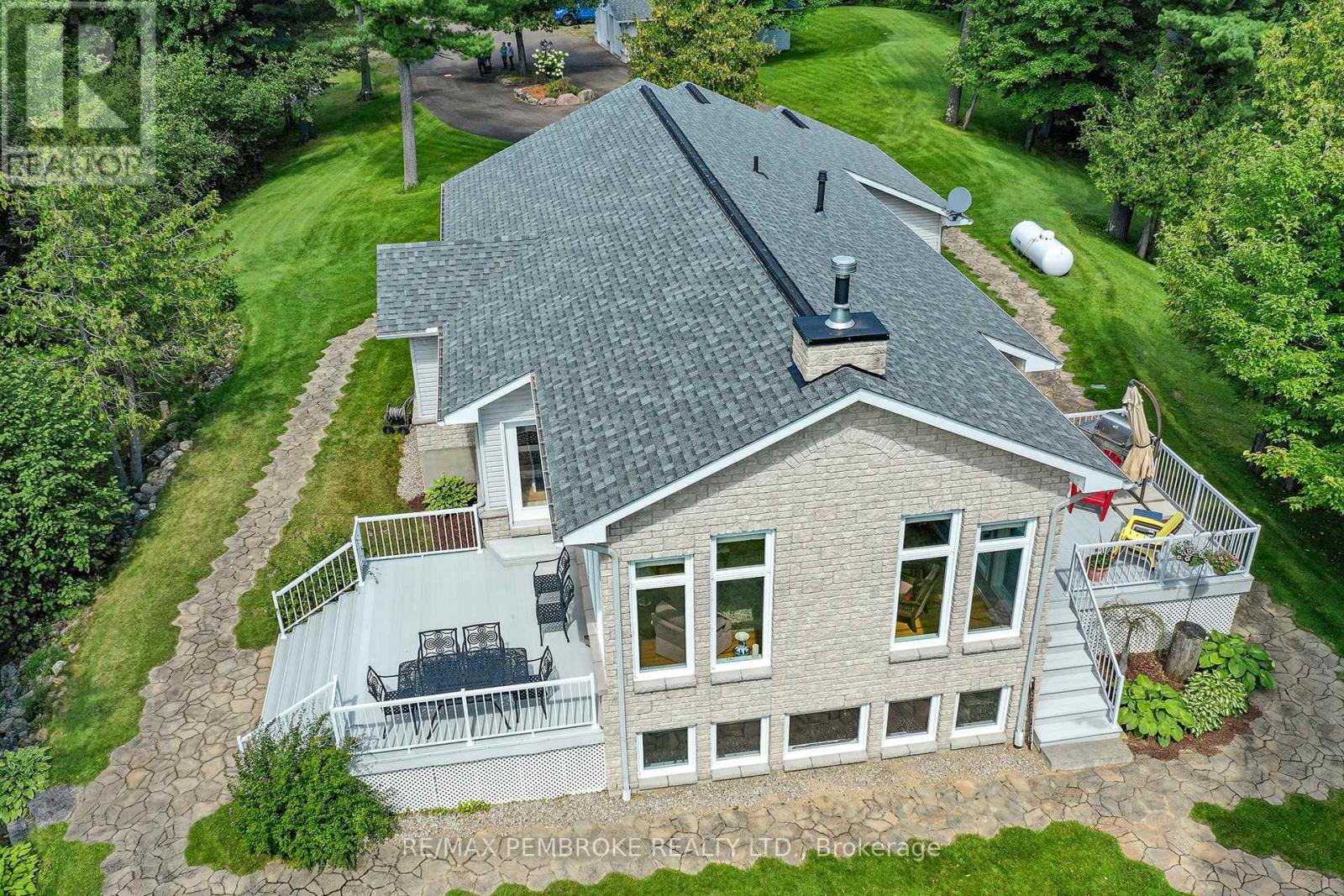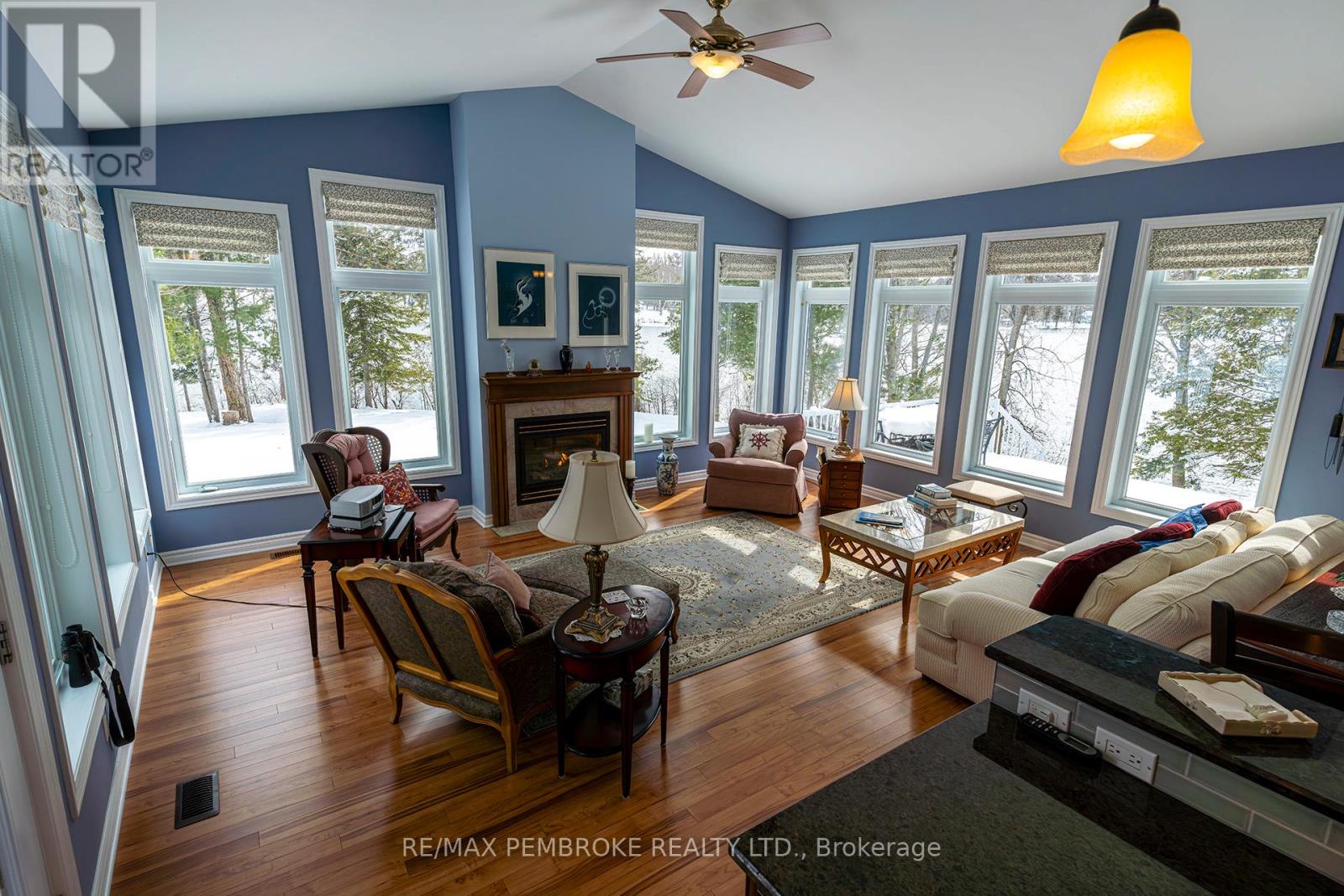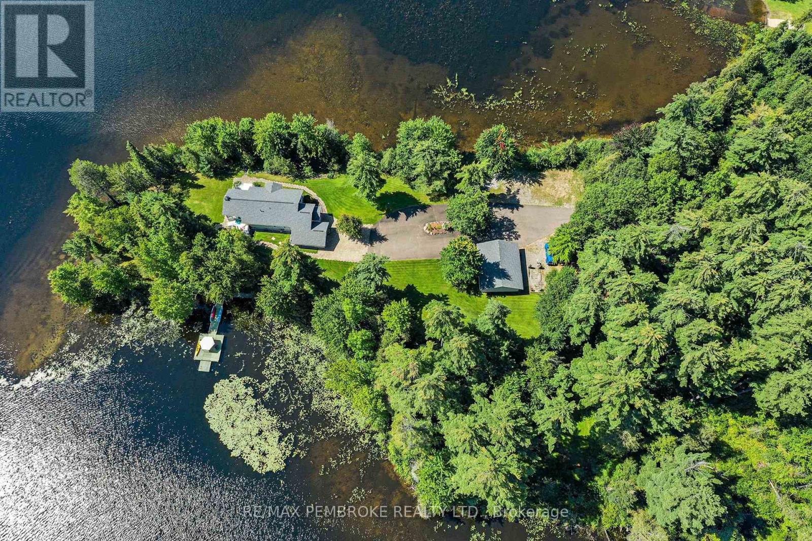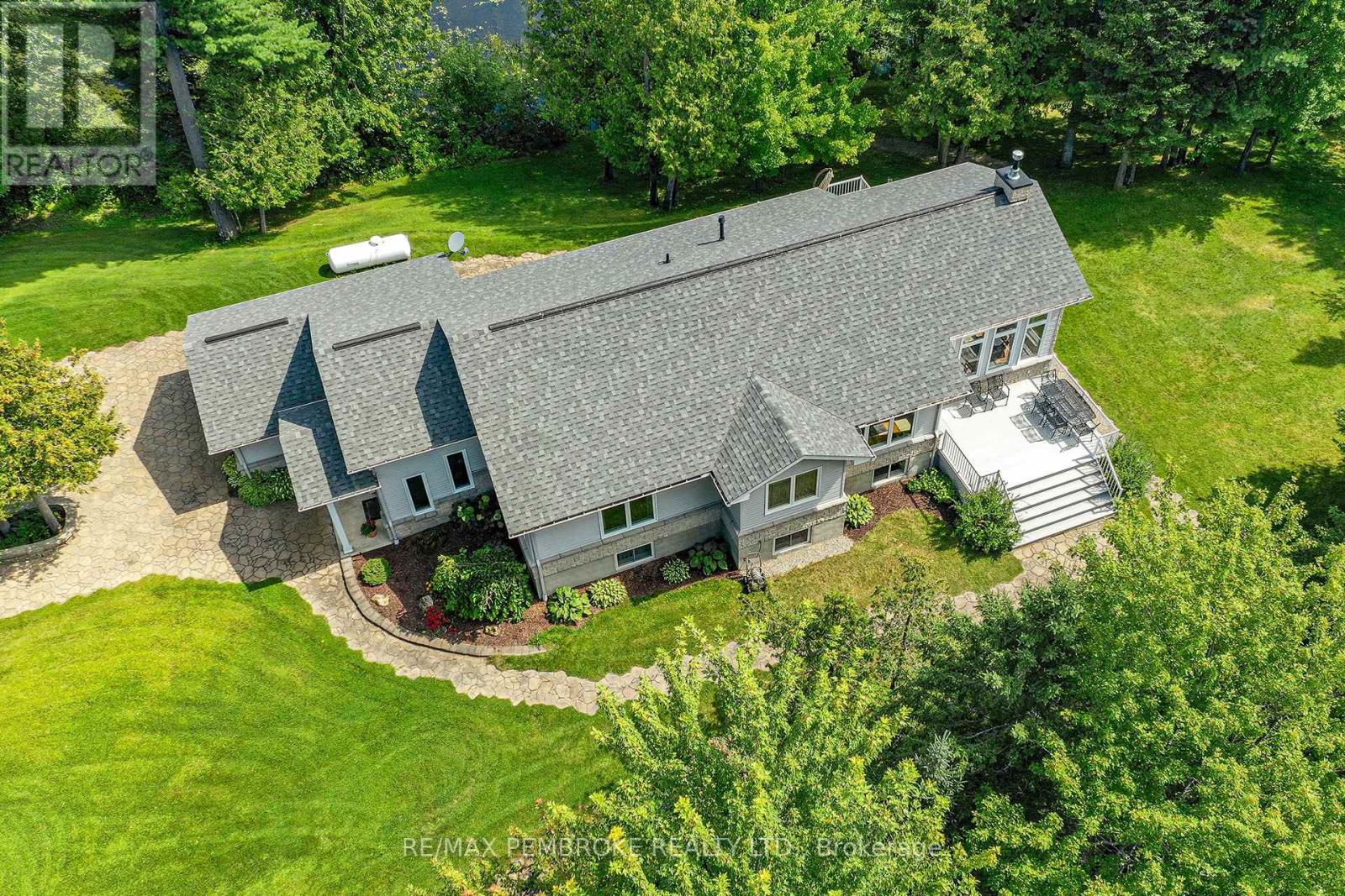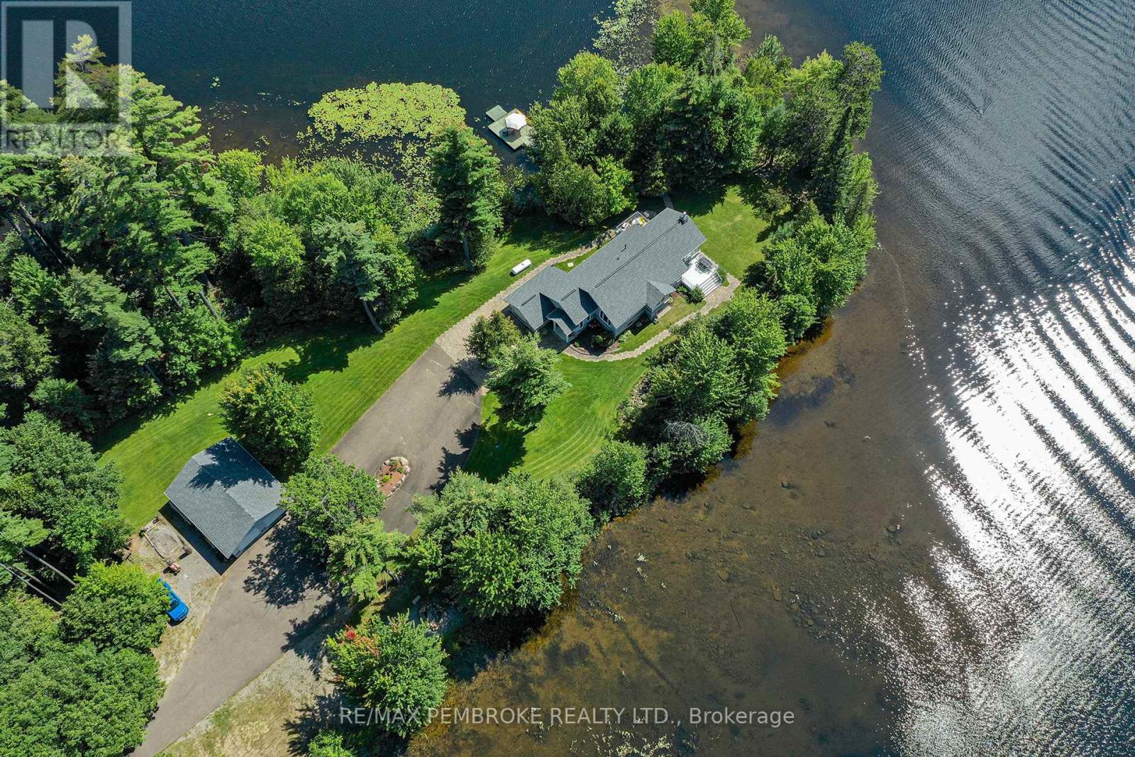 STUNNING LAKEFRONT home situated on private, estate like 5 acre lot with over 1100 feet of shoreline on desirable GOLDEN LAKE. Built on a breathtaking peninsula surrounded by WATERFRONT (east/west/south) with MATURE PINES & glorious all day sunshine. This high quality ZOMERS custom built 3 bed, 3 bath OPEN CONCEPT bungalow is bursting with high end features throughout. CAPITVATING PANORAMIC Lakes views surround you from all rooms on the main level thanks to the oversized windows, TALL 9ft ceilings, custom hardwood kitchen with granite counter tops & large Island, formal dining area with access to outdoor deck for outdoor summer dinners. LARGE living room area with vaulted ceiling and gas fireplace. Oversized primary bedroom with spa like ensuite bathroom & walk in closet, OVERSIZED mudroom with main floor laundry. TALL & bright finished lower level features; bar, LARGE rec room with gas fireplace, 3rd bedroom, gym area (could easily be space for 4th/5th bedroom), 3rd full bathroom and walk out direct access to the attached garage. this home has a ICF (insulated concrete form) foundation & radiant heated floors (lower level , kitchen, bathrooms). PRIVACY & TRANQUILITY awaits you outside with: extensive landscaping, two separate decks on opposite sides of the house, lush flat yard, 90ft of floating dock to moor your boats, plus your own private sandy beach and fire pit. Attached OVERSIZED 1 car garage and a second detached garage (28ft x36ft). The home is hardwired with a full sized Generator in case of power outages, Irrigation, Gated entry, FULL Paved Driveway, NEW shingles 2023 on house and detached garage. START making YOUR Lakefront memories a reality by, boating, fishing, swimming paddle boarding, kayaking, water skiing, tubing, ice fishing or snowmobiling! Just 600m off ON-60. 10mins to Eganville, 25mins to Pembroke, 85 mins to Ottawa. (id:28469)