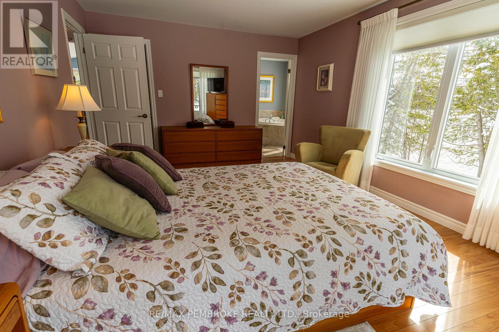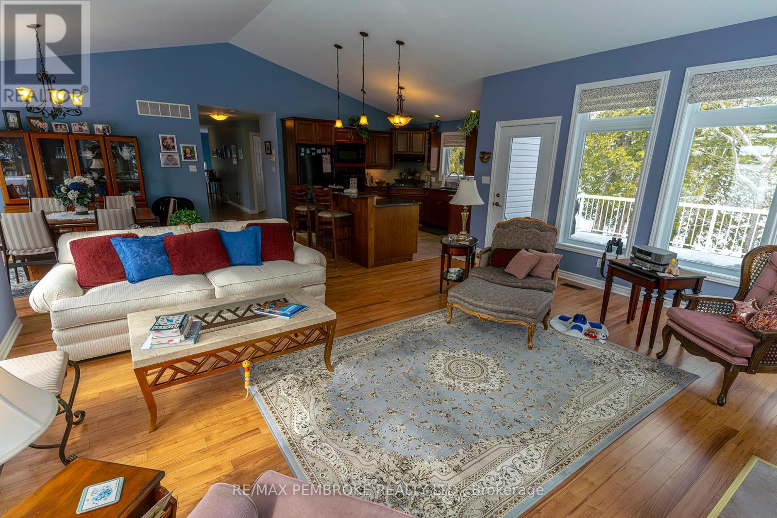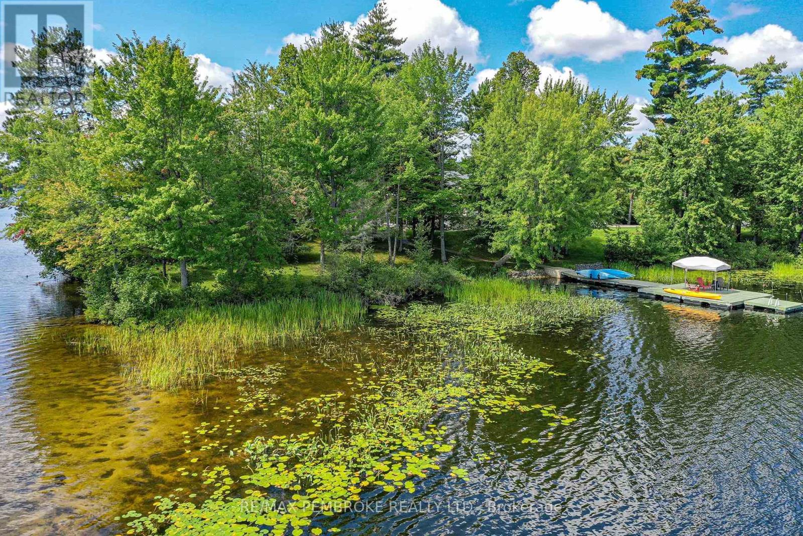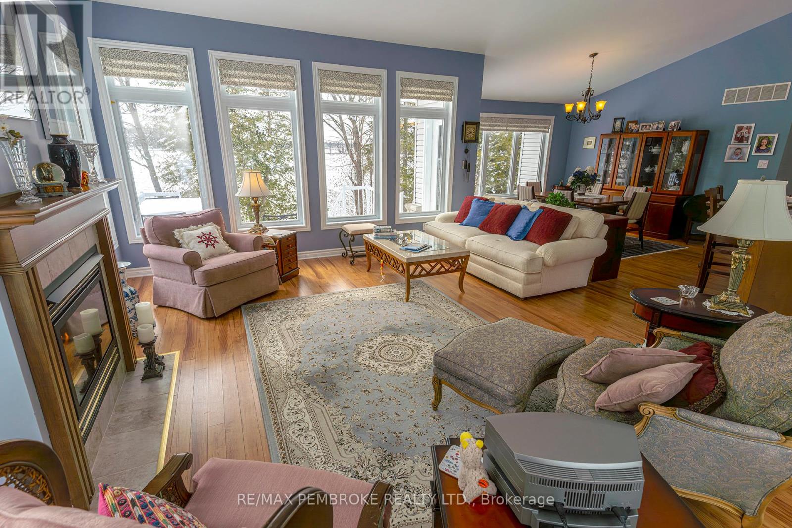 STUNNING LAKEFRONT home situated on private, estate like 5 acre lot with over 1100 feet of shoreline on desirable GOLDEN LAKE. Built on a breathtaking peninsula surrounded by WATERFRONT (east/west/south) with MATURE PINES & glorious all day sunshine. This high quality ZOMERS custom built 3 bed, 3 bath OPEN CONCEPT bungalow is bursting with high end features throughout. CAPITVATING PANORAMIC Lakes views surround you from all rooms on the main level thanks to the oversized windows, TALL 9ft ceilings, custom hardwood kitchen with granite counter tops & large Island, formal dining area with access to outdoor deck for outdoor summer dinners. LARGE living room area with vaulted ceiling and gas fireplace. Oversized primary bedroom with spa like ensuite bathroom & walk in closet, OVERSIZED mudroom with main floor laundry. TALL & bright finished lower level features; bar, LARGE rec room with gas fireplace, 3rd bedroom, gym area (could easily be space for 4th/5th bedroom), 3rd full bathroom and walk out direct access to the attached garage. this home has a ICF (insulated concrete form) foundation & radiant heated floors (lower level , kitchen, bathrooms). PRIVACY & TRANQUILITY awaits you outside with: extensive landscaping, two separate decks on opposite sides of the house, lush flat yard, 90ft of floating dock to moor your boats, plus your own private sandy beach and fire pit. Attached OVERSIZED 1 car garage and a second detached garage (28ft x36ft). The home is hardwired with a full sized Generator in case of power outages, Irrigation, Gated entry, FULL Paved Driveway, NEW shingles 2023 on house and detached garage. START making YOUR Lakefront memories a reality by, boating, fishing, swimming paddle boarding, kayaking, water skiing, tubing, ice fishing or snowmobiling! Just 600m off ON-60. 10mins to Eganville, 25mins to Pembroke, 85 mins to Ottawa. (id:28469)