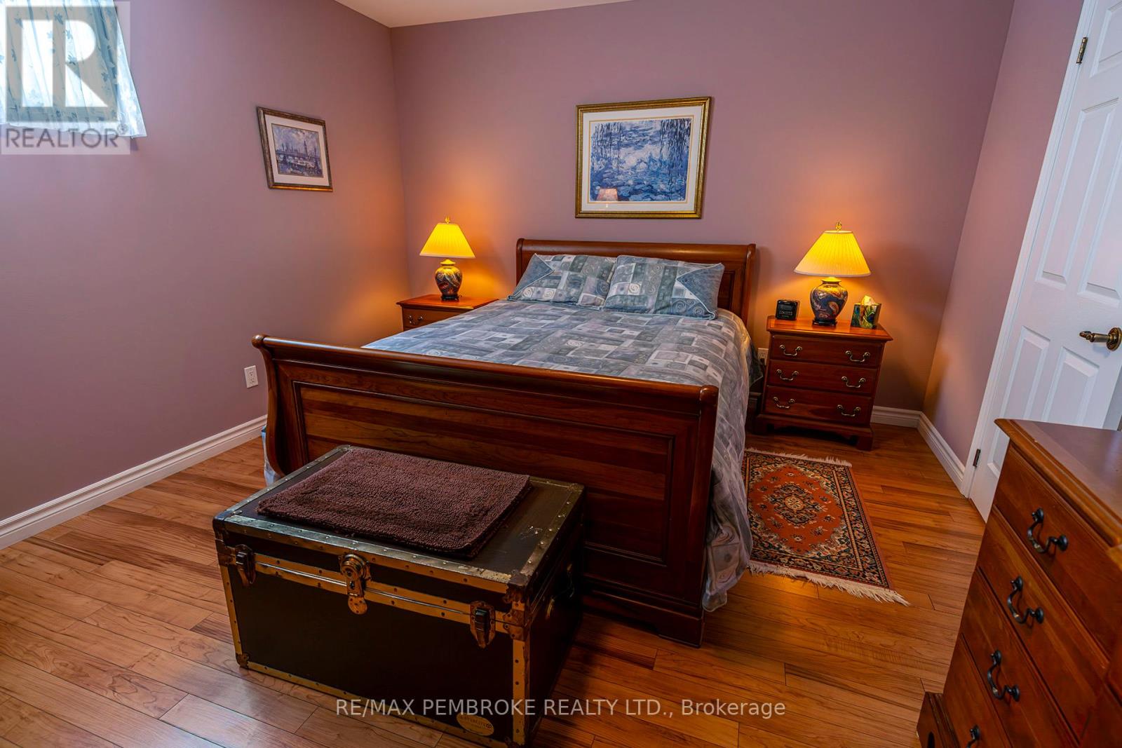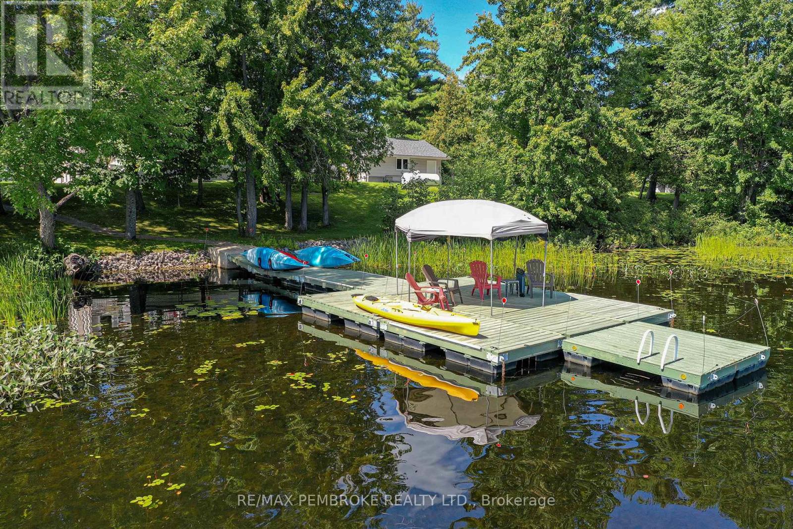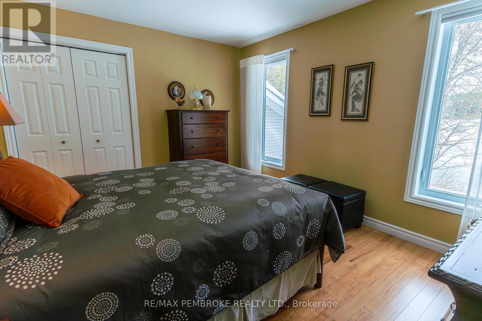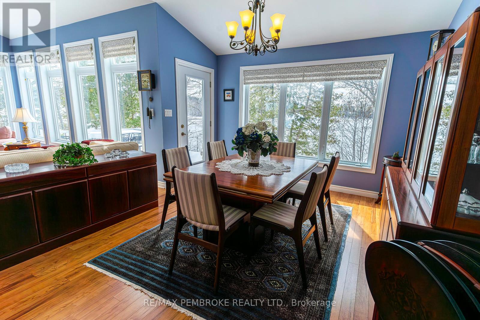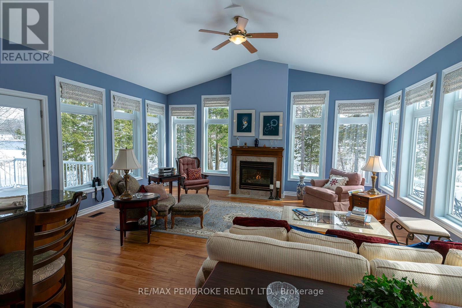 STUNNING LAKEFRONT home situated on private, estate like 5 acre lot with over 1100 feet of shoreline on desirable GOLDEN LAKE. Built on a breathtaking peninsula surrounded by WATERFRONT (east/west/south) with MATURE PINES & glorious all day sunshine. This high quality ZOMERS custom built 3 bed, 3 bath OPEN CONCEPT bungalow is bursting with high end features throughout. CAPITVATING PANORAMIC Lakes views surround you from all rooms on the main level thanks to the oversized windows, TALL 9ft ceilings, custom hardwood kitchen with granite counter tops & large Island, formal dining area with access to outdoor deck for outdoor summer dinners. LARGE living room area with vaulted ceiling and gas fireplace. Oversized primary bedroom with spa like ensuite bathroom & walk in closet, OVERSIZED mudroom with main floor laundry. TALL & bright finished lower level features; bar, LARGE rec room with gas fireplace, 3rd bedroom, gym area (could easily be space for 4th/5th bedroom), 3rd full bathroom and walk out direct access to the attached garage. this home has a ICF (insulated concrete form) foundation & radiant heated floors (lower level , kitchen, bathrooms). PRIVACY & TRANQUILITY awaits you outside with: extensive landscaping, two separate decks on opposite sides of the house, lush flat yard, 90ft of floating dock to moor your boats, plus your own private sandy beach and fire pit. Attached OVERSIZED 1 car garage and a second detached garage (28ft x36ft). The home is hardwired with a full sized Generator in case of power outages, Irrigation, Gated entry, FULL Paved Driveway, NEW shingles 2023 on house and detached garage. START making YOUR Lakefront memories a reality by, boating, fishing, swimming paddle boarding, kayaking, water skiing, tubing, ice fishing or snowmobiling! Just 600m off ON-60. 10mins to Eganville, 25mins to Pembroke, 85 mins to Ottawa. (id:28469)