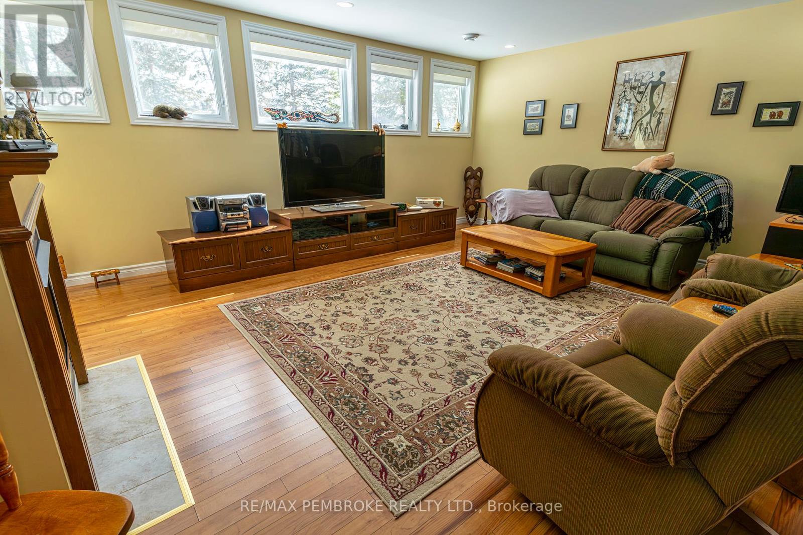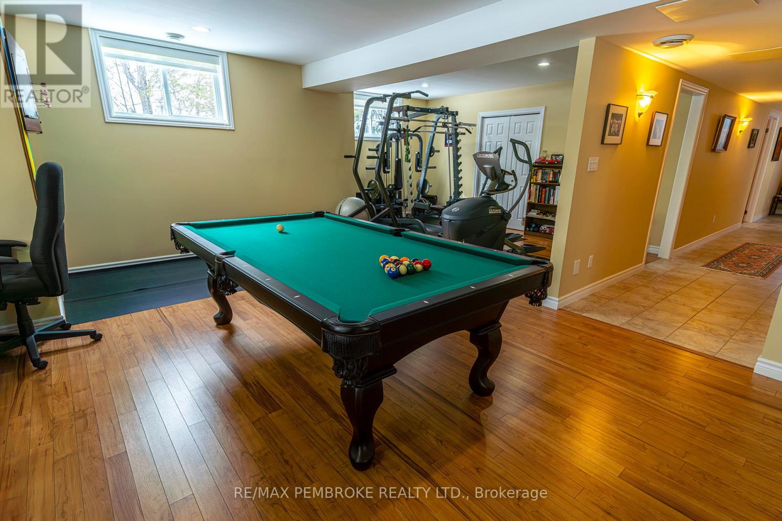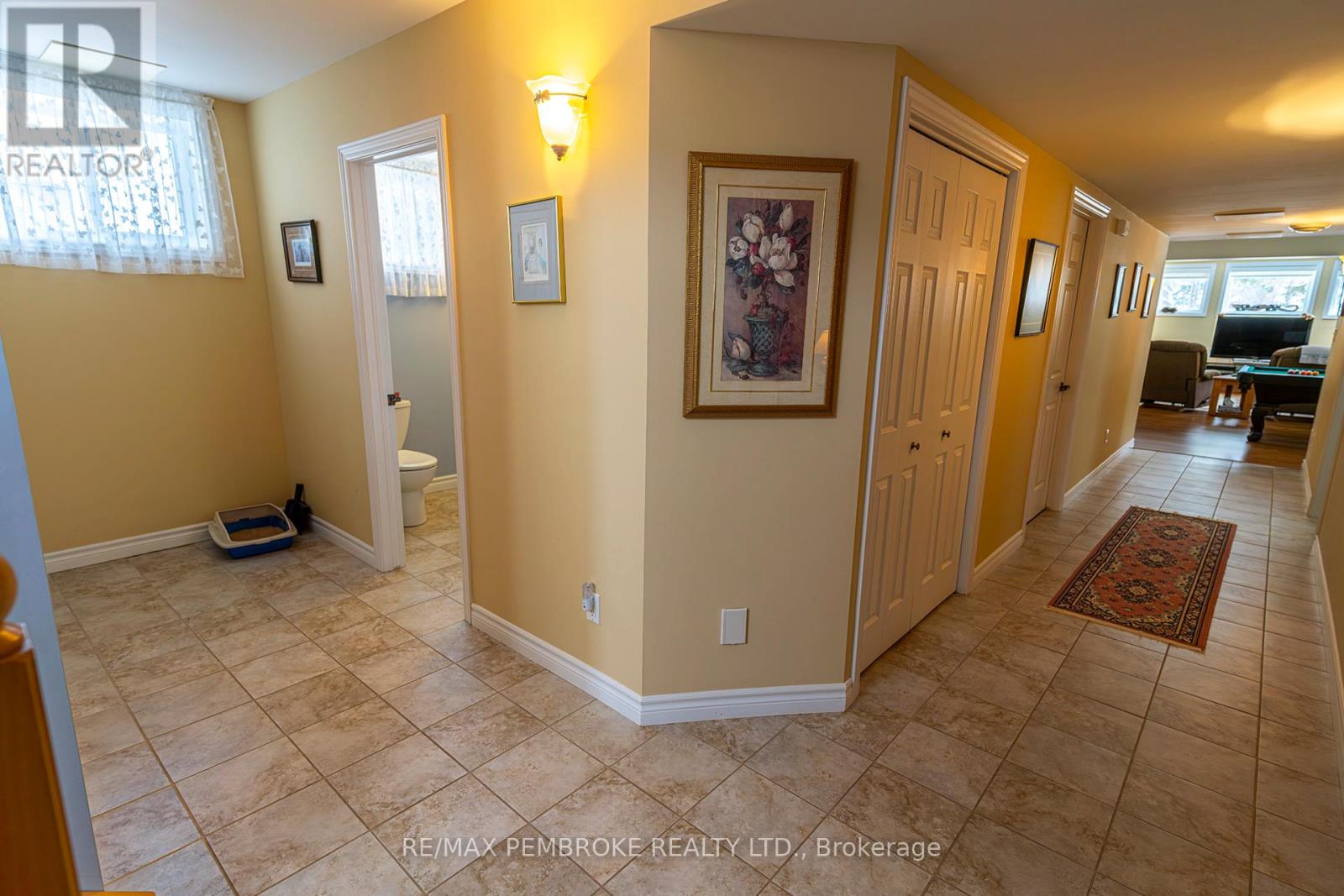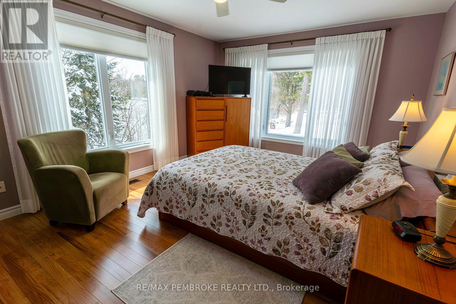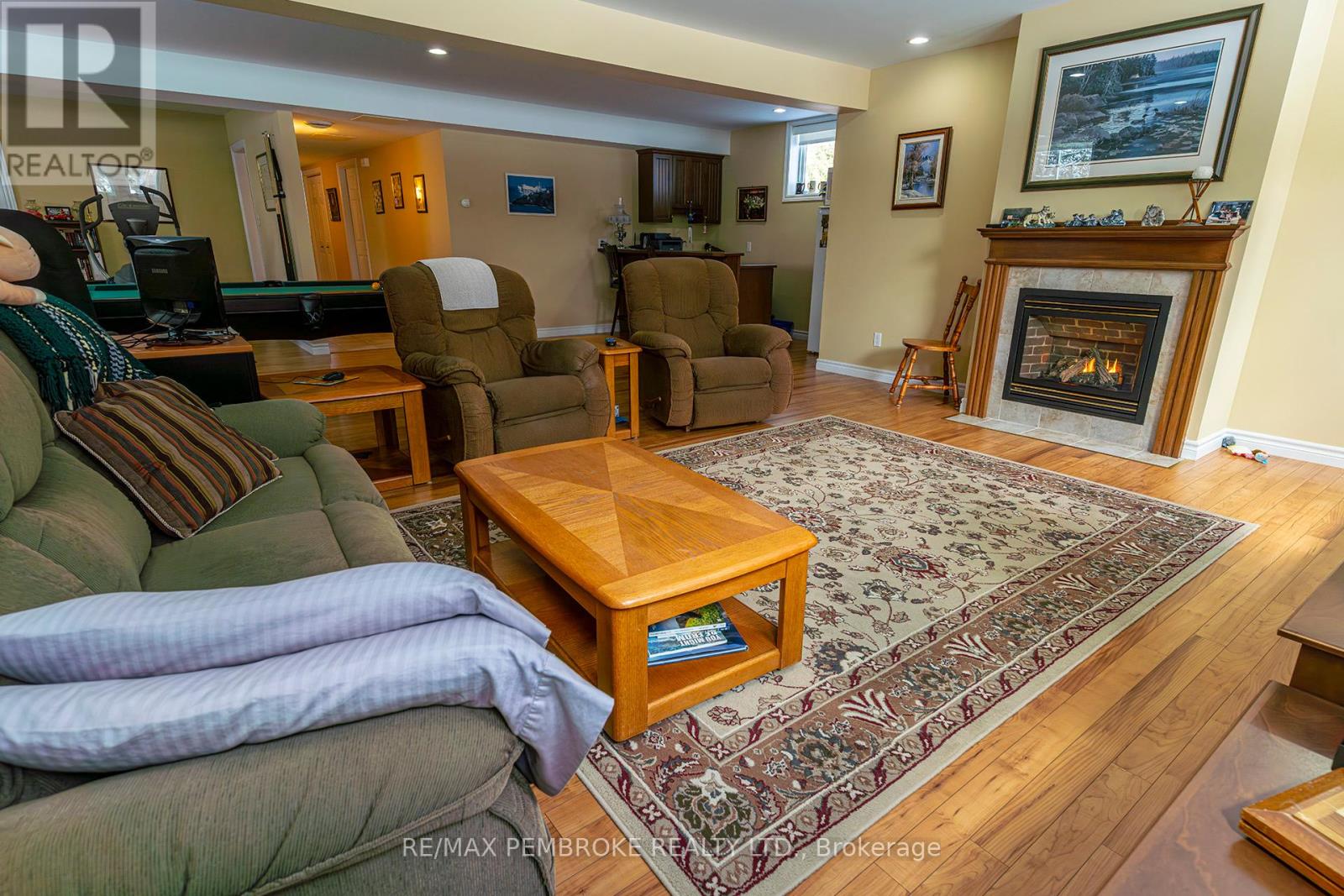 STUNNING LAKEFRONT home situated on private, estate like 5 acre lot with over 1100 feet of shoreline on desirable GOLDEN LAKE. Built on a breathtaking peninsula surrounded by WATERFRONT (east/west/south) with MATURE PINES & glorious all day sunshine. This high quality ZOMERS custom built 3 bed, 3 bath OPEN CONCEPT bungalow is bursting with high end features throughout. CAPITVATING PANORAMIC Lakes views surround you from all rooms on the main level thanks to the oversized windows, TALL 9ft ceilings, custom hardwood kitchen with granite counter tops & large Island, formal dining area with access to outdoor deck for outdoor summer dinners. LARGE living room area with vaulted ceiling and gas fireplace. Oversized primary bedroom with spa like ensuite bathroom & walk in closet, OVERSIZED mudroom with main floor laundry. TALL & bright finished lower level features; bar, LARGE rec room with gas fireplace, 3rd bedroom, gym area (could easily be space for 4th/5th bedroom), 3rd full bathroom and walk out direct access to the attached garage. this home has a ICF (insulated concrete form) foundation & radiant heated floors (lower level , kitchen, bathrooms). PRIVACY & TRANQUILITY awaits you outside with: extensive landscaping, two separate decks on opposite sides of the house, lush flat yard, 90ft of floating dock to moor your boats, plus your own private sandy beach and fire pit. Attached OVERSIZED 1 car garage and a second detached garage (28ft x36ft). The home is hardwired with a full sized Generator in case of power outages, Irrigation, Gated entry, FULL Paved Driveway, NEW shingles 2023 on house and detached garage. START making YOUR Lakefront memories a reality by, boating, fishing, swimming paddle boarding, kayaking, water skiing, tubing, ice fishing or snowmobiling! Just 600m off ON-60. 10mins to Eganville, 25mins to Pembroke, 85 mins to Ottawa. (id:28469)