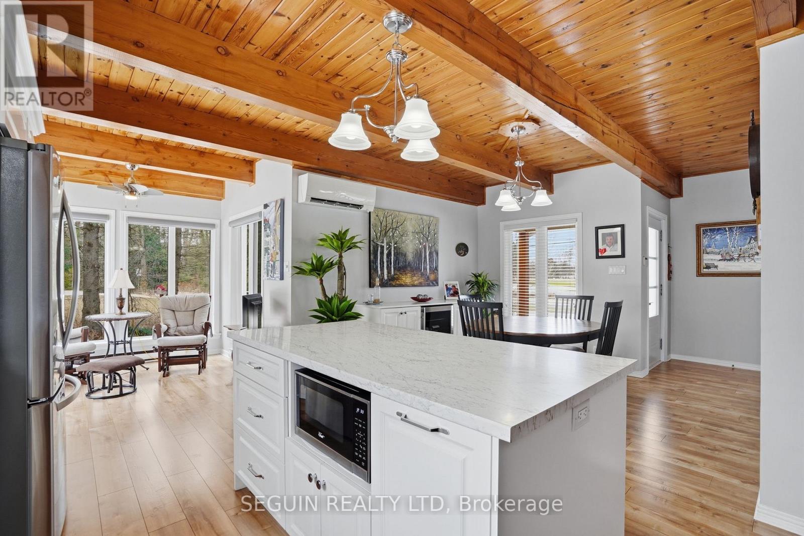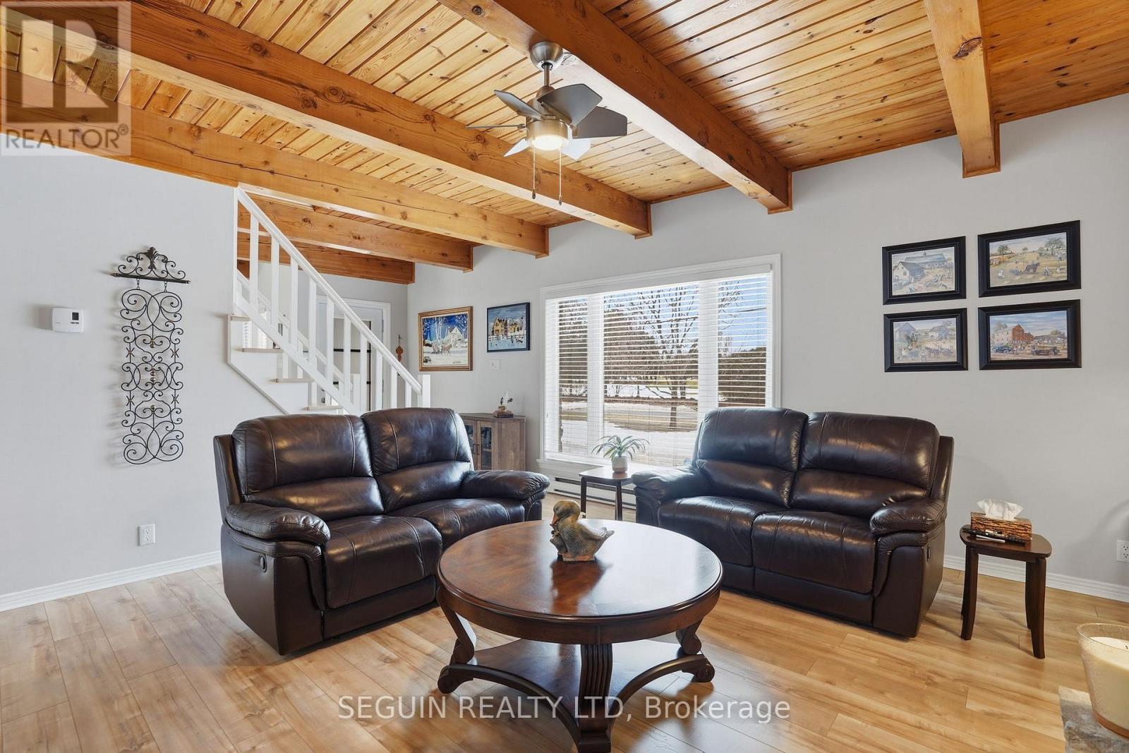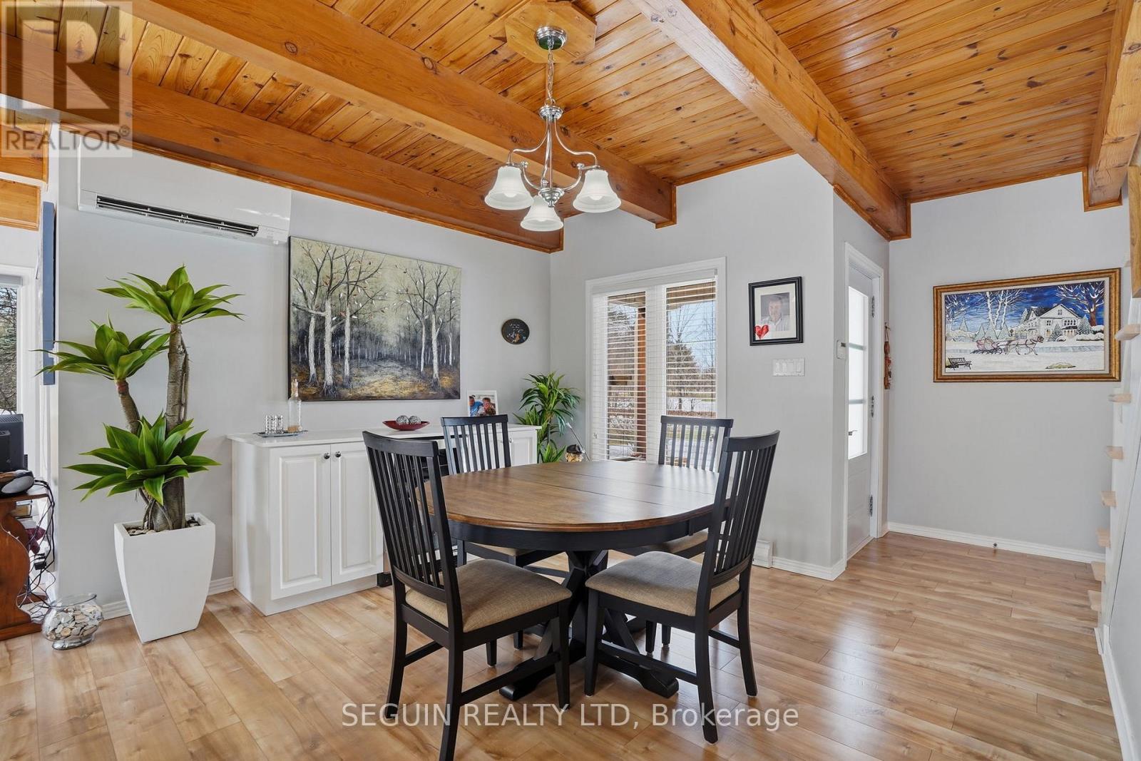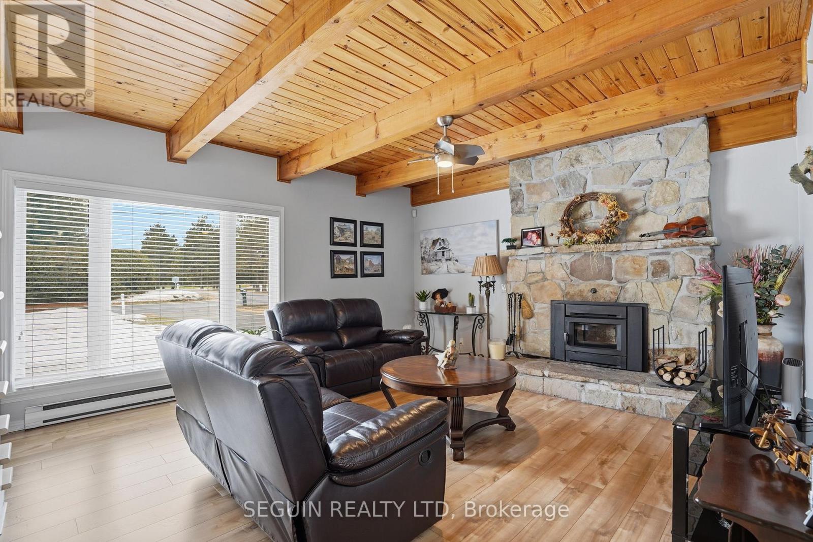 Impeccably maintained home ideally located directly across from the renowned Hawkesbury Golf and Curling Club, offering a peaceful setting and an exceptional lifestyle.This charming one-and-three-quarter storey home features a warm and inviting layout. The main floor offers a spacious living room filled with natural light and a wood-burning fireplace adds comfort and character to the space, a welcoming dining area, and a beautifully renovated kitchen (2020) combining style and functionality. A cozy sunroom sits just off the kitchen, perfect for enjoying natural light year-round. The main floor has seen several key updates, including new flooring (2020), a modern kitchen (2020), and an updated bathroom (2024). A heat pump installed in 2020 ensures efficient year-round comfort. Upstairs, you will find two generously sized bedrooms along with a second full bathroom, ideal for families or guests. Situated on a beautiful 100 x 150 ft lot, the property offers privacy and a true country feel. A standout feature is the detached double garage (22 x 40), fully finished inside and meticulously maintained - perfect for storage, hobbies, or workshop use. Major updates include windows (2015 or newer) and a roof replaced in 2020, offering peace of mind for years to come.A true turnkey property combining comfort, space, and a prime location. (id:28469)