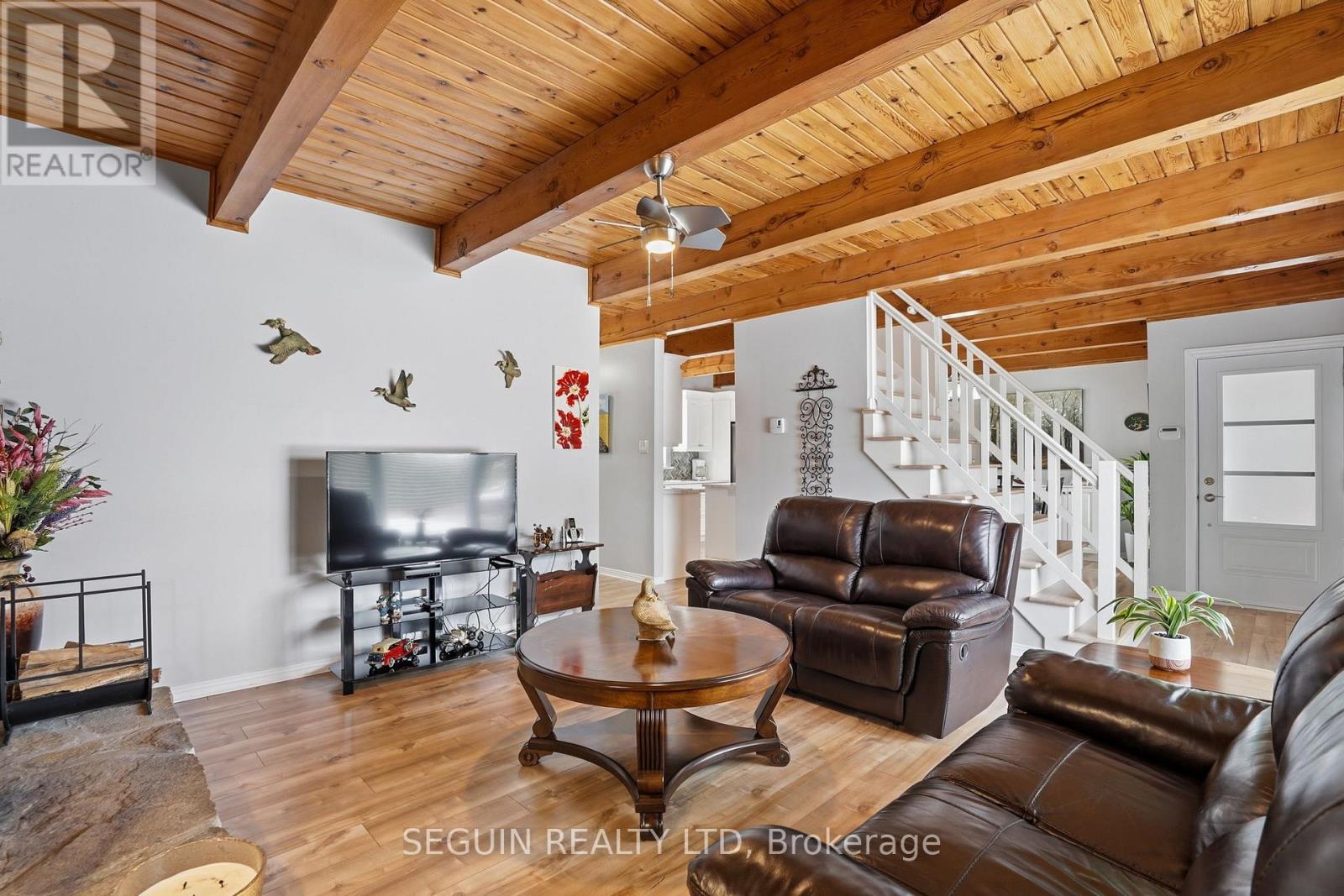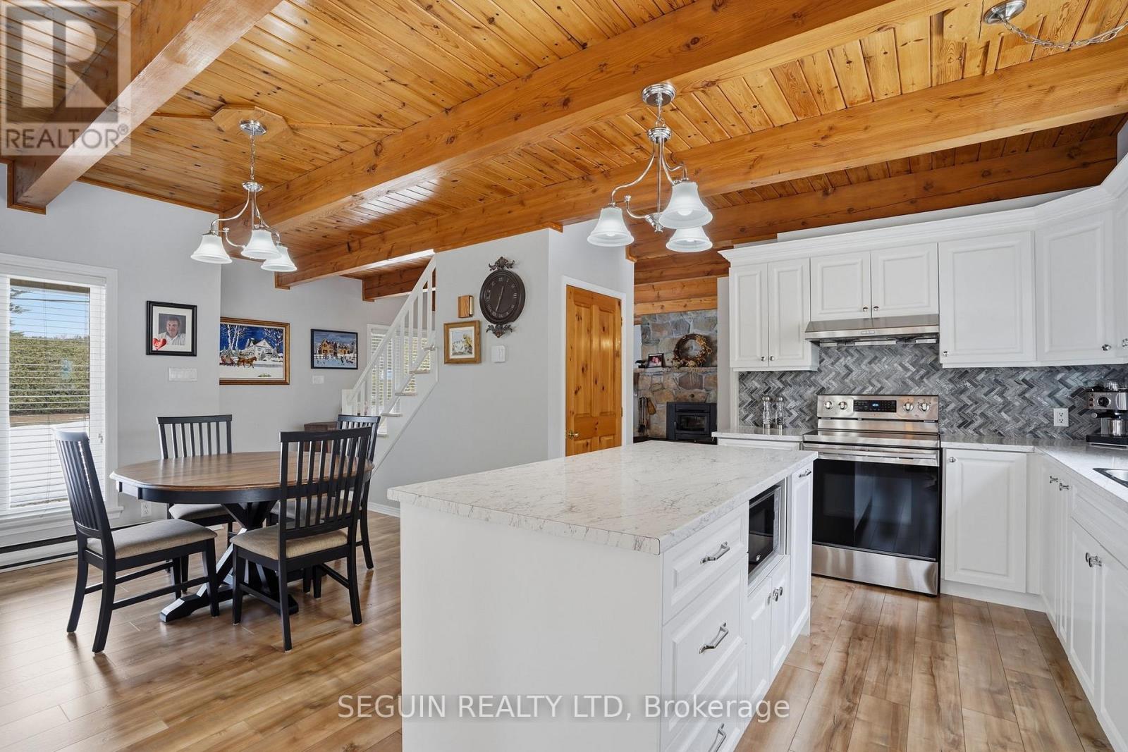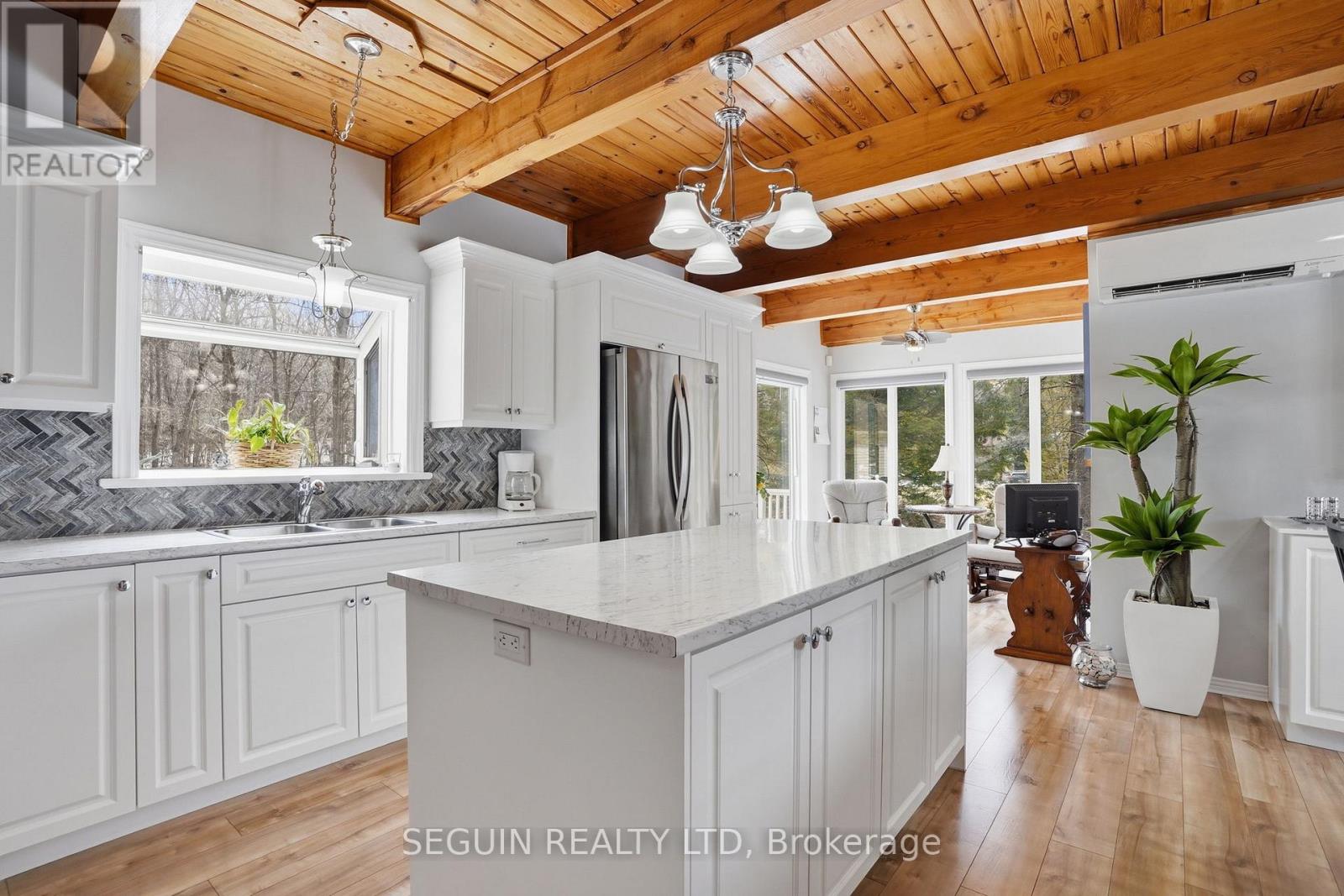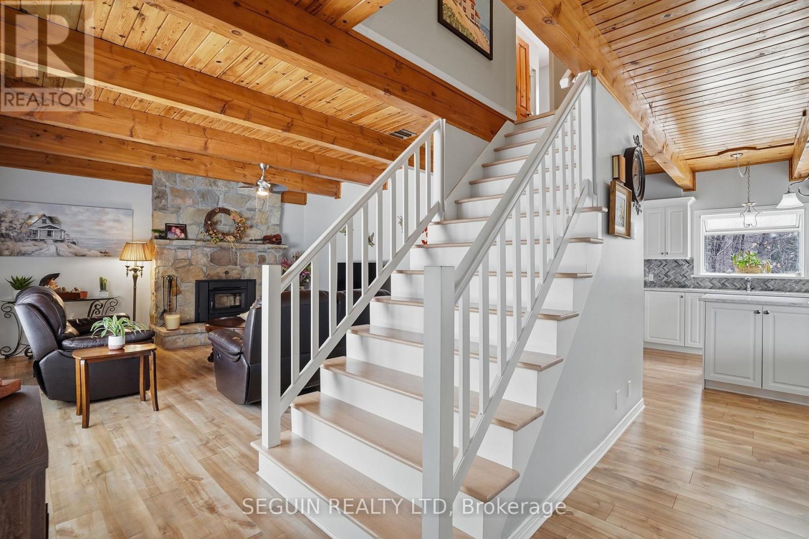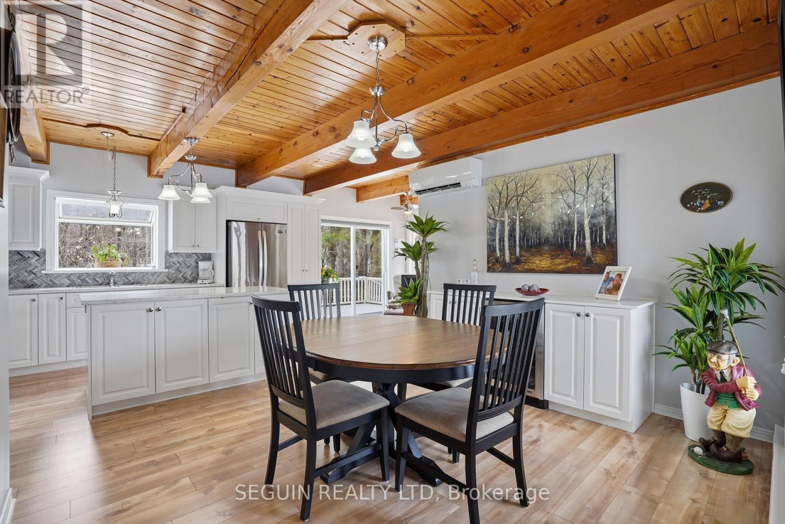 Impeccably maintained home ideally located directly across from the renowned Hawkesbury Golf and Curling Club, offering a peaceful setting and an exceptional lifestyle.This charming one-and-three-quarter storey home features a warm and inviting layout. The main floor offers a spacious living room filled with natural light and a wood-burning fireplace adds comfort and character to the space, a welcoming dining area, and a beautifully renovated kitchen (2020) combining style and functionality. A cozy sunroom sits just off the kitchen, perfect for enjoying natural light year-round. The main floor has seen several key updates, including new flooring (2020), a modern kitchen (2020), and an updated bathroom (2024). A heat pump installed in 2020 ensures efficient year-round comfort. Upstairs, you will find two generously sized bedrooms along with a second full bathroom, ideal for families or guests. Situated on a beautiful 100 x 150 ft lot, the property offers privacy and a true country feel. A standout feature is the detached double garage (22 x 40), fully finished inside and meticulously maintained - perfect for storage, hobbies, or workshop use. Major updates include windows (2015 or newer) and a roof replaced in 2020, offering peace of mind for years to come.A true turnkey property combining comfort, space, and a prime location. (id:28469)