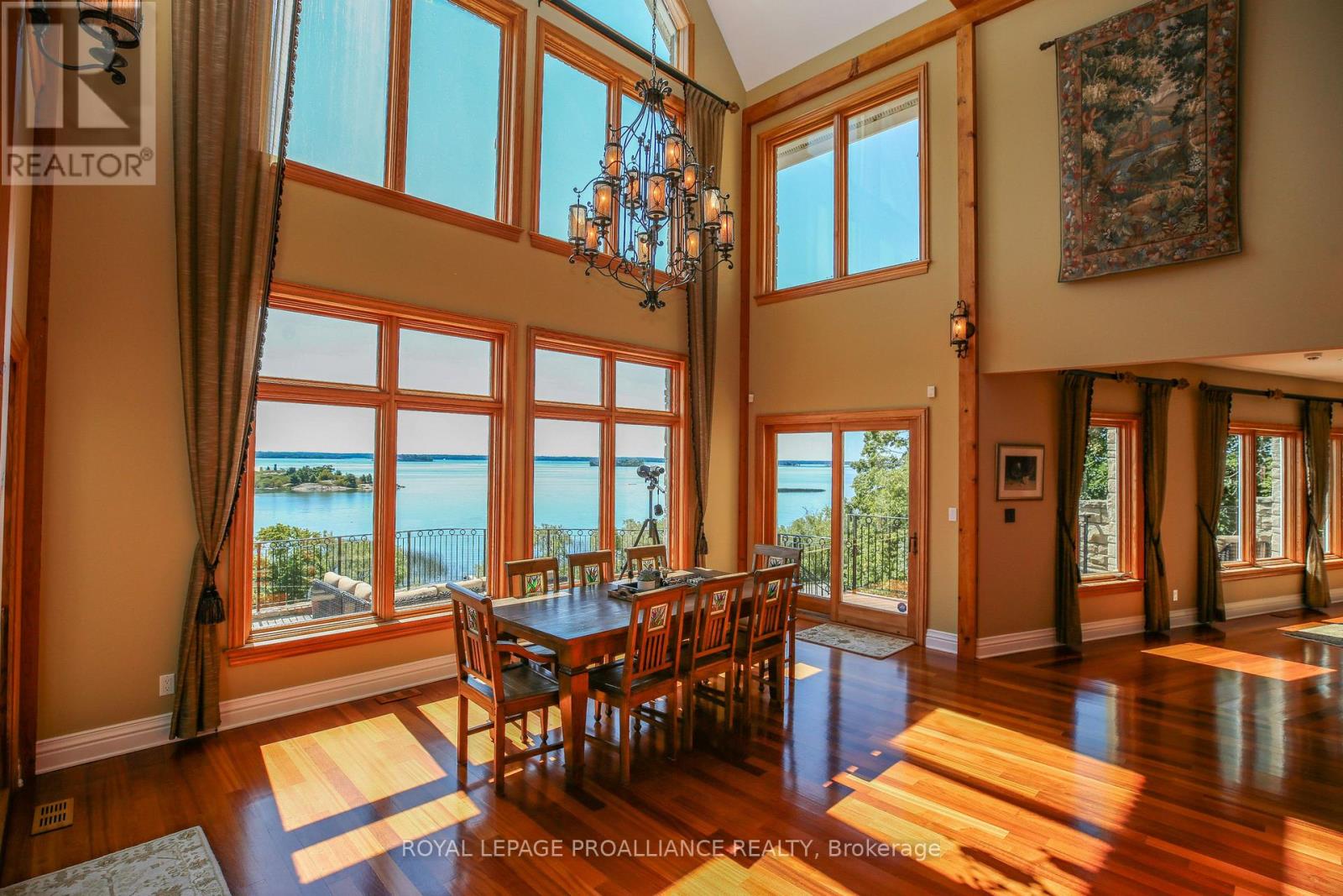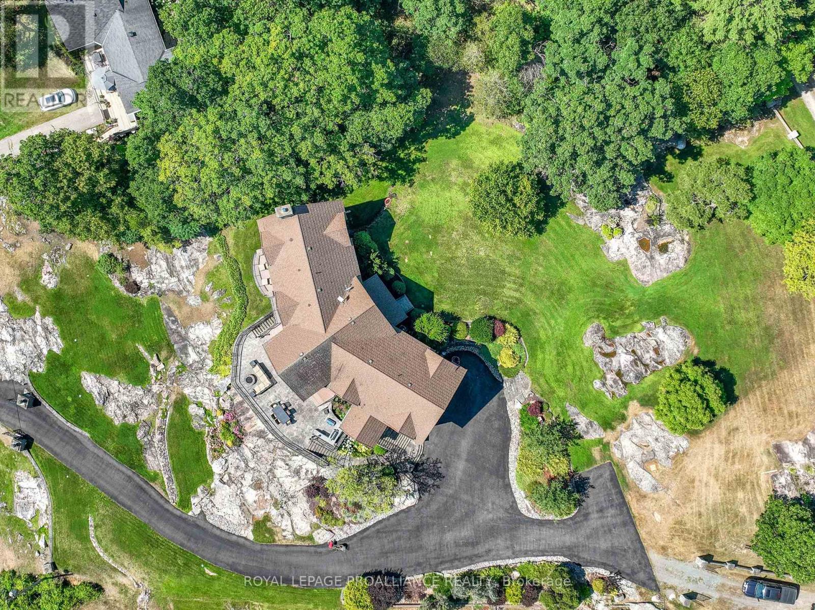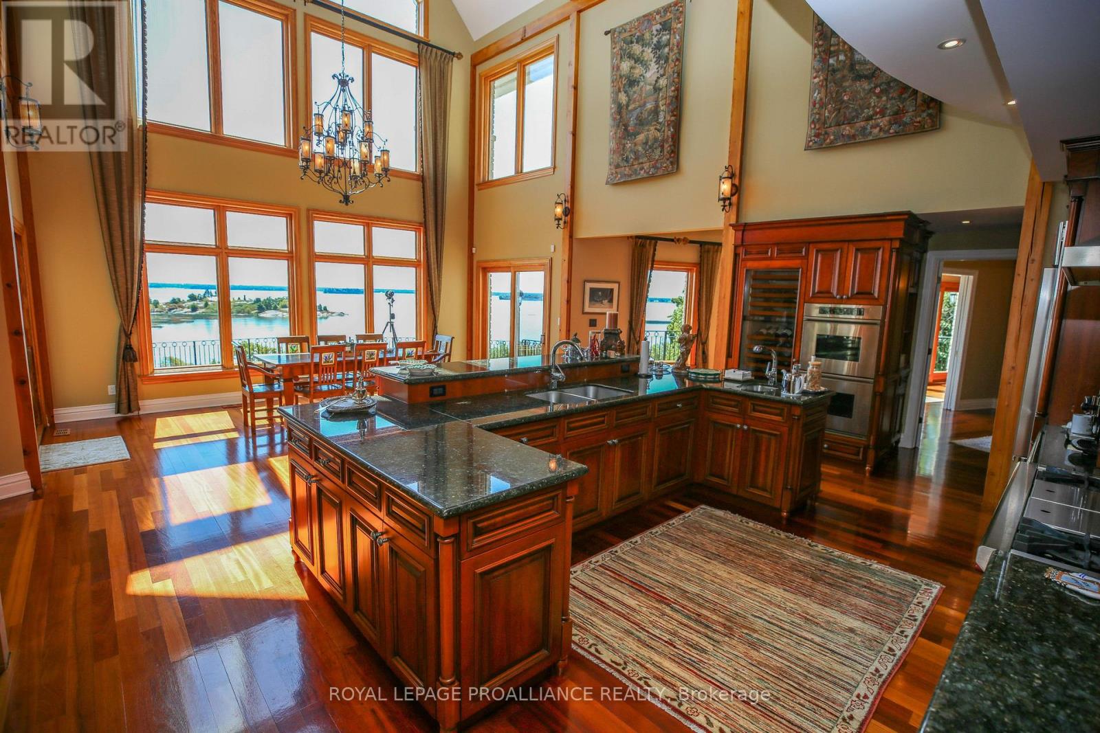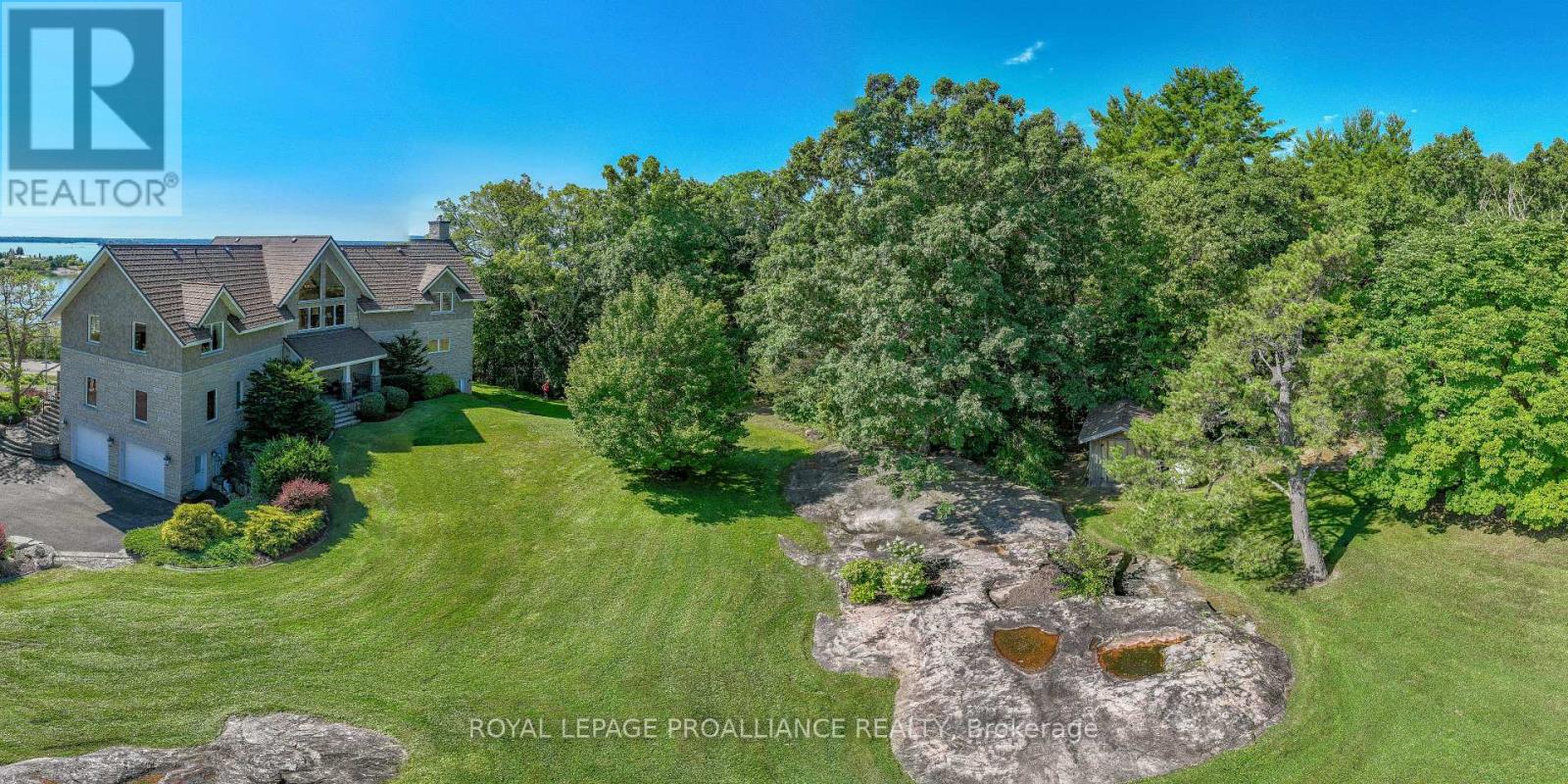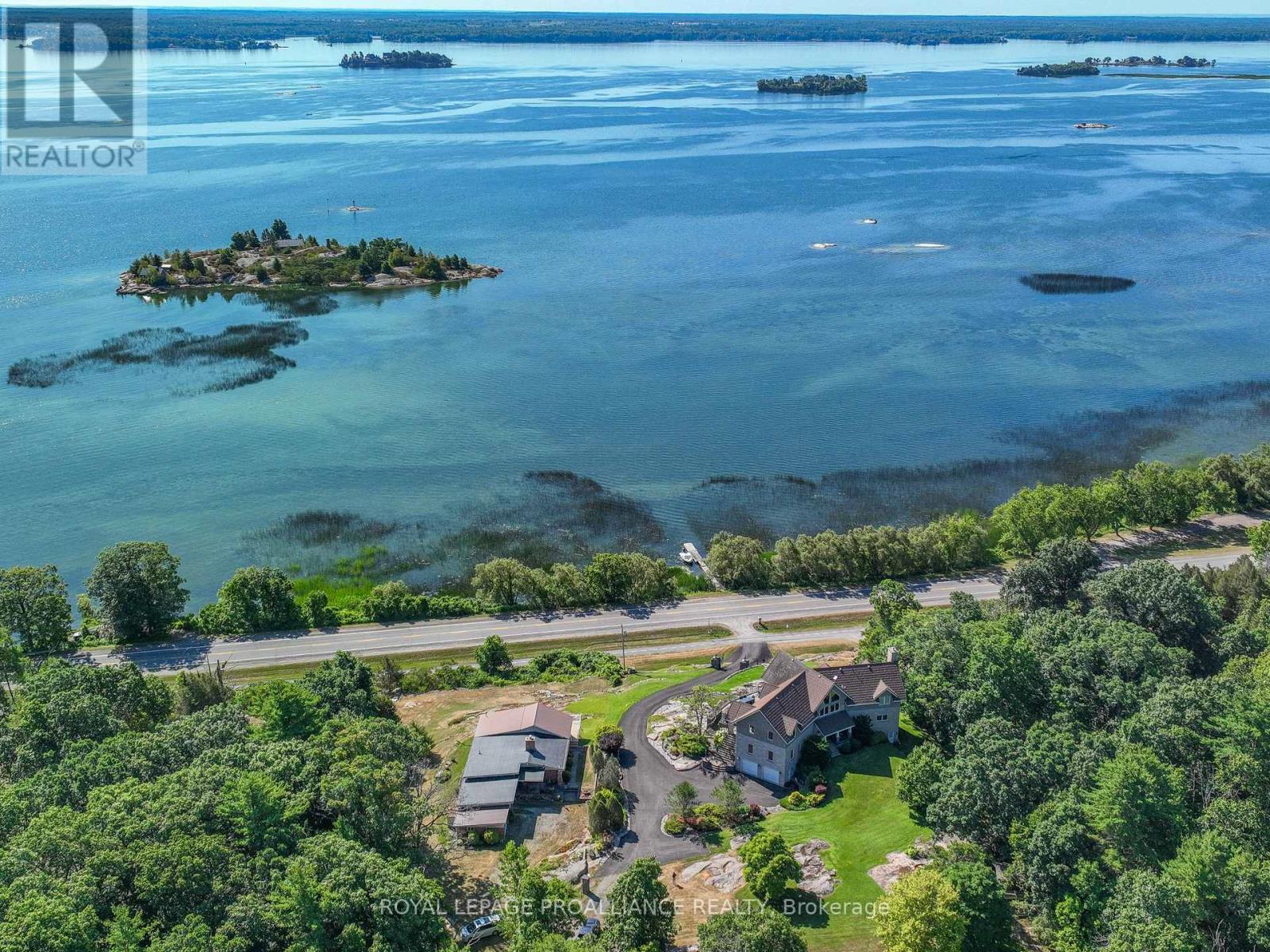 Perched high above the St. Lawrence River in the heart of the world-renowned 1000 Islands, this exceptional custom-built estate offers breathtaking panoramic views stretching to the iconic Singer Castle. A rare combination of timeless design, elevated privacy, and refined outdoor living, this is waterfront living at its finest. Spanning approximately 6,000 sq. ft., the home is designed to maximize light and scenery, with expansive floor-to-ceiling windows framing the ever-changing river views. Inside, rich Brazilian cherry hardwood and marble flooring, along with handcrafted Hubbardton Forge lighting, create a warm yet sophisticated atmosphere. Floor to ceiling stone fireplace with air tight wood insert, perfect for both relaxing and entertaining. The gourmet kitchen features custom cherry cabinetry, a Wolf gas stove, and two Dacor ovens, family room with custom built-ins and stunning water views. The principal suite offers a private retreat with a spa-inspired ensuite and picturesque outlook, while two additional bedrooms each include their own ensuite for added comfort and privacy. The walk-out lower level, complete with 10-foot ceilings and in-floor heating, provides exceptional additional living space with a rec room, wet bar, office, and exercise area. Outdoors, professionally landscaped grounds showcase extensive stonework, stamped concrete, and maintenance-free decking. Multiple entertaining areas, including a built-in BBQ and smoker, create the perfect setting to enjoy the riverfront backdrop. A wrought iron gated entrance and fencing add both elegance and security, with additional access from Old River Road. Additional features include a steel roof, two central air units, and direct access to 37 km of paved walking and cycling trails leading to Gananoque. A truly rare offering in one of Canada's most iconic waterfront settings - this is more than a home, it's a landmark 1000 Islands estate. (id:28469)