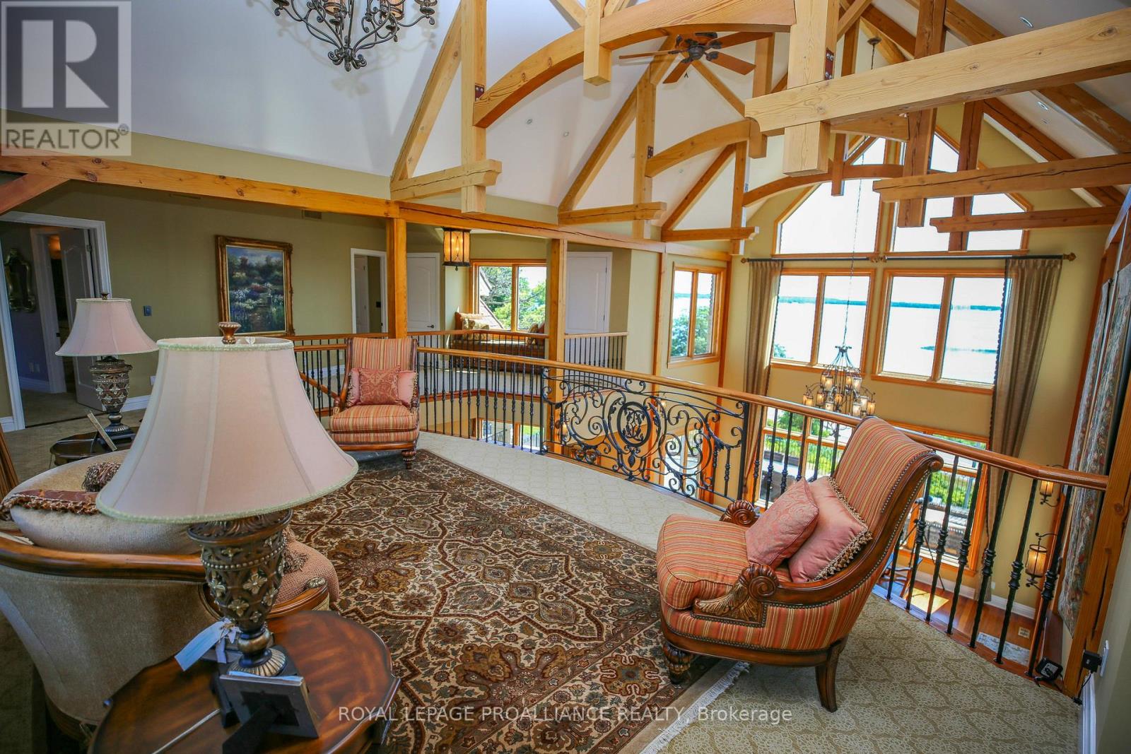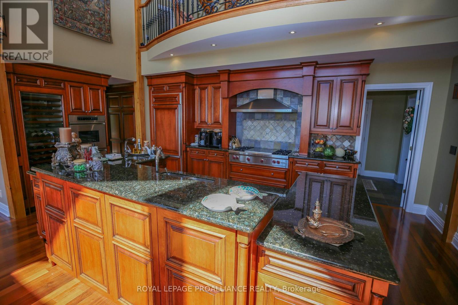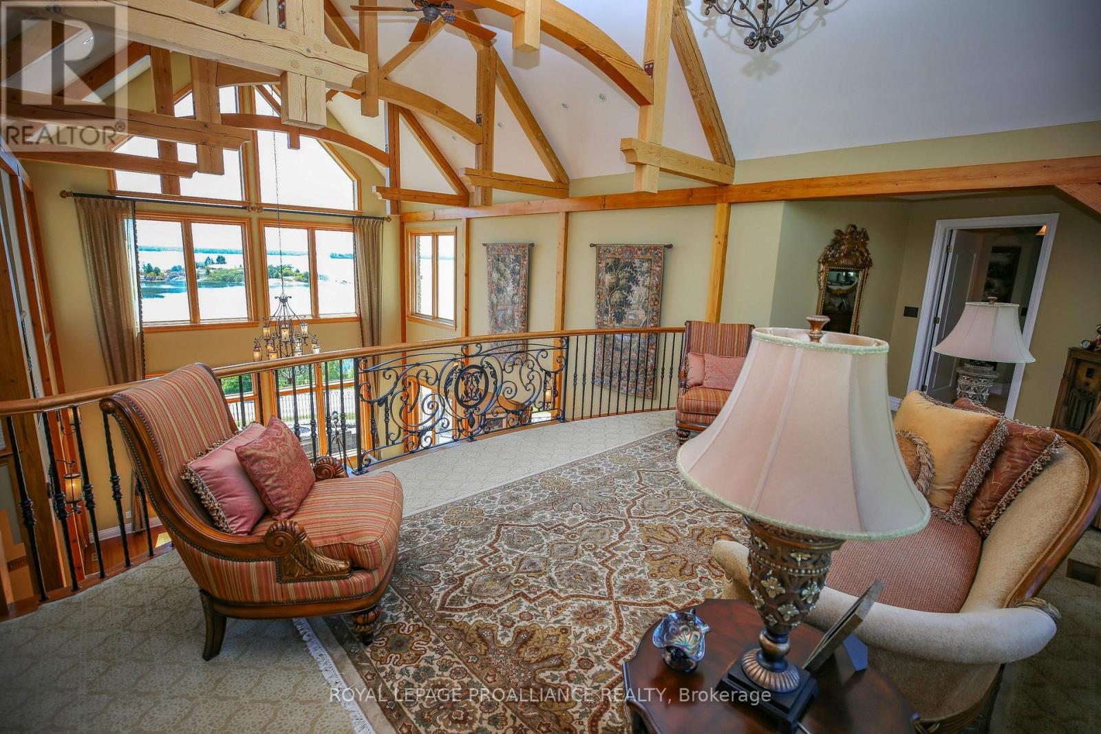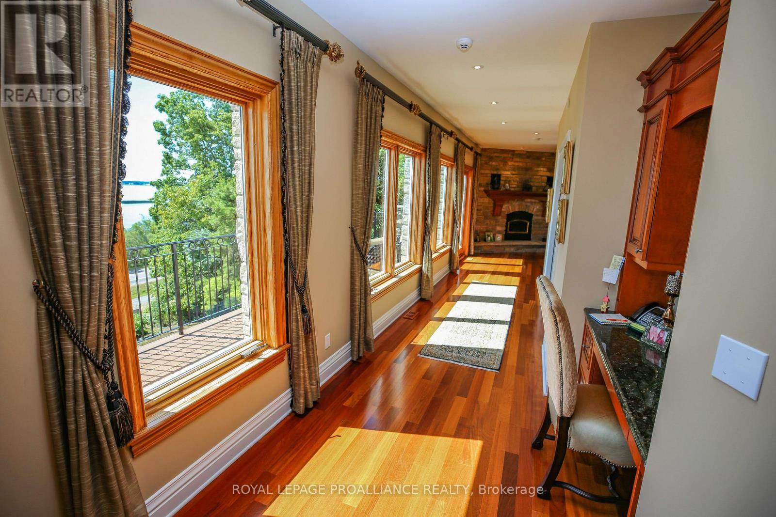 Perched high above the St. Lawrence River in the heart of the world-renowned 1000 Islands, this exceptional custom-built estate offers breathtaking panoramic views stretching to the iconic Singer Castle. A rare combination of timeless design, elevated privacy, and refined outdoor living, this is waterfront living at its finest. Spanning approximately 6,000 sq. ft., the home is designed to maximize light and scenery, with expansive floor-to-ceiling windows framing the ever-changing river views. Inside, rich Brazilian cherry hardwood and marble flooring, along with handcrafted Hubbardton Forge lighting, create a warm yet sophisticated atmosphere. Floor to ceiling stone fireplace with air tight wood insert, perfect for both relaxing and entertaining. The gourmet kitchen features custom cherry cabinetry, a Wolf gas stove, and two Dacor ovens, family room with custom built-ins and stunning water views. The principal suite offers a private retreat with a spa-inspired ensuite and picturesque outlook, while two additional bedrooms each include their own ensuite for added comfort and privacy. The walk-out lower level, complete with 10-foot ceilings and in-floor heating, provides exceptional additional living space with a rec room, wet bar, office, and exercise area. Outdoors, professionally landscaped grounds showcase extensive stonework, stamped concrete, and maintenance-free decking. Multiple entertaining areas, including a built-in BBQ and smoker, create the perfect setting to enjoy the riverfront backdrop. A wrought iron gated entrance and fencing add both elegance and security, with additional access from Old River Road. Additional features include a steel roof, two central air units, and direct access to 37 km of paved walking and cycling trails leading to Gananoque. A truly rare offering in one of Canada's most iconic waterfront settings - this is more than a home, it's a landmark 1000 Islands estate. (id:28469)