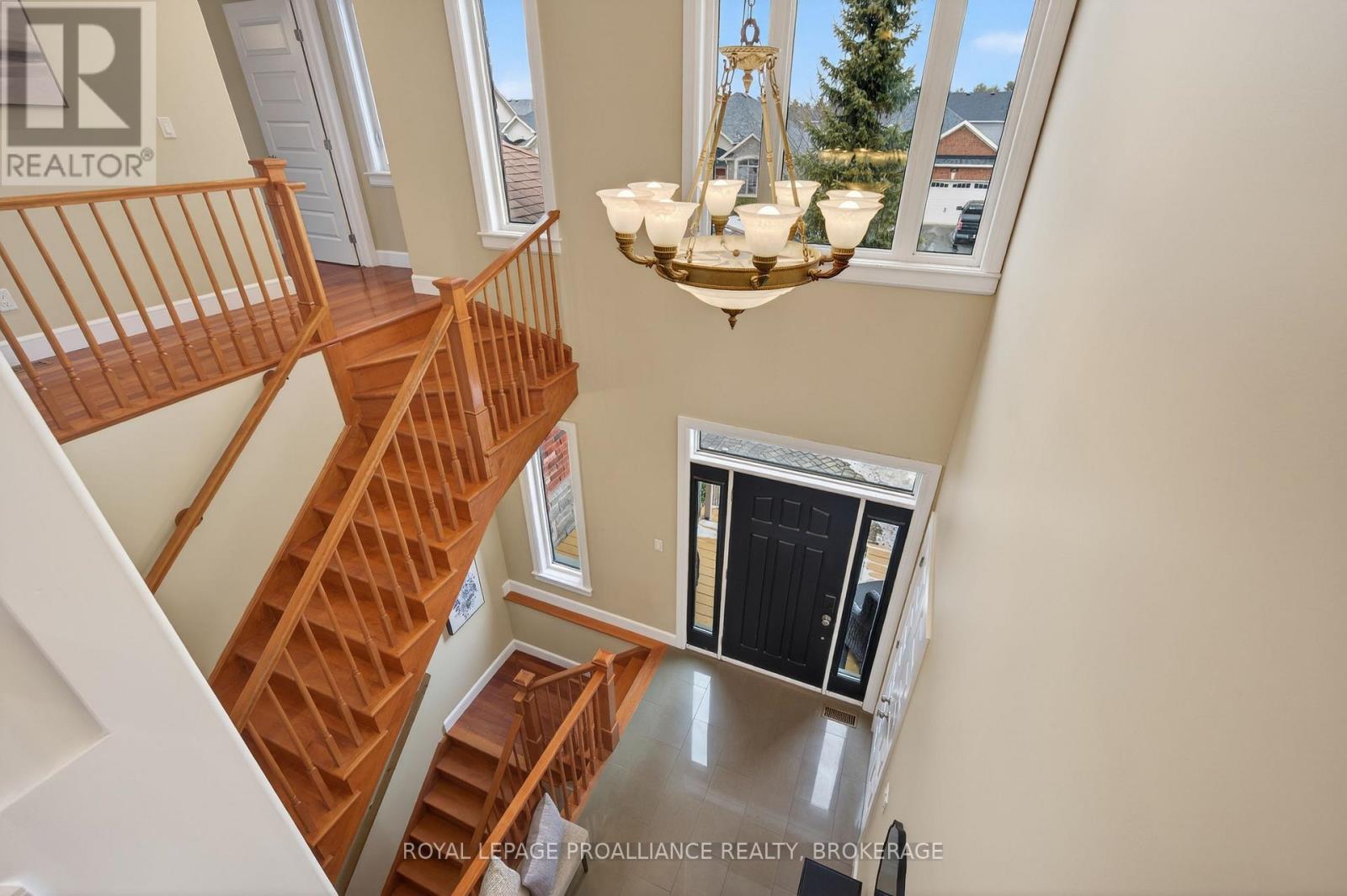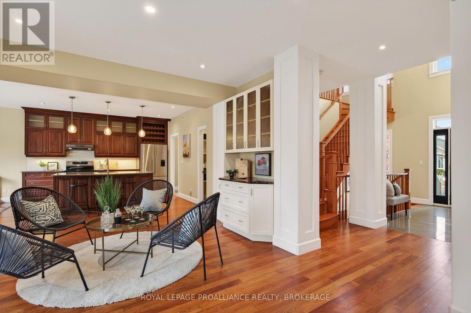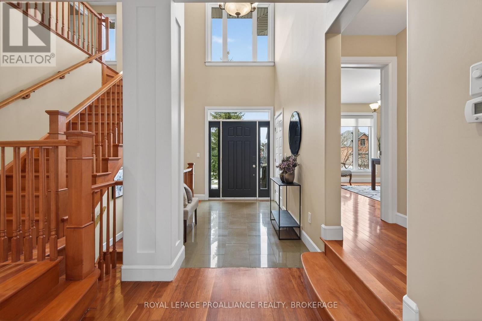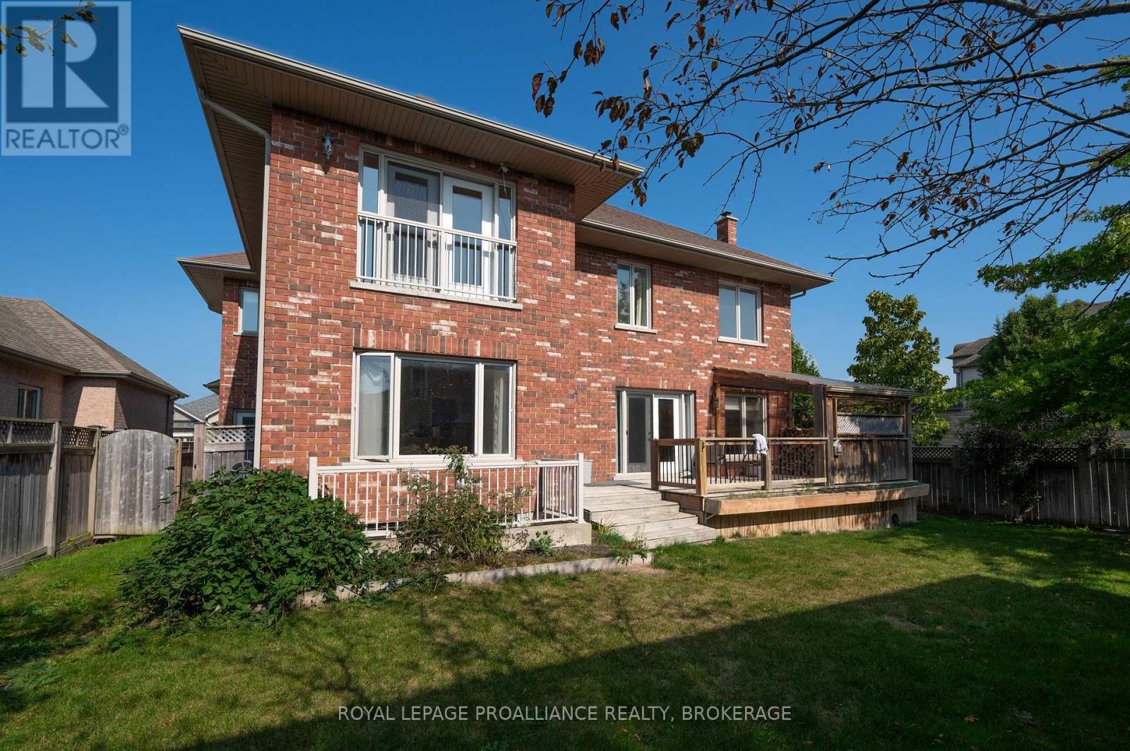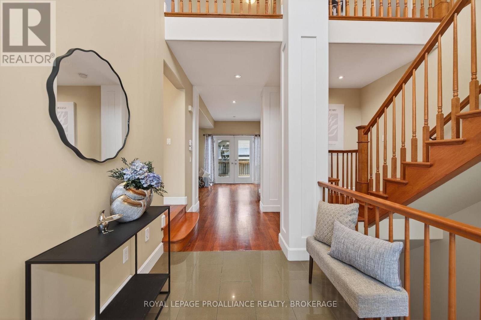 Modern Luxury on a Corner Lot in Cataraqui North. Bright, spacious, and beautifully finished, this 4+2 bedroom home offers refined living on a generous corner lot with a sunny south-facing backyard. The grand two-storey foyer features shaker-style columns and a striking cantilevered staircase leading to an open balcony landing. The main floor's open-concept layout showcases cherry-wood floors, granite counters, transom windows, and custom built-ins. A large prep island anchors the cherry kitchen, complete with slow-close cabinetry and a walk-in pantry. Oversized windows flood the space with natural light, continuing upstairs into four spacious bedrooms. The primary suite includes patio doors to a Juliet balcony and a stylish ensuite with a tiled walk-in shower and stone-topped vanity. The luxurious family bath features a roll-top clawfoot tub and separate shower. A second-floor laundry adds everyday convenience. The finished basement-with 9-foot ceilings-offers two additional bedrooms, a second kitchen, second laundry, and a large rec room, ideal for in-laws or teens. Outside, enjoy a covered gazebo patio, landscaped flower beds, and a deck with hot tub connections under a lean-to shelter. The property is equipped with hot tub and generator hookups, offering added comfort and peace of mind year-round. This home blends elegance and functionality-perfect for families, entertainers, or multi-generational living. (id:28469)