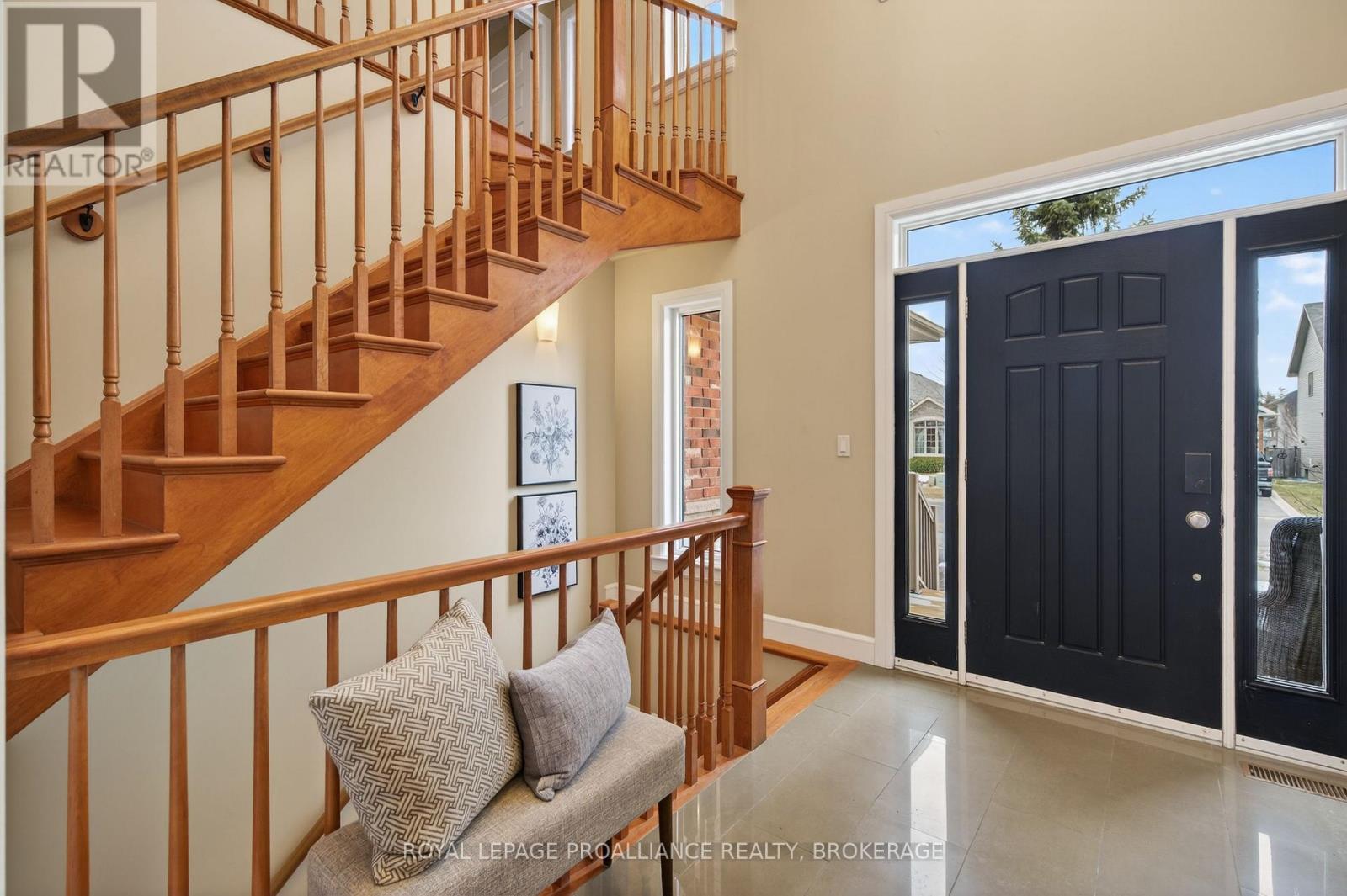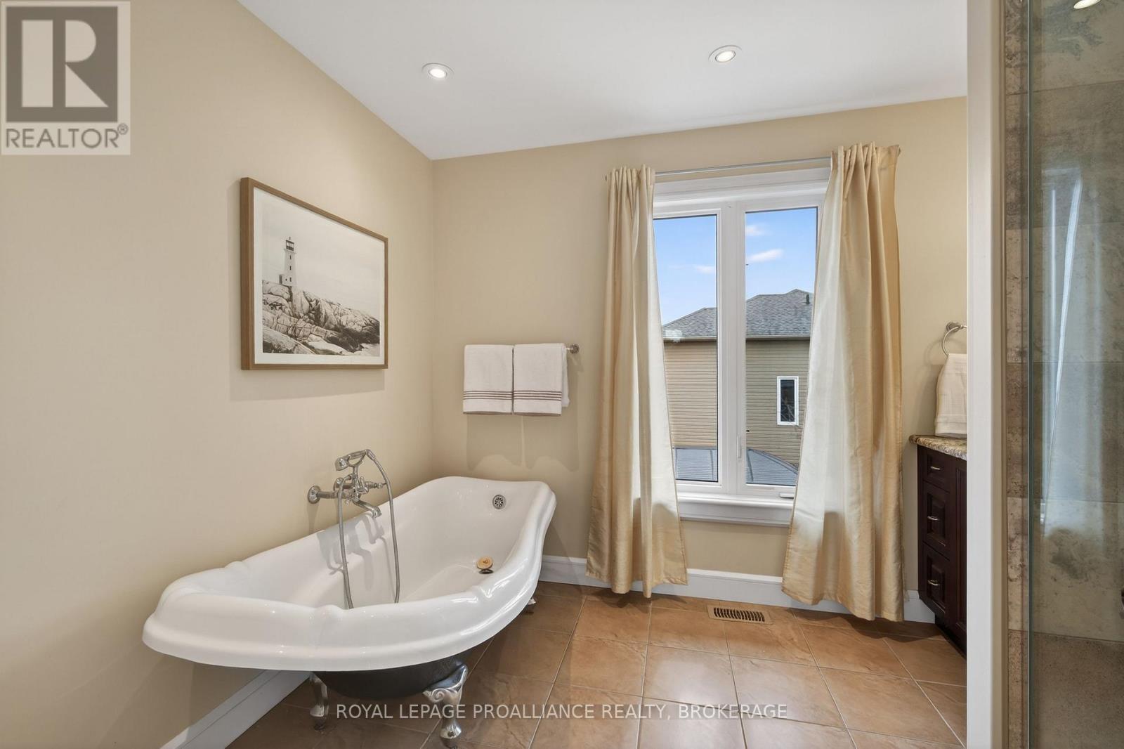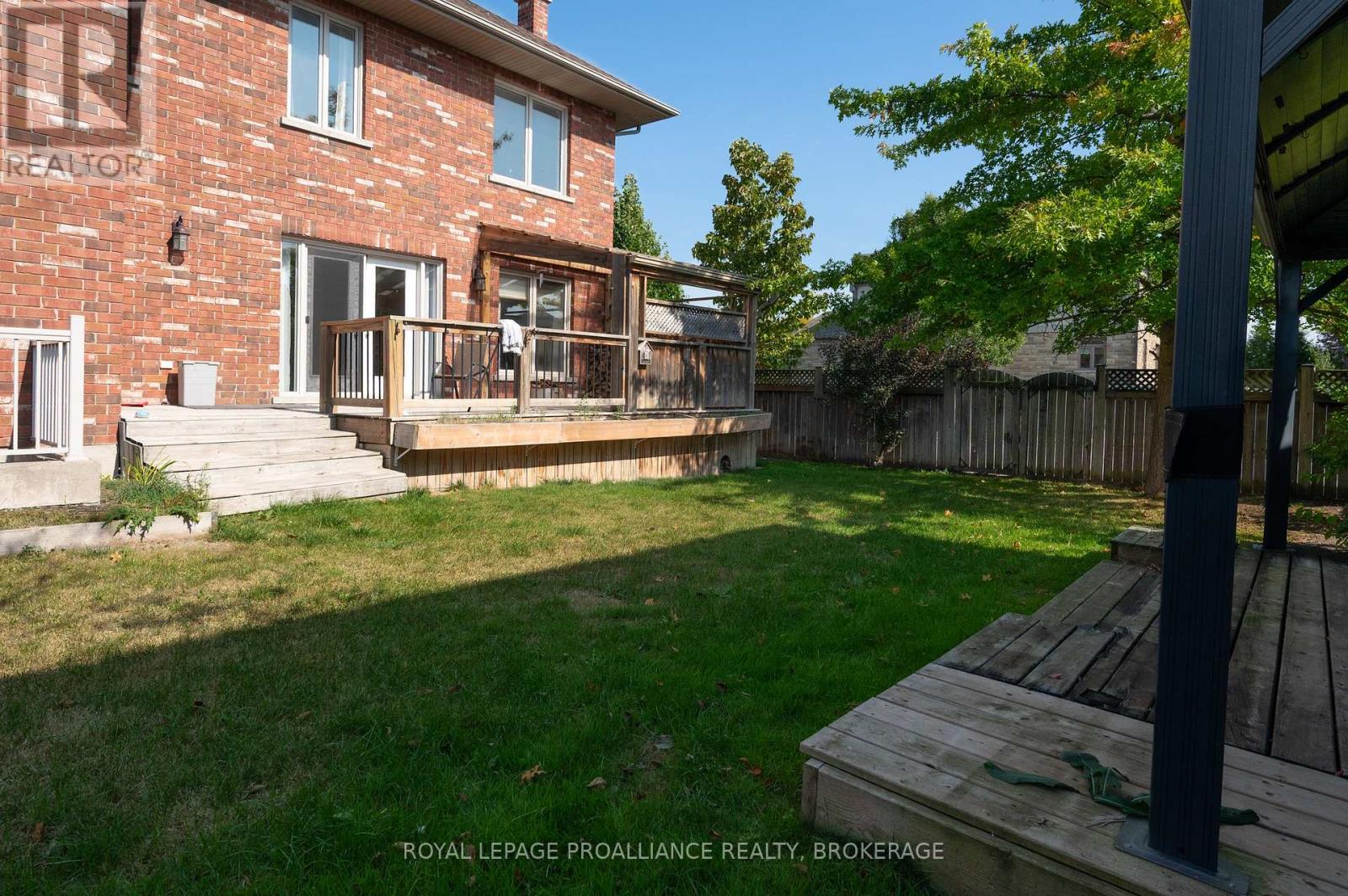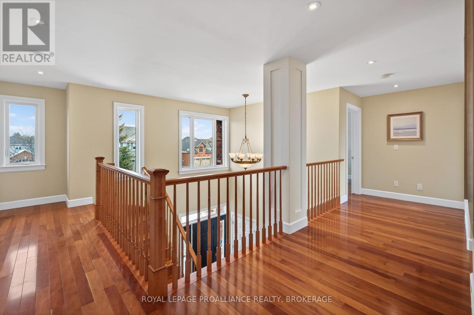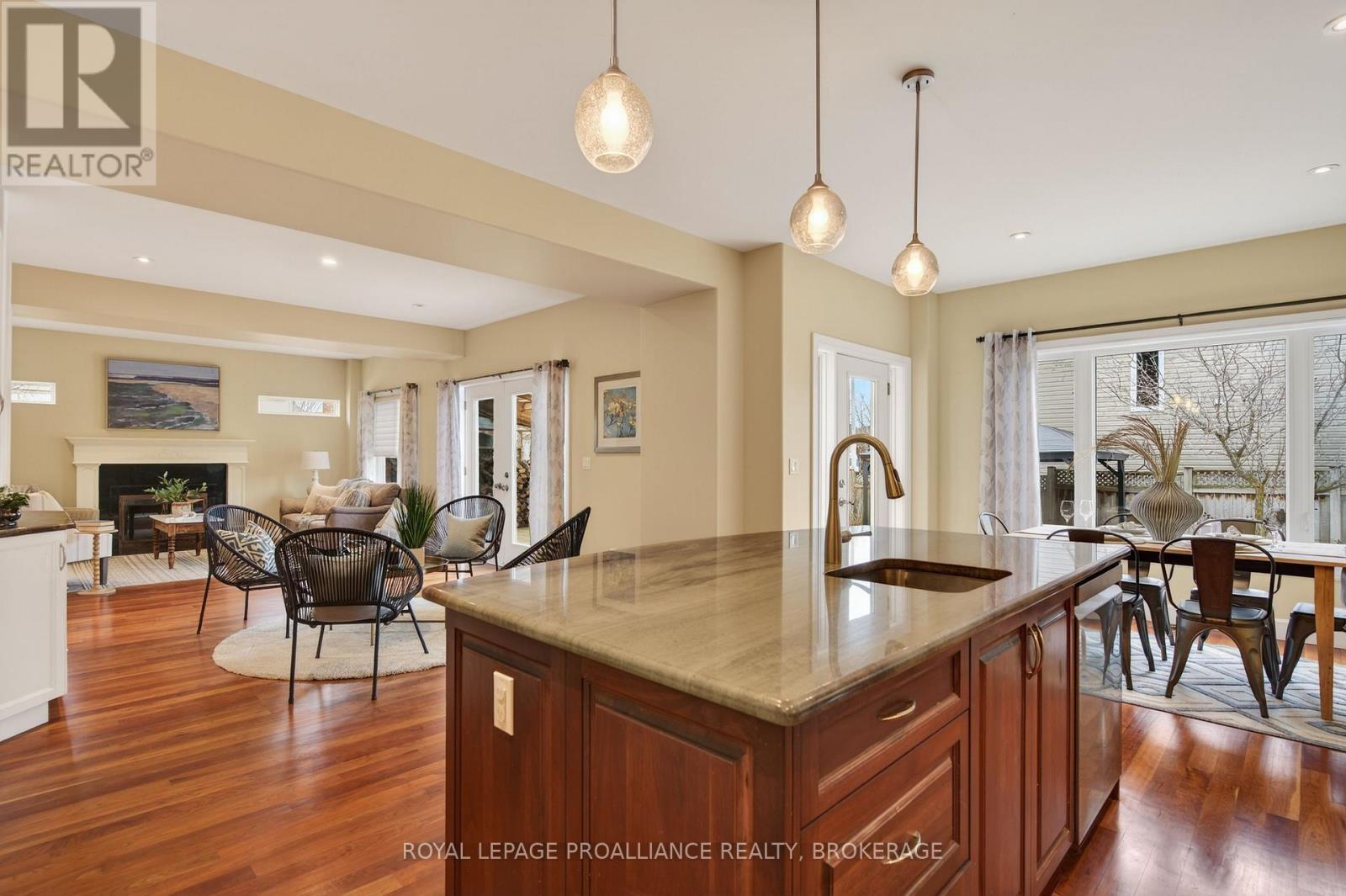 Modern Luxury on a Corner Lot in Cataraqui North. Bright, spacious, and beautifully finished, this 4+2 bedroom home offers refined living on a generous corner lot with a sunny south-facing backyard. The grand two-storey foyer features shaker-style columns and a striking cantilevered staircase leading to an open balcony landing. The main floor's open-concept layout showcases cherry-wood floors, granite counters, transom windows, and custom built-ins. A large prep island anchors the cherry kitchen, complete with slow-close cabinetry and a walk-in pantry. Oversized windows flood the space with natural light, continuing upstairs into four spacious bedrooms. The primary suite includes patio doors to a Juliet balcony and a stylish ensuite with a tiled walk-in shower and stone-topped vanity. The luxurious family bath features a roll-top clawfoot tub and separate shower. A second-floor laundry adds everyday convenience. The finished basement-with 9-foot ceilings-offers two additional bedrooms, a second kitchen, second laundry, and a large rec room, ideal for in-laws or teens. Outside, enjoy a covered gazebo patio, landscaped flower beds, and a deck with hot tub connections under a lean-to shelter. The property is equipped with hot tub and generator hookups, offering added comfort and peace of mind year-round. This home blends elegance and functionality-perfect for families, entertainers, or multi-generational living. (id:28469)