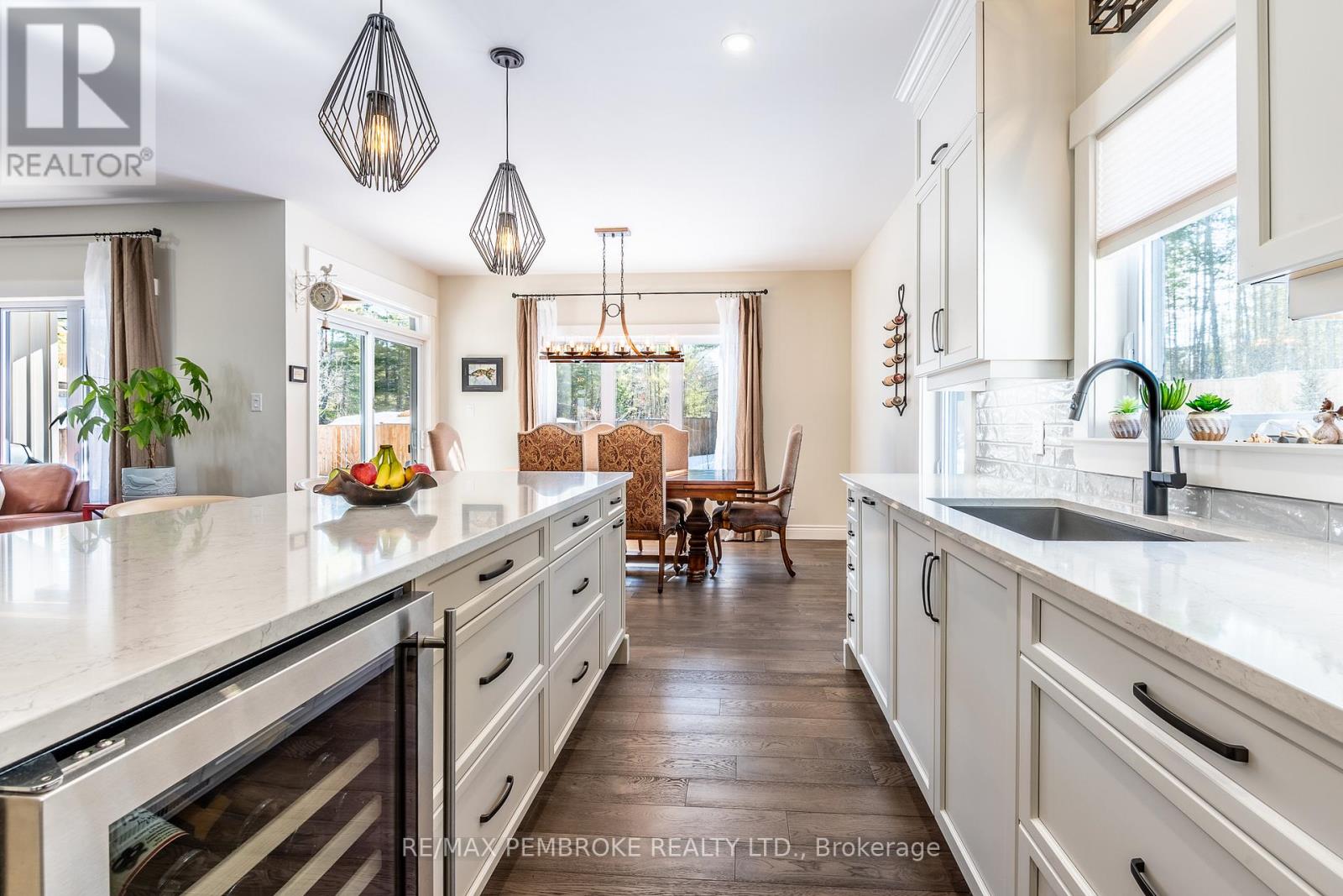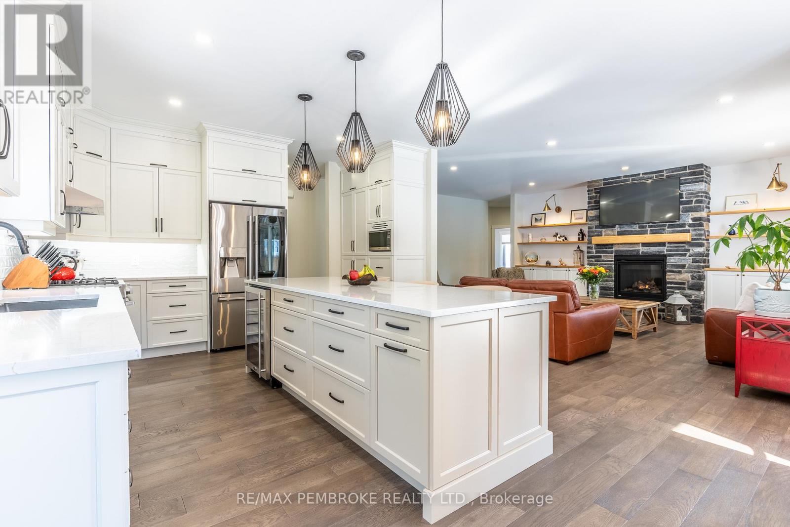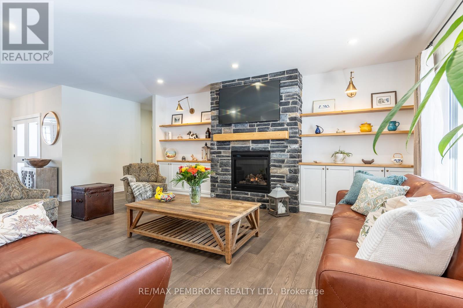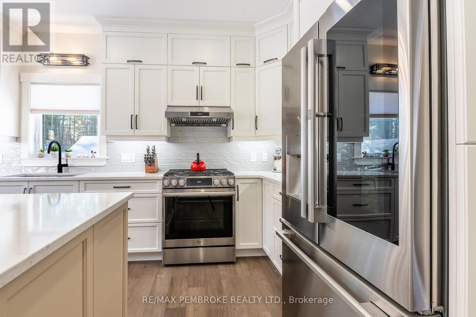 Set on a private, oversized pie-shaped lot with a wooded backdrop, this fully custom-built bungalow offers over 1,800 sq ft of refined main floor living, complemented by a beautifully finished lower level. Designed with intention throughout, this home delivers a seamless blend of quality craftsmanship and modern comfort. The main level features 9' ceilings, engineered hardwood flooring, and an open layout anchored by a gas fireplace with a stone surround and custom built-in cabinetry. The kitchen is both striking and functional, with ceiling-height cabinetry, quartz countertops, a sleek tile backsplash, and high-end appliances, including a gas range. A large island serves as a natural gathering space. The primary suite is thoughtfully designed, featuring a custom walk-in closet with a window for added light and a spa-inspired ensuite with a soaker tub, shower, and double vanity with quartz counters. Two additional bedrooms, a well-appointed main bath, and a spacious laundry and mudroom complete the upper level. The fully finished lower level extends the living space with two additional bedrooms, a third full bathroom and a spacious recreation area enhanced by a wet bar with dishwasher and wine fridge. A hardwood staircase, carpet-free design, central vacuum, and generous storage space further elevate the home's functionality. Outdoors, the property has been carefully landscaped with mature trees and gardens, offering both privacy and visual appeal. The fully fenced yard (approx. 300 ft), multi-zone irrigation system, gas connections for BBQ and fire pit, and a 21'x15' cedar deck with a partially covered section, create an ideal setting for outdoor living. The exterior showcases modern cladding with Douglas fir accents, while the insulated and drywalled garage, storage shed, and oversized driveway (accommodating up to six vehicles) complete the package. A rare opportunity to own a truly custom home where every detail has been thoughtfully considered. (id:28469)