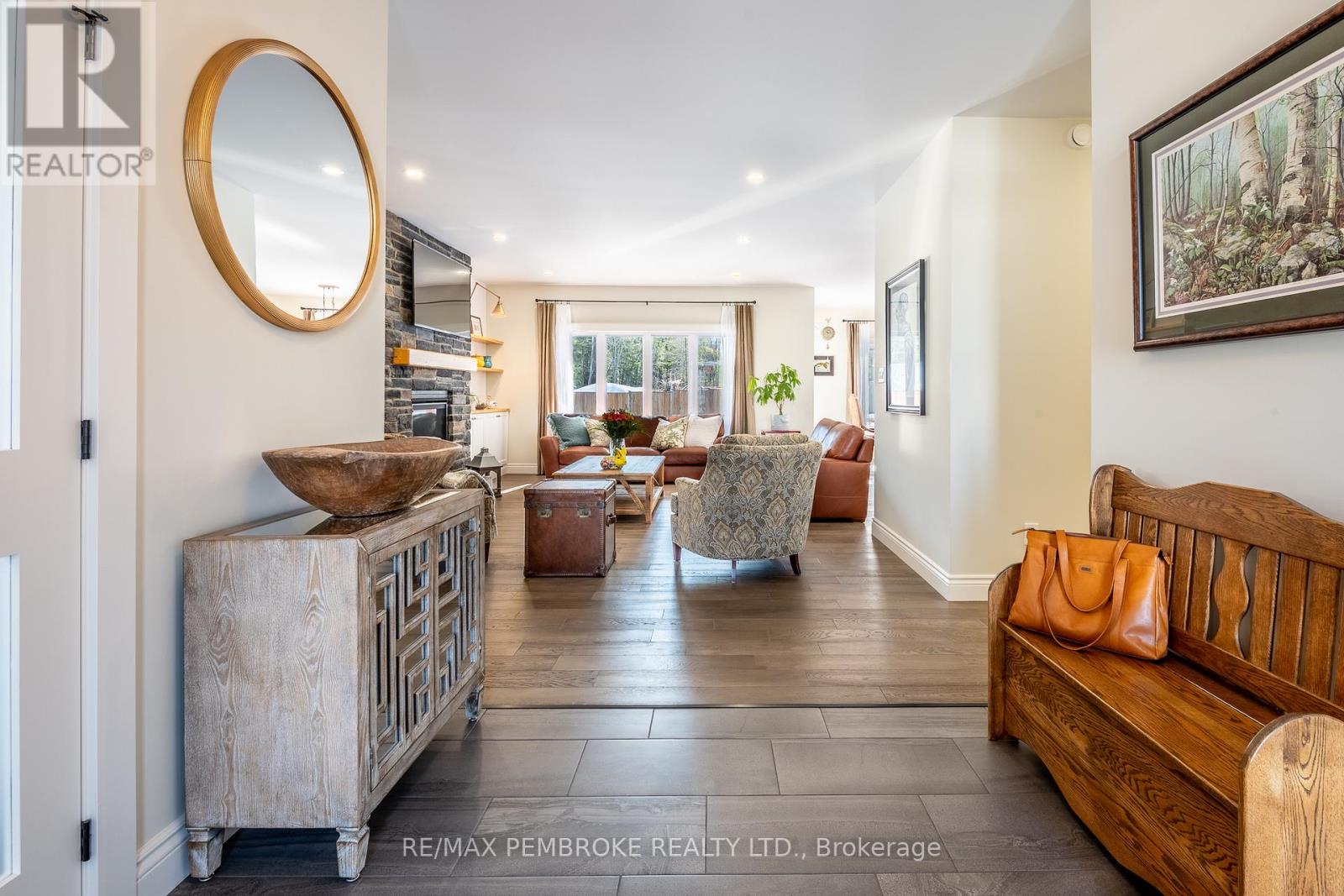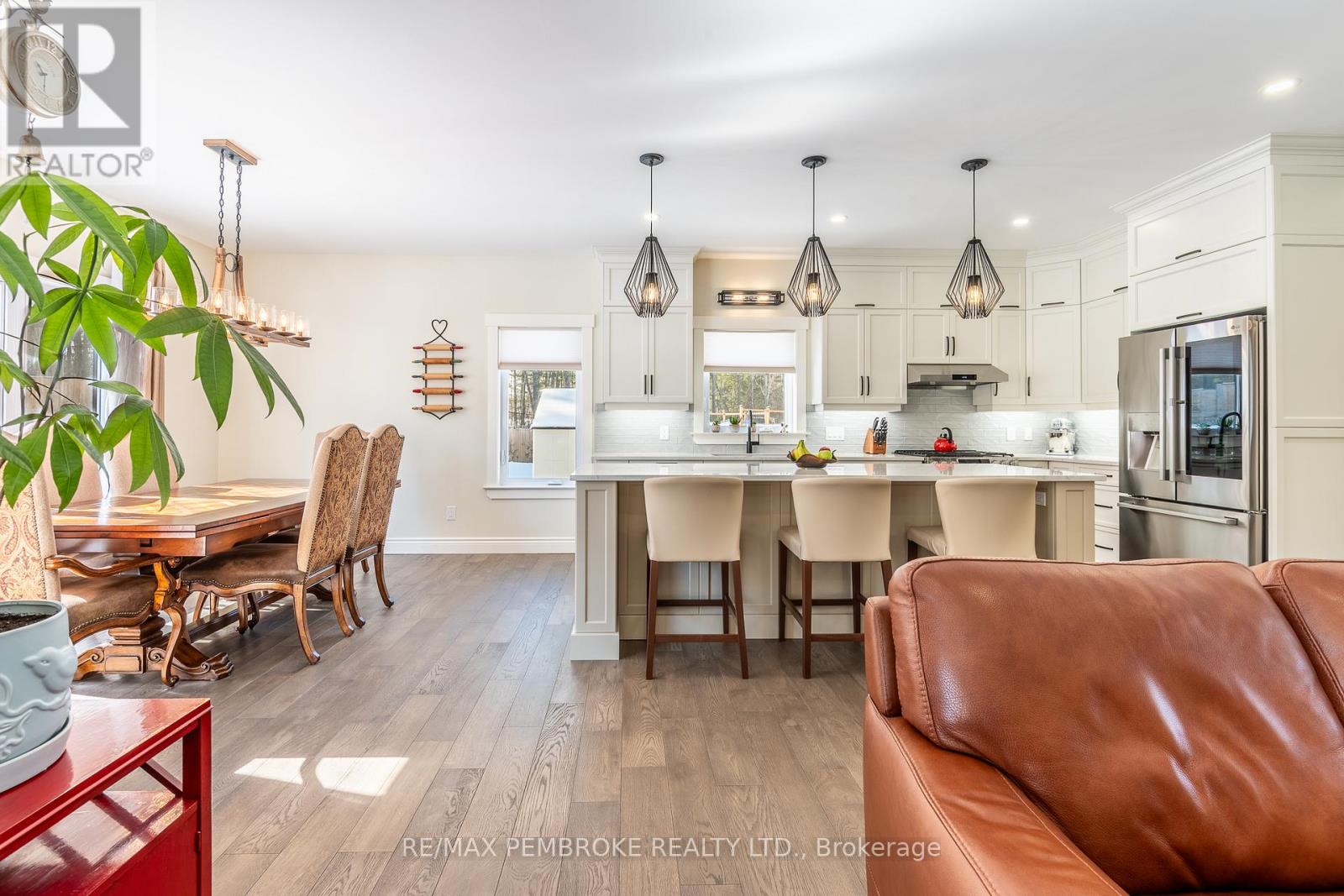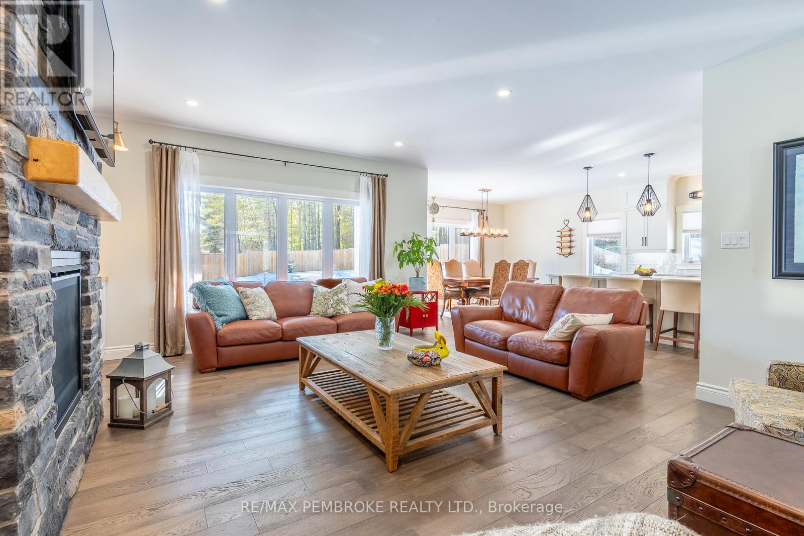 Set on a private, oversized pie-shaped lot with a wooded backdrop, this fully custom-built bungalow offers over 1,800 sq ft of refined main floor living, complemented by a beautifully finished lower level. Designed with intention throughout, this home delivers a seamless blend of quality craftsmanship and modern comfort. The main level features 9' ceilings, engineered hardwood flooring, and an open layout anchored by a gas fireplace with a stone surround and custom built-in cabinetry. The kitchen is both striking and functional, with ceiling-height cabinetry, quartz countertops, a sleek tile backsplash, and high-end appliances, including a gas range. A large island serves as a natural gathering space. The primary suite is thoughtfully designed, featuring a custom walk-in closet with a window for added light and a spa-inspired ensuite with a soaker tub, shower, and double vanity with quartz counters. Two additional bedrooms, a well-appointed main bath, and a spacious laundry and mudroom complete the upper level. The fully finished lower level extends the living space with two additional bedrooms, a third full bathroom and a spacious recreation area enhanced by a wet bar with dishwasher and wine fridge. A hardwood staircase, carpet-free design, central vacuum, and generous storage space further elevate the home's functionality. Outdoors, the property has been carefully landscaped with mature trees and gardens, offering both privacy and visual appeal. The fully fenced yard (approx. 300 ft), multi-zone irrigation system, gas connections for BBQ and fire pit, and a 21'x15' cedar deck with a partially covered section, create an ideal setting for outdoor living. The exterior showcases modern cladding with Douglas fir accents, while the insulated and drywalled garage, storage shed, and oversized driveway (accommodating up to six vehicles) complete the package. A rare opportunity to own a truly custom home where every detail has been thoughtfully considered. (id:28469)