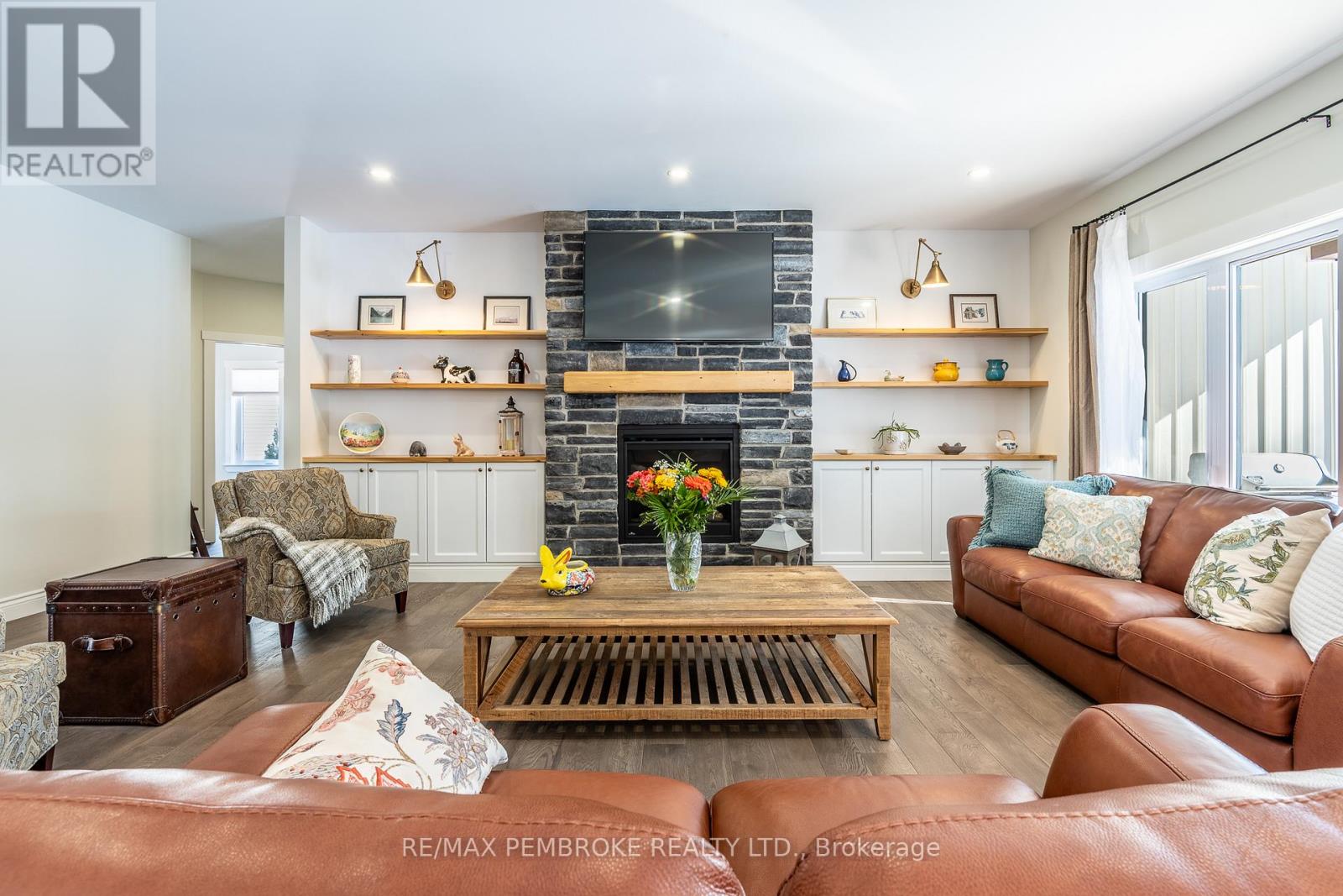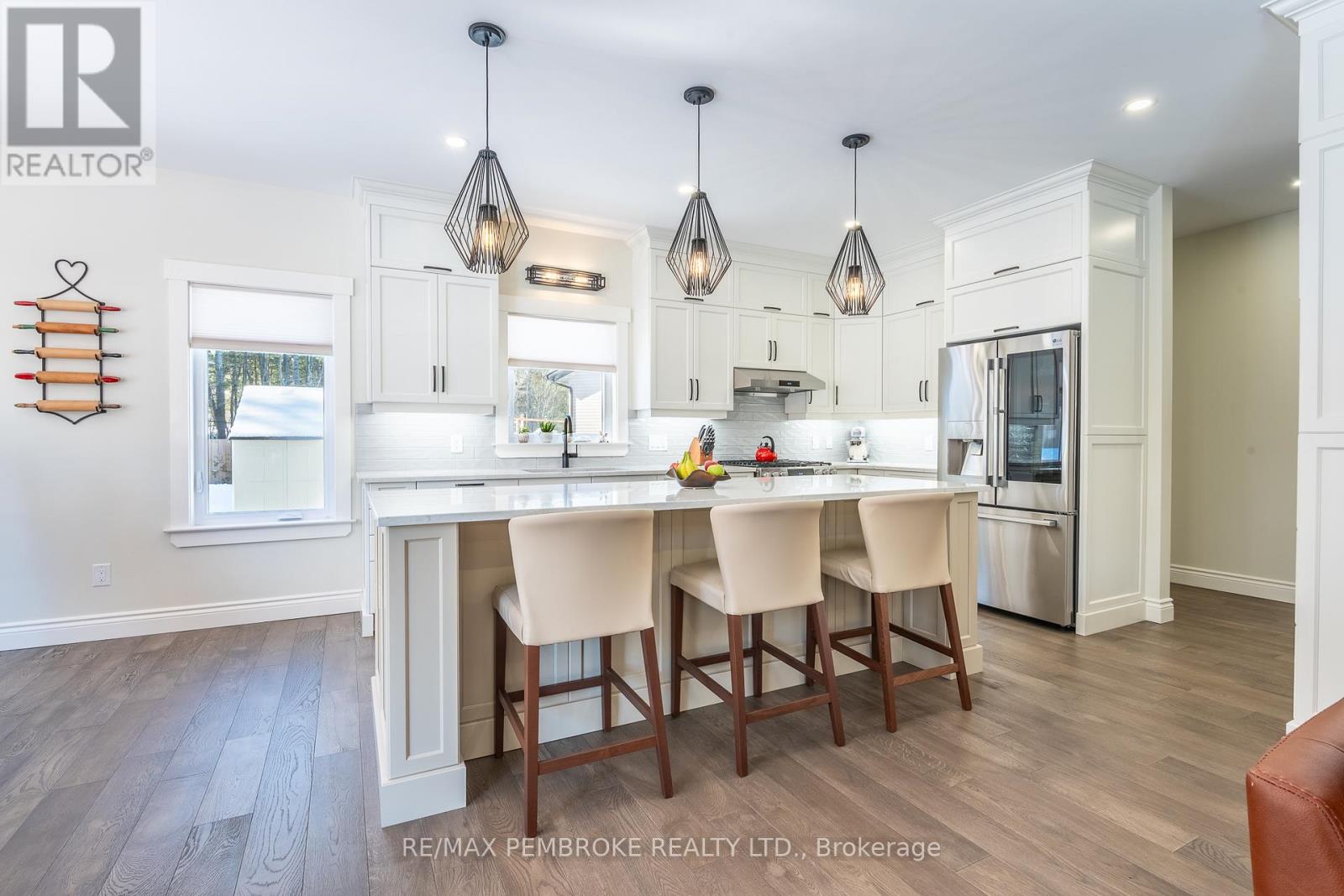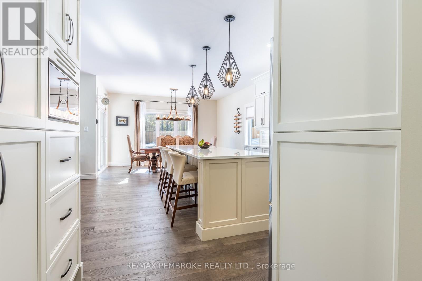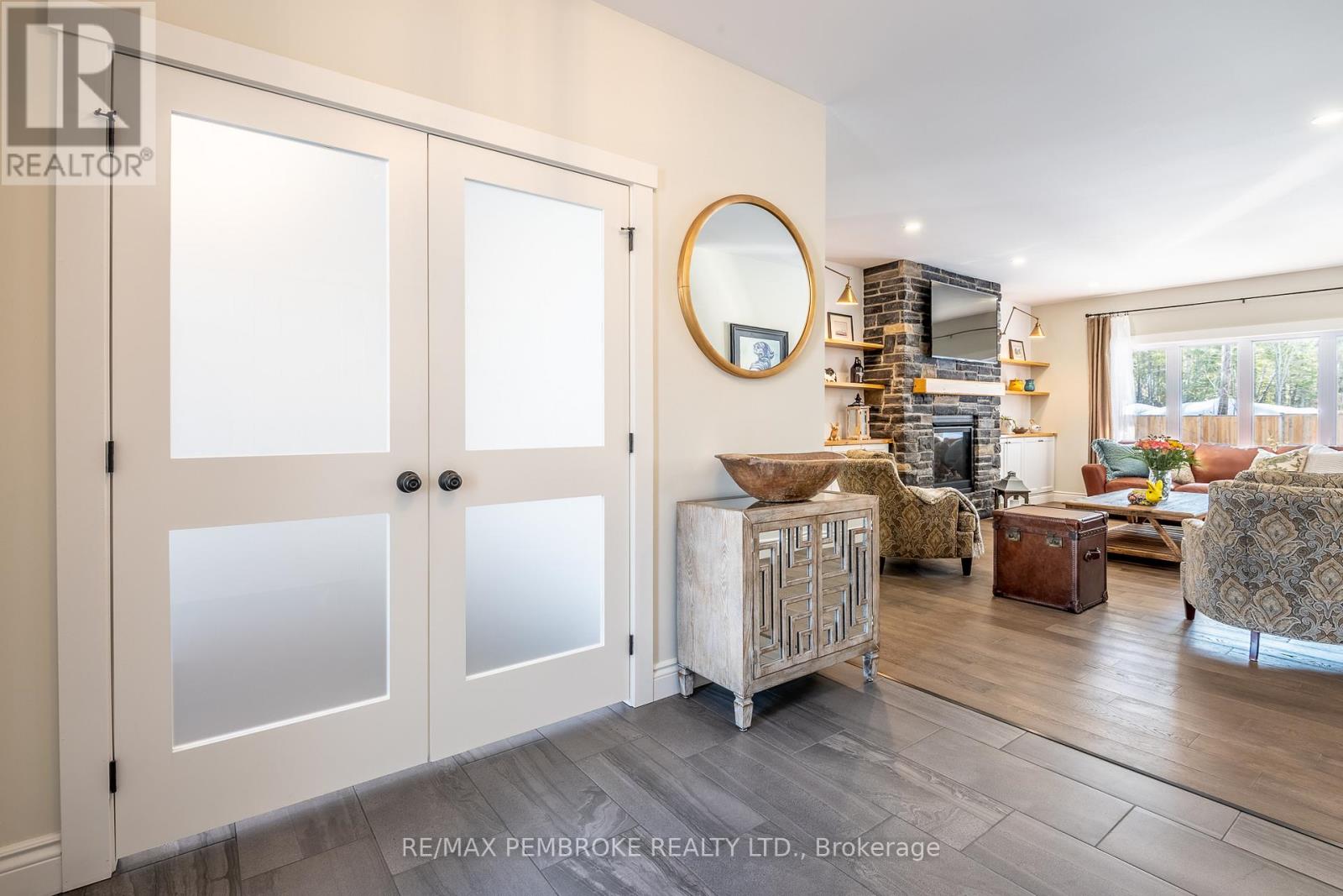 Set on a private, oversized pie-shaped lot with a wooded backdrop, this fully custom-built bungalow offers over 1,800 sq ft of refined main floor living, complemented by a beautifully finished lower level. Designed with intention throughout, this home delivers a seamless blend of quality craftsmanship and modern comfort. The main level features 9' ceilings, engineered hardwood flooring, and an open layout anchored by a gas fireplace with a stone surround and custom built-in cabinetry. The kitchen is both striking and functional, with ceiling-height cabinetry, quartz countertops, a sleek tile backsplash, and high-end appliances, including a gas range. A large island serves as a natural gathering space. The primary suite is thoughtfully designed, featuring a custom walk-in closet with a window for added light and a spa-inspired ensuite with a soaker tub, shower, and double vanity with quartz counters. Two additional bedrooms, a well-appointed main bath, and a spacious laundry and mudroom complete the upper level. The fully finished lower level extends the living space with two additional bedrooms, a third full bathroom and a spacious recreation area enhanced by a wet bar with dishwasher and wine fridge. A hardwood staircase, carpet-free design, central vacuum, and generous storage space further elevate the home's functionality. Outdoors, the property has been carefully landscaped with mature trees and gardens, offering both privacy and visual appeal. The fully fenced yard (approx. 300 ft), multi-zone irrigation system, gas connections for BBQ and fire pit, and a 21'x15' cedar deck with a partially covered section, create an ideal setting for outdoor living. The exterior showcases modern cladding with Douglas fir accents, while the insulated and drywalled garage, storage shed, and oversized driveway (accommodating up to six vehicles) complete the package. A rare opportunity to own a truly custom home where every detail has been thoughtfully considered. (id:28469)