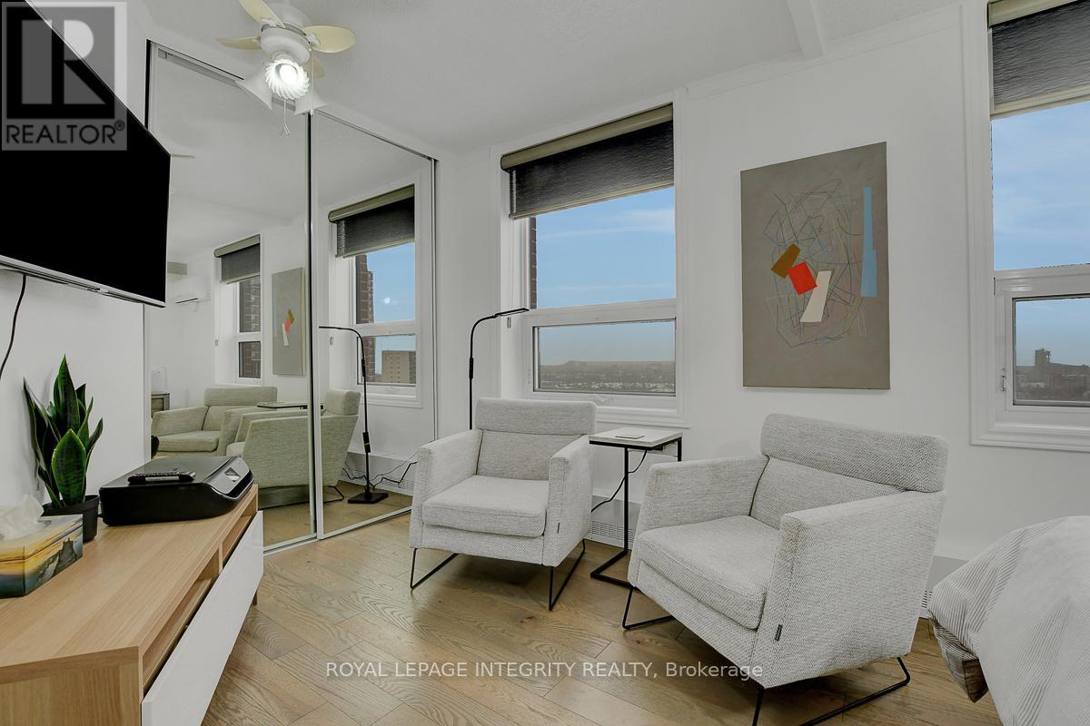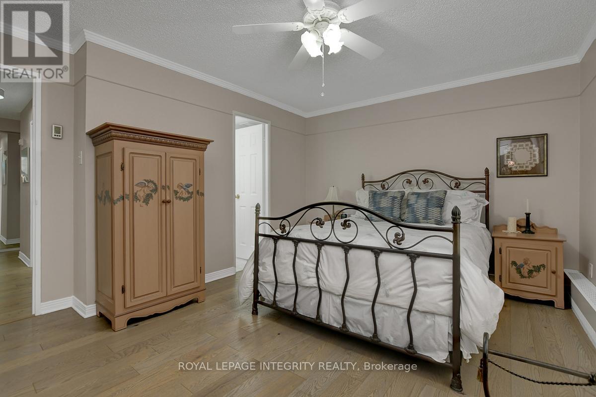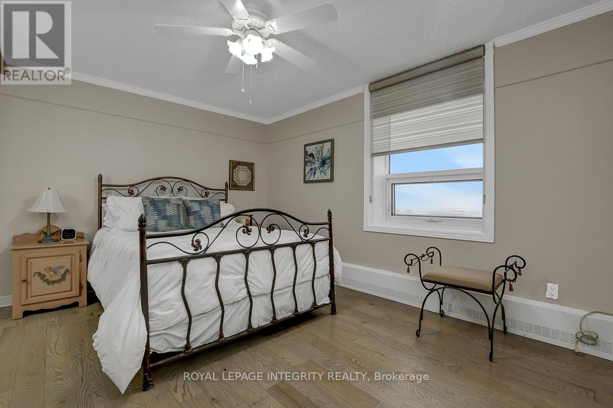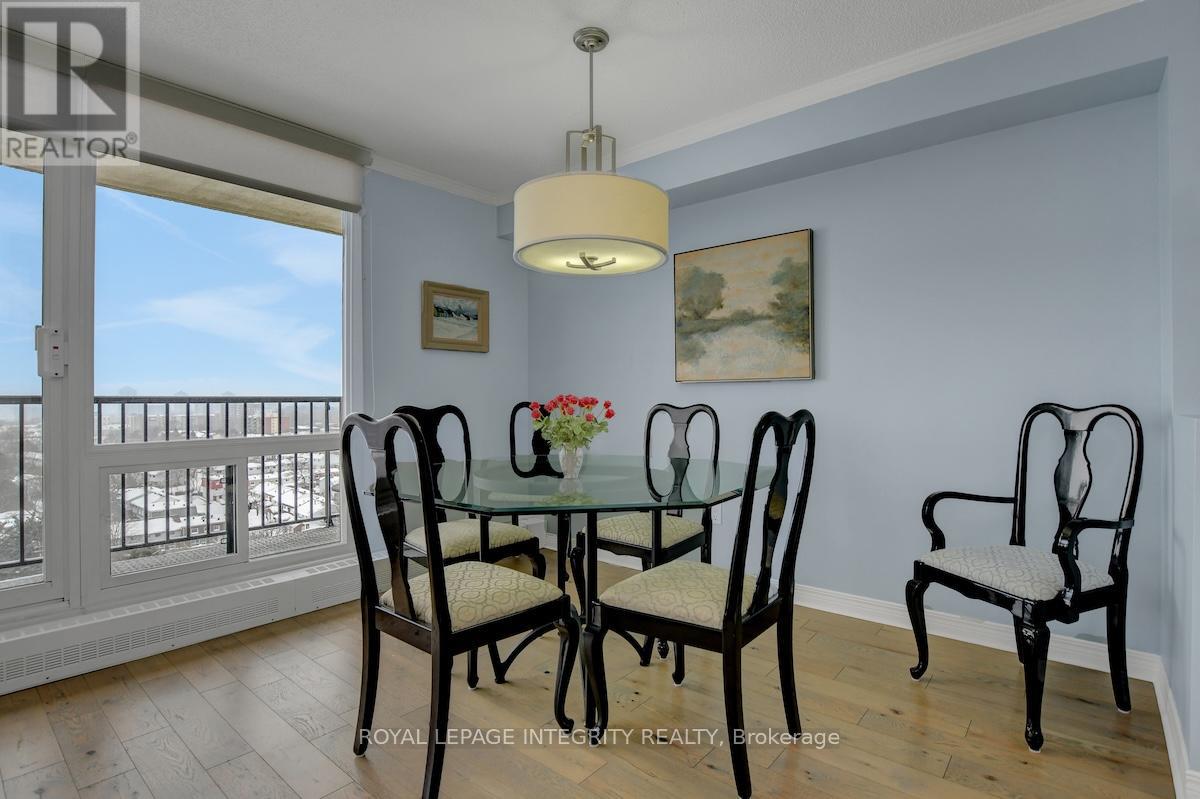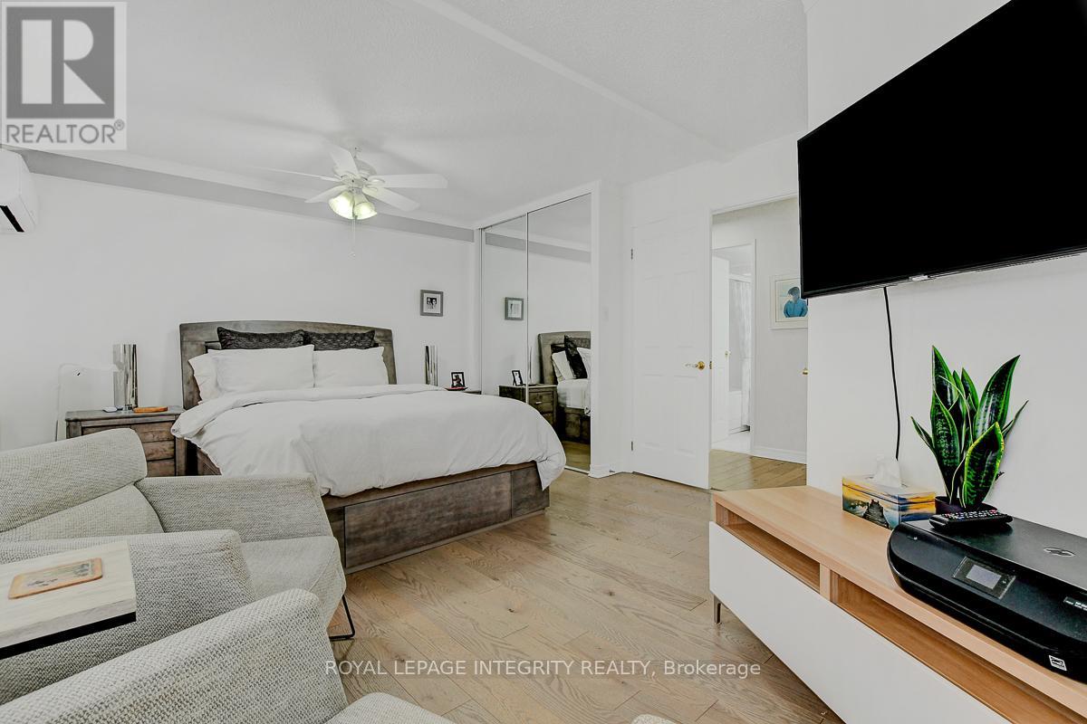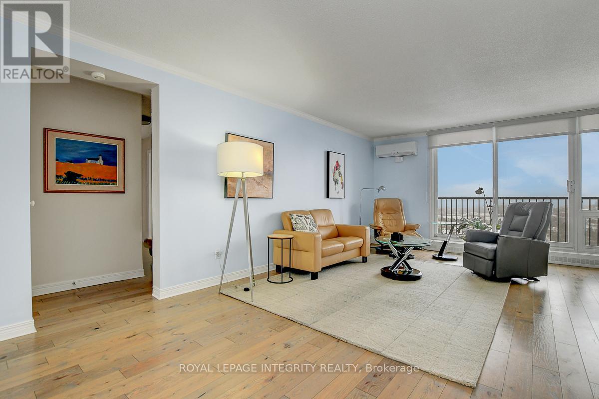 Wonderful opportunity to own a spacious CORNER UNIT that has been converted from a 3 bedroom to a 2 bedroom. Inviting foyer leads to open-concept L-shaped living/dining room layout that is flooded with natural light. Lovely kitchen with modern cabinetry, stylish backsplash, double sinks, ample storage with pots and pans drawers as well as stainless steel dishwasher and stove. Generously-sized primary and secondary bedrooms. Convenient walk-in and 2 piece ensuite bathroom. Beautiful hardwood floors complement the neutral colour palette throughout. A true turn-key property that will impress even the most discerning of buyers. Onsite management, amenities, indoor pool, large balcony, guest parking, bicycle storage and storage locker for your convenience. Book your showing today! (id:28469)
