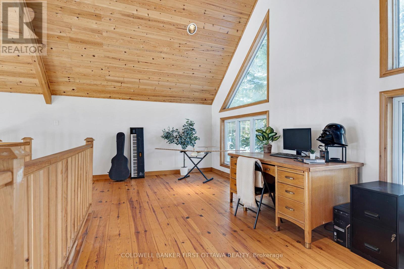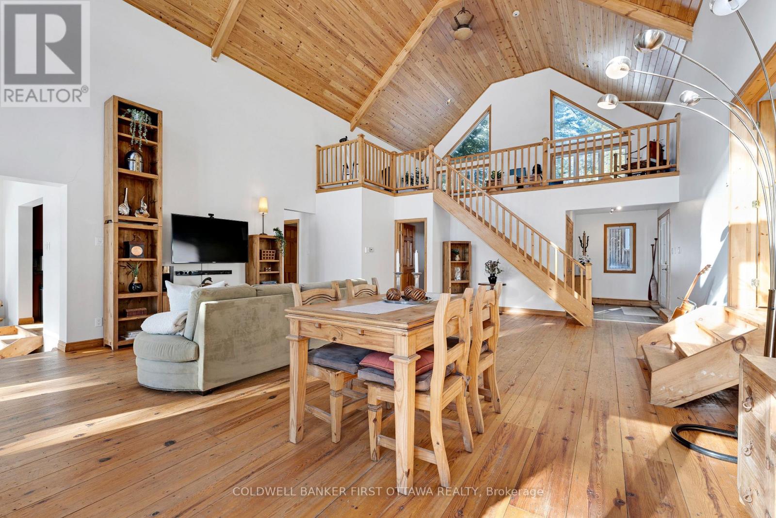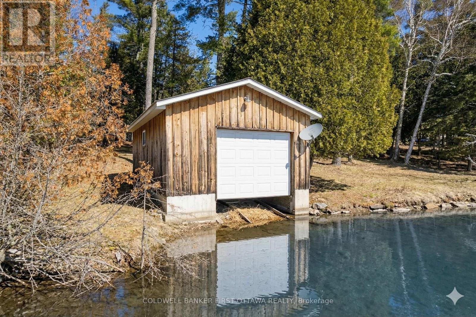 In a quiet bay on White Lake, sunny and spacious home with warm wood tones that blend beautifully into the natural surroundings. Ideally sited, this home offers full lake views. Your boat is also well taken care of, with a boathouse and marine rail for proper winter storage. The home's front foyer welcomes you with easy-care ceramic floor and convenient closet. From here, step into the Great Room with big light-filled spaces opening up to the soaring 22' high cathedral ceiling. Lovely hand-chiseled stone fireplace adds charming character and includes woodstove insert. Pine plank and ceramic flooring flow thru the home. In the sunroom, relax while soaking in views of the continuous beauty of each season. Warmly inviting kitchen features granite countertops, granite island and attractive tongue & groove pine ceiling. Primary suite vaulted ceiling and garden doors to your own deck; the ensuite has two-sink quartz vanity and glass shower. Primary suite also has sitting nook with woodstove, for a cozy retreat. Comfortable second bedroom and four-piece bathroom. Main floor laundry room with window. The second floor has large loft for flex space - with amazing panoramic lake views. Large deck perfect for lounging and watching the sun and then the moon cross over the lake. Oversized detached single garage has workbench, two 240 V outlets, concrete floor and overhead electrical heater. New septic installed 2014; septic inspected in 2024. The boathouse has hydro, ramp plus electronic winch to help put the boat in and out of the lake. The boathouse, garage and home all have metal roofs. Boat launch and huge storage shed with three doors. Easy, level access to 245' of clear, sandy and rocky waterfront. Approx 8' deep off end of dock. Great swimming, boating and fishing. In winter enjoy cross-country skiing, snowshoeing and ice fishing on the lake. Hi-speed and cell service. 25 mins to Arnprior for shopping or 25 mins to Pakenham ski hill and golf course. 45 mins to Kanata. (id:28469)
