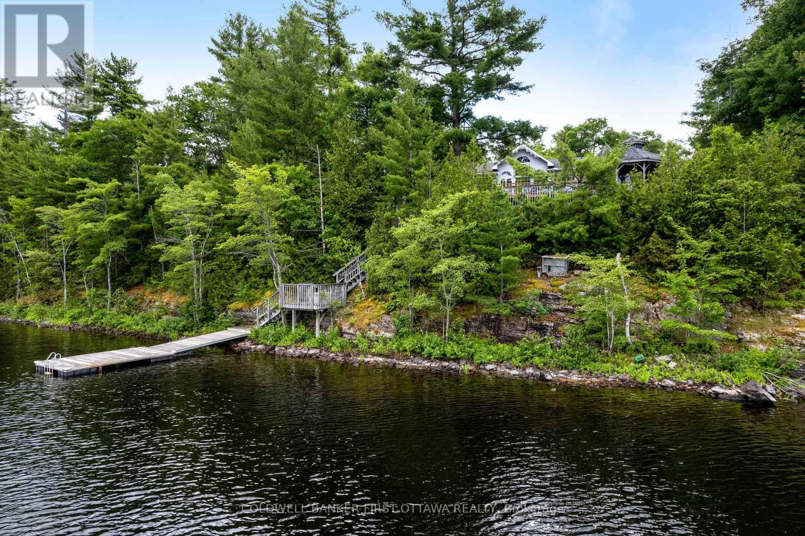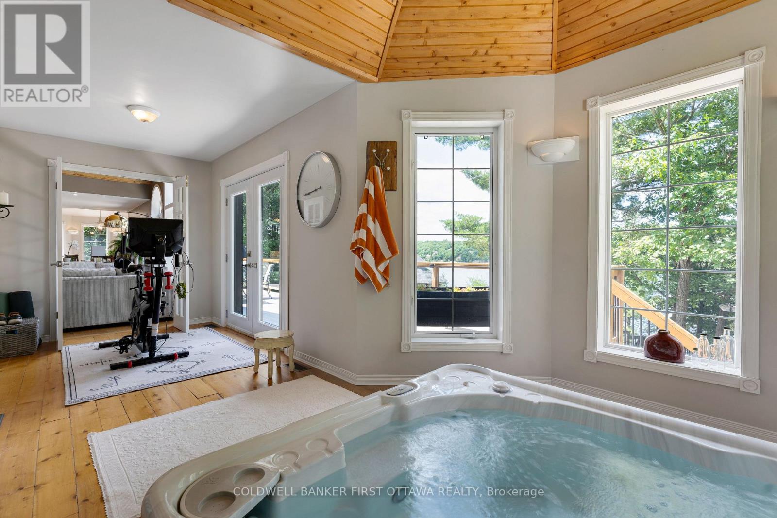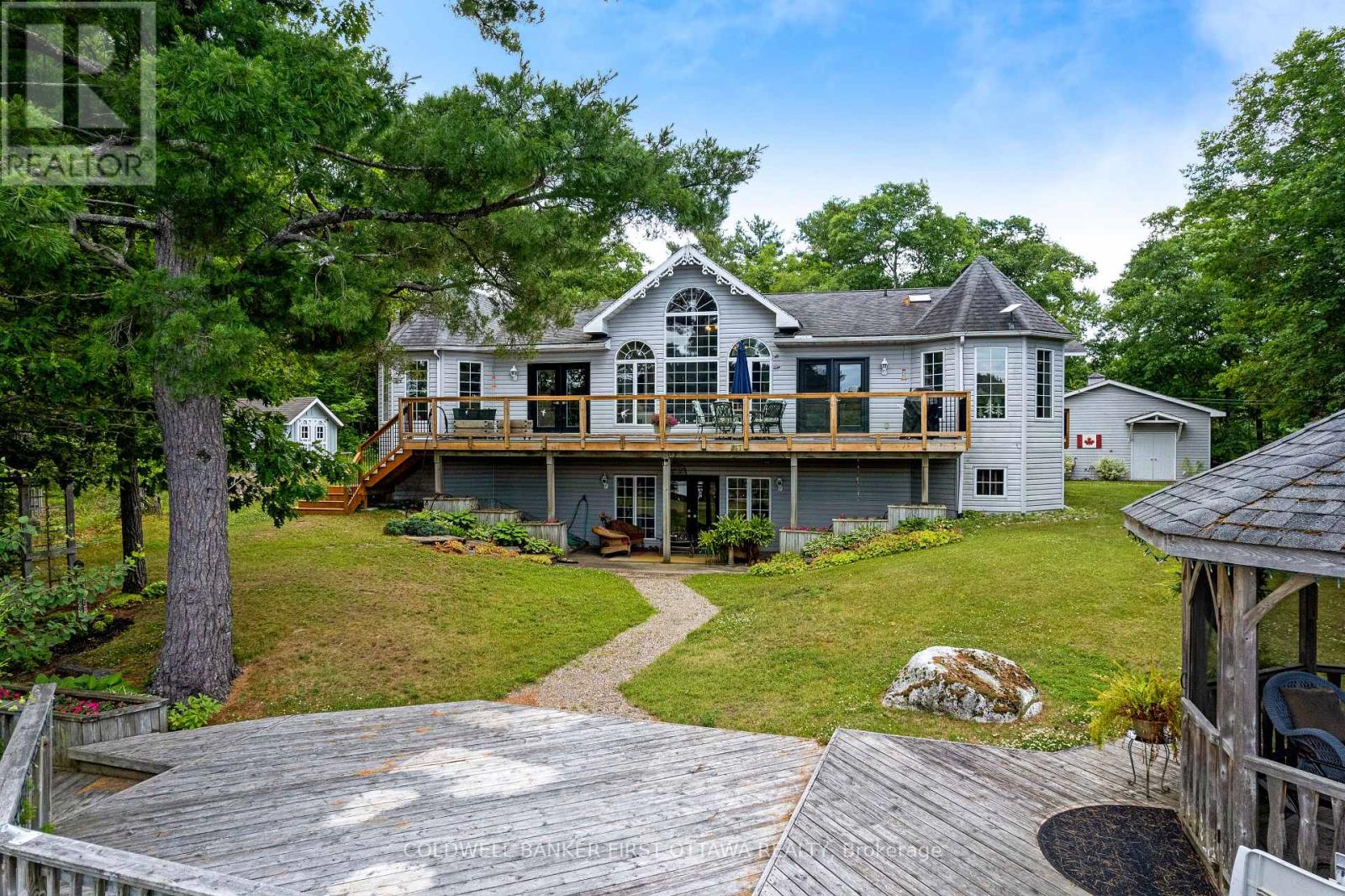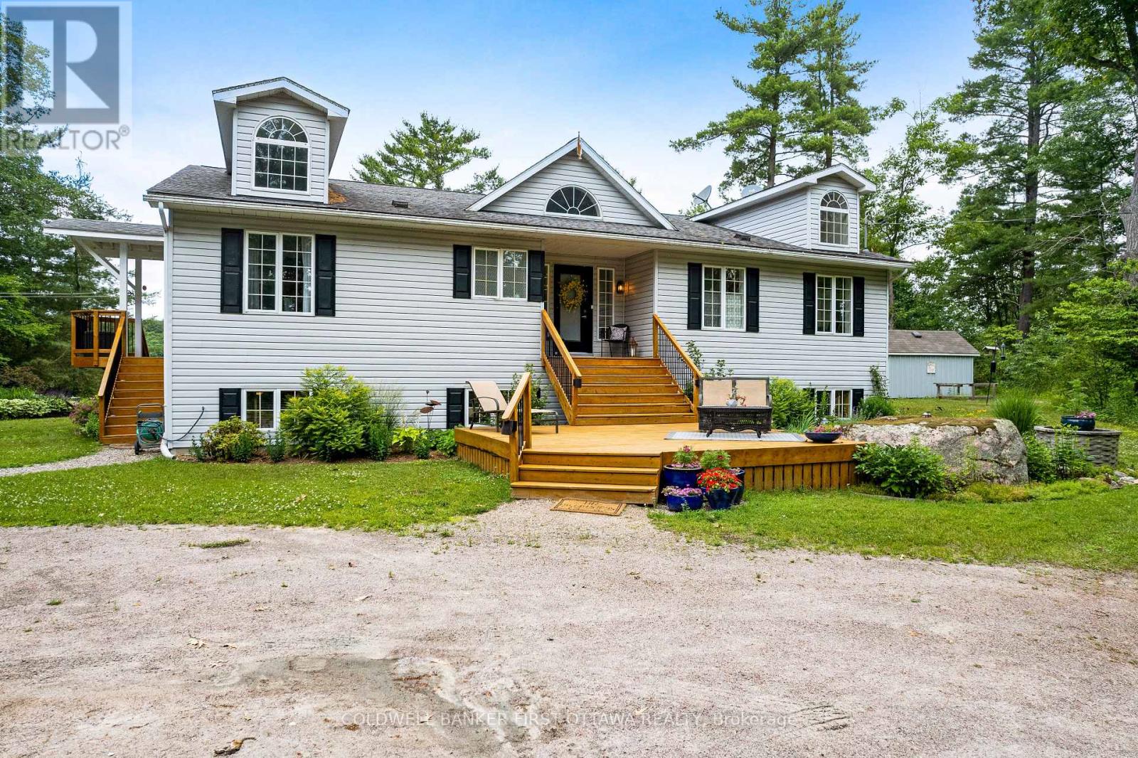 Step onto the deck with your morning coffee, listen to the loons, and watch the mist lift off Kennebec Lake. This is what you bought a cottage country home for. Tucked at the end of a quiet, privately maintained road, 1718 Blue Heron Ridge is a custom raised bungalow with 4,000 square feet of finished living space, built for the way families actually live, with room to spread out, host the grandkids, or set up multi-generational living without anyone tripping over each other. The main floor opens up under a vaulted pine ceiling, anchored by wide-plank oak floors and a kitchen that earns its keep: oversized island, granite counters, farmhouse sink, and patio doors that spill onto a freshly rebuilt deck. A wood-burning fireplace warms the living room. A den with custom cabinetry and a dedicated home office mean working from the lake is a real option, not a fantasy. The primary suite is generous, with a luxurious ensuite and walk-in closet. An indoor hot tub looks out over the water, and the second bathroom hides a full cedar sauna. Downstairs, the walkout lower level adds two more bedrooms, a full bath, family room, games area, wet bar, cold room, and all the storage and hobby space you've been wishing for. The detached double garage includes a 30 by 9 woodworking shop for the maker in the family, plus a dedicated wood storage structure to keep the season's supply dry and close to hand. Outside, a landscaped acre of perennial gardens, extensive decking, and a ridgeline gazebo make the yard feel like a private resort. Off the end of the dock: deep, clean swimming water. Major updates since 2020 include the kitchen, bathrooms, exterior and patio doors, all three decks, a new AC, and seven new windows in 2026. Road association fee is just $400 per year. One hour to Kingston, two to Ottawa, three to downtown Toronto. Book your private tour before someone else calls it home. (id:28469)