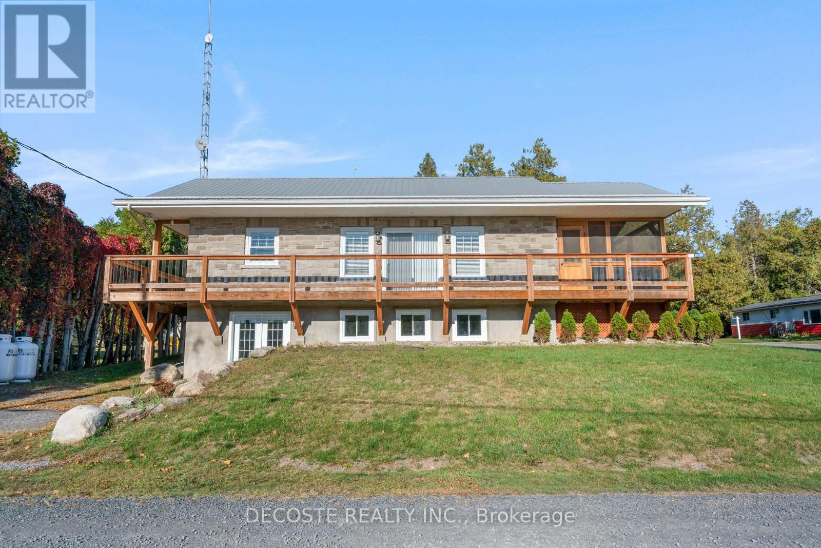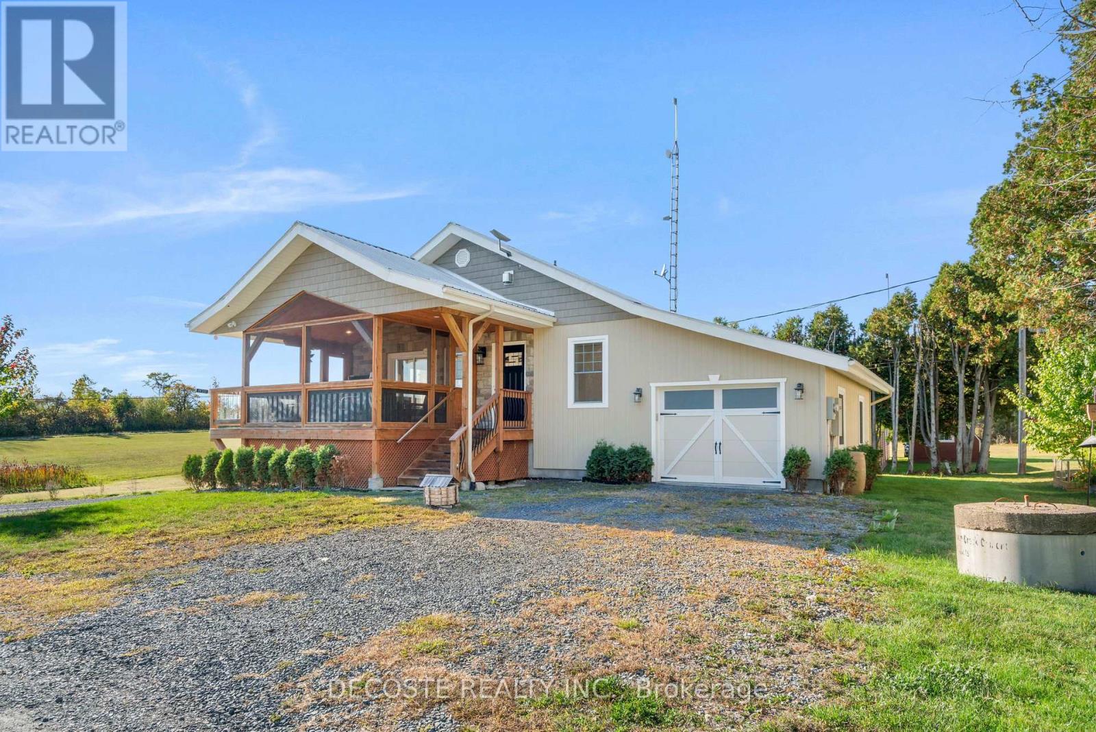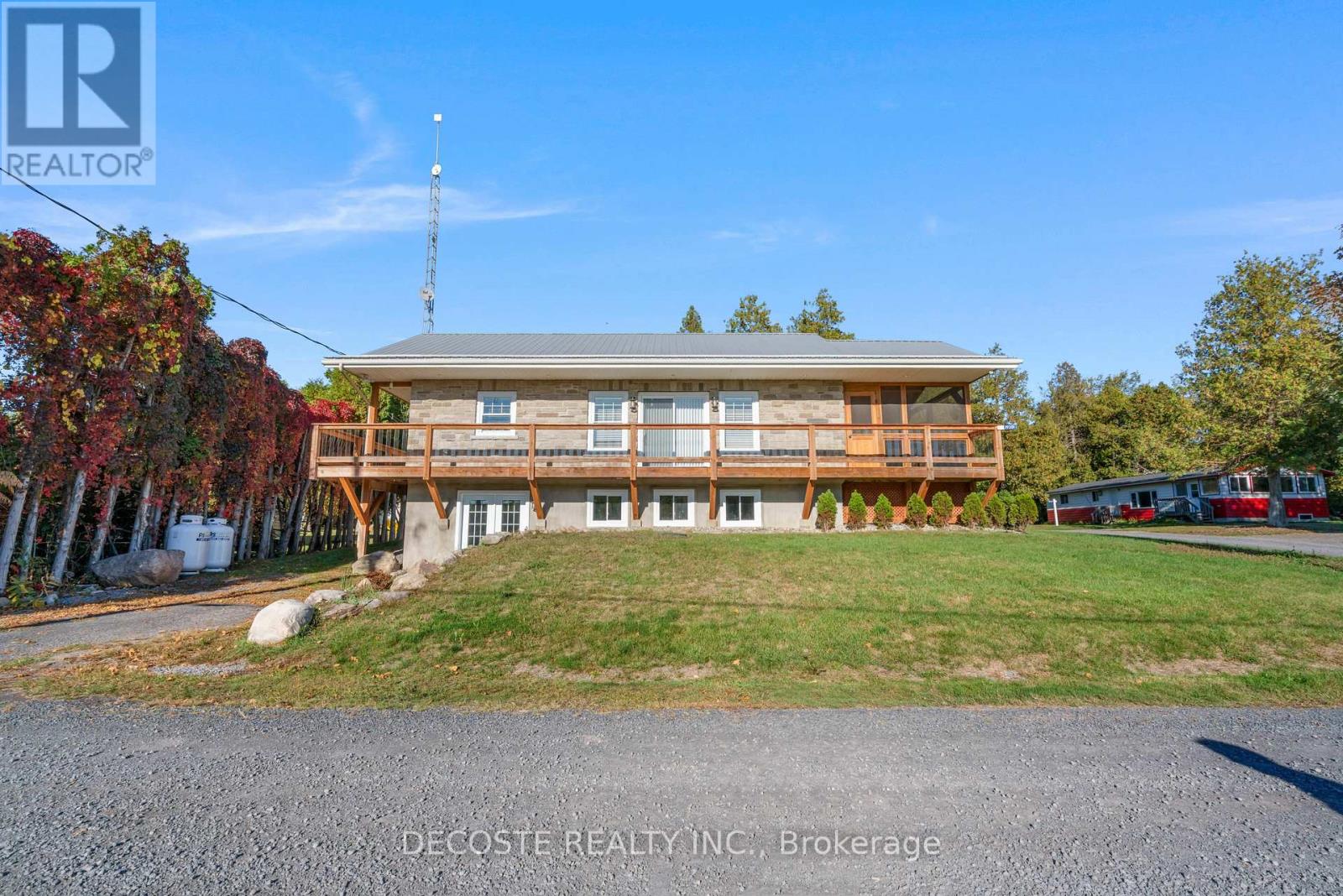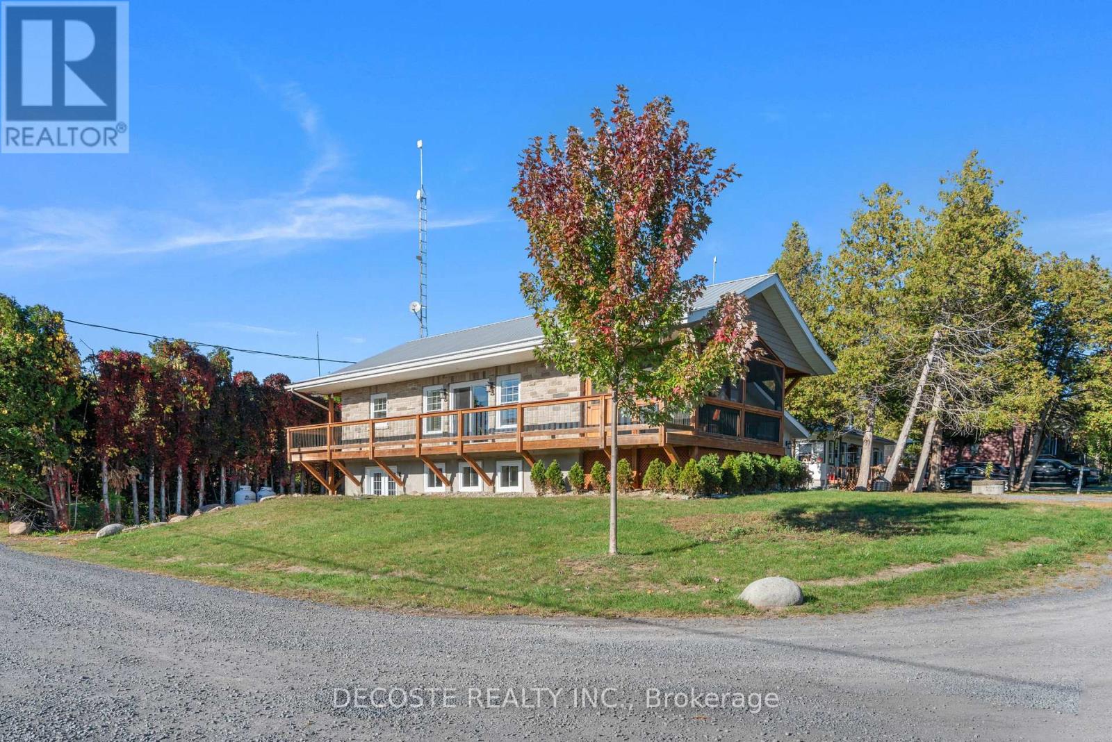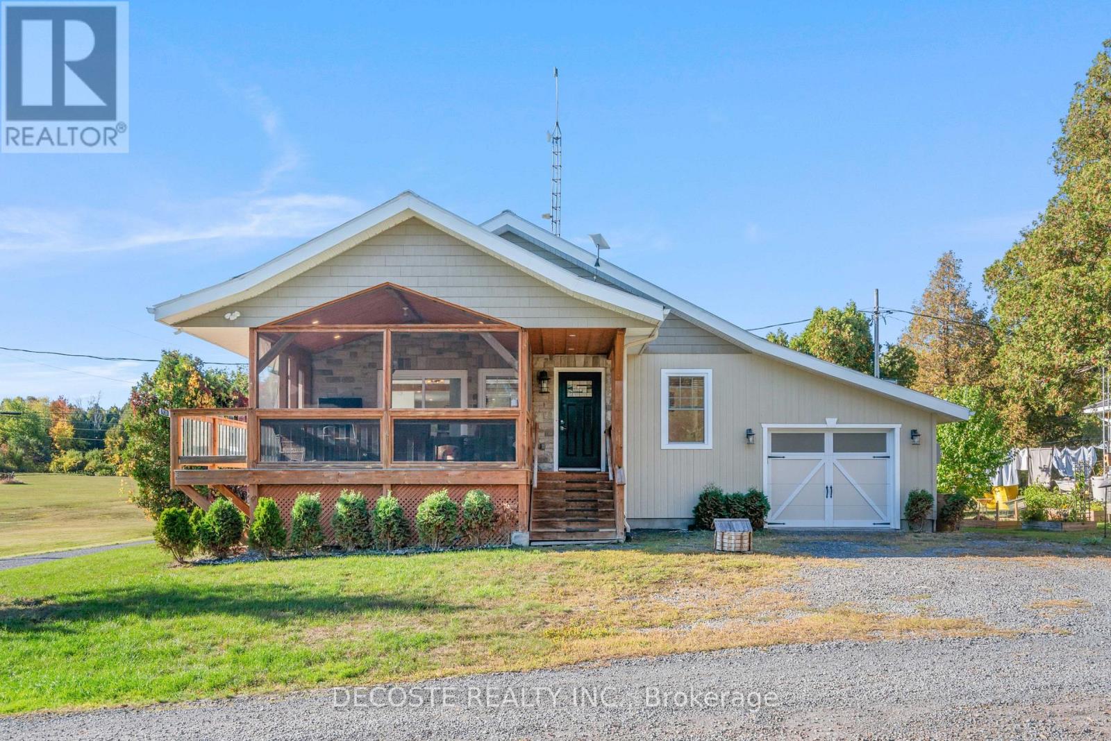 Spectacular Home with a Magnificent View of Loch Garry Lake! Built in 2017 with quality craftsmanship, this raised bungalow offers stunning lake views and modern comfort. The stone exterior and two-sided wraparound deck set the tone for relaxed lakeside living. Enjoy the enclosed 3-season porch featuring a built-in propane fireplace and TV area - the perfect spot to unwind year-round. Additional highlights include an attached single-car garage, a walk-out basement with potential for an in-law suite, and radiant floor heating throughout for cozy winters, complemented by a heat pump for efficient air conditioning in summer. The main floor showcases exposed barn beams, a bright modern kitchen with a farmhouse sink, quartz countertops, built-in oven and stove, and stainless steel appliances. Ceramic flooring, ceiling fans, and two sets of patio doors leading to the deck and covered porch add to the homes charm and functionality. With direct access to Loch Garry and a beautiful sandy beach, this property offers more than just a home its a retreat where you can truly relax and enjoy life by the water. (id:28469)
