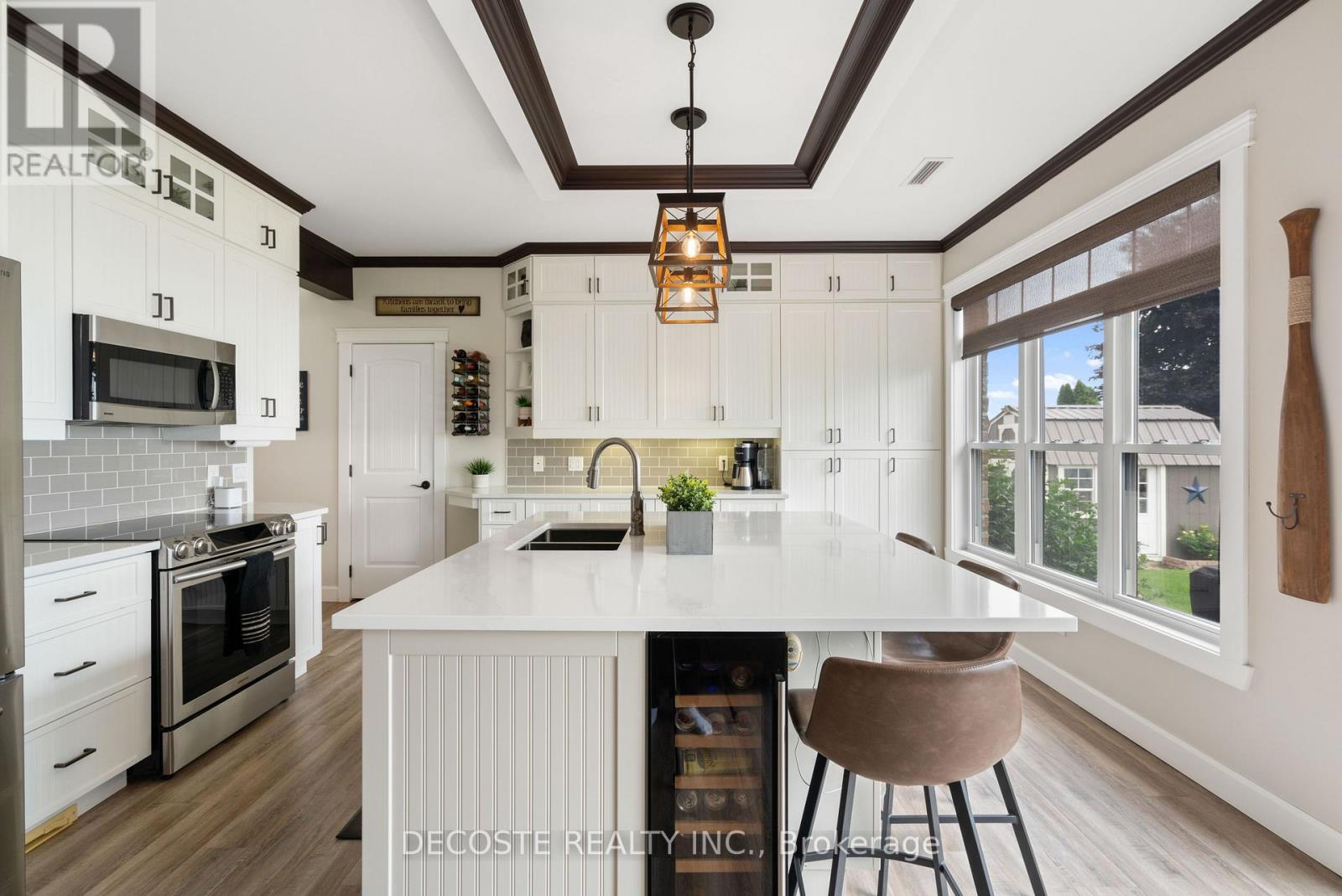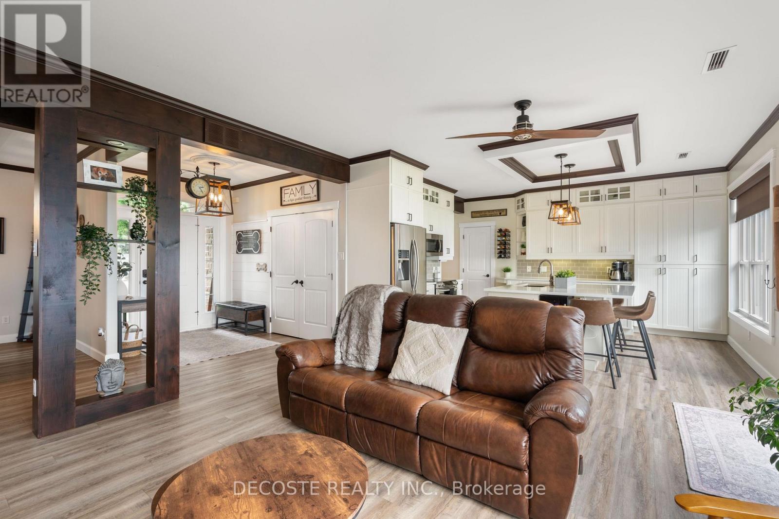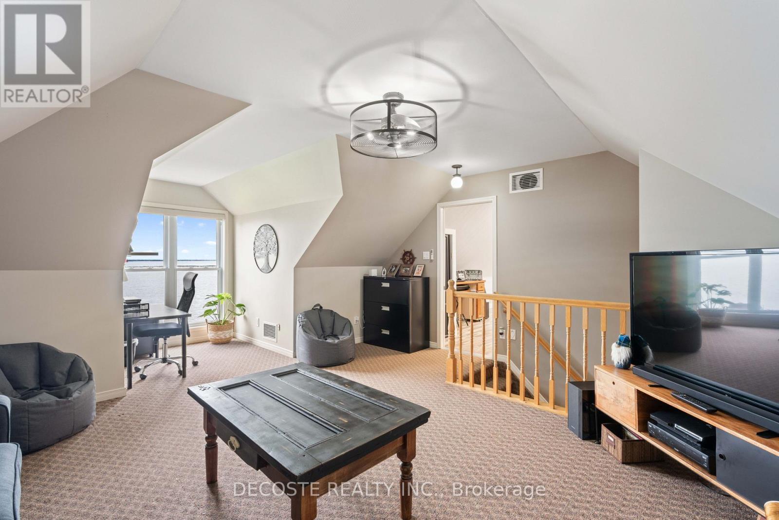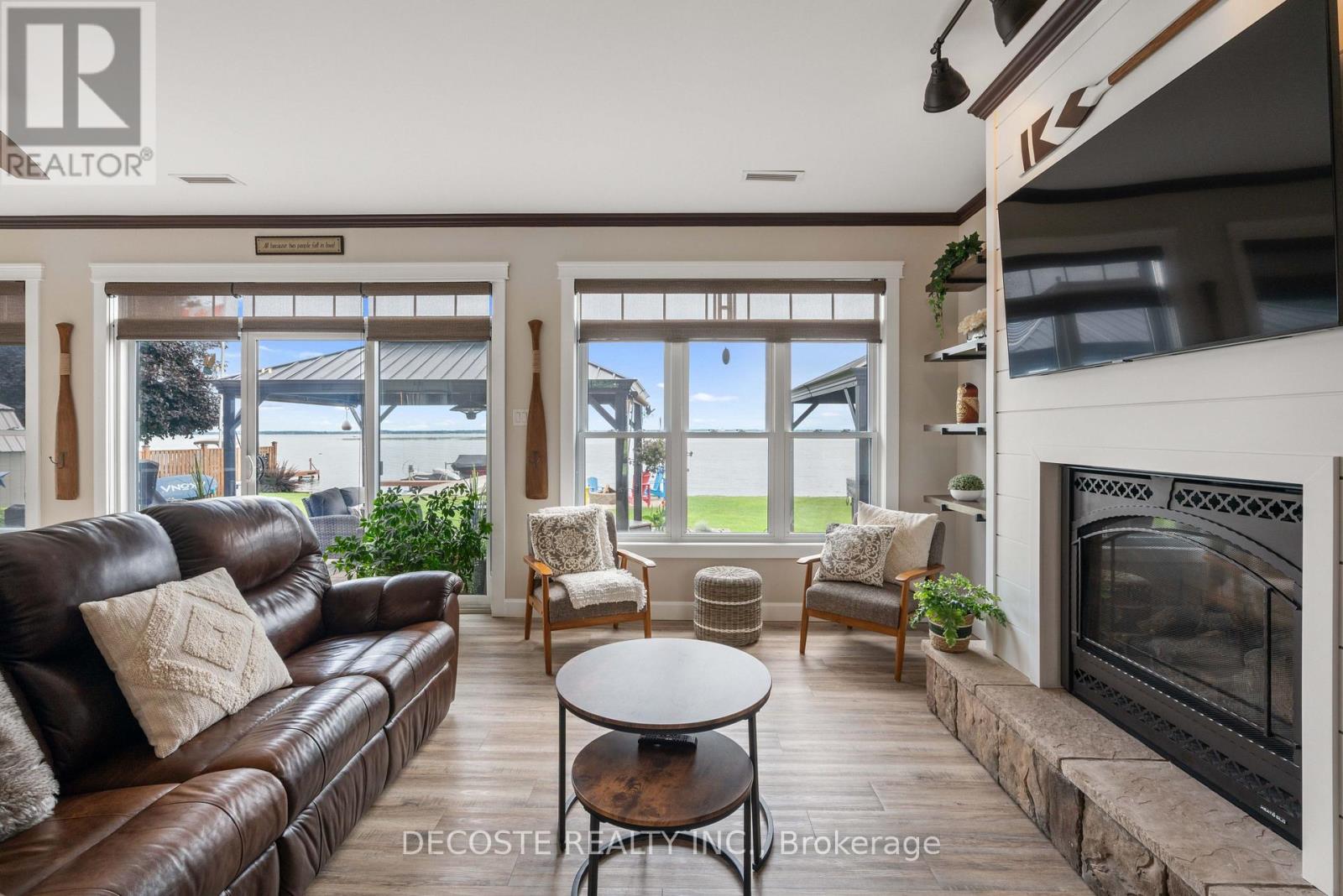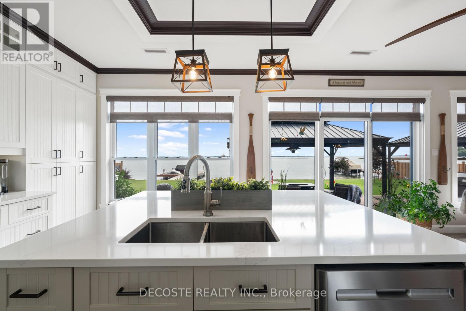 Magnificent waterfront bungalow overlooking Lake St. Francis! This meticulously maintained home epitomizes luxury and comfort. With 100 feet of waterfront, a 50-ft dock, and outstanding outdoor amenities-including garden sheds, a hot tub, gazebos, an interlock sitting area with firepit, and a manicured fenced lawn-this property is perfect for relaxation and entertaining. Inside, the modern kitchen features quartz countertops, a center island with a mini bar fridge, and ample cabinet space, flowing seamlessly into the living and dining areas with stunning water views. The main floor offers 2 bedrooms, a 5-piece bathroom, and a convenient laundry room with space for an additional fridge. Efficient radiant floor heating and central air conditioning provide year-round comfort. The upper level includes a versatile sitting area and a spacious recreation room. An insulated attached double car garage offers plenty of storage. This exceptional property blends modern amenities with breathtaking natural surroundings, making it the perfect waterfront retreat. (id:28469)