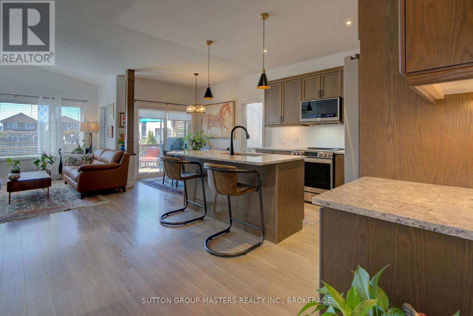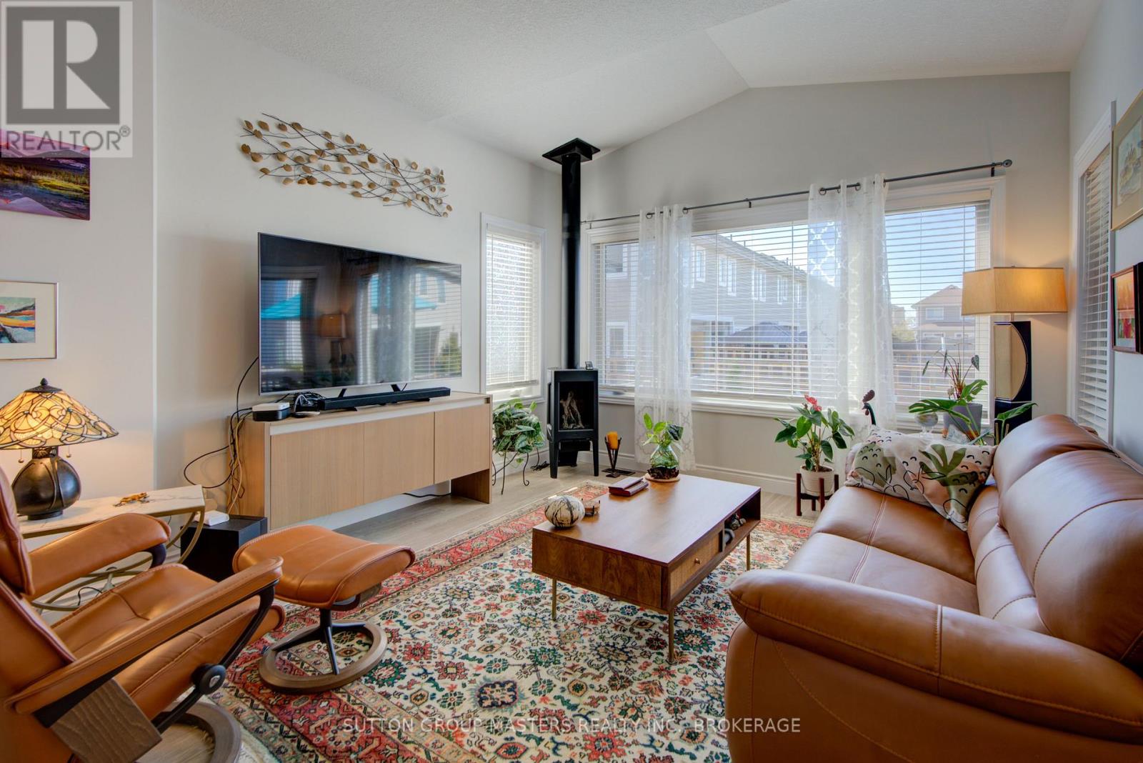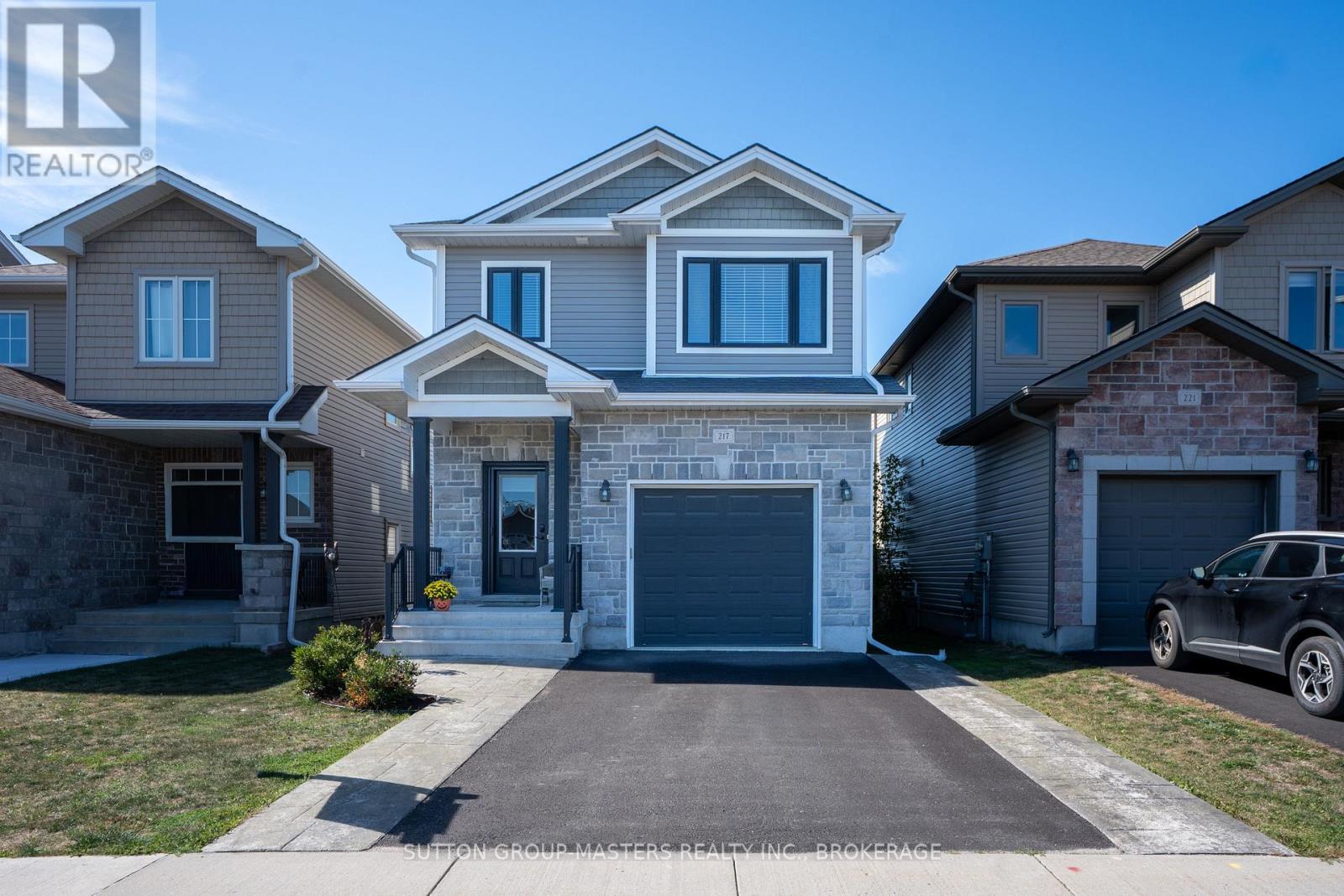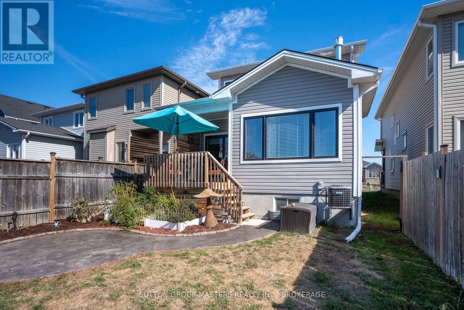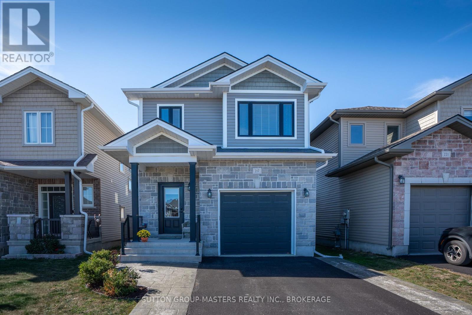Move-in ready detached 3-bedroom, 2.5-bath home located in Kingston's sought-after West End, just minutes from the future site of Kingston General Hospital. The bright, open-concept main floor is flooded with natural light from eight windows, custom blinds and patio doors. The living room impresses with a vaulted ceiling and cozy corner fireplace. The adjacent kitchen is thoughtfully designed with a center island offering seating, quartz countertops, matching backsplash, pot lighting, crown molding on cupboards and pantry, an induction stove, touch faucet, and under-cabinet lighting. The dining area, located just off the kitchen, provides easy access to the covered rear patio through patio doors-perfect for indoor-outdoor living. The fully fenced backyard features a stamped concrete patio, ideal for entertaining or relaxing with family and friends. Upstairs you'll find three well-appointed bedrooms, including a spacious primary suite complete with a walk-in closet and a 3-piece ensuite featuring a stand-up shower. The second floor also includes a convenient laundry room with ample shelving and a laundry table. The professionally finished basement offers vinyl plank flooring and a large recreation room, providing plenty of space for family enjoyment. Additional highlights include on-demand hot water, central air conditioning, and an updated HRV (2024) and a gas line to BBQ outside. Just minutes to the 401, shopping and schools. (id:28469)