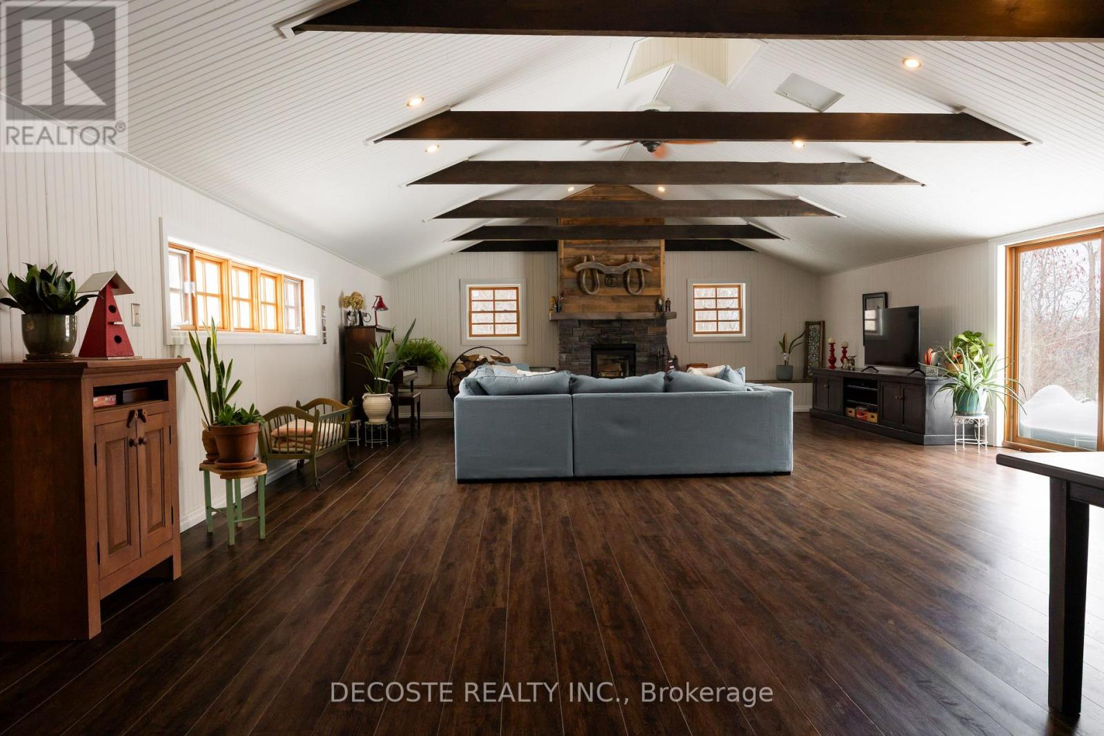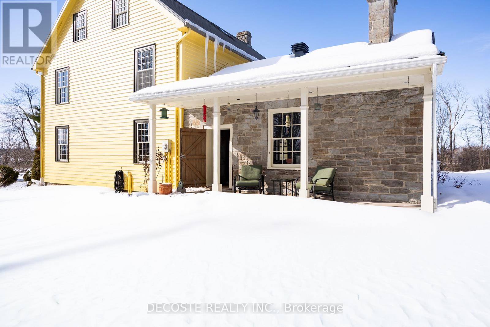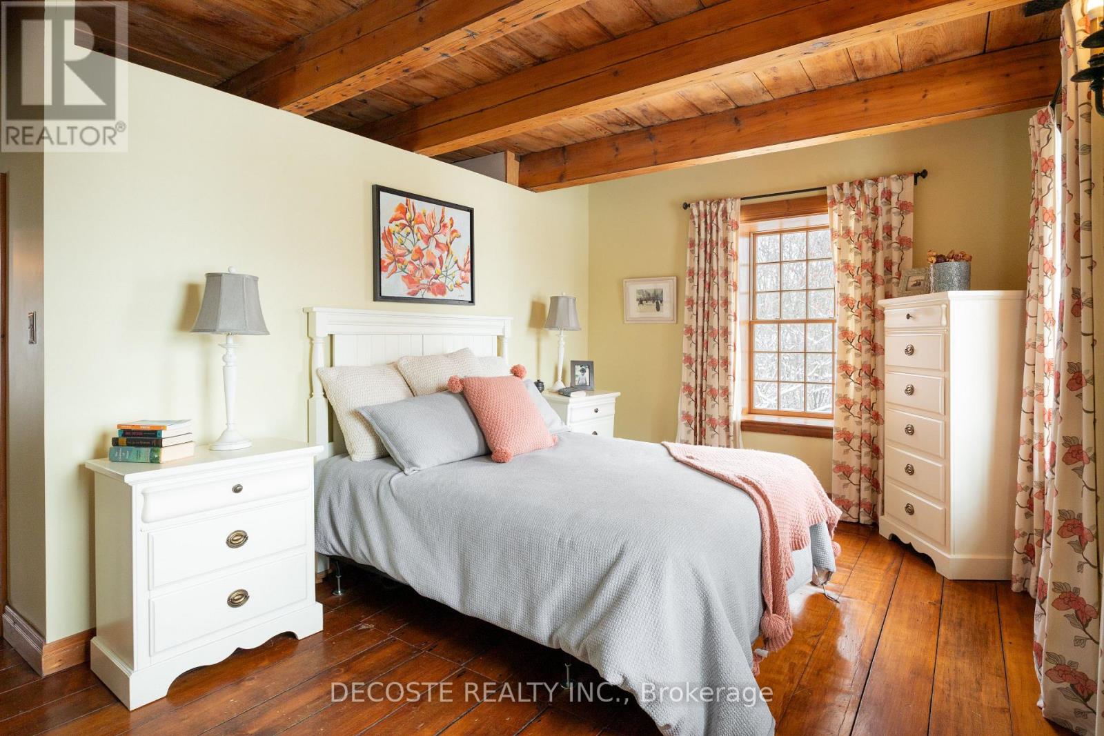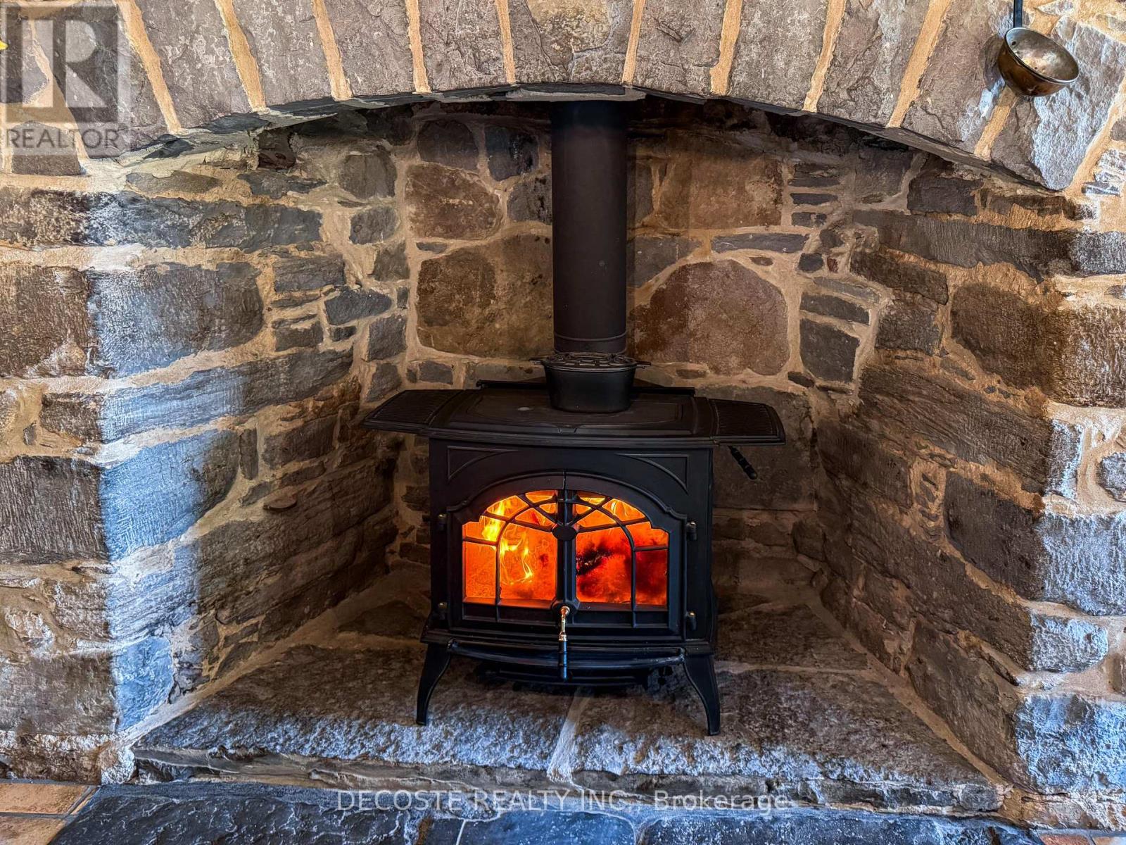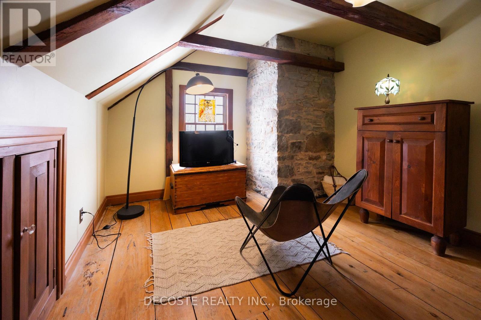 Historic Stone Estate on Over 6.5 Acres - The Curry House (Circa 1806). Step into history with this extraordinary stone residence known as The Curry House, built in 1806 and believed to be the third oldest home in Glengarry. Set on 6.5 picturesque acres, this remarkable property has been meticulously maintained and thoughtfully preserved, offering a rare opportunity to own a true piece of local heritage while enjoying the comforts of modern family living. This impressive 4-level home features 6 spacious bedrooms and 3 full bathrooms, making it ideal for a large or multi-generational family. Timeless character is showcased throughout with exposed interior stone walls, original pine plank flooring, rich wood mouldings, and beautiful exposed beams that highlight the home's historic craftsmanship. Two wood-burning stoves add warmth and ambiance, enhancing the inviting atmosphere. The main level offers a functional kitchen with ceramic flooring, a formal living room perfect for quiet relaxation, and a spectacular great room designed for entertaining. The soaring vaulted ceiling and striking fireplace create a dramatic yet welcoming space for gatherings with family and friends. From here, step outside to the expansive rear deck overlooking the private grounds and the impressive 28-ft saltwater pool - a perfect setting for summer enjoyment. The third-storey loft provides additional living space with three bedrooms, a full bathroom, and breathtaking views of the surrounding countryside, offering flexibility for guests, office space, or growing families. A drive-in garage provides ample storage and room for vehicles, while the surrounding acreage offers privacy, open space, and endless possibilities. Filled with history, charm, and warmth that simply cannot be replicated, this exceptional estate offers peaceful country living just a short drive from Montreal. A truly rare opportunity to own a landmark property where timeless elegance meets everyday comfort. (id:28469)