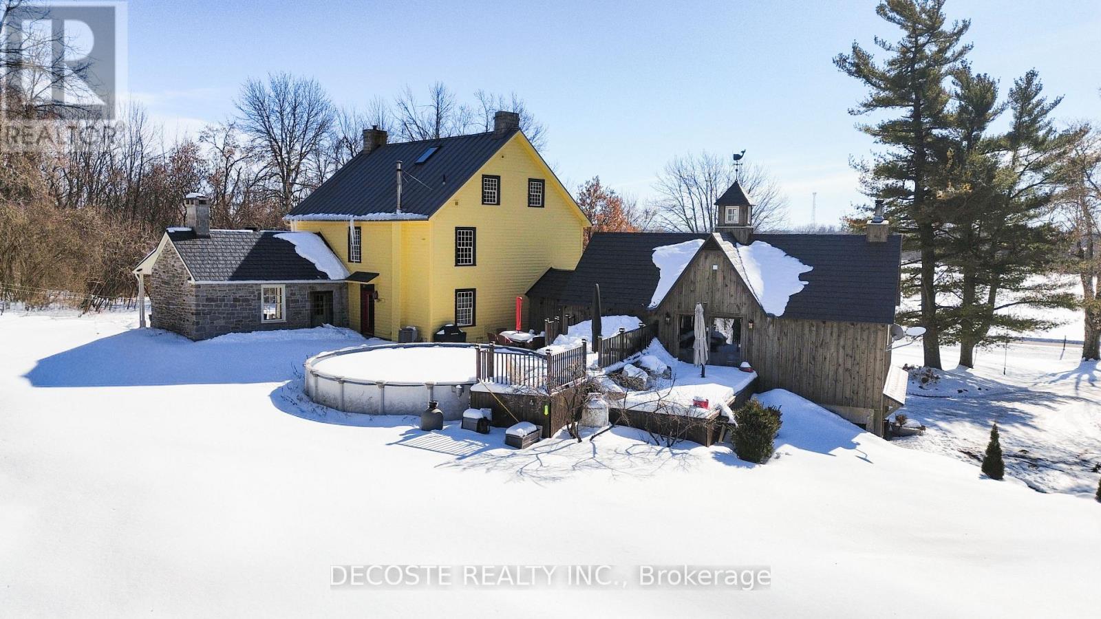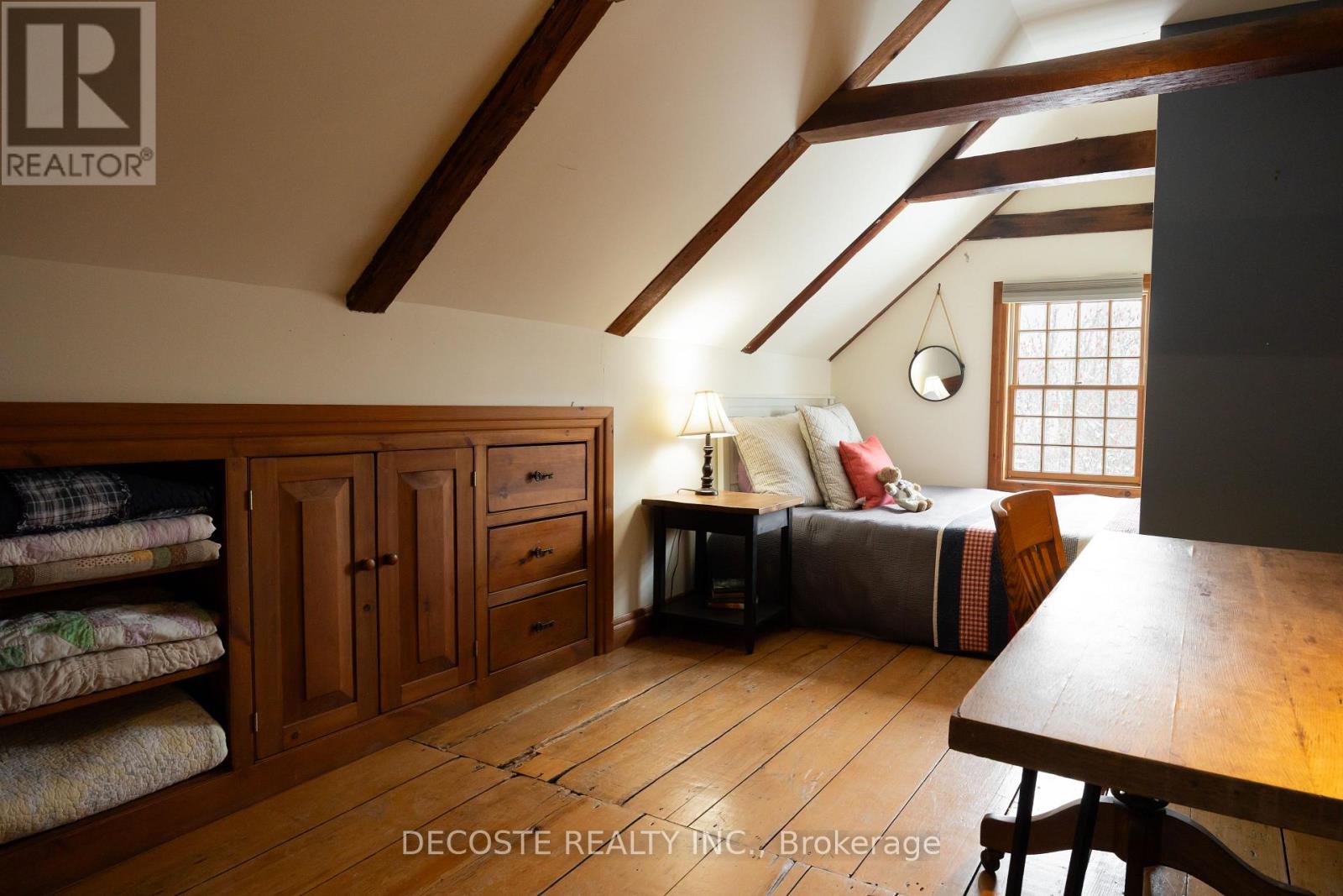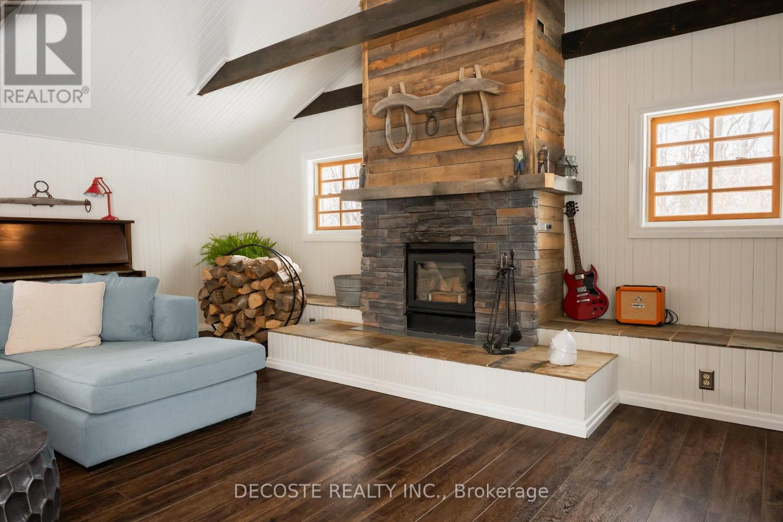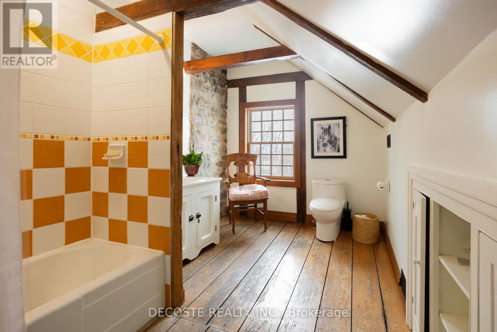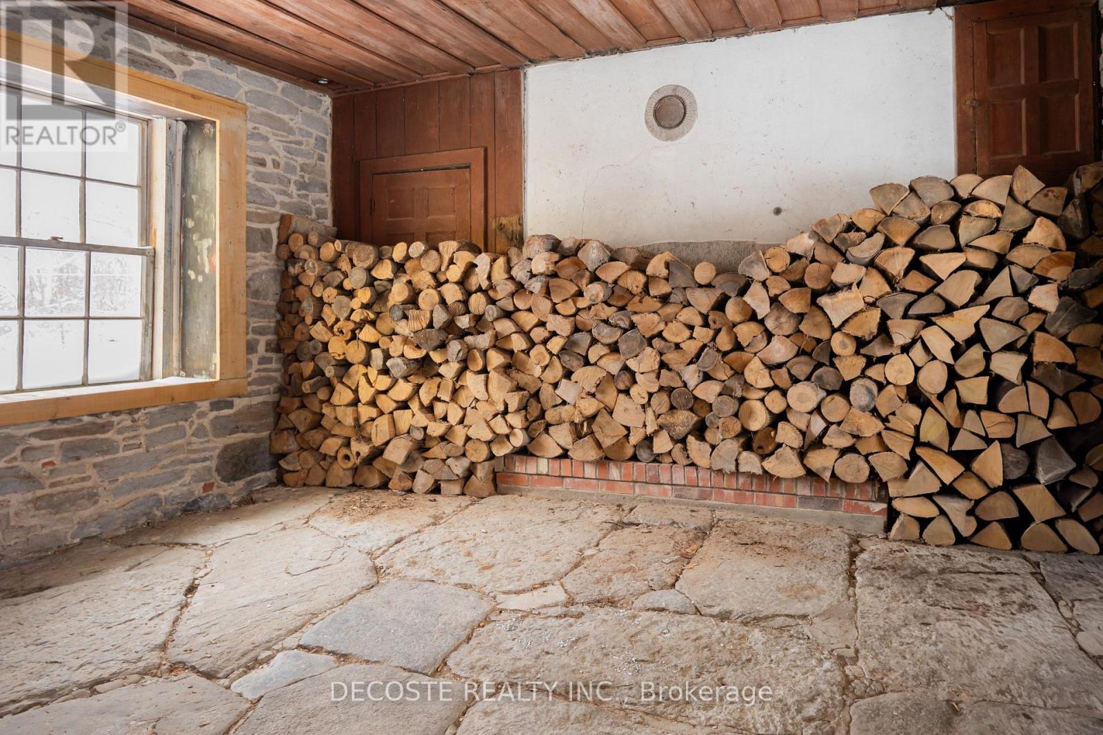 Historic Stone Estate on Over 6.5 Acres - The Curry House (Circa 1806). Step into history with this extraordinary stone residence known as The Curry House, built in 1806 and believed to be the third oldest home in Glengarry. Set on 6.5 picturesque acres, this remarkable property has been meticulously maintained and thoughtfully preserved, offering a rare opportunity to own a true piece of local heritage while enjoying the comforts of modern family living. This impressive 4-level home features 6 spacious bedrooms and 3 full bathrooms, making it ideal for a large or multi-generational family. Timeless character is showcased throughout with exposed interior stone walls, original pine plank flooring, rich wood mouldings, and beautiful exposed beams that highlight the home's historic craftsmanship. Two wood-burning stoves add warmth and ambiance, enhancing the inviting atmosphere. The main level offers a functional kitchen with ceramic flooring, a formal living room perfect for quiet relaxation, and a spectacular great room designed for entertaining. The soaring vaulted ceiling and striking fireplace create a dramatic yet welcoming space for gatherings with family and friends. From here, step outside to the expansive rear deck overlooking the private grounds and the impressive 28-ft saltwater pool - a perfect setting for summer enjoyment. The third-storey loft provides additional living space with three bedrooms, a full bathroom, and breathtaking views of the surrounding countryside, offering flexibility for guests, office space, or growing families. A drive-in garage provides ample storage and room for vehicles, while the surrounding acreage offers privacy, open space, and endless possibilities. Filled with history, charm, and warmth that simply cannot be replicated, this exceptional estate offers peaceful country living just a short drive from Montreal. A truly rare opportunity to own a landmark property where timeless elegance meets everyday comfort. (id:28469)