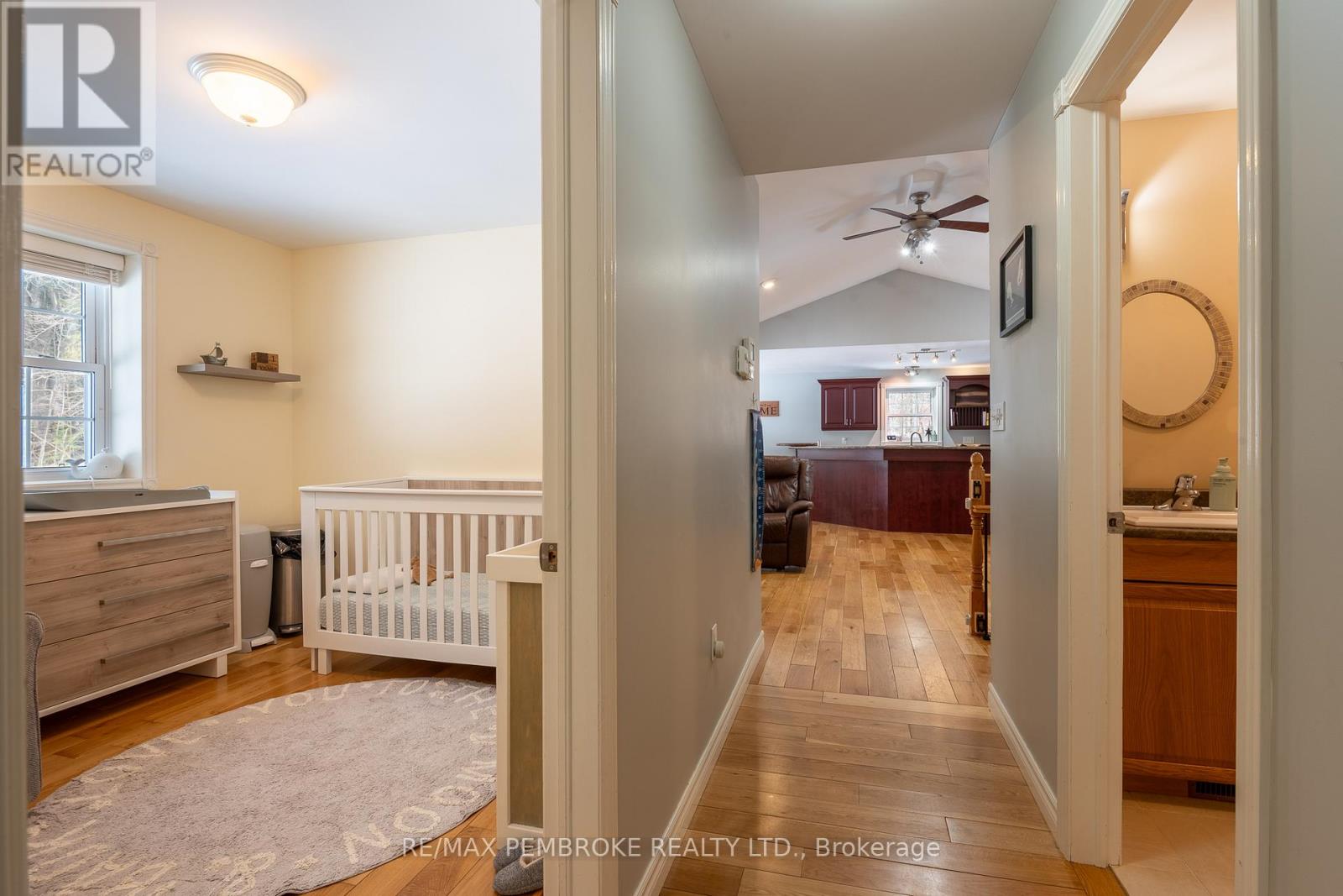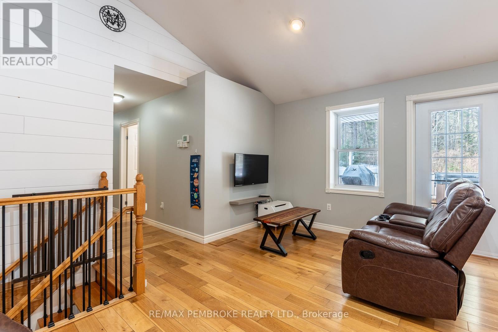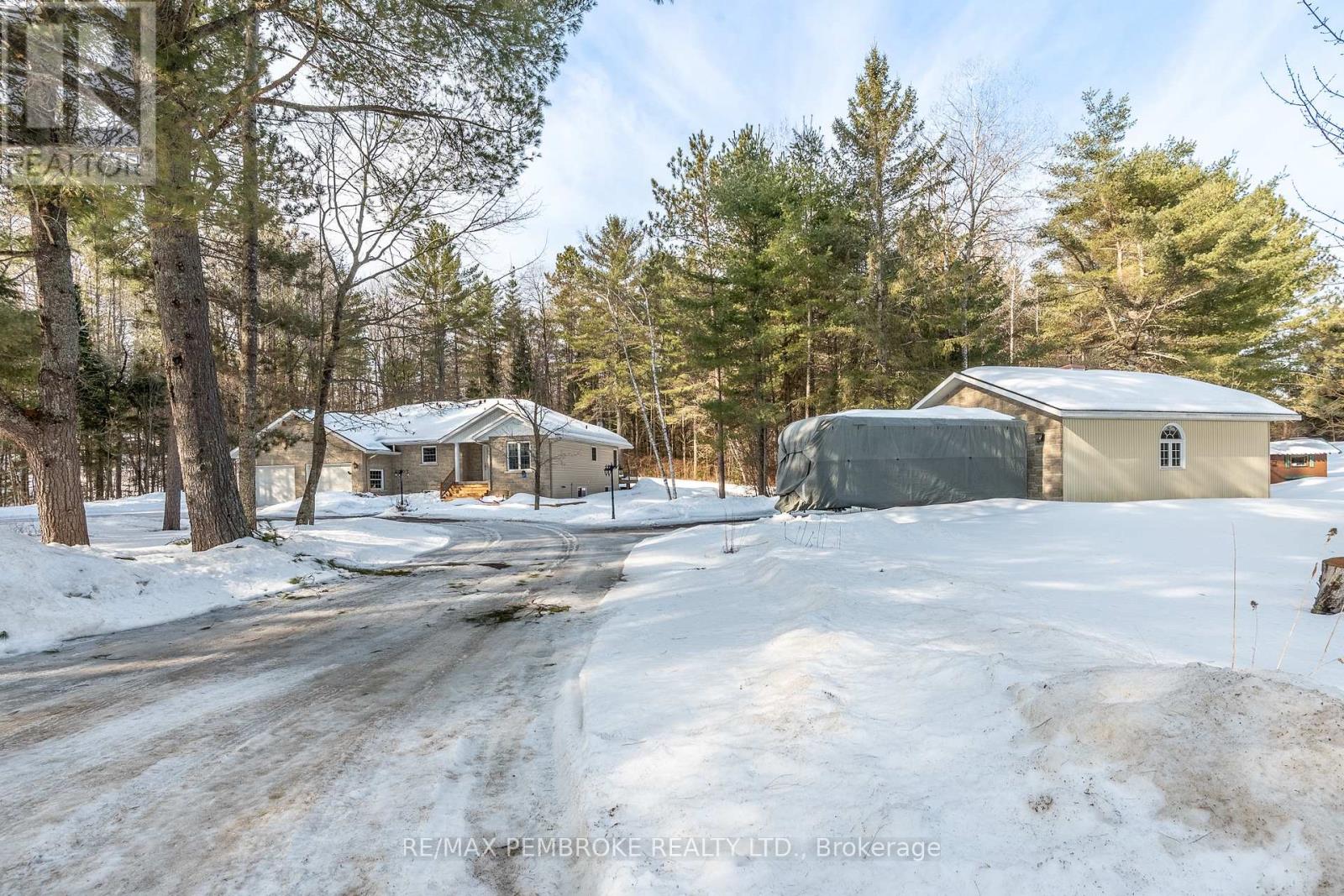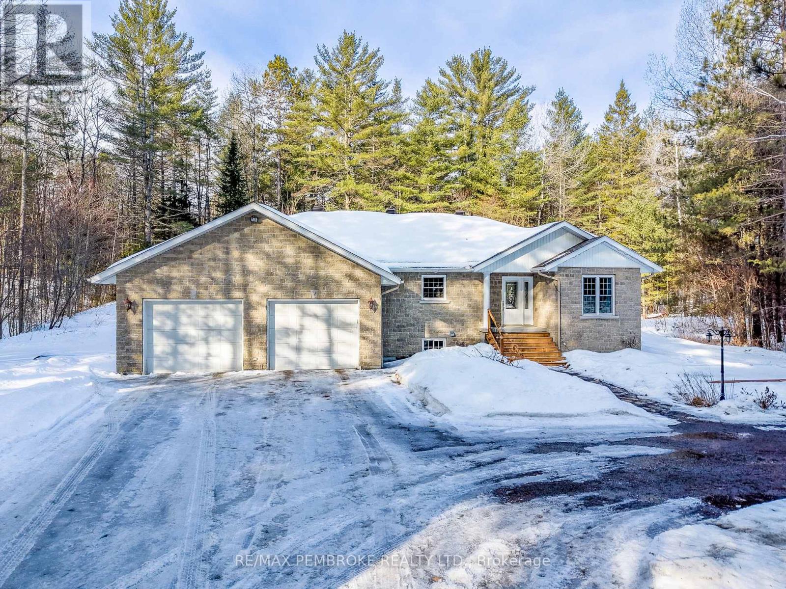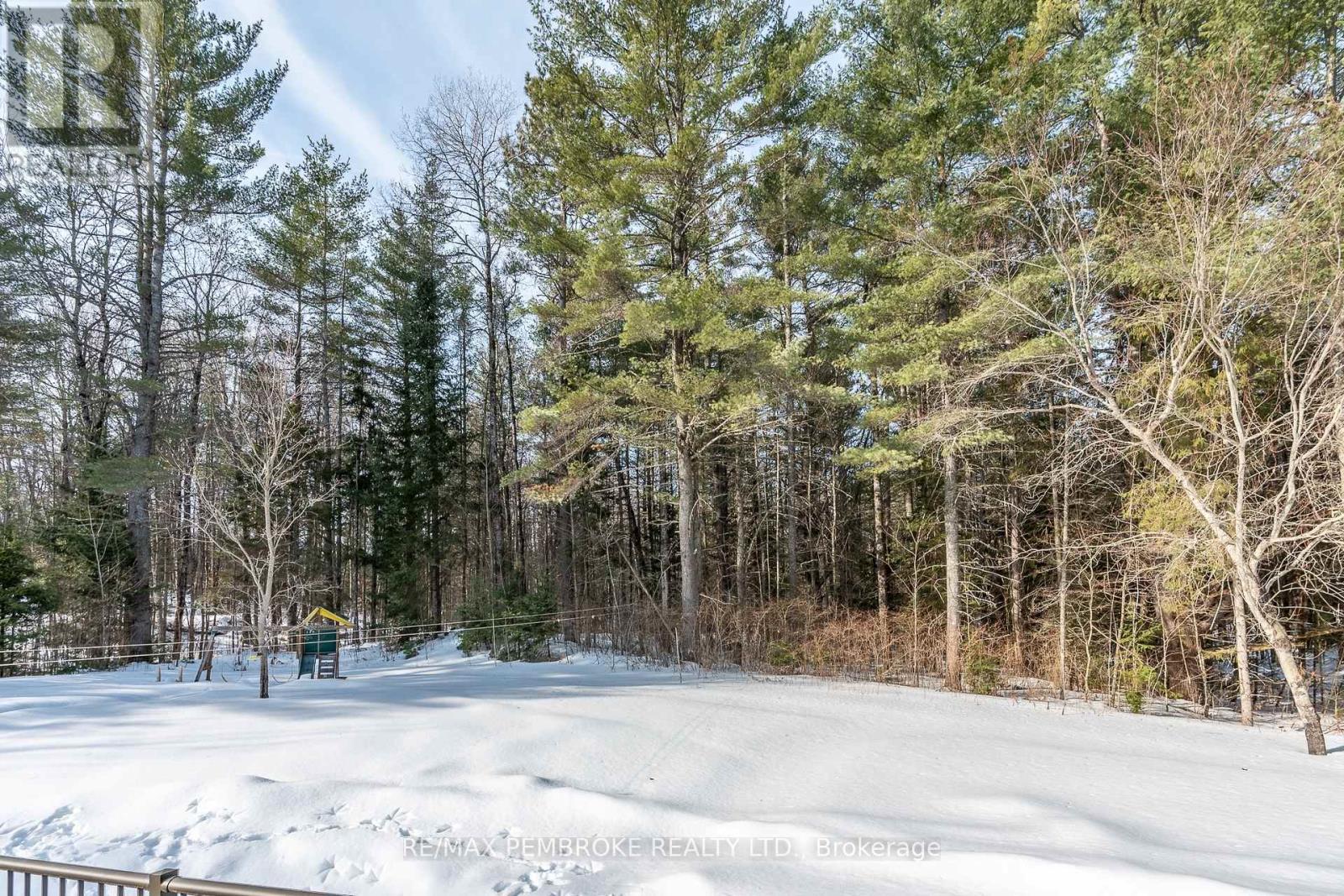 Set on a beautifully treed 1-acre lot, this custom-built home offers the perfect balance of privacy, space, and convenience, just minutes from town. With approximately 1750 sq ft of thoughtfully designed living space, this property is ideal for those seeking a quiet, nature-filled setting without sacrificing accessibility. The main level welcomes you with soaring vaulted ceilings and an open-concept layout, where large windows flood the home with natural light and frame the surrounding mature trees. The kitchen, dining, and living areas flow seamlessly, creating an inviting space for both everyday living and entertaining. A well-appointed primary suite features a private ensuite and walk-in closet, while two additional bedrooms and a full bathroom complete the main floor. A practical mudroom and main floor laundry are conveniently located off the attached insulated garage, which measures approximately 26' x 29'. The fully finished lower level expands your living space with a hardwood staircase, a spacious recreation area with a bar, a fourth bedroom with a walk-in closet, and a third full bathroom, ideal for guests or extended family. Direct access to the attached garage and a large mechanical/storage room add to the home's functionality. Built for efficiency, the home features an ICF foundation extending to the trusses and a furnace installed in 2020. Outside, enjoy a generous deck, wiring for a hot tub, play structure, and storage shed, perfect for embracing outdoor living. Car enthusiasts, hobbyists, or those needing extra space will appreciate the insulated and impressive 24' x 29' detached garage. With excellent curb appeal highlighted by a brick front, this property makes a strong first impression. Located just 5 minutes from Highway 17, enjoy a 10 minute commute to Garrison Petawawa, 20 minutes to CNL, or 20 minutes Pembroke. A rare opportunity to enjoy peaceful country living with all amenities close at hand. (id:28469)