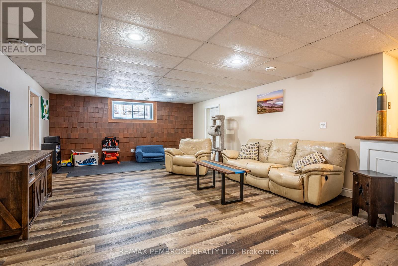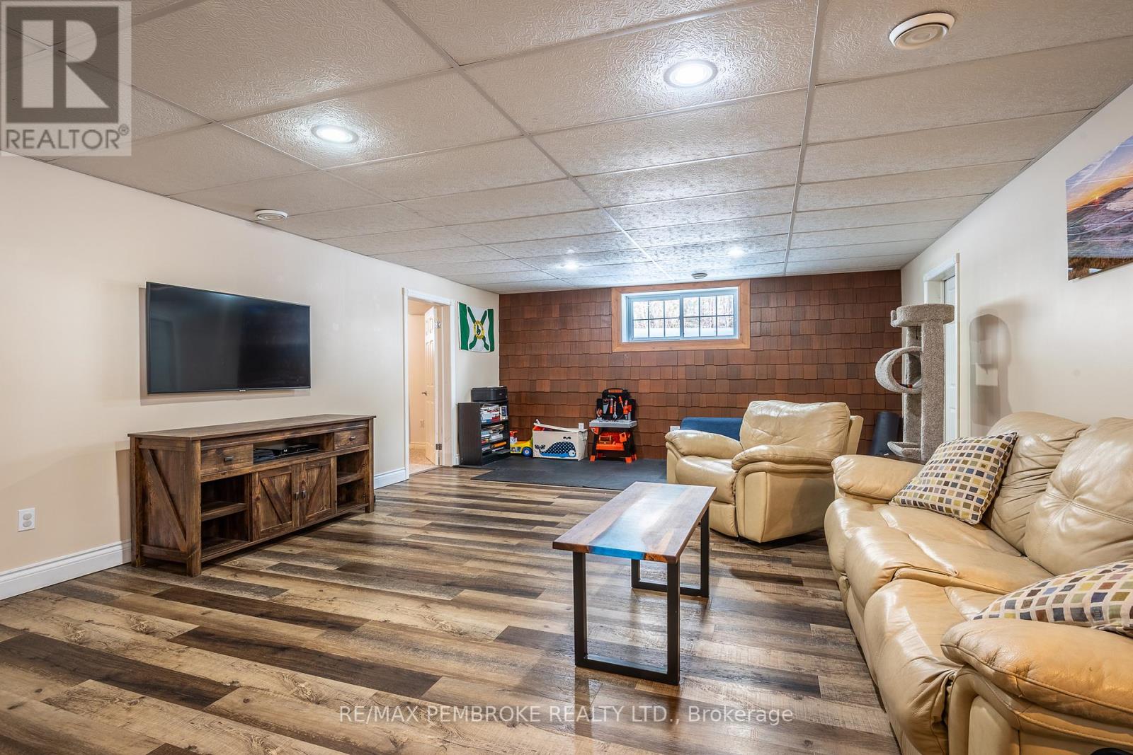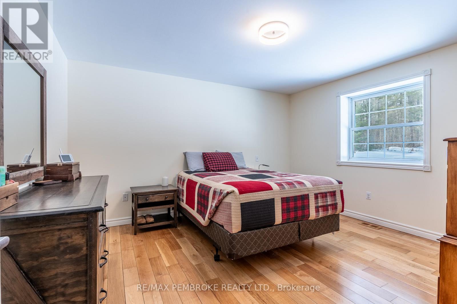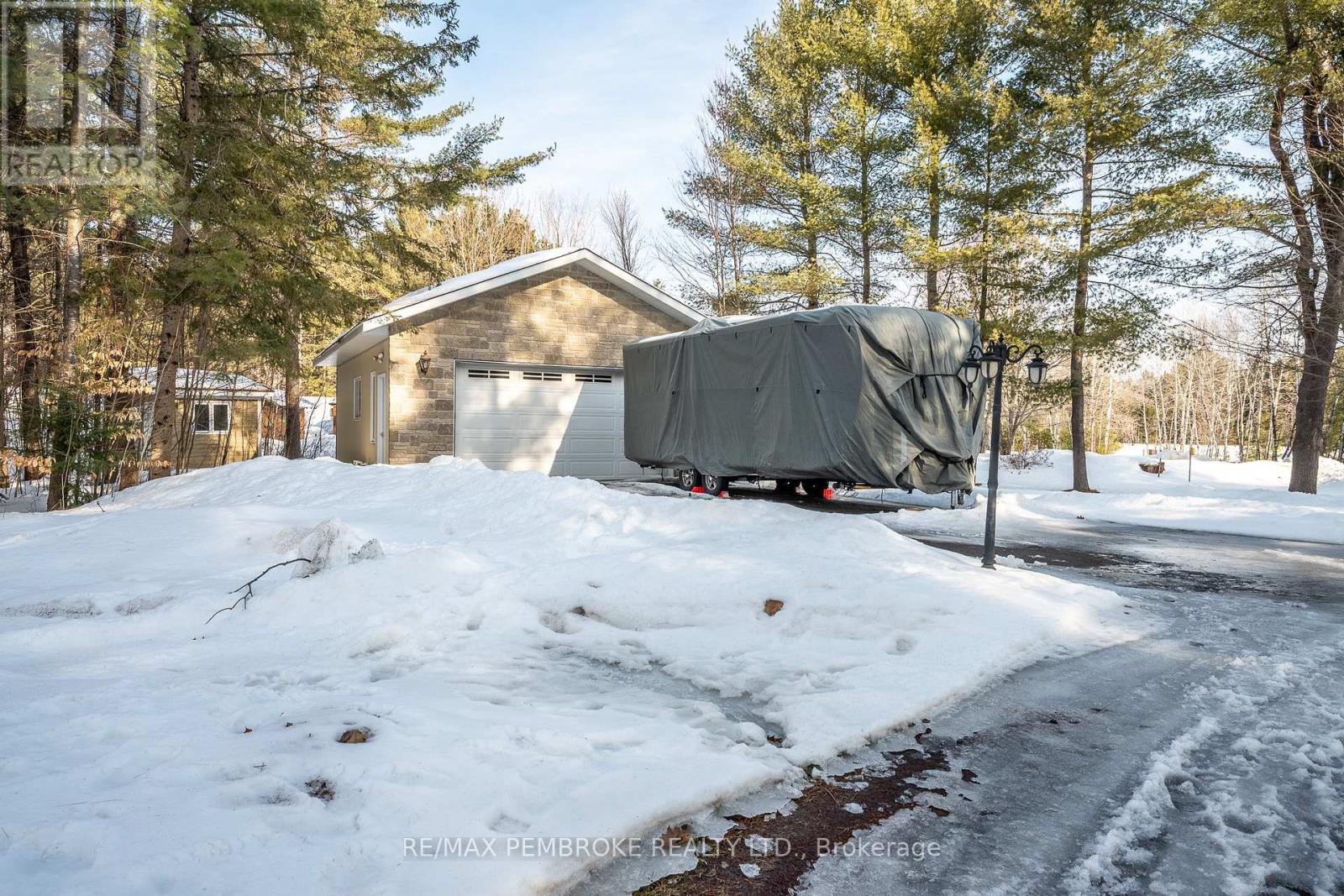 Set on a beautifully treed 1-acre lot, this custom-built home offers the perfect balance of privacy, space, and convenience, just minutes from town. With approximately 1750 sq ft of thoughtfully designed living space, this property is ideal for those seeking a quiet, nature-filled setting without sacrificing accessibility. The main level welcomes you with soaring vaulted ceilings and an open-concept layout, where large windows flood the home with natural light and frame the surrounding mature trees. The kitchen, dining, and living areas flow seamlessly, creating an inviting space for both everyday living and entertaining. A well-appointed primary suite features a private ensuite and walk-in closet, while two additional bedrooms and a full bathroom complete the main floor. A practical mudroom and main floor laundry are conveniently located off the attached insulated garage, which measures approximately 26' x 29'. The fully finished lower level expands your living space with a hardwood staircase, a spacious recreation area with a bar, a fourth bedroom with a walk-in closet, and a third full bathroom, ideal for guests or extended family. Direct access to the attached garage and a large mechanical/storage room add to the home's functionality. Built for efficiency, the home features an ICF foundation extending to the trusses and a furnace installed in 2020. Outside, enjoy a generous deck, wiring for a hot tub, play structure, and storage shed, perfect for embracing outdoor living. Car enthusiasts, hobbyists, or those needing extra space will appreciate the insulated and impressive 24' x 29' detached garage. With excellent curb appeal highlighted by a brick front, this property makes a strong first impression. Located just 5 minutes from Highway 17, enjoy a 10 minute commute to Garrison Petawawa, 20 minutes to CNL, or 20 minutes Pembroke. A rare opportunity to enjoy peaceful country living with all amenities close at hand. (id:28469)