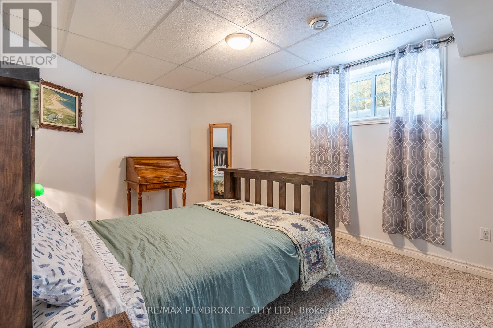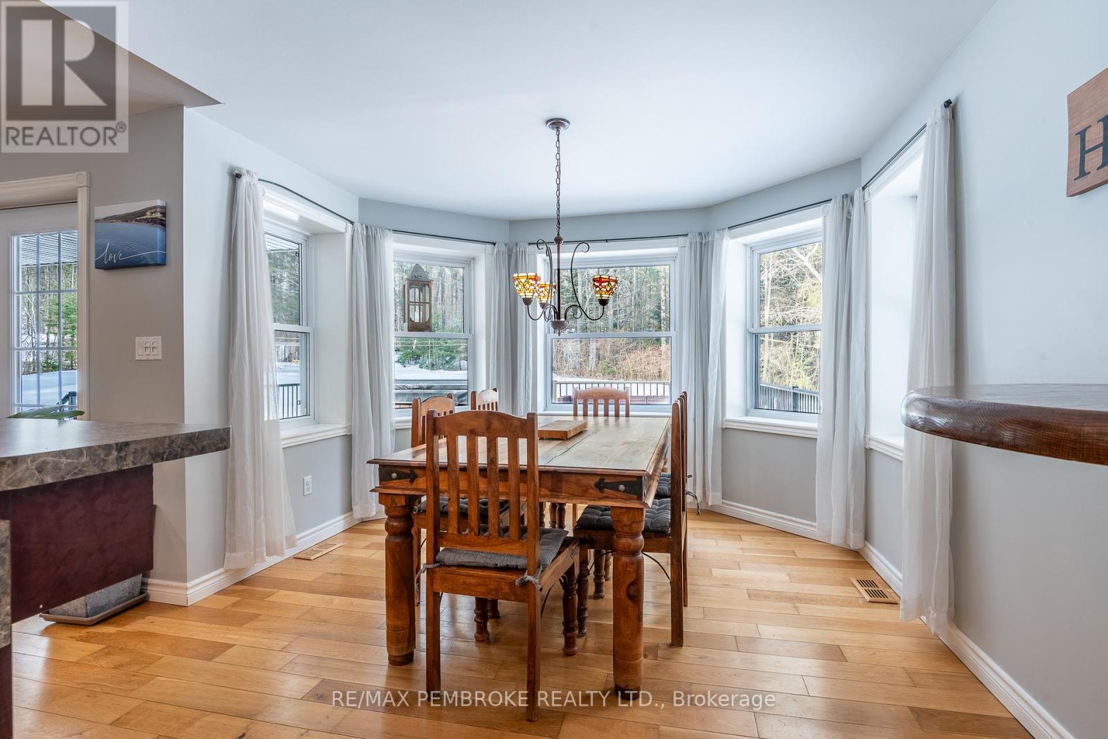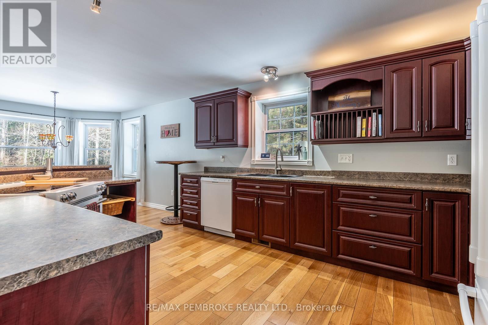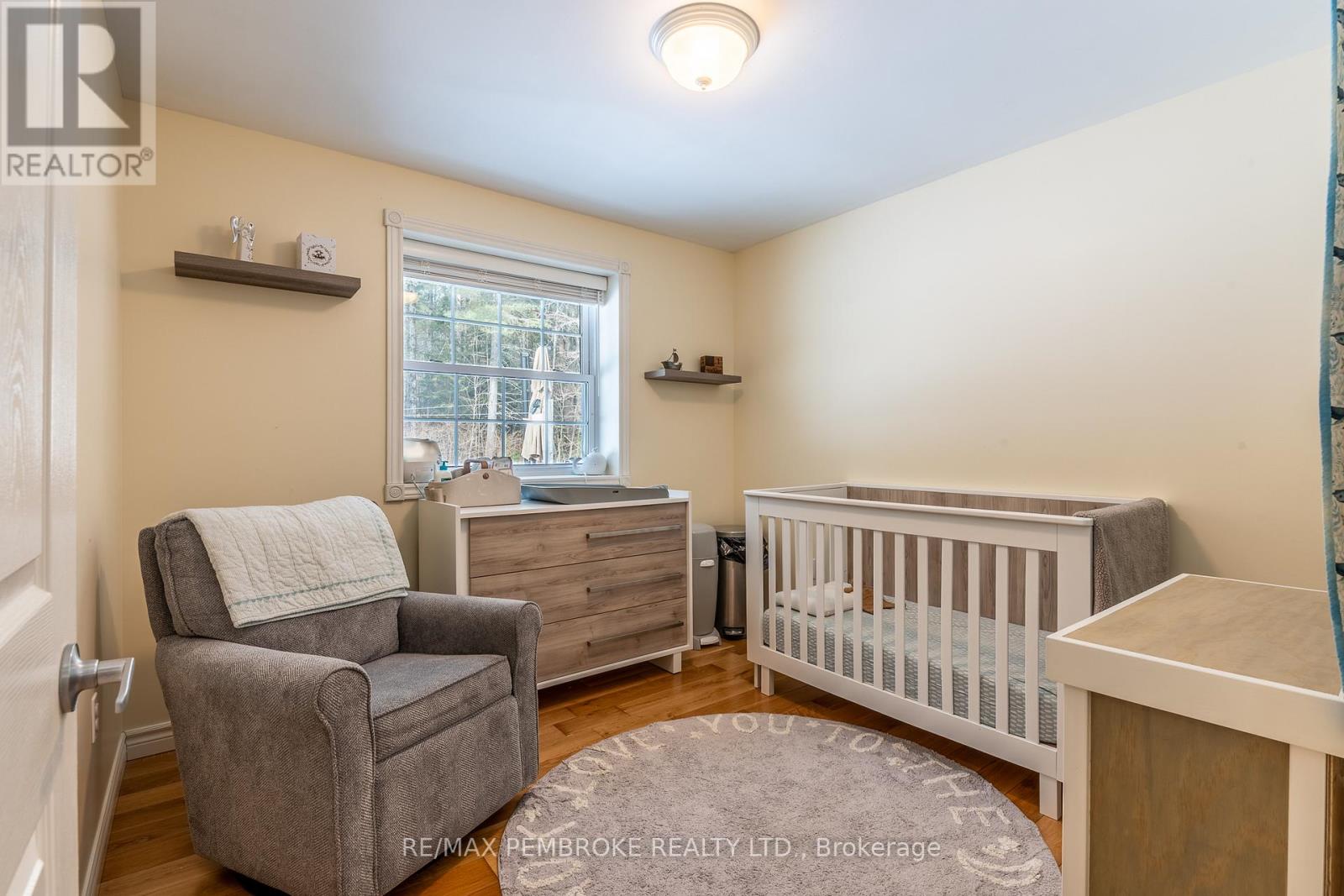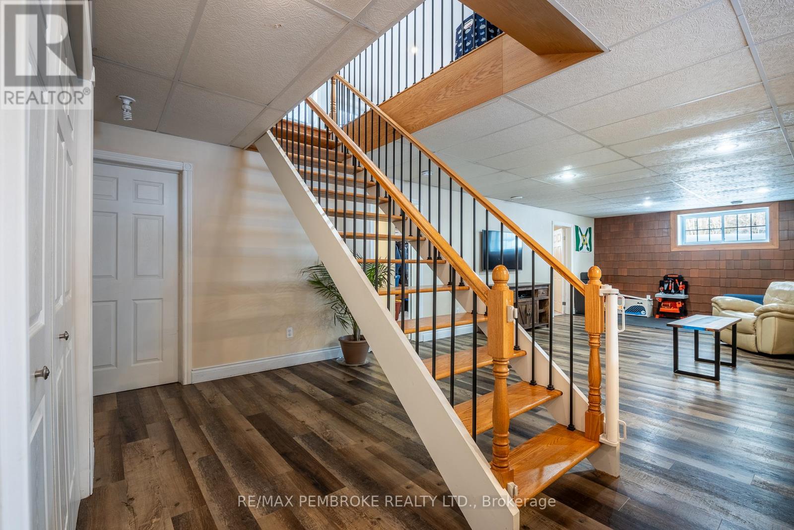 Set on a beautifully treed 1-acre lot, this custom-built home offers the perfect balance of privacy, space, and convenience, just minutes from town. With approximately 1750 sq ft of thoughtfully designed living space, this property is ideal for those seeking a quiet, nature-filled setting without sacrificing accessibility. The main level welcomes you with soaring vaulted ceilings and an open-concept layout, where large windows flood the home with natural light and frame the surrounding mature trees. The kitchen, dining, and living areas flow seamlessly, creating an inviting space for both everyday living and entertaining. A well-appointed primary suite features a private ensuite and walk-in closet, while two additional bedrooms and a full bathroom complete the main floor. A practical mudroom and main floor laundry are conveniently located off the attached insulated garage, which measures approximately 26' x 29'. The fully finished lower level expands your living space with a hardwood staircase, a spacious recreation area with a bar, a fourth bedroom with a walk-in closet, and a third full bathroom, ideal for guests or extended family. Direct access to the attached garage and a large mechanical/storage room add to the home's functionality. Built for efficiency, the home features an ICF foundation extending to the trusses and a furnace installed in 2020. Outside, enjoy a generous deck, wiring for a hot tub, play structure, and storage shed, perfect for embracing outdoor living. Car enthusiasts, hobbyists, or those needing extra space will appreciate the insulated and impressive 24' x 29' detached garage. With excellent curb appeal highlighted by a brick front, this property makes a strong first impression. Located just 5 minutes from Highway 17, enjoy a 10 minute commute to Garrison Petawawa, 20 minutes to CNL, or 20 minutes Pembroke. A rare opportunity to enjoy peaceful country living with all amenities close at hand. (id:28469)
