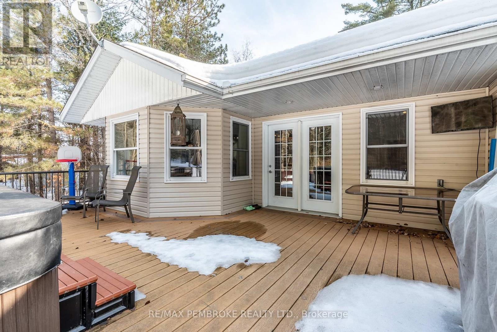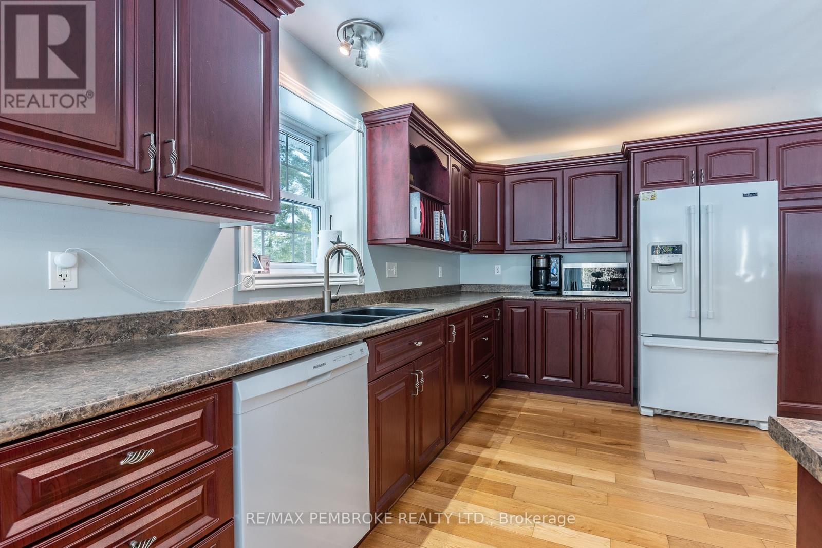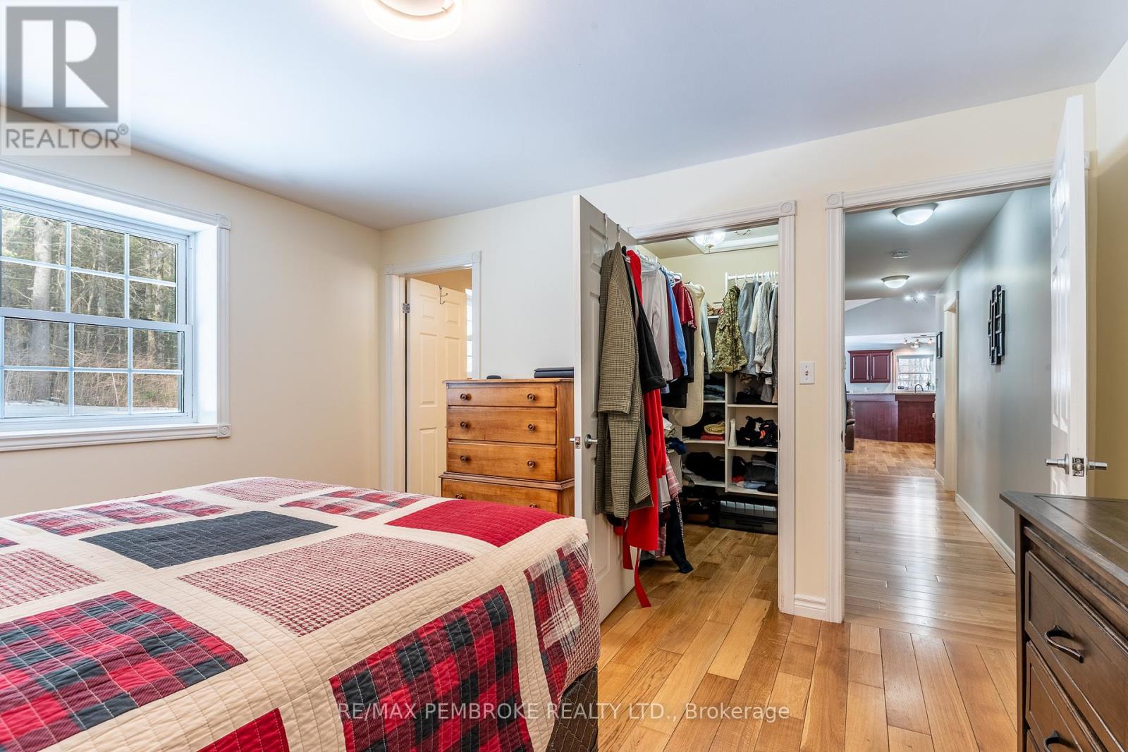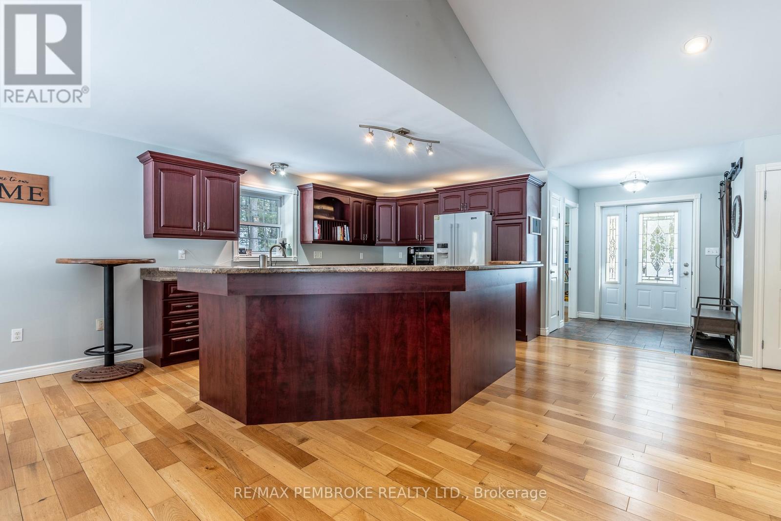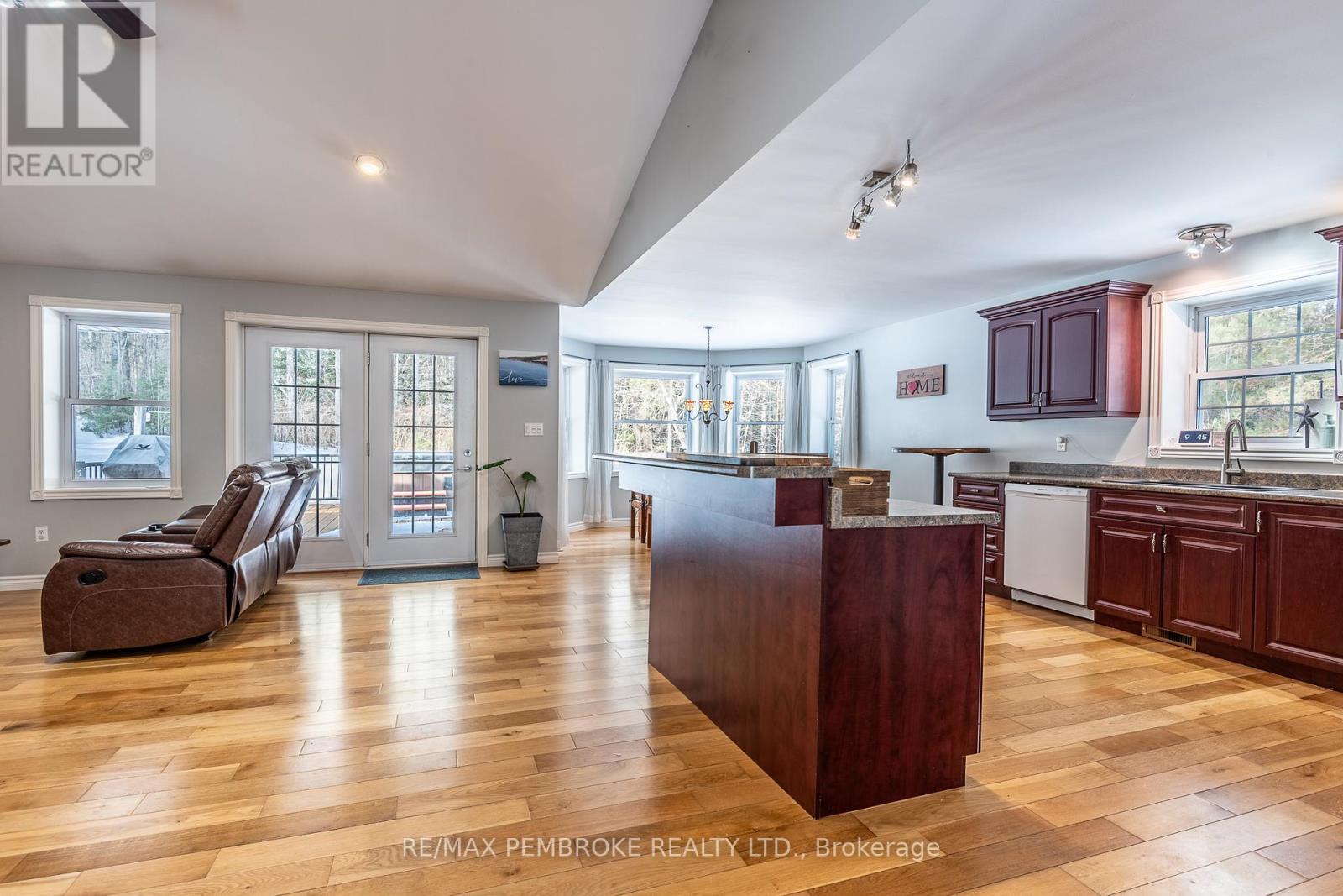 Set on a beautifully treed 1-acre lot, this custom-built home offers the perfect balance of privacy, space, and convenience, just minutes from town. With approximately 1750 sq ft of thoughtfully designed living space, this property is ideal for those seeking a quiet, nature-filled setting without sacrificing accessibility. The main level welcomes you with soaring vaulted ceilings and an open-concept layout, where large windows flood the home with natural light and frame the surrounding mature trees. The kitchen, dining, and living areas flow seamlessly, creating an inviting space for both everyday living and entertaining. A well-appointed primary suite features a private ensuite and walk-in closet, while two additional bedrooms and a full bathroom complete the main floor. A practical mudroom and main floor laundry are conveniently located off the attached insulated garage, which measures approximately 26' x 29'. The fully finished lower level expands your living space with a hardwood staircase, a spacious recreation area with a bar, a fourth bedroom with a walk-in closet, and a third full bathroom, ideal for guests or extended family. Direct access to the attached garage and a large mechanical/storage room add to the home's functionality. Built for efficiency, the home features an ICF foundation extending to the trusses and a furnace installed in 2020. Outside, enjoy a generous deck, wiring for a hot tub, play structure, and storage shed, perfect for embracing outdoor living. Car enthusiasts, hobbyists, or those needing extra space will appreciate the insulated and impressive 24' x 29' detached garage. With excellent curb appeal highlighted by a brick front, this property makes a strong first impression. Located just 5 minutes from Highway 17, enjoy a 10 minute commute to Garrison Petawawa, 20 minutes to CNL, or 20 minutes Pembroke. A rare opportunity to enjoy peaceful country living with all amenities close at hand. (id:28469)