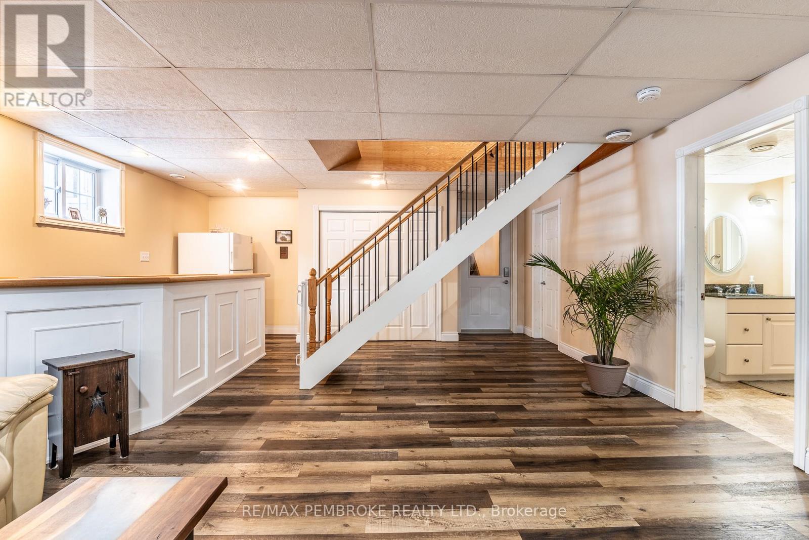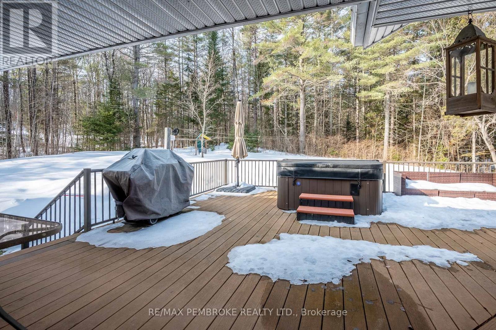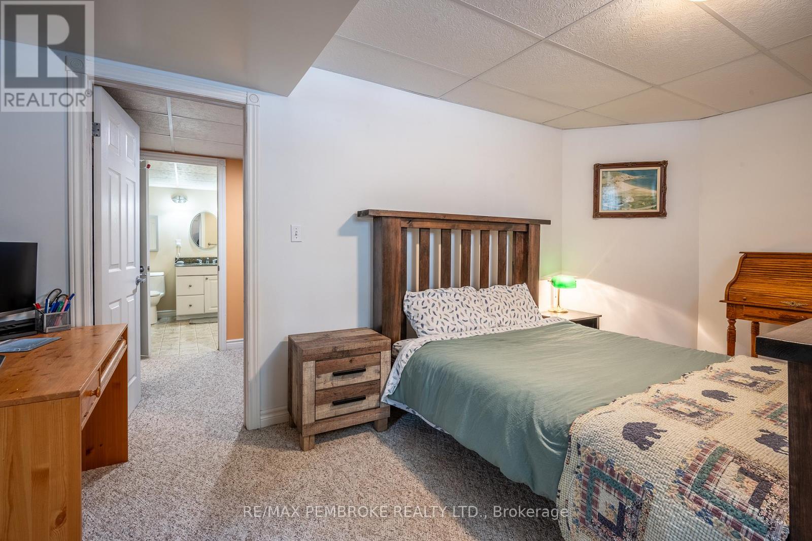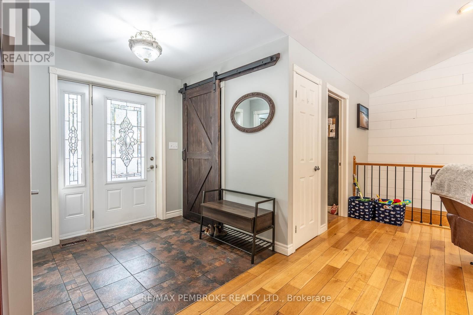 Set on a beautifully treed 1-acre lot, this custom-built home offers the perfect balance of privacy, space, and convenience, just minutes from town. With approximately 1750 sq ft of thoughtfully designed living space, this property is ideal for those seeking a quiet, nature-filled setting without sacrificing accessibility. The main level welcomes you with soaring vaulted ceilings and an open-concept layout, where large windows flood the home with natural light and frame the surrounding mature trees. The kitchen, dining, and living areas flow seamlessly, creating an inviting space for both everyday living and entertaining. A well-appointed primary suite features a private ensuite and walk-in closet, while two additional bedrooms and a full bathroom complete the main floor. A practical mudroom and main floor laundry are conveniently located off the attached insulated garage, which measures approximately 26' x 29'. The fully finished lower level expands your living space with a hardwood staircase, a spacious recreation area with a bar, a fourth bedroom with a walk-in closet, and a third full bathroom, ideal for guests or extended family. Direct access to the attached garage and a large mechanical/storage room add to the home's functionality. Built for efficiency, the home features an ICF foundation extending to the trusses and a furnace installed in 2020. Outside, enjoy a generous deck, wiring for a hot tub, play structure, and storage shed, perfect for embracing outdoor living. Car enthusiasts, hobbyists, or those needing extra space will appreciate the insulated and impressive 24' x 29' detached garage. With excellent curb appeal highlighted by a brick front, this property makes a strong first impression. Located just 5 minutes from Highway 17, enjoy a 10 minute commute to Garrison Petawawa, 20 minutes to CNL, or 20 minutes Pembroke. A rare opportunity to enjoy peaceful country living with all amenities close at hand. (id:28469)