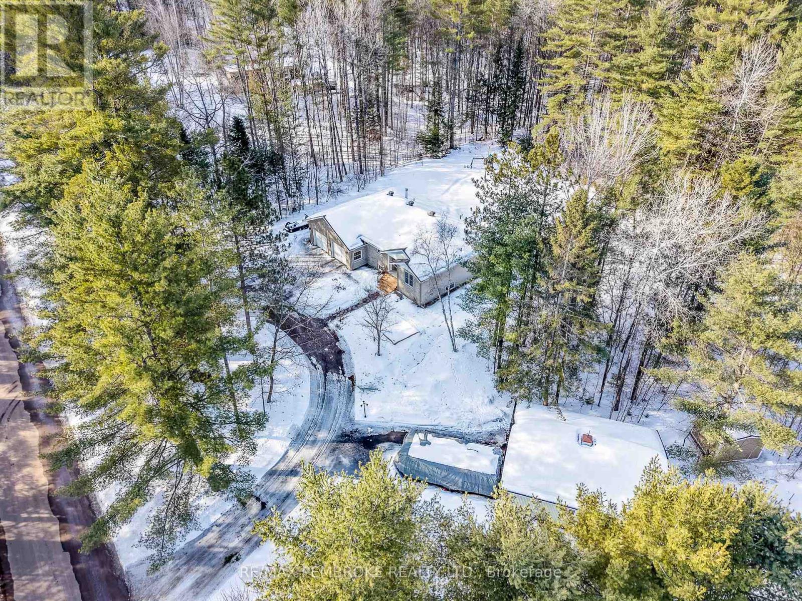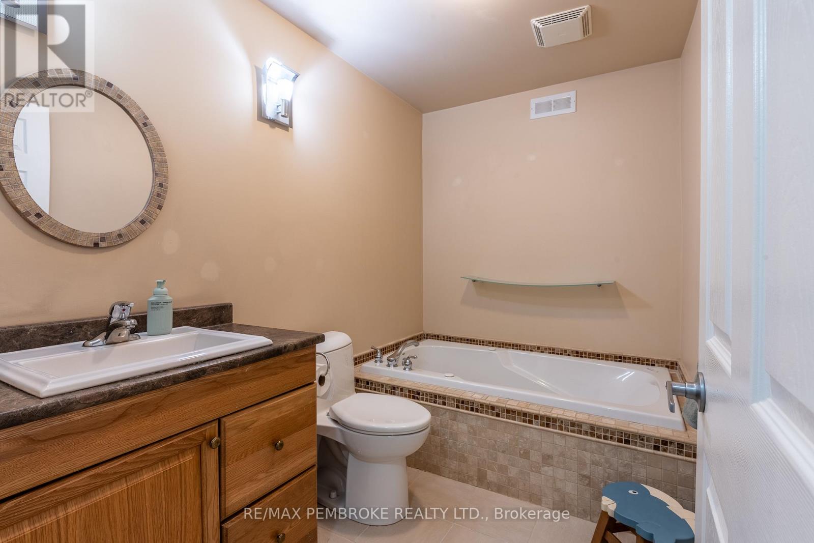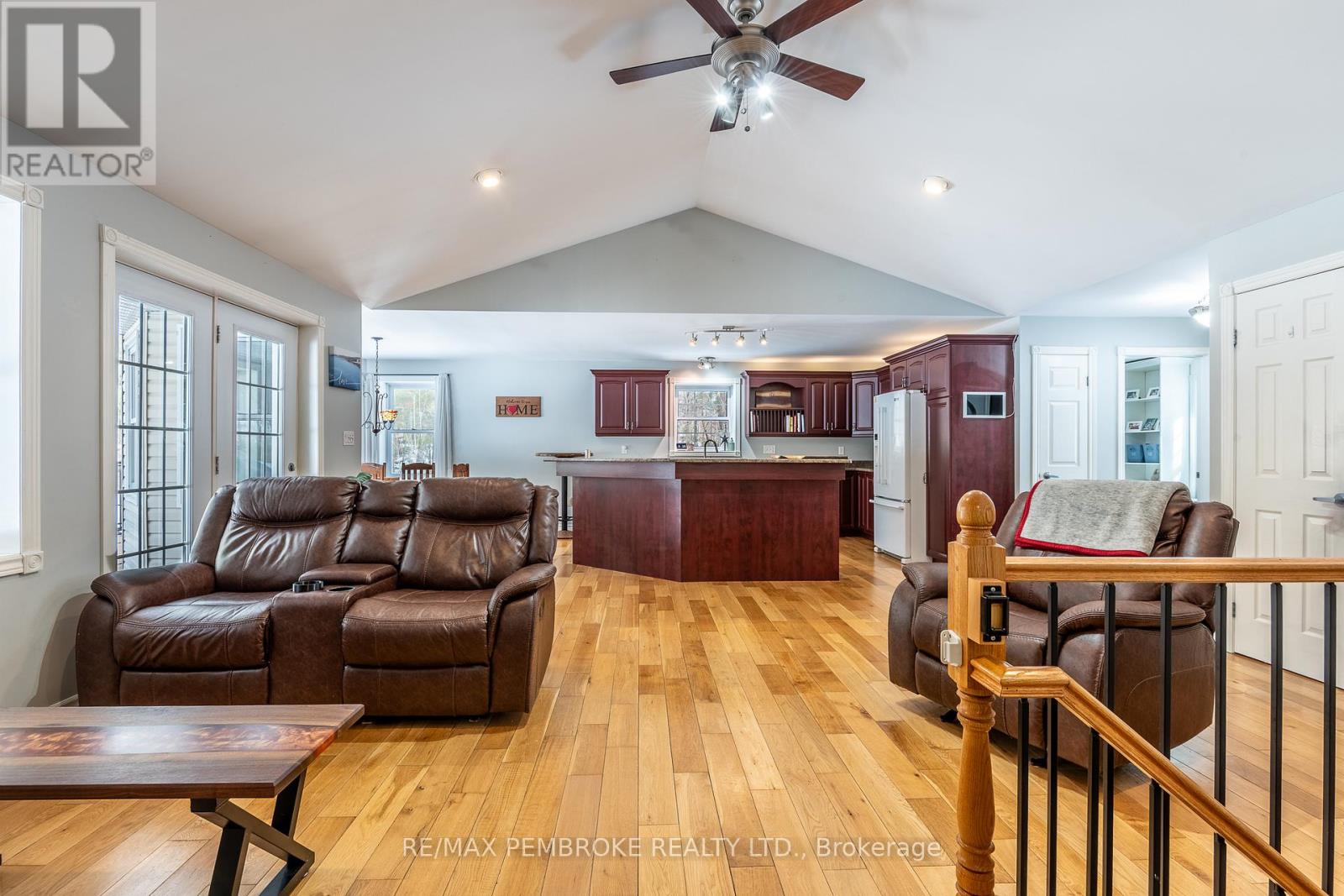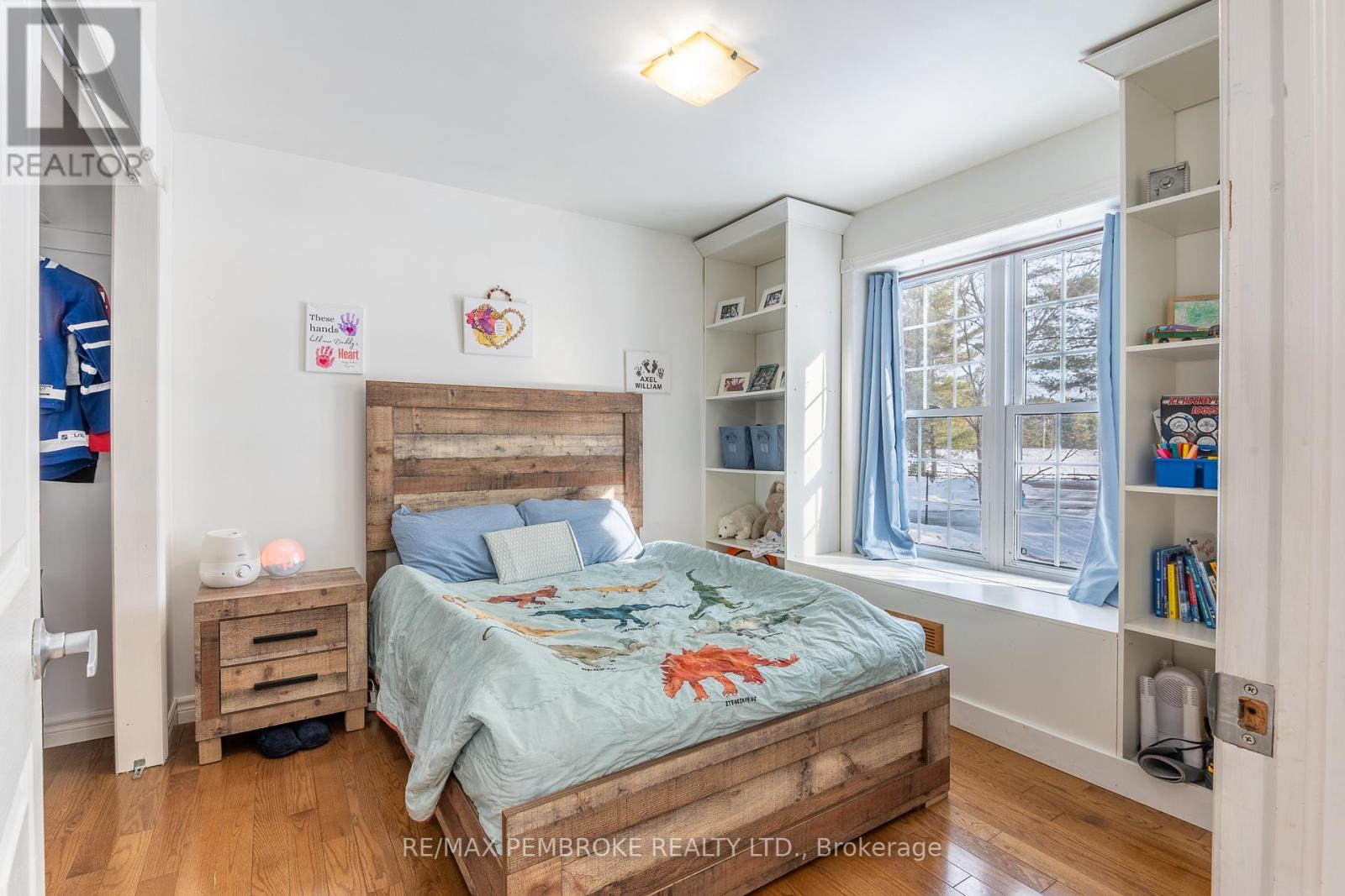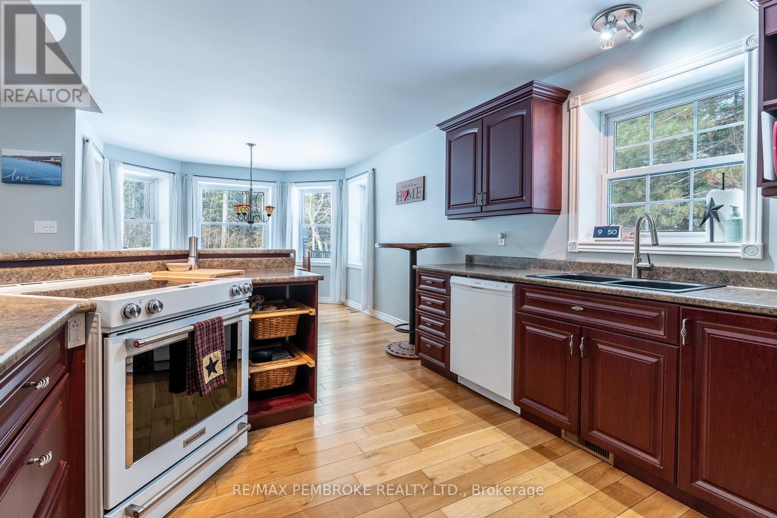 Set on a beautifully treed 1-acre lot, this custom-built home offers the perfect balance of privacy, space, and convenience, just minutes from town. With approximately 1750 sq ft of thoughtfully designed living space, this property is ideal for those seeking a quiet, nature-filled setting without sacrificing accessibility. The main level welcomes you with soaring vaulted ceilings and an open-concept layout, where large windows flood the home with natural light and frame the surrounding mature trees. The kitchen, dining, and living areas flow seamlessly, creating an inviting space for both everyday living and entertaining. A well-appointed primary suite features a private ensuite and walk-in closet, while two additional bedrooms and a full bathroom complete the main floor. A practical mudroom and main floor laundry are conveniently located off the attached insulated garage, which measures approximately 26' x 29'. The fully finished lower level expands your living space with a hardwood staircase, a spacious recreation area with a bar, a fourth bedroom with a walk-in closet, and a third full bathroom, ideal for guests or extended family. Direct access to the attached garage and a large mechanical/storage room add to the home's functionality. Built for efficiency, the home features an ICF foundation extending to the trusses and a furnace installed in 2020. Outside, enjoy a generous deck, wiring for a hot tub, play structure, and storage shed, perfect for embracing outdoor living. Car enthusiasts, hobbyists, or those needing extra space will appreciate the insulated and impressive 24' x 29' detached garage. With excellent curb appeal highlighted by a brick front, this property makes a strong first impression. Located just 5 minutes from Highway 17, enjoy a 10 minute commute to Garrison Petawawa, 20 minutes to CNL, or 20 minutes Pembroke. A rare opportunity to enjoy peaceful country living with all amenities close at hand. (id:28469)