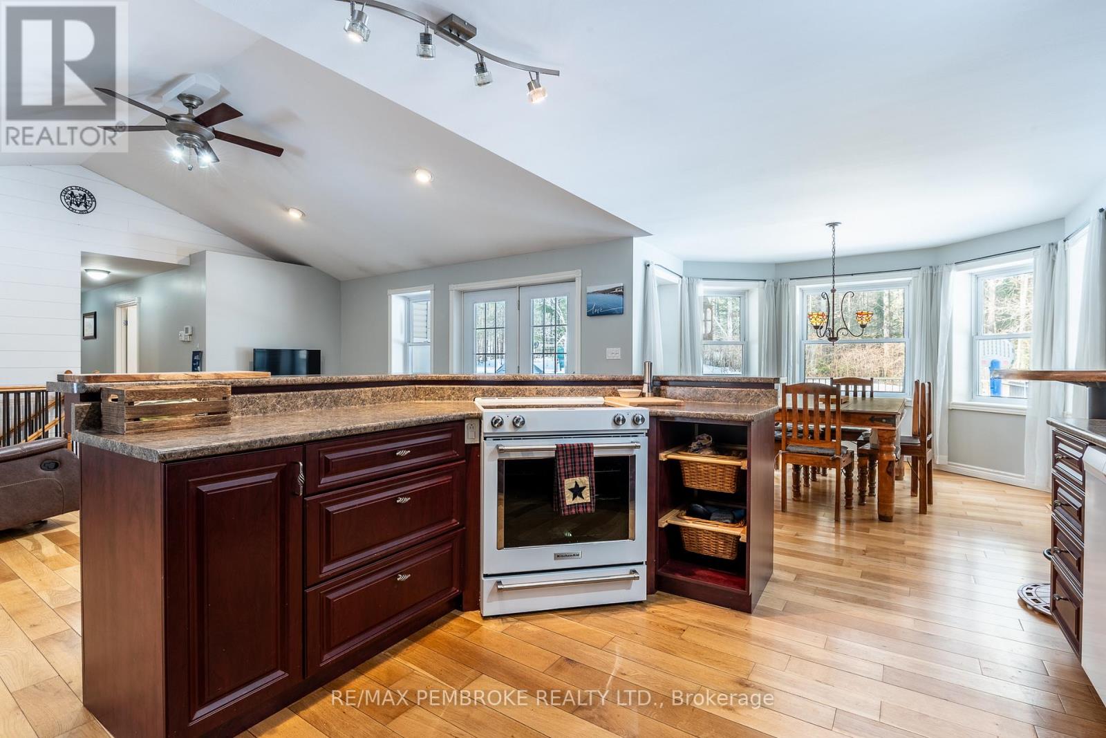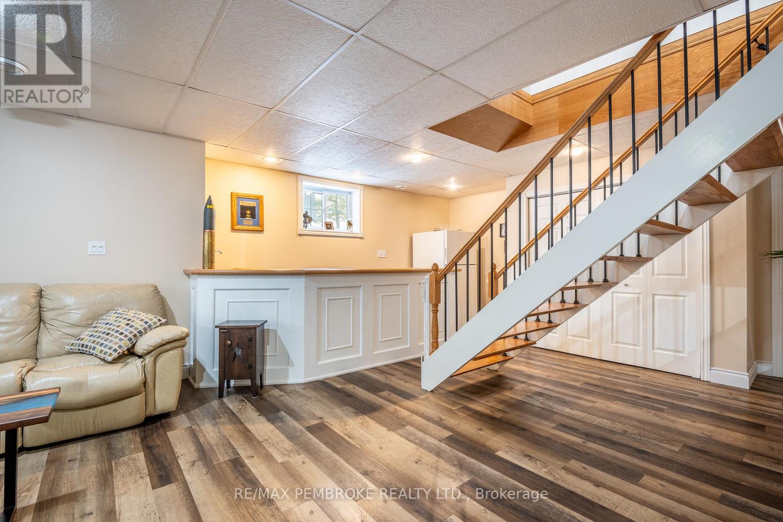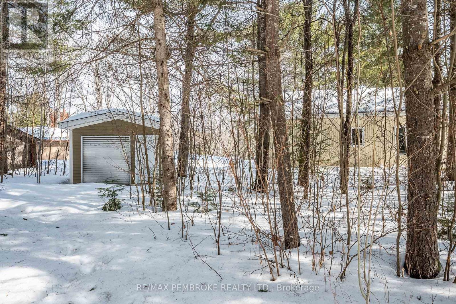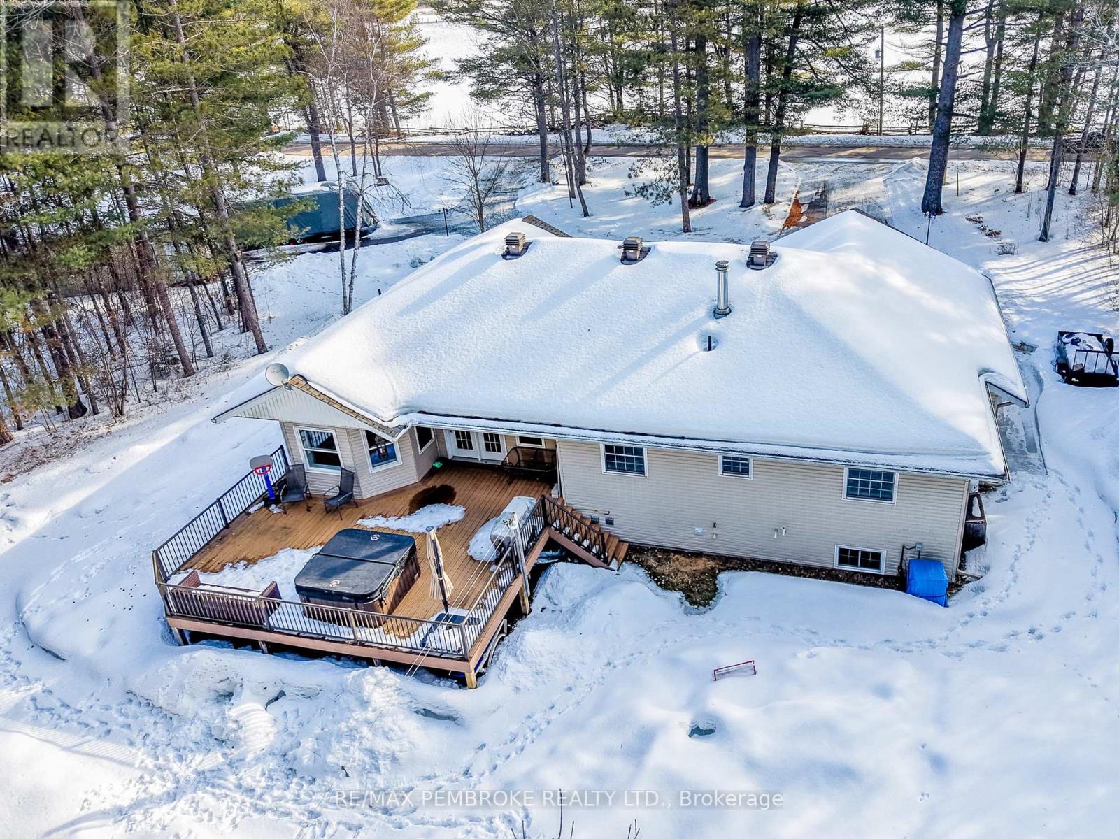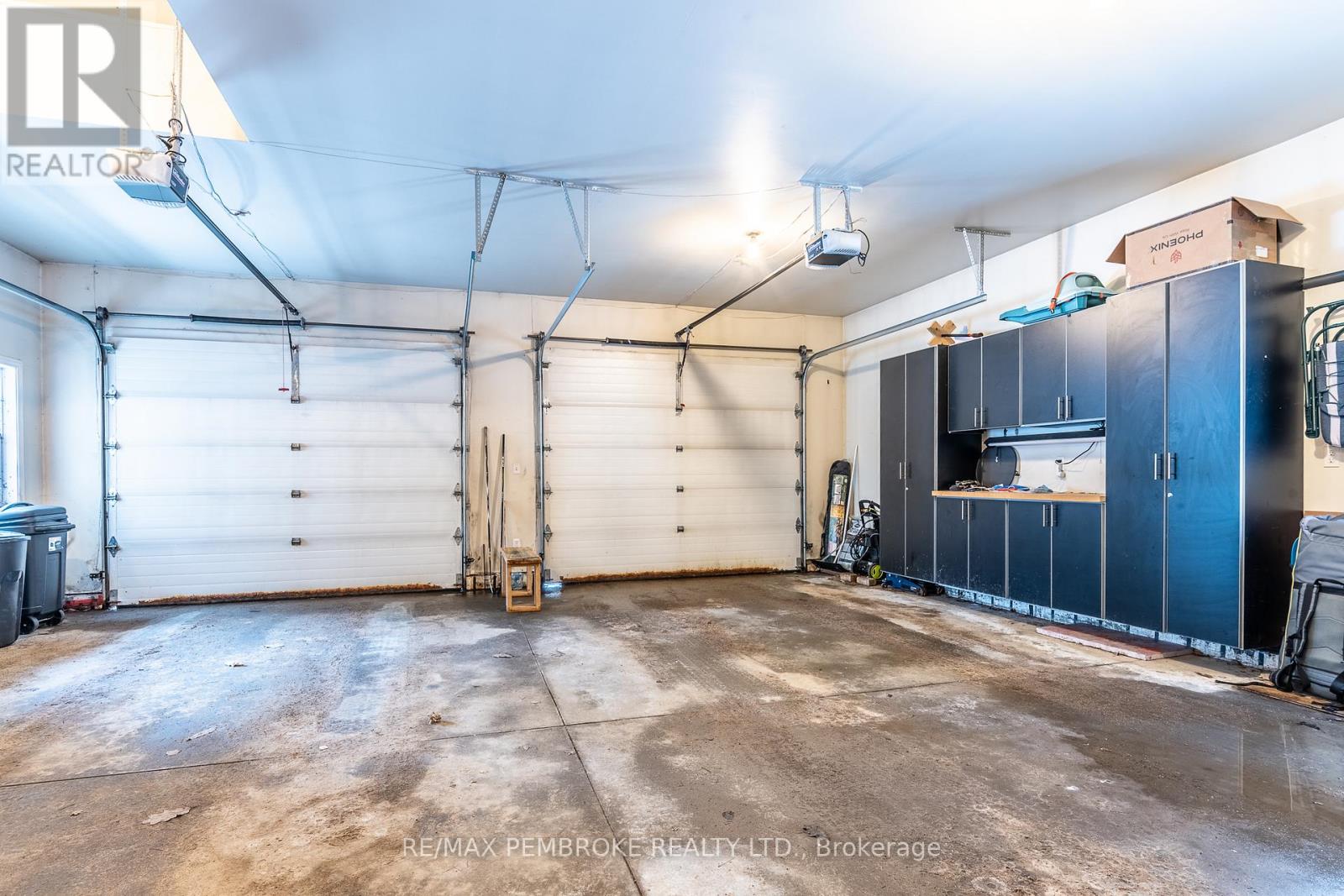 Set on a beautifully treed 1-acre lot, this custom-built home offers the perfect balance of privacy, space, and convenience, just minutes from town. With approximately 1750 sq ft of thoughtfully designed living space, this property is ideal for those seeking a quiet, nature-filled setting without sacrificing accessibility. The main level welcomes you with soaring vaulted ceilings and an open-concept layout, where large windows flood the home with natural light and frame the surrounding mature trees. The kitchen, dining, and living areas flow seamlessly, creating an inviting space for both everyday living and entertaining. A well-appointed primary suite features a private ensuite and walk-in closet, while two additional bedrooms and a full bathroom complete the main floor. A practical mudroom and main floor laundry are conveniently located off the attached insulated garage, which measures approximately 26' x 29'. The fully finished lower level expands your living space with a hardwood staircase, a spacious recreation area with a bar, a fourth bedroom with a walk-in closet, and a third full bathroom, ideal for guests or extended family. Direct access to the attached garage and a large mechanical/storage room add to the home's functionality. Built for efficiency, the home features an ICF foundation extending to the trusses and a furnace installed in 2020. Outside, enjoy a generous deck, wiring for a hot tub, play structure, and storage shed, perfect for embracing outdoor living. Car enthusiasts, hobbyists, or those needing extra space will appreciate the insulated and impressive 24' x 29' detached garage. With excellent curb appeal highlighted by a brick front, this property makes a strong first impression. Located just 5 minutes from Highway 17, enjoy a 10 minute commute to Garrison Petawawa, 20 minutes to CNL, or 20 minutes Pembroke. A rare opportunity to enjoy peaceful country living with all amenities close at hand. (id:28469)