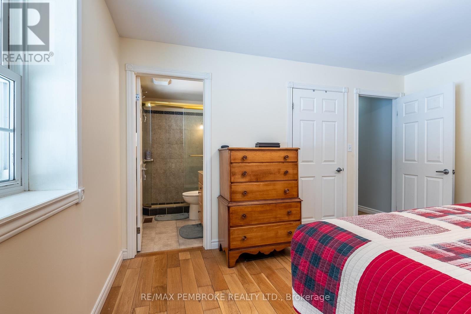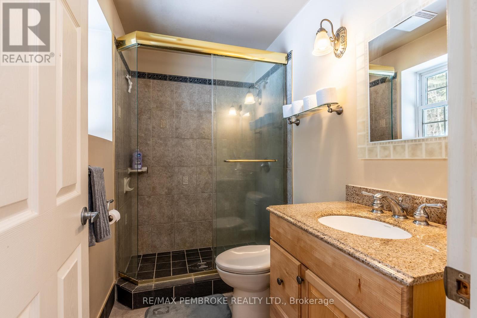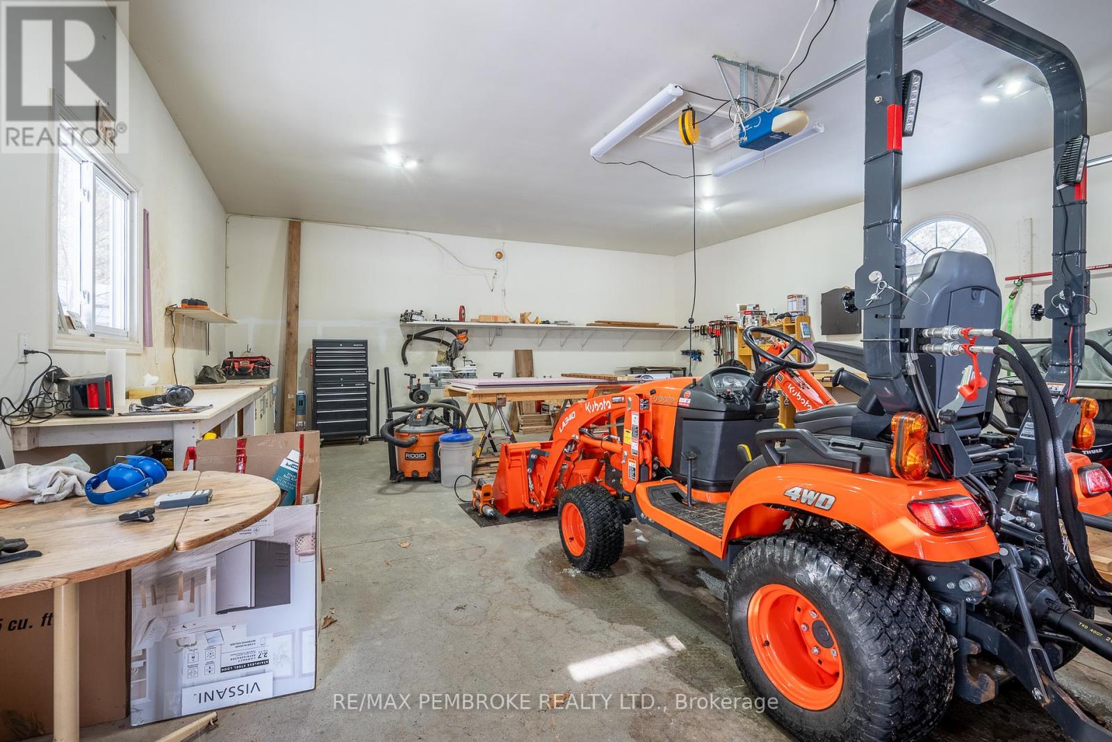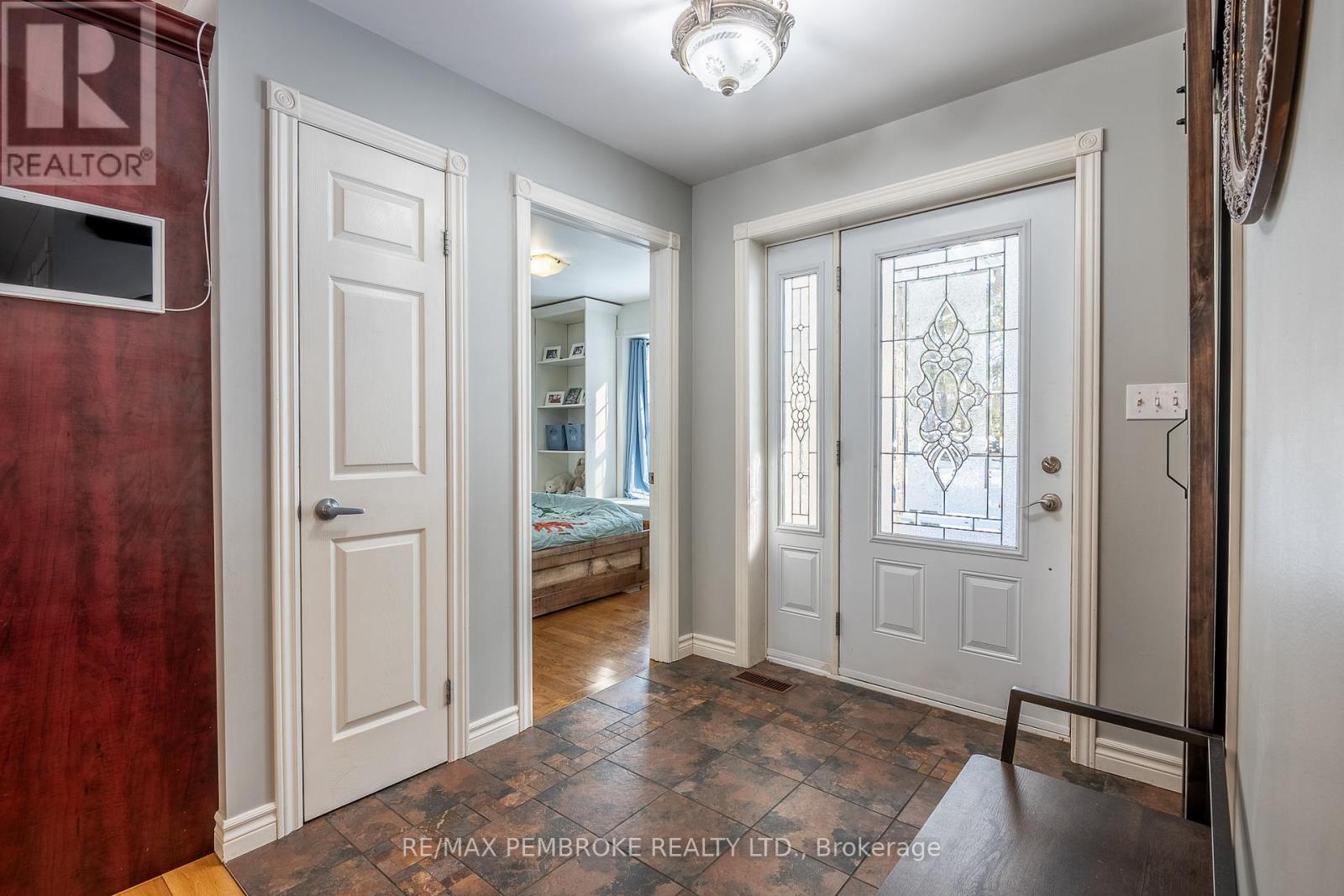 Set on a beautifully treed 1-acre lot, this custom-built home offers the perfect balance of privacy, space, and convenience, just minutes from town. With approximately 1750 sq ft of thoughtfully designed living space, this property is ideal for those seeking a quiet, nature-filled setting without sacrificing accessibility. The main level welcomes you with soaring vaulted ceilings and an open-concept layout, where large windows flood the home with natural light and frame the surrounding mature trees. The kitchen, dining, and living areas flow seamlessly, creating an inviting space for both everyday living and entertaining. A well-appointed primary suite features a private ensuite and walk-in closet, while two additional bedrooms and a full bathroom complete the main floor. A practical mudroom and main floor laundry are conveniently located off the attached insulated garage, which measures approximately 26' x 29'. The fully finished lower level expands your living space with a hardwood staircase, a spacious recreation area with a bar, a fourth bedroom with a walk-in closet, and a third full bathroom, ideal for guests or extended family. Direct access to the attached garage and a large mechanical/storage room add to the home's functionality. Built for efficiency, the home features an ICF foundation extending to the trusses and a furnace installed in 2020. Outside, enjoy a generous deck, wiring for a hot tub, play structure, and storage shed, perfect for embracing outdoor living. Car enthusiasts, hobbyists, or those needing extra space will appreciate the insulated and impressive 24' x 29' detached garage. With excellent curb appeal highlighted by a brick front, this property makes a strong first impression. Located just 5 minutes from Highway 17, enjoy a 10 minute commute to Garrison Petawawa, 20 minutes to CNL, or 20 minutes Pembroke. A rare opportunity to enjoy peaceful country living with all amenities close at hand. (id:28469)