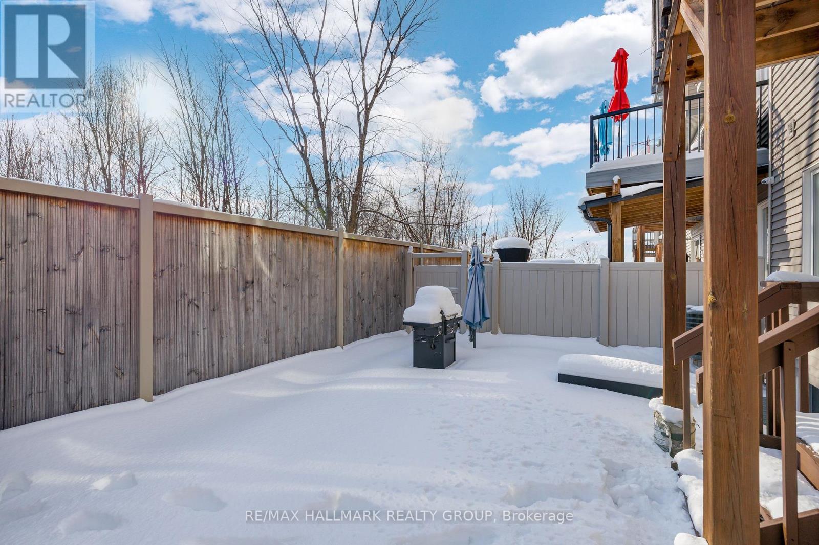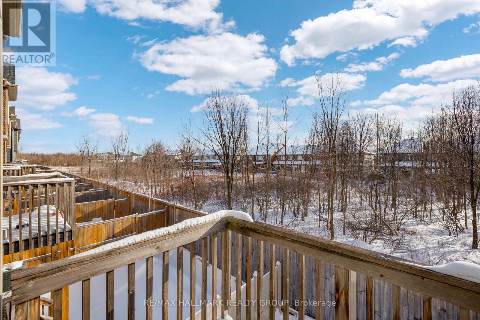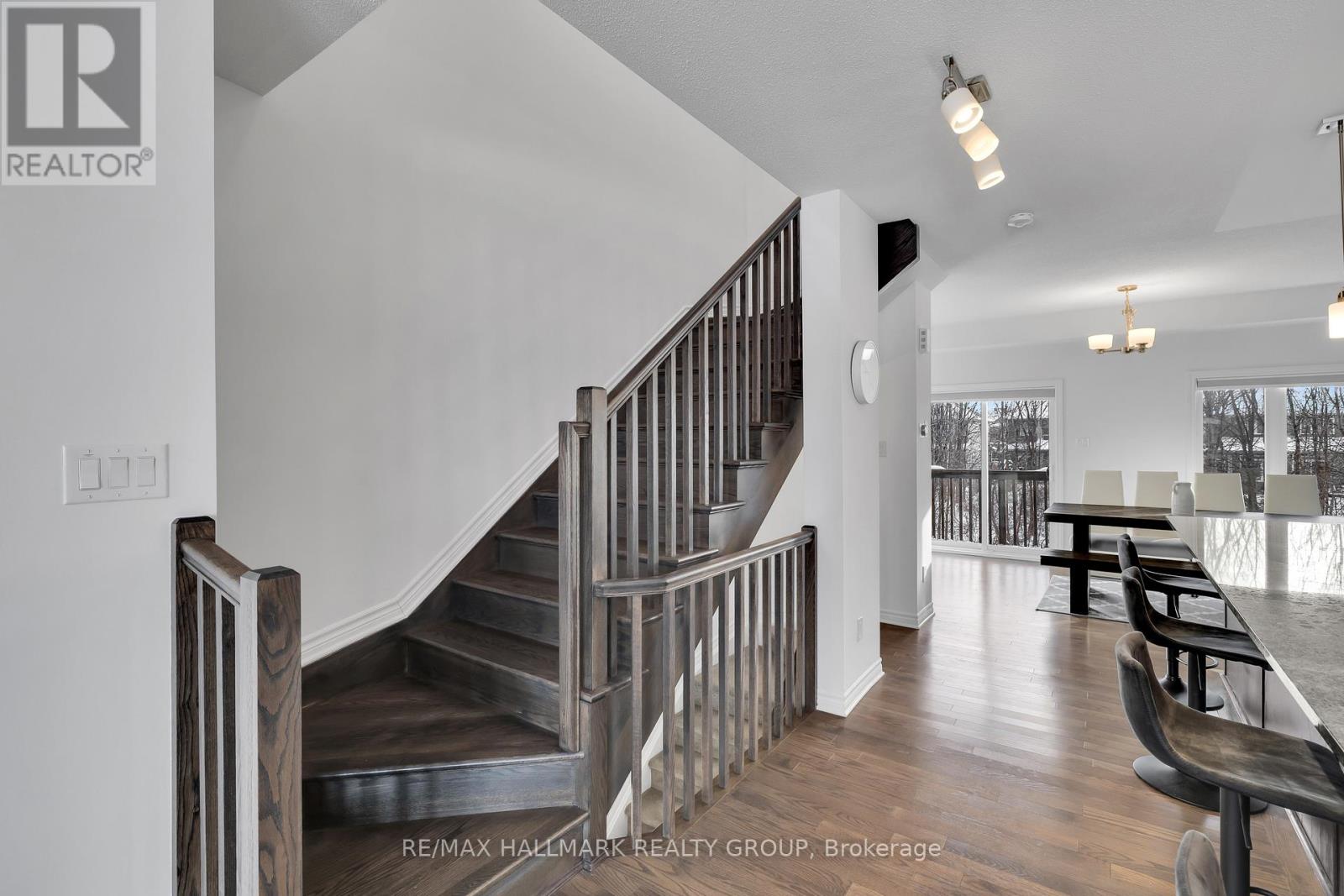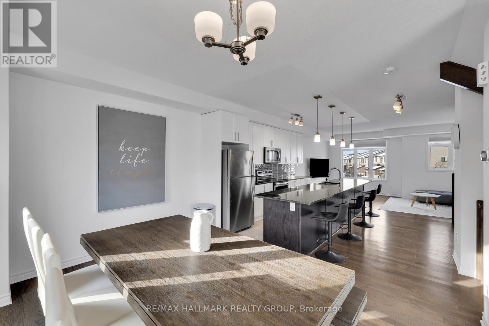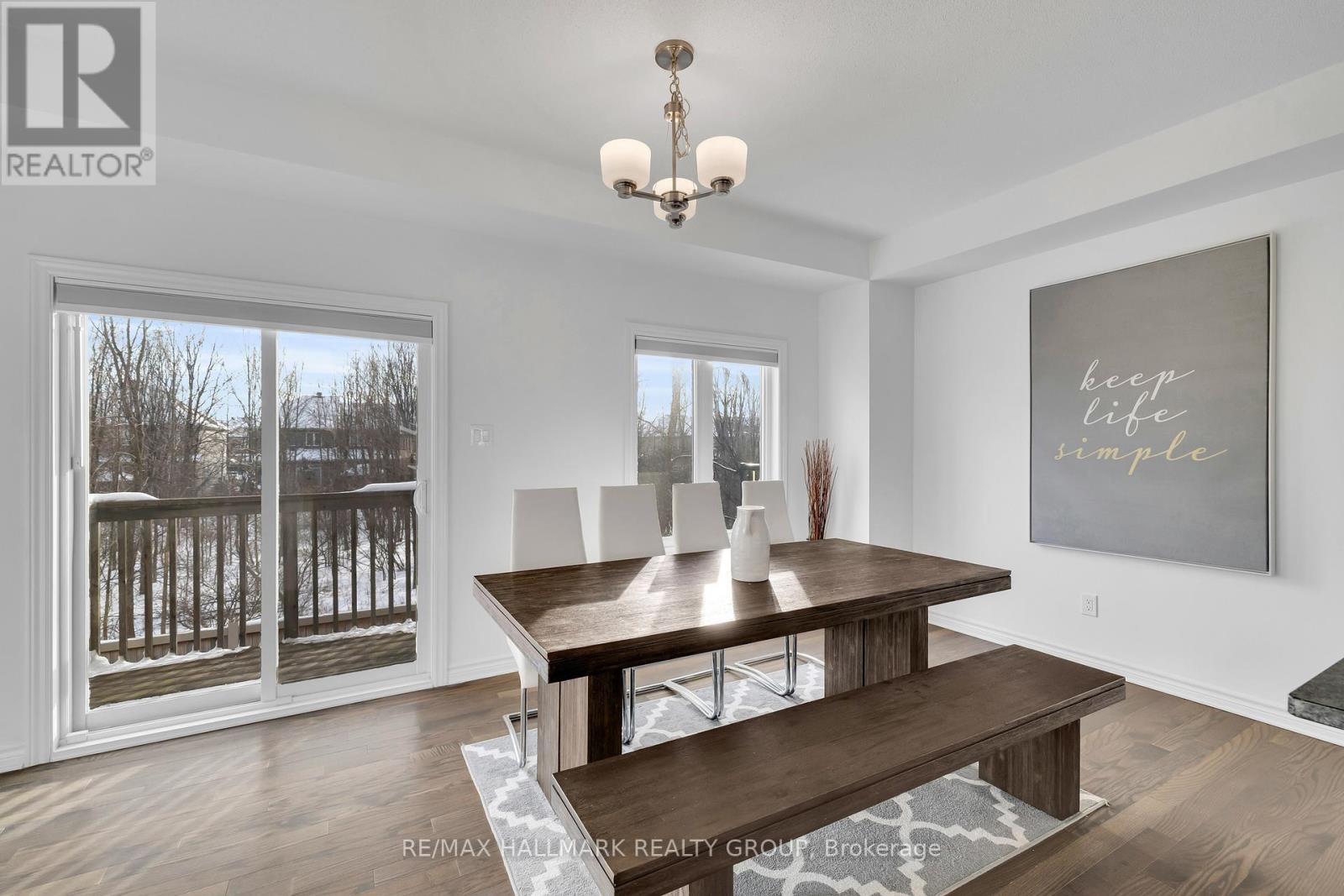 **OPEN HOUSE THURSDAY JANUARY 29th at 5-7PM** -- Welcome to 26 Barn Swallow Private, a meticulously maintained end-unit 3-storey townhome built in 2019 and presented in true model home condition. This bright and thoughtfully designed residence offers 3 bedrooms, 3 bathrooms, and a functional layout ideal for modern living.A tiled entry welcomes you into the main level, where upgraded hardwood flooring highlights a versatile living space at the rear of the home with direct access to a private, professionally landscaped backyard, perfect for relaxing or entertaining. The second level features a stunning open-concept kitchen, dining, and living area, anchored by an oversized stone island with seating for 6 to 8 guests. Side windows flood the space with natural light, showcasing dark hardwood floors, crisp white cabinetry, and stainless steel appliances. A dedicated dining area opens to a balcony overlooking a mature, tree-lined ravine, offering a peaceful backdrop rarely found in townhome living.The third floor hosts three well-proportioned bedrooms, including a spacious primary retreat large enough for a king-size bed, complete with two walk-in closets and a sleek ensuite featuring a full glass shower. The additional bedrooms are ideal for children, guests, or a home office.The unfinished basement provides excellent flexibility and is currently used as a gym, with potential for a family room, bedroom, or additional living space to suit your needs.Ideally located just off Earl Armstrong Road between Prince of Wales Drive and Limebank or Riverside Drive, this home offers convenient access throughout the city, nearby shopping, schools, and everyday amenities. The private road includes 11 additional visitor parking spaces, along with nearby street parking. (id:28469)