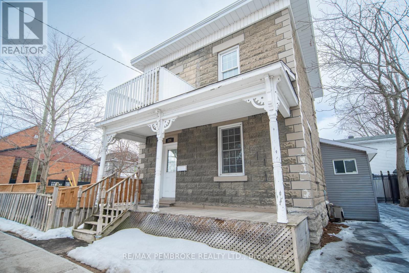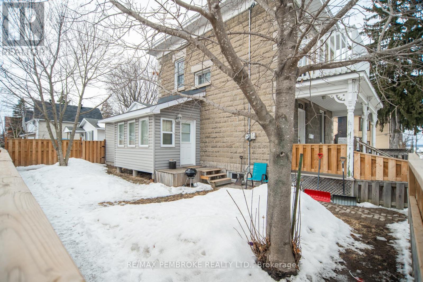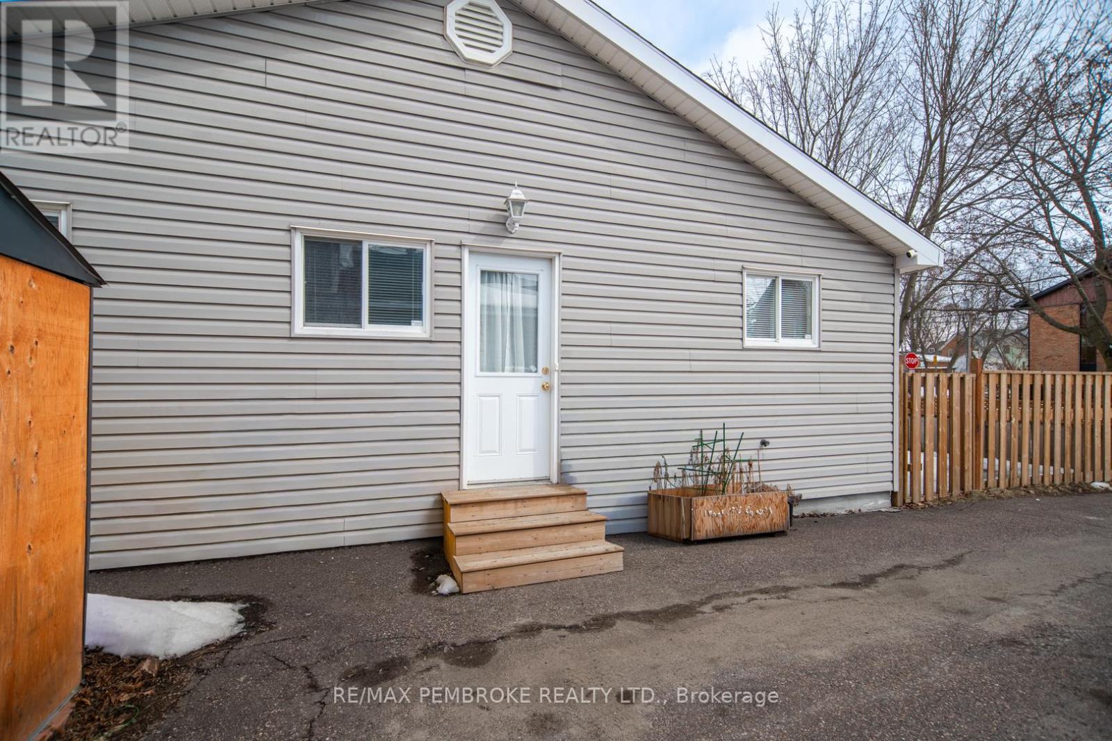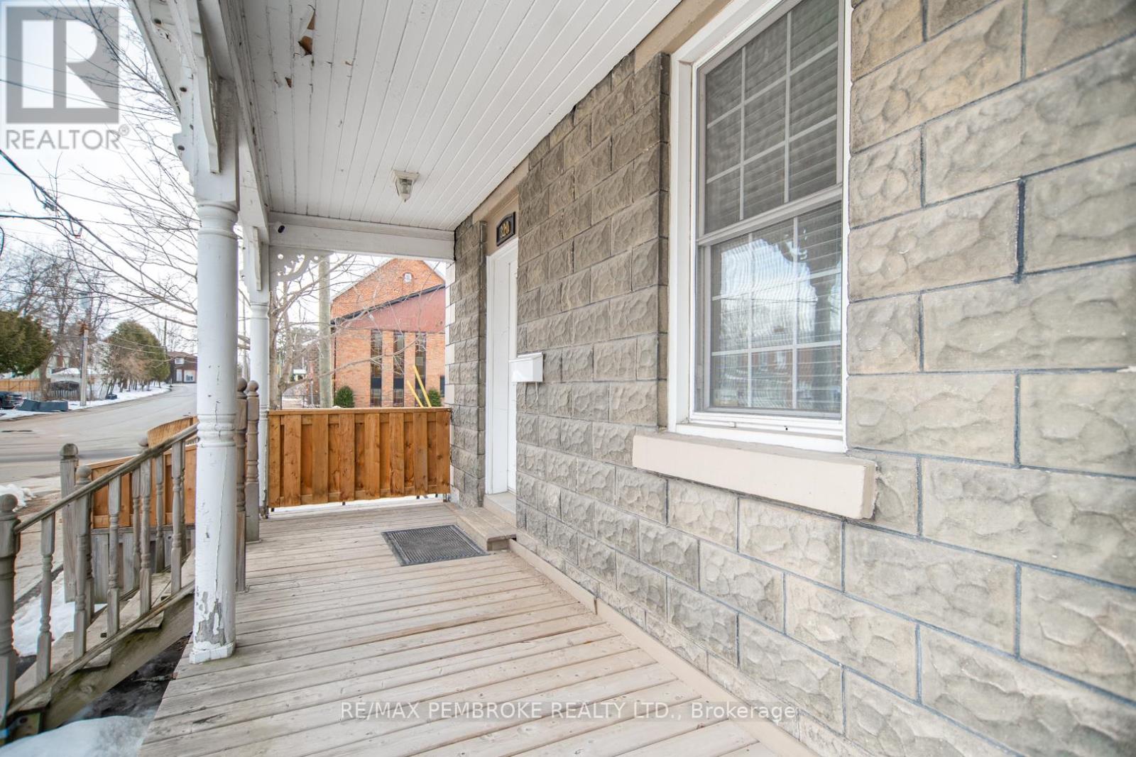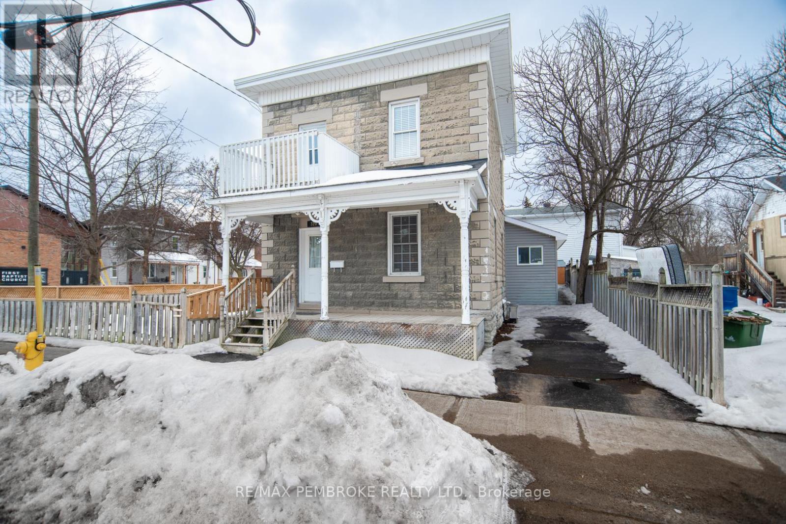 This two-story home is a rare find, offering both affordability and convenience in a prime central location, just a leisurely stroll away from downtown Pembroke. Whether you're a first-time home buyer or looking to downsize, this property is a fantastic opportunity you won't want to miss. The main floor opens with a spacious foyer leading to a large kitchen with oak cupboards, providing ample storage, spacious dining and living areas with gleaming hardwood flooring throughout. The main floor also features a good sized mudroom with a convenient laundry area, making everyday chores a breeze and a bedroom complete with a full en-suite. The second floor has 2 good sized bedrooms, also with hardwood flooring and a full bathroom. One of the bedrooms leads to a charming balcony perfect for a morning coffee or evening glass of wine. The full basement is perfect for all your storage needs, offering plenty of space to keep your belongings organized and out of sight. The property features 2 separate driveways for easy access and lots of guest parking, a fenced in green space and a storage shed which offers additional space for your tools and hobbies. Relax on the front veranda or cozy up with a book in the enclosed side porch. Enjoy the close proximity to shops, restaurants, parks, and community events that make Pembroke a desirable place to call home. At this price, this home offers a great opportunity to invest in your future. Book your viewing today! 48 hour irrevocable on offers. (id:28469)