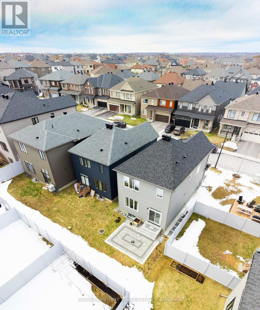 Welcome to this beautifully upgraded 2022 home in the sought-after Quinn's Pointe community. The Kinghurst model is one of Minto's most popular models, offering 3+1 bedrooms and 3.5 bathrooms with exceptional finishes throughout. From the moment you step inside, you'll notice the upgraded engineered hardwood flooring, smooth ceilings, smart home features, and modern pot lights that create a warm and contemporary atmosphere. The kitchen is enhanced with upgraded tile finishes, while the second floor features upgraded nine-foot ceilings and oversized windows that flood the space with natural light. A versatile flex room upstairs provides the perfect space for a home office or den and is already roughed-in for a washer and dryer, offering the option for convenient upper-level laundry. The second level also showcases brand-new laminate flooring throughout, with new carpet in one bedroom for added comfort. The fully finished basement expands your living space with an additional bedroom and a full bathroom featuring a sleek glass shower, ideal for multigenerational living or potential income. The living room is anchored by a cozy natural gas fireplace, complemented by custom windows in both the living room and upstairs hallway that further enhance natural light, while zebra blinds throughout the home add both style and privacy. Step outside to professionally completed interlock stonework in the front, backyard, and side yard, along with extended outdoor space and additional landscaping, perfect for relaxing or entertaining. This home truly combines modern upgrades, thoughtful design, and incredible versatility in one of Barrhaven's most desirable neighbourhoods. (id:28469)