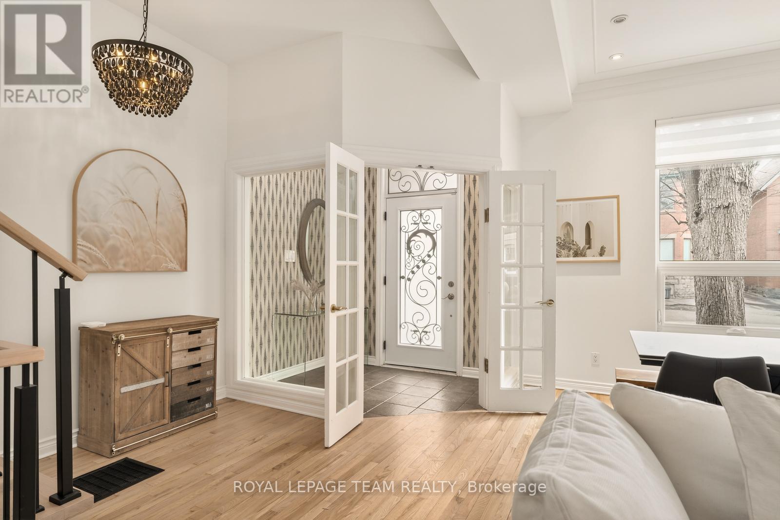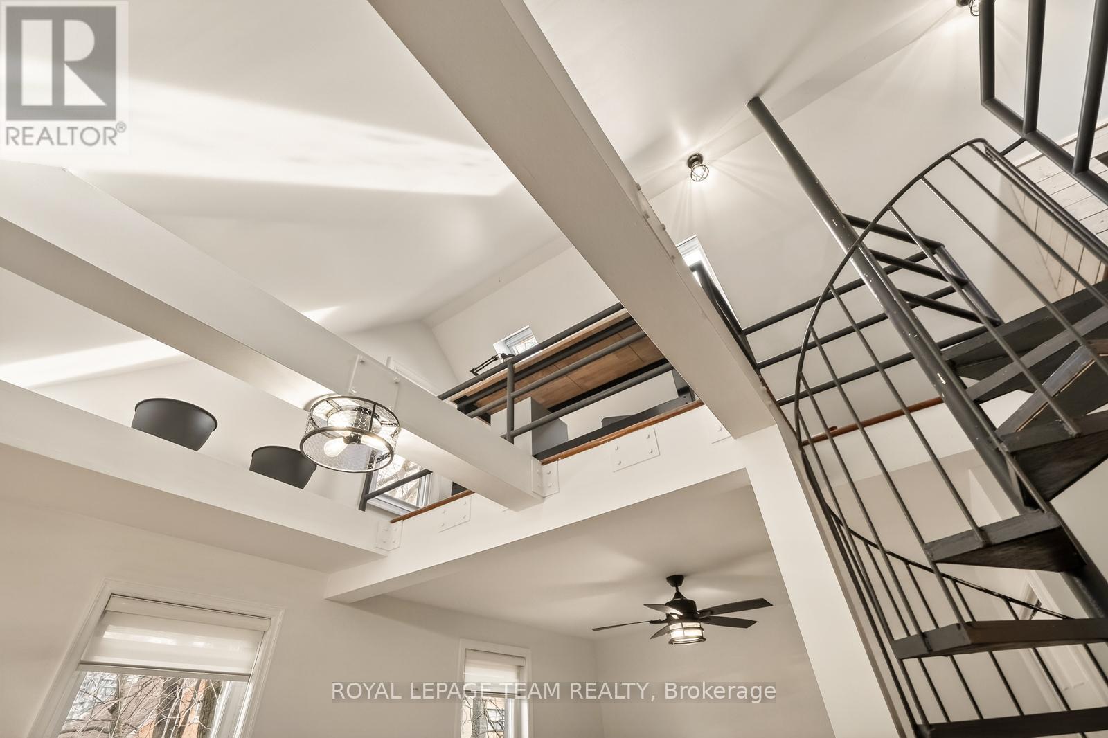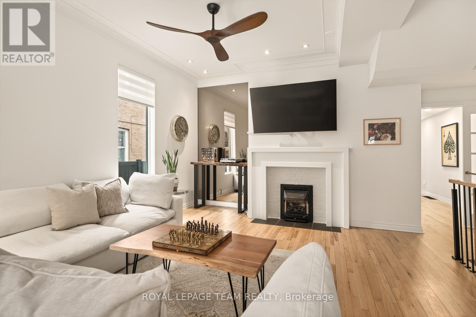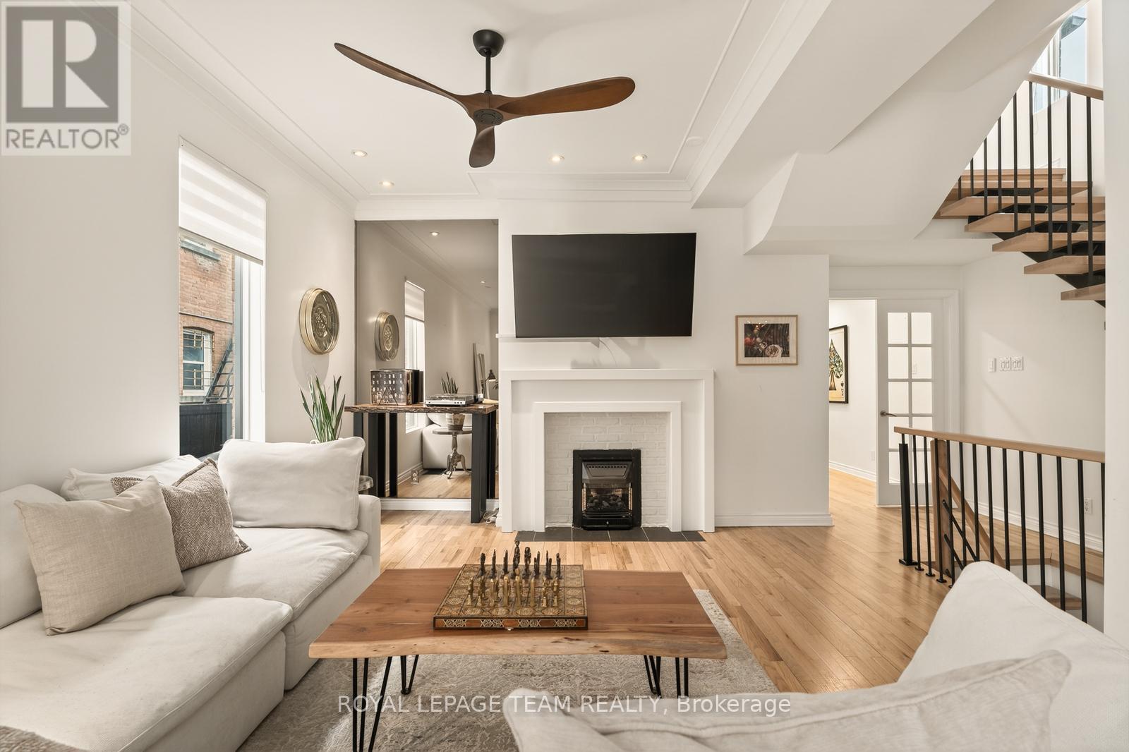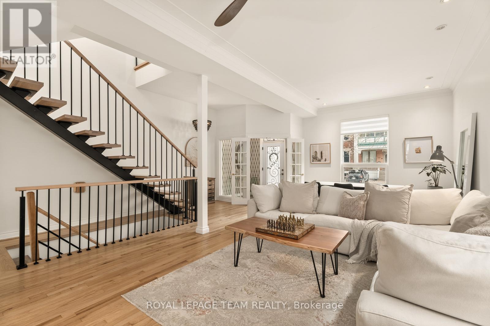 Turnkey and full of personality, 349 Frank Street delivers standout design, function, and lifestyle in a quiet downtown pocket between Elgin and Bank. A rebuilt front porch with privacy gate elevates outdoor living and sharpens curb appeal. Inside, soaring ceilings, refinished hardwood, and a gas fireplace anchor the bright, south-facing living space. The main level flows through a chic full bath and generous laundry to a standout kitchen-wall of cabinetry, oversized fridge, gas range, butcher block island, coffee bar with wine fridge, exposed brick, and original winding staircase. Patio doors open to a vibrant backyard with hot tub, pergola lighting, and a beautifully finished cedar shed with power. Upstairs, an unforgettable two-level loft primary stuns with glass wall, beams, and office nook, plus two private additional bedrooms-including one with balcony-and a spa-scale bath. Lower level features a moody, cinematic home theatre, gym space, bar/kitchenette, and bonus room. (id:28469)