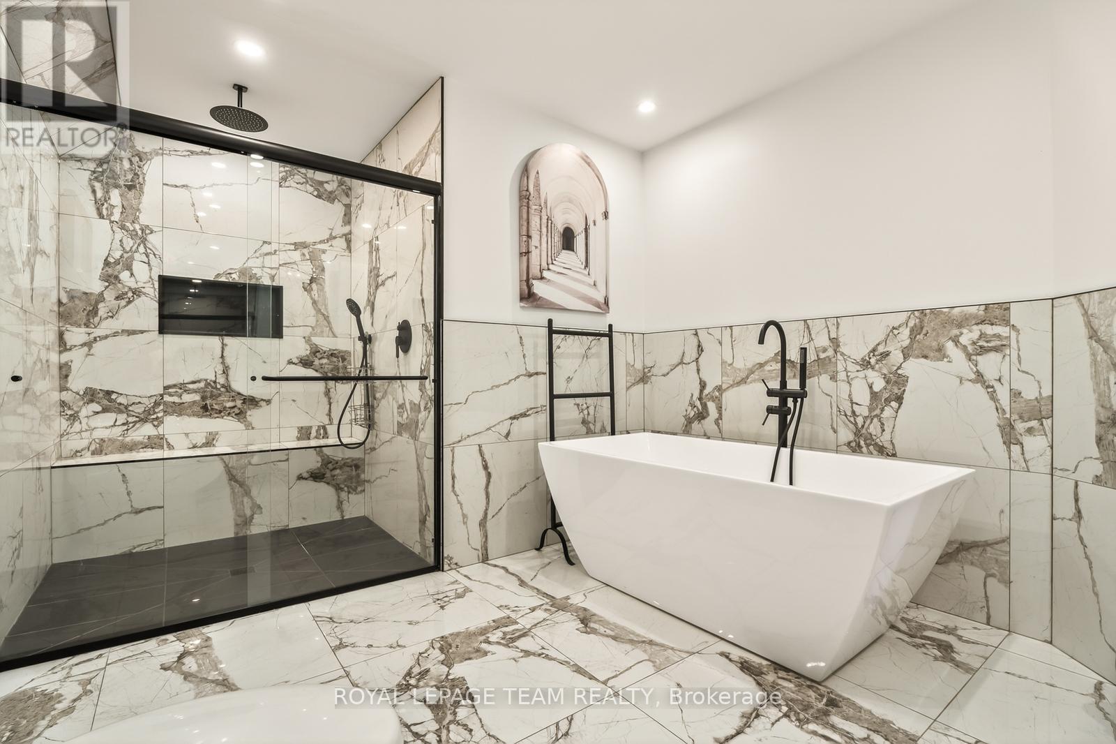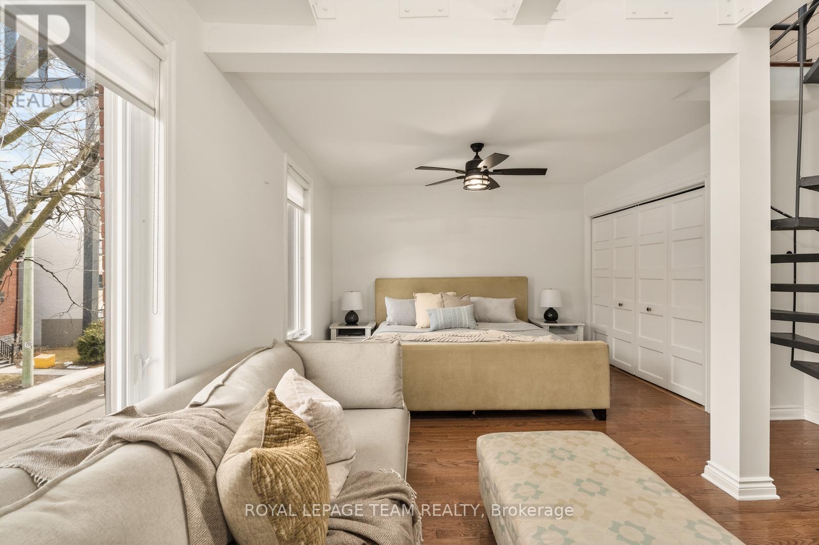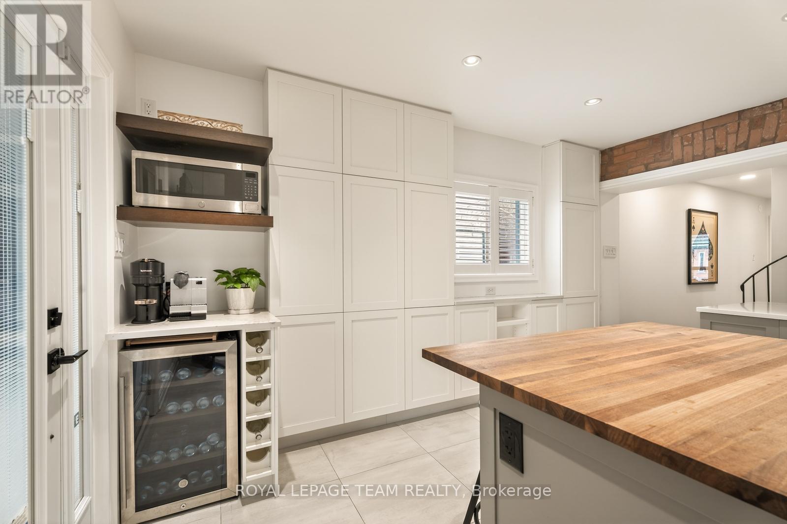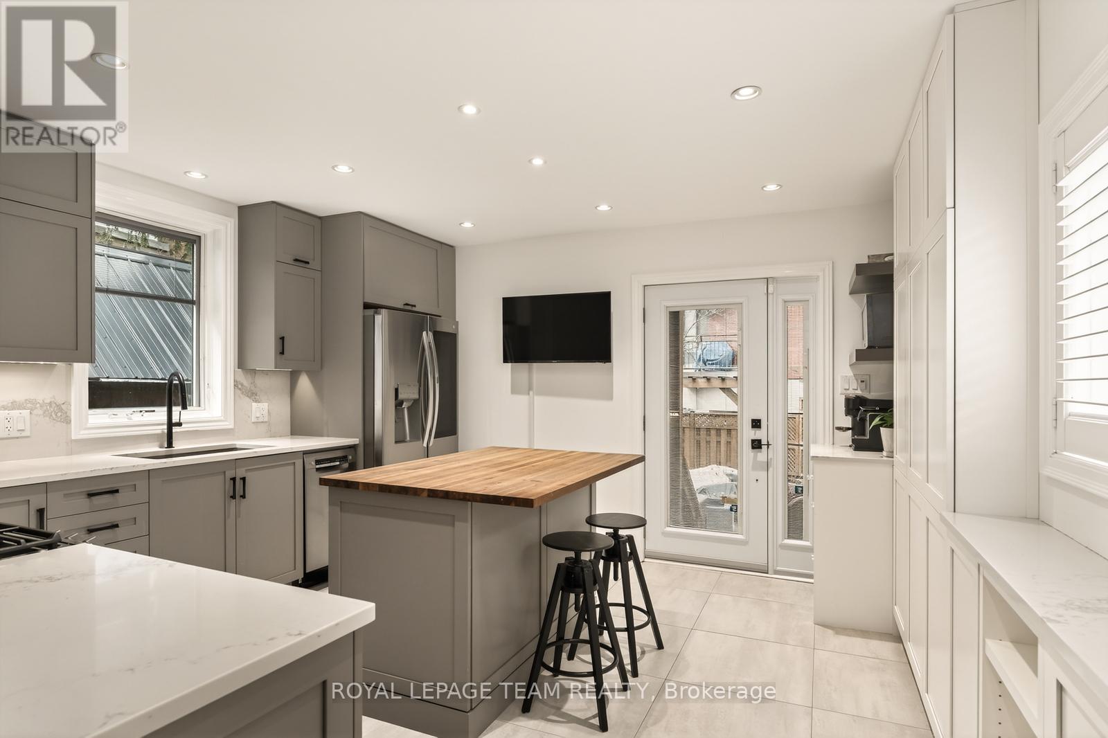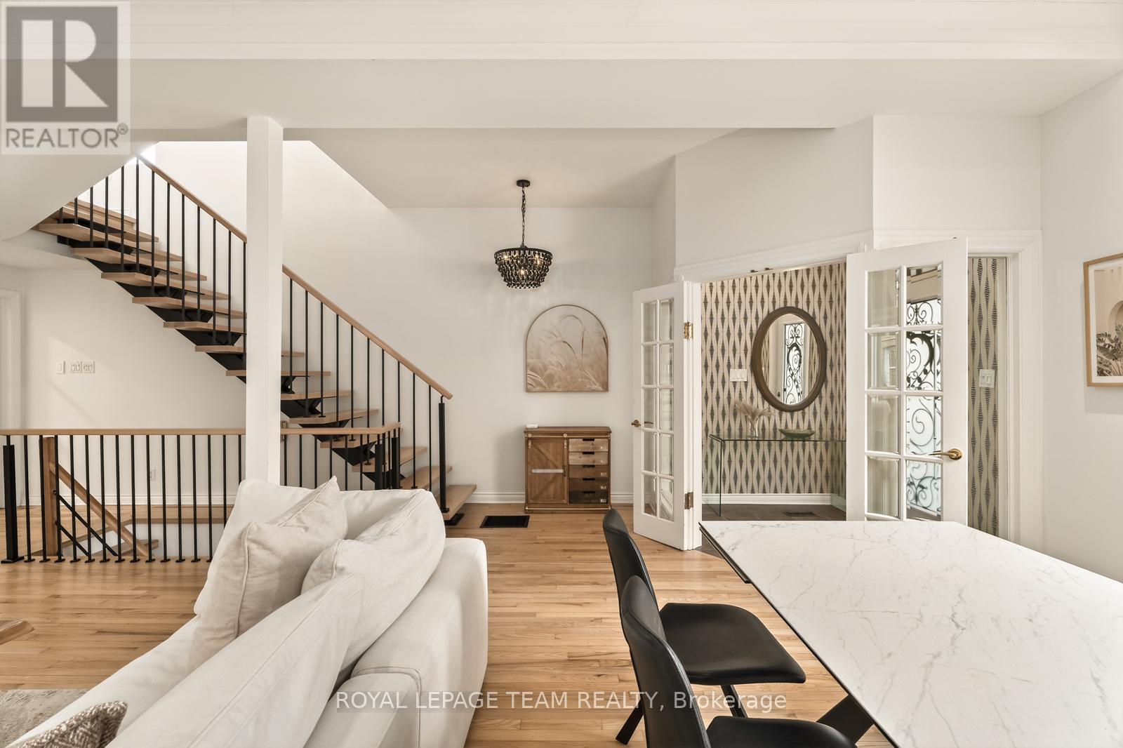 Turnkey and full of personality, 349 Frank Street delivers standout design, function, and lifestyle in a quiet downtown pocket between Elgin and Bank. A rebuilt front porch with privacy gate elevates outdoor living and sharpens curb appeal. Inside, soaring ceilings, refinished hardwood, and a gas fireplace anchor the bright, south-facing living space. The main level flows through a chic full bath and generous laundry to a standout kitchen-wall of cabinetry, oversized fridge, gas range, butcher block island, coffee bar with wine fridge, exposed brick, and original winding staircase. Patio doors open to a vibrant backyard with hot tub, pergola lighting, and a beautifully finished cedar shed with power. Upstairs, an unforgettable two-level loft primary stuns with glass wall, beams, and office nook, plus two private additional bedrooms-including one with balcony-and a spa-scale bath. Lower level features a moody, cinematic home theatre, gym space, bar/kitchenette, and bonus room. (id:28469)