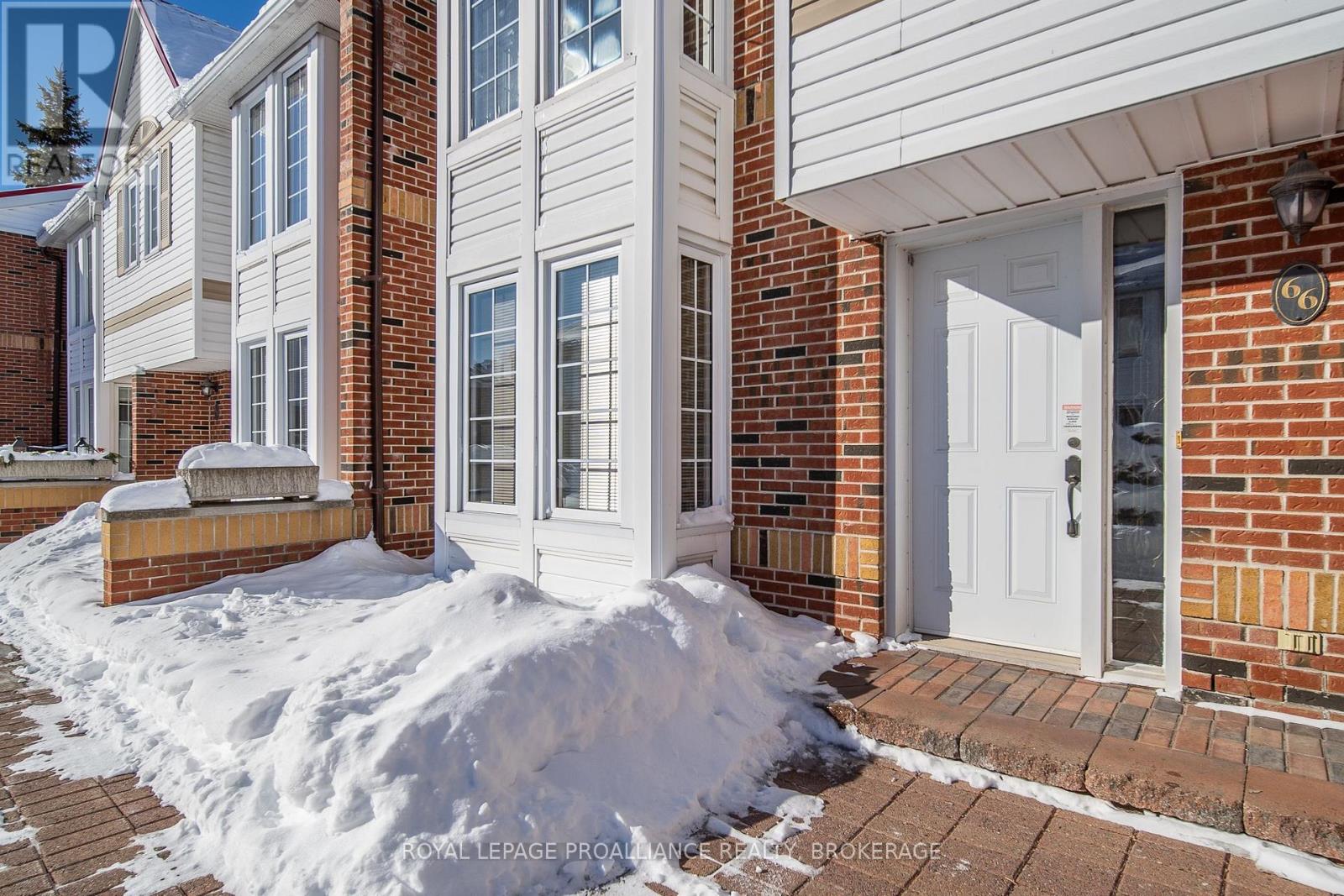 Welcome to Unit 66 at 1 Place d'Armes, a beautifully maintained 3-bedroom, 4-bathroomtownhome located in the sought-after Frontenac Village. This well-cared-for home features hardwood flooring throughout, including a hardwood staircase, offering a timeless and cohesive feel across all levels. Enjoy peace of mind with a newer furnace and air conditioning system. The west-facing yard provides lovely afternoon sun and a partial water view, creating a bright and welcoming outdoor space. Two convenient parking spaces are located directly outside the basement door with access to the underground parking garage. Residents of Frontenac Village enjoy excellent amenities including an outdoor pool, a separate games room, and a sauna. Ideally situated in the heart of downtown Kingston, this location offers easy access to public transit, the Slush Puppie Place, and an abundance of nearby restaurants, shops, and services. This is a great opportunity to enjoy low-maintenance living in one of downtown's most desirable communities. (id:28469)
