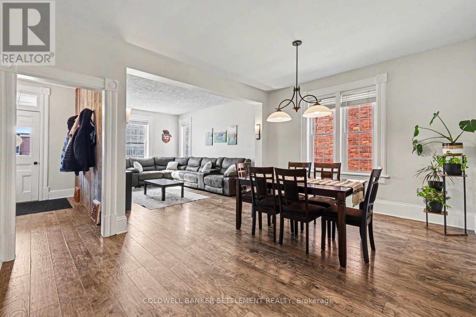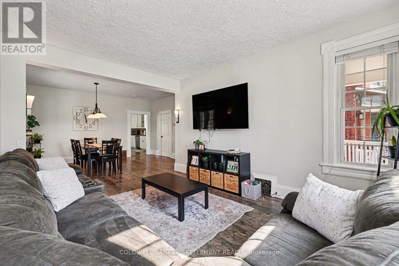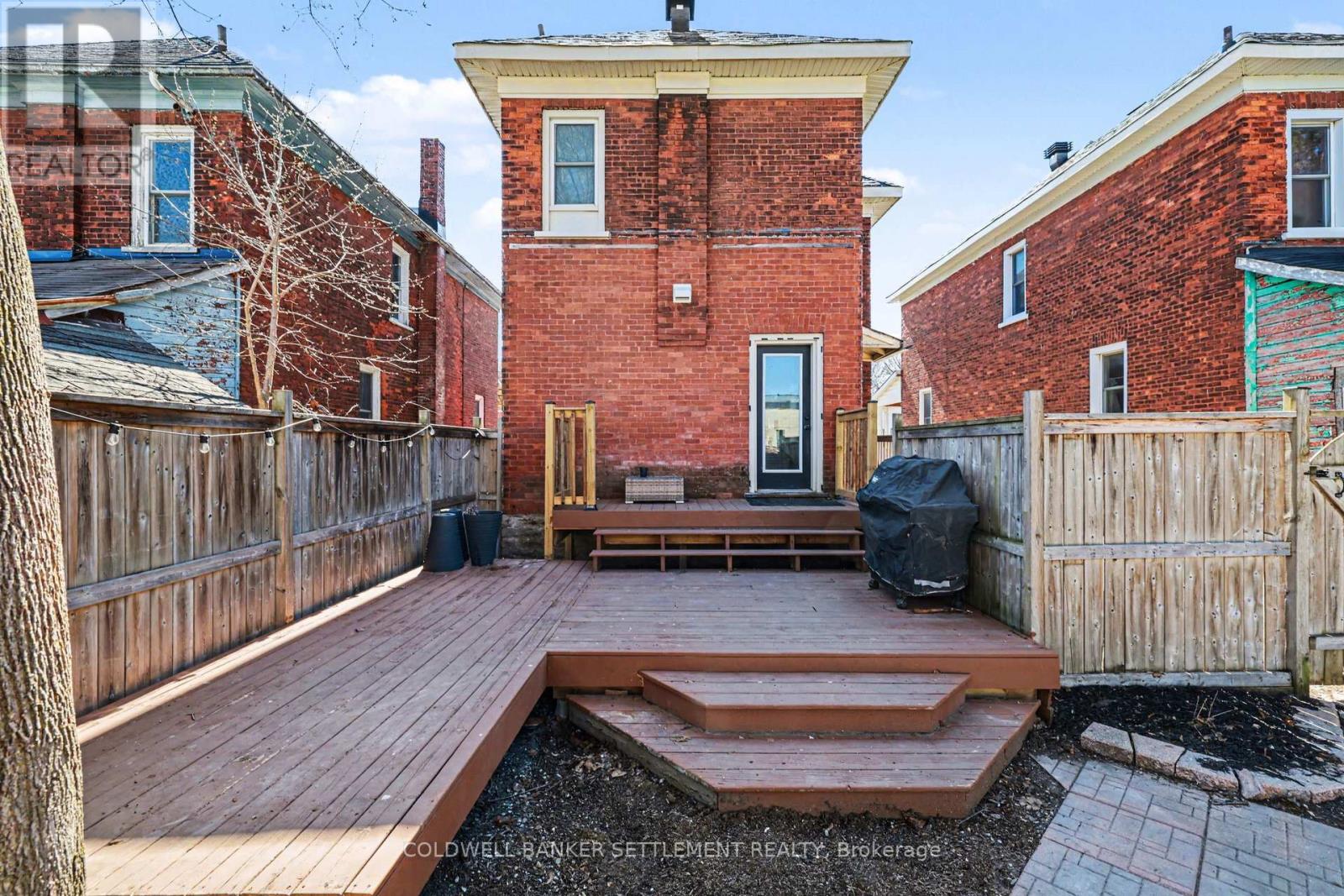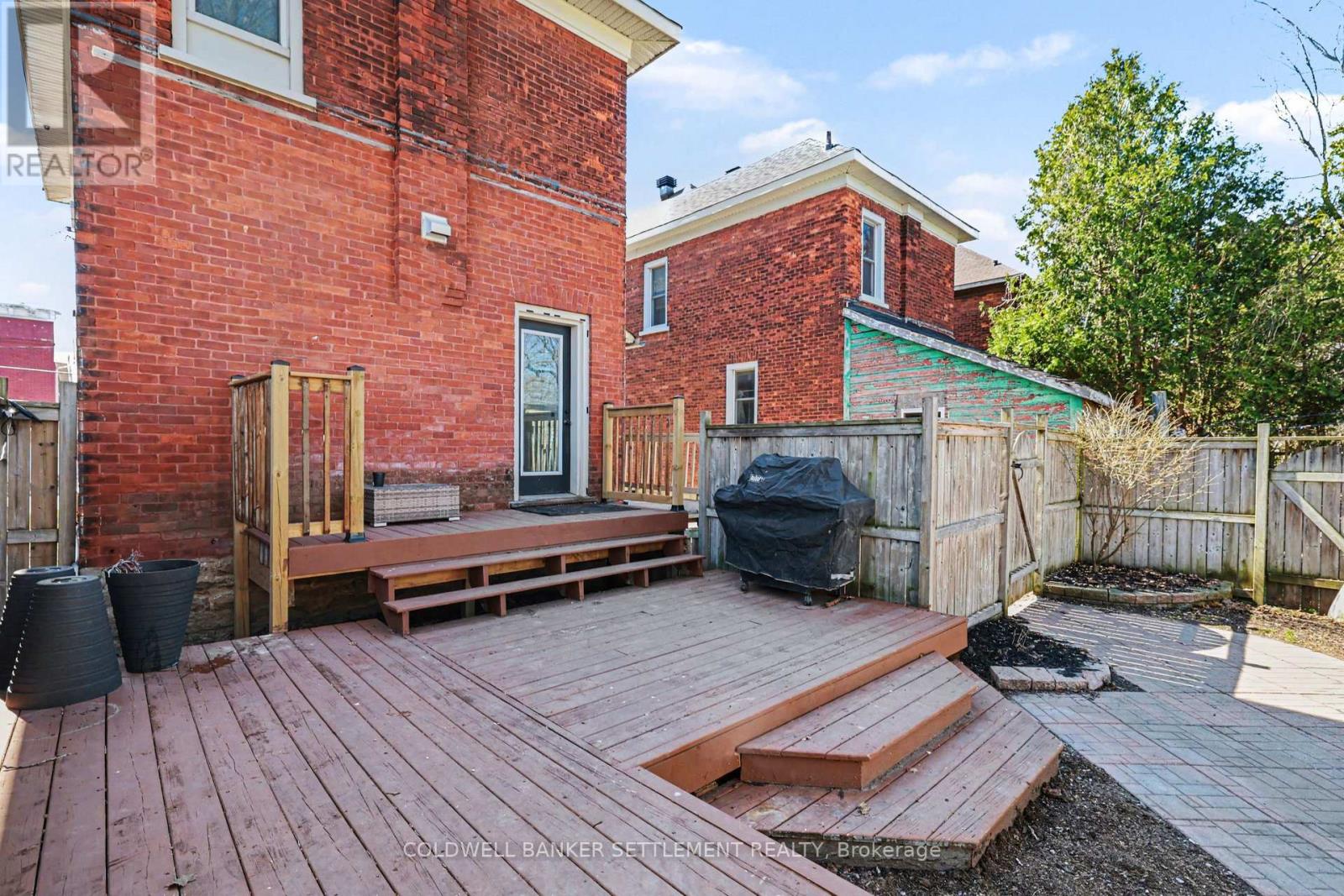 Charming all-brick 3-bedroom home with a versatile fourth upper-level room-currently used as a walk-in closet-offering a perfect blend of original character and modern updates. Ideally situated within walking distance to the downtown core, this home provides convenient access to a wide range of local amenities. Inside, the partially refreshed interior highlights classic vintage details paired with laminate flooring. The bright, open-concept living and dining area creates a welcoming space for both everyday living and entertaining. The updated kitchen features tasteful finishes, stainless steel appliances, and the added convenience of main-floor laundry. From here, step out to a spacious new two-tier deck-ideal for outdoor dining and hosting. The fully fenced yard offers privacy and security, while a newly built rear deck enhances the outdoor living space. A large, detached shed, along with an additional gardening shed, provides plenty of storage. An excellent opportunity for investors, first-time buyers, or those looking to downsize, this home combines comfort, charm, and convenience. (id:28469)