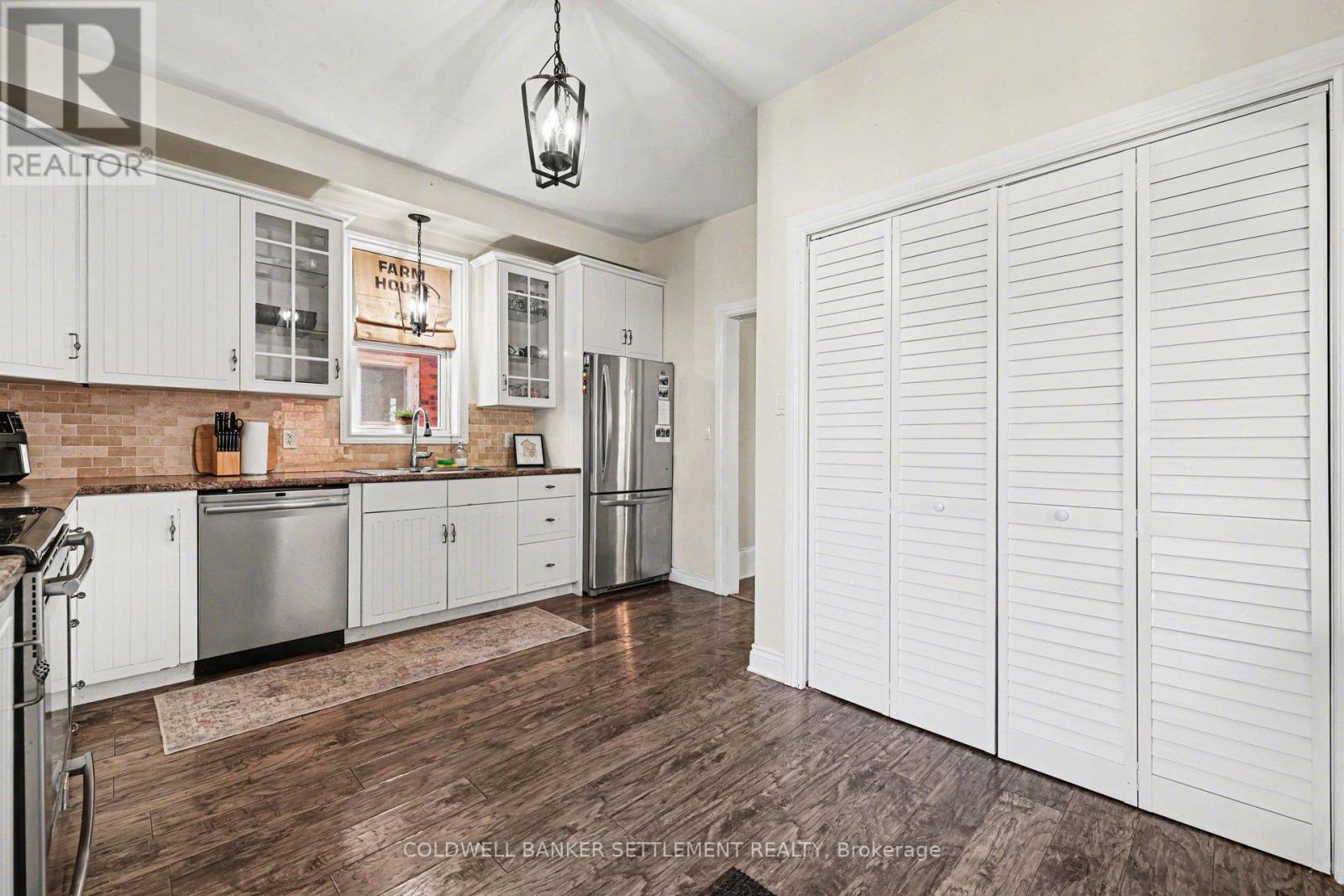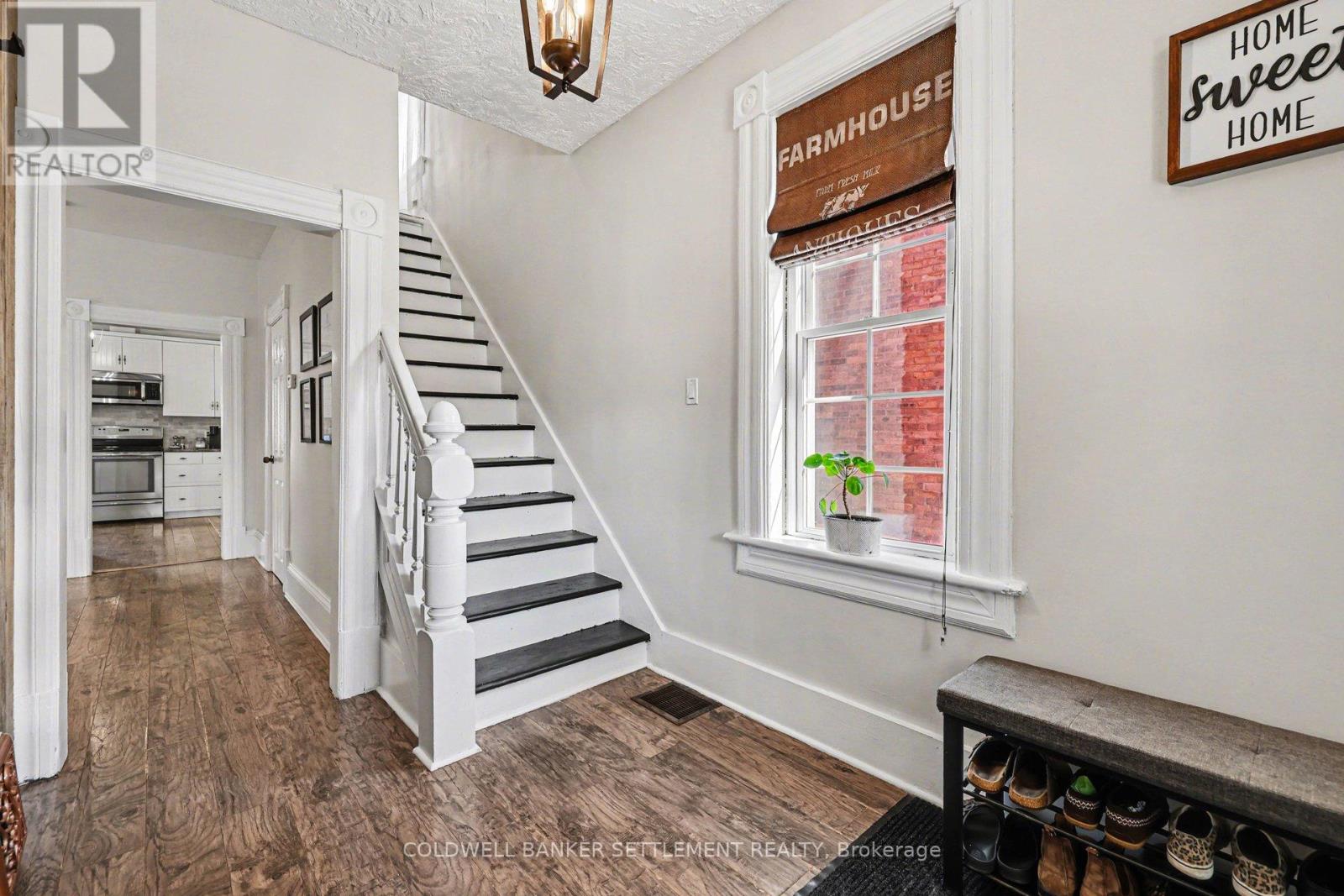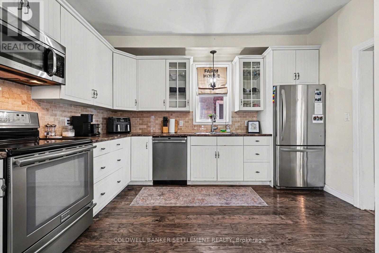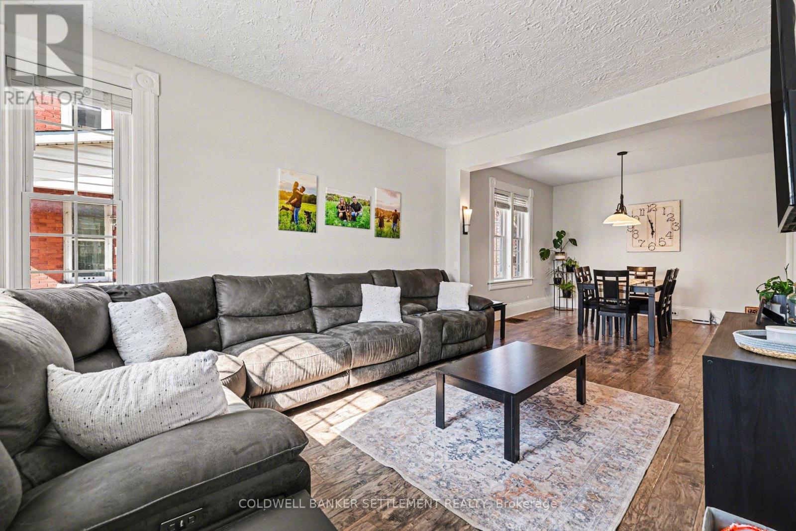 Charming all-brick 3-bedroom home with a versatile fourth upper-level room-currently used as a walk-in closet-offering a perfect blend of original character and modern updates. Ideally situated within walking distance to the downtown core, this home provides convenient access to a wide range of local amenities. Inside, the partially refreshed interior highlights classic vintage details paired with laminate flooring. The bright, open-concept living and dining area creates a welcoming space for both everyday living and entertaining. The updated kitchen features tasteful finishes, stainless steel appliances, and the added convenience of main-floor laundry. From here, step out to a spacious new two-tier deck-ideal for outdoor dining and hosting. The fully fenced yard offers privacy and security, while a newly built rear deck enhances the outdoor living space. A large, detached shed, along with an additional gardening shed, provides plenty of storage. An excellent opportunity for investors, first-time buyers, or those looking to downsize, this home combines comfort, charm, and convenience. (id:28469)
