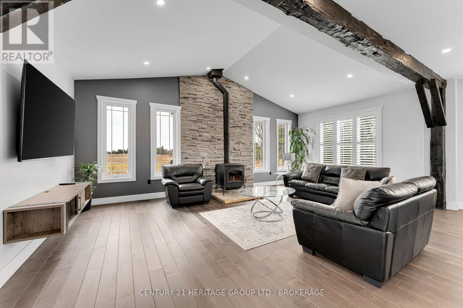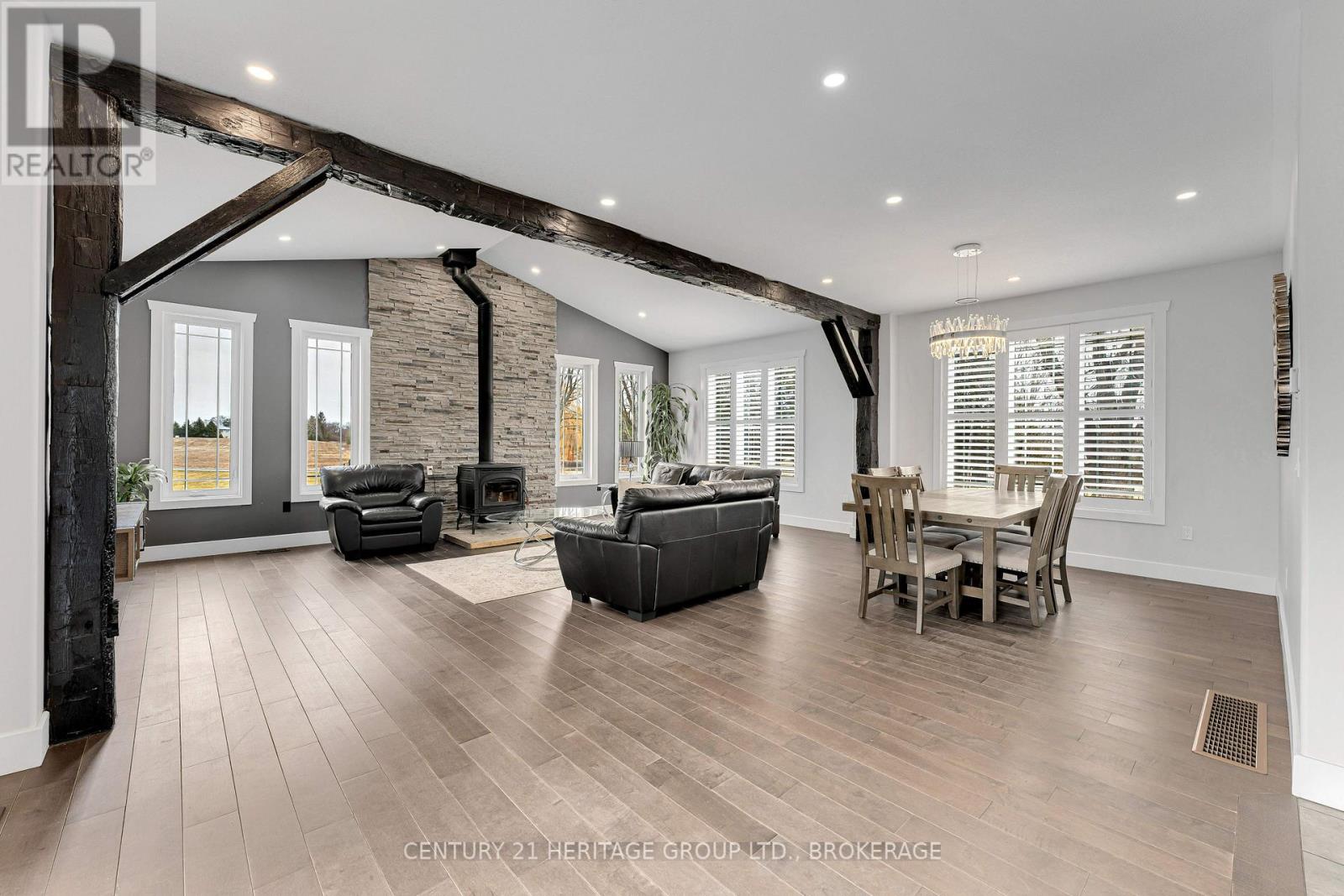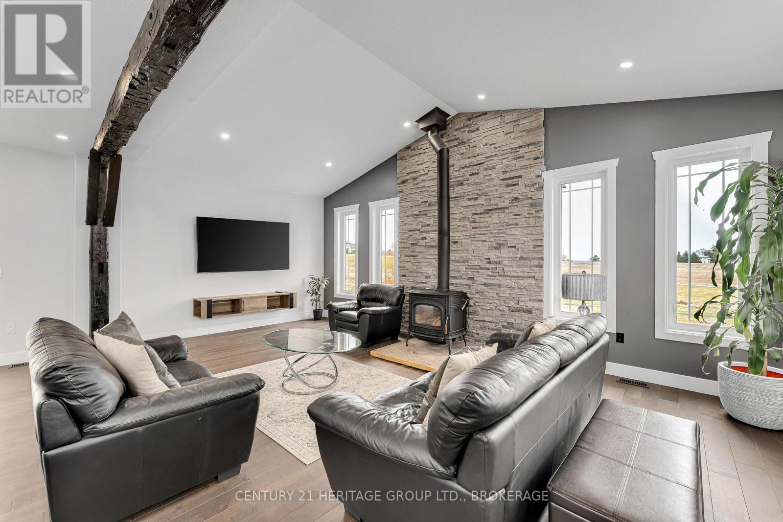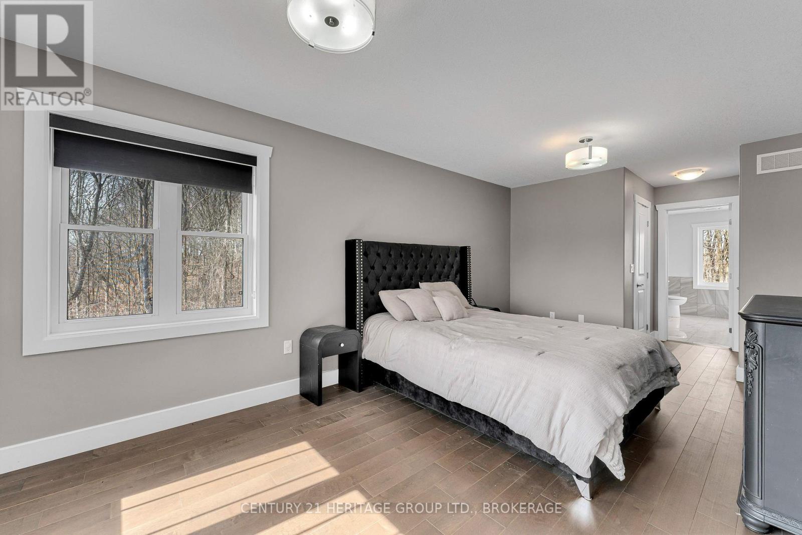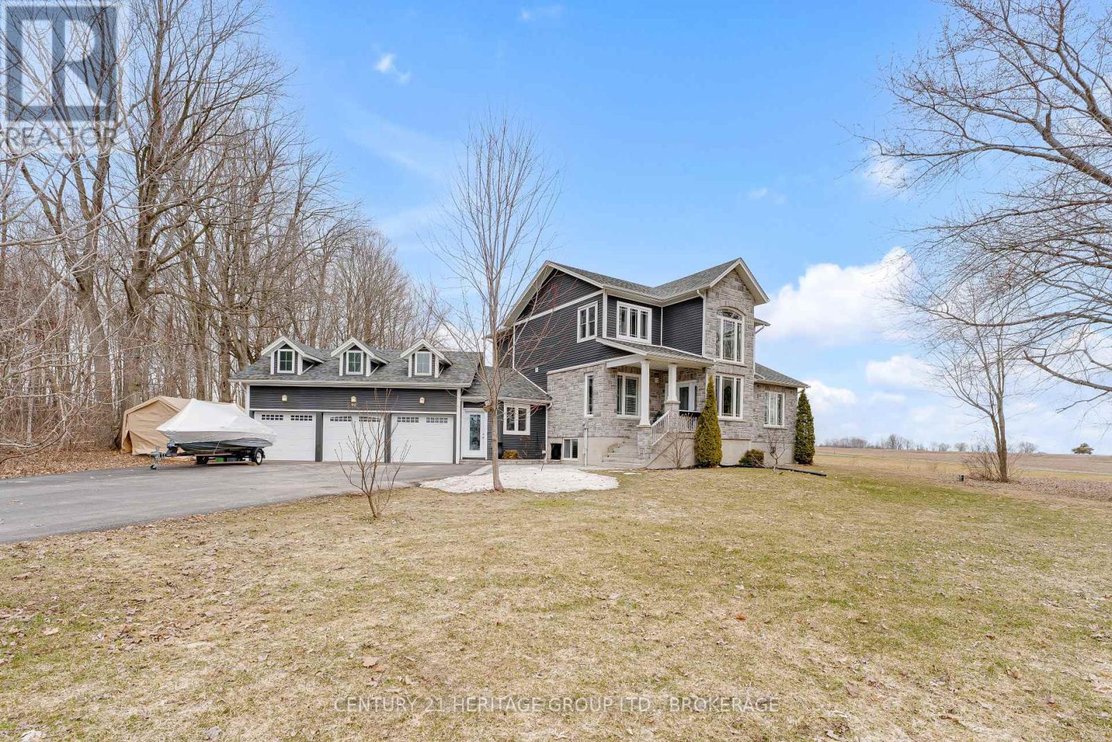 Set on a picturesque three-acre property just minutes from downtown and the 401, this exceptional residence offers a rare blend of privacy, space, and refined living. Thoughtfully designed with four bedrooms and four bathrooms, the home showcases quality craftsmanship and a layout that balances everyday comfort with elevated style. A welcoming mudroom entry leads into a beautifully appointed main floor featuring a dedicated office, convenient laundry, and elegant living spaces. At the heart of the home is a stunning, light-filled kitchen with quartz countertops, flowing seamlessly into the dining area and an impressive family room with soaring vaulted ceilings and a wood-burning fireplace. Hardwood flooring throughout adds warmth and sophistication. The primary suite is a true retreat, complete with a well-appointed ensuite and generous closet space. The fully finished lower level offers exceptional flexibility with a spacious rec room, additional bedroom, bathroom, and ample storage-ideal for guests or multi-generational living. The expansive grounds provide endless opportunities for outdoor enjoyment, complemented by a three-car garage. Planned enhancements to nearby Cecil and Wilma Graham Park, including a boat ramp, picnic areas, and walking paths, are expected by 2027, adding even more lifestyle value to this already desirable location. A rare opportunity to enjoy the best of country living with city convenience. (id:28469)