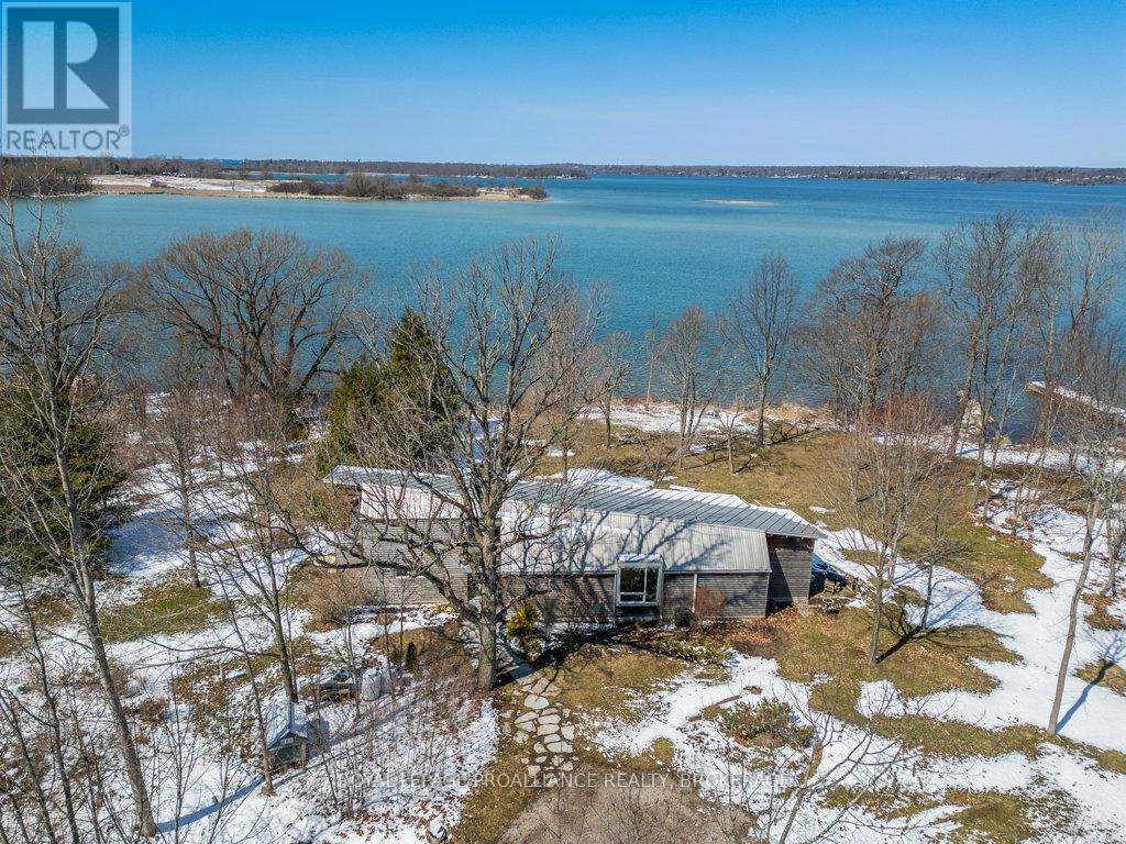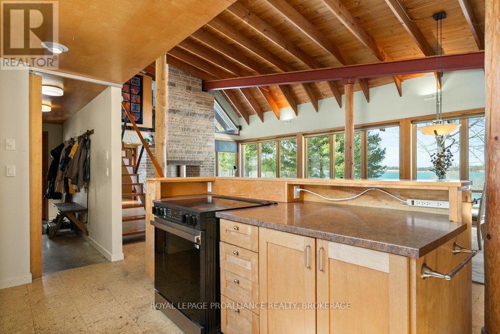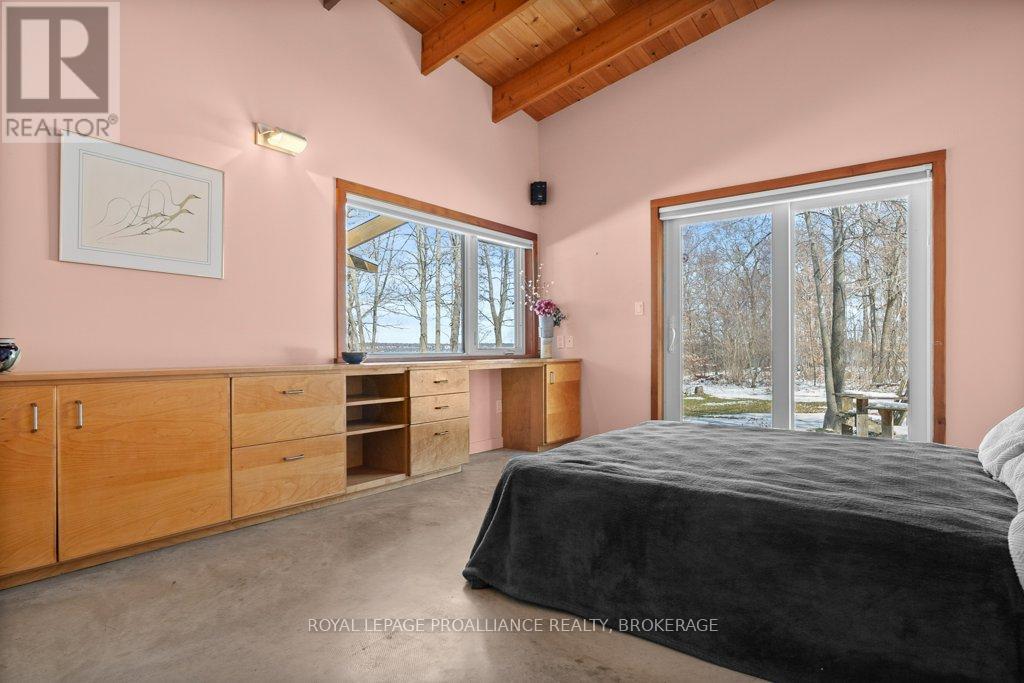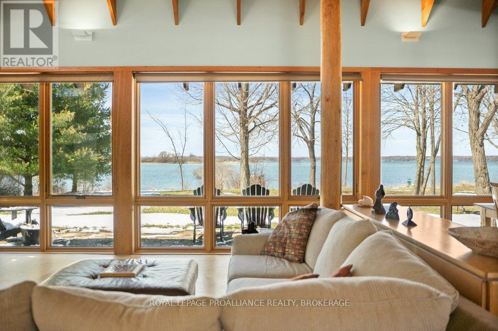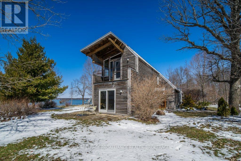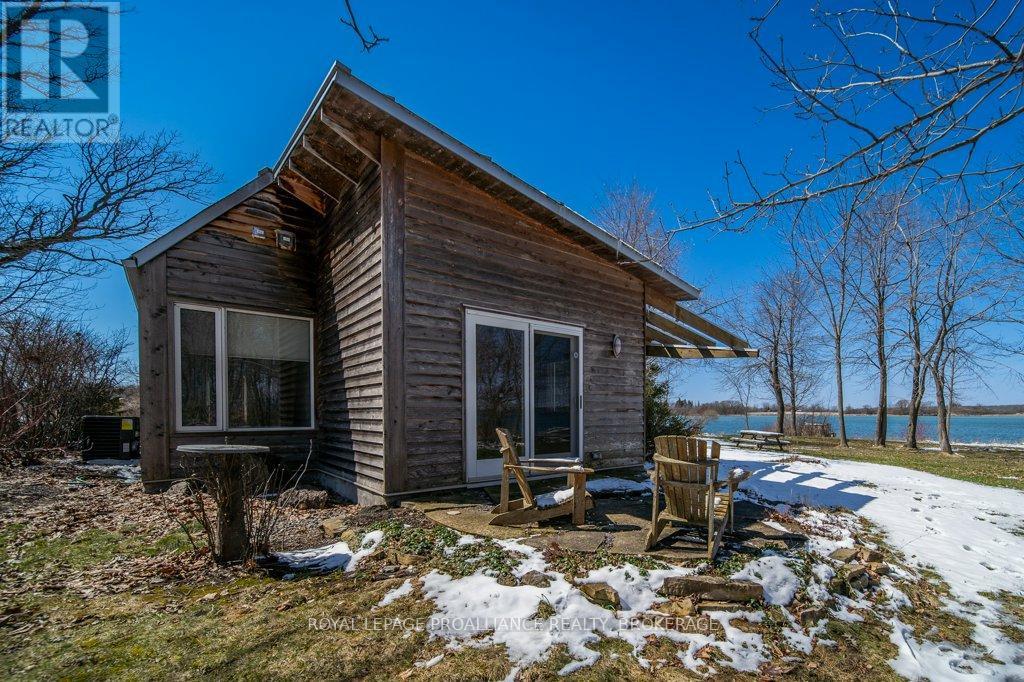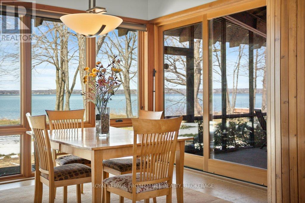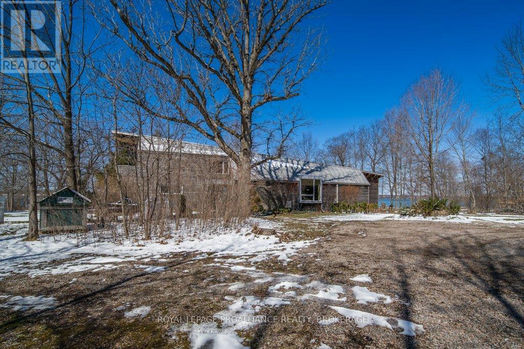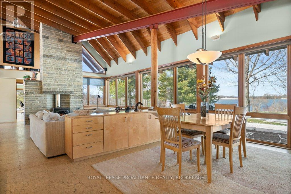 Very private waterfront home, on 24 acres with 505 feet of shoreline on the St. Lawrence River on the north shore of Wolfe Island. This architectural gem is a masterpiece, designed and built by some of the area's finest craftsmen. Its unique design draws inspiration from an upside-down boat, making it truly one-of-a-kind. The red cedar siding and soft-toned sloping steel roof blend seamlessly with the surrounding nature. You'll be amazed by the wall of floor-to-ceiling windows that offer breathtaking views of the bay, river, and countless waterfowl. The home's features include stunning vaulted ceiling with exposed Douglas fir Columns , spruce upper deck, and the open concept kitchen, and dining room that leads out to a cozy screened-in porch, living room with woodstove, and stunning interior limestone chimney. Enjoy the comfort of slab-on-grade heating on the cork and poured concrete flooring. The principal bedroom, with a four-piece ensuite, walk-in closet, and patio door, leads to a sitting area overlooking the water. The open stairwell leads to an office with incredible views and side deck. This space could be easily converted into an additional bedroom. On the other side of the great room, you'll find a guest room with patio doors leading to an outside sitting area and a second full bathroom. The home's layout and design offer ample storage where needed. Outside is a three-bay garage with a workshop, perfect for home improvement projects and storing your toys. The clean waterfront is perfect for swimming, or to jump into your boat and head to Kingston for dinner or down the river to explore the 1000 Islands. Hike your own private trails, and appreciate the decades of love and dedication poured into this wildlife oasis. Watch the breathtaking sunsets over McDonell Bay and the mainland, light a bonfire, and gaze at the stars in the dark night sky. Escape the hustle and bustle of city life, and discover the wonders of this wonderful community. (id:28469)