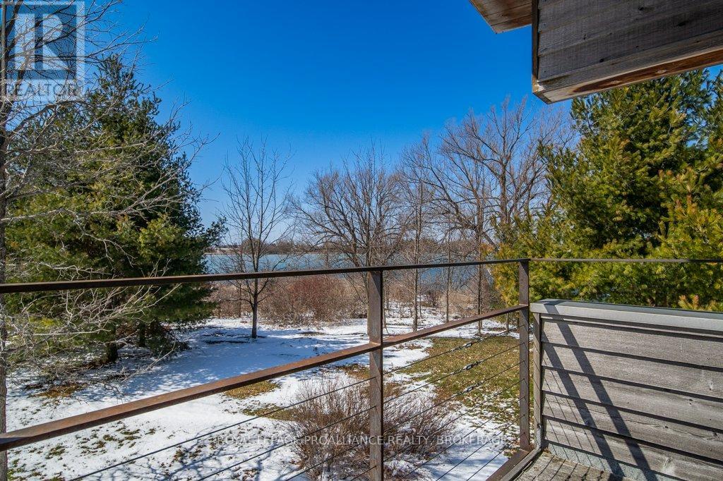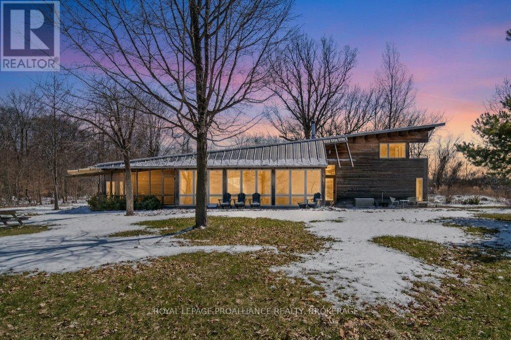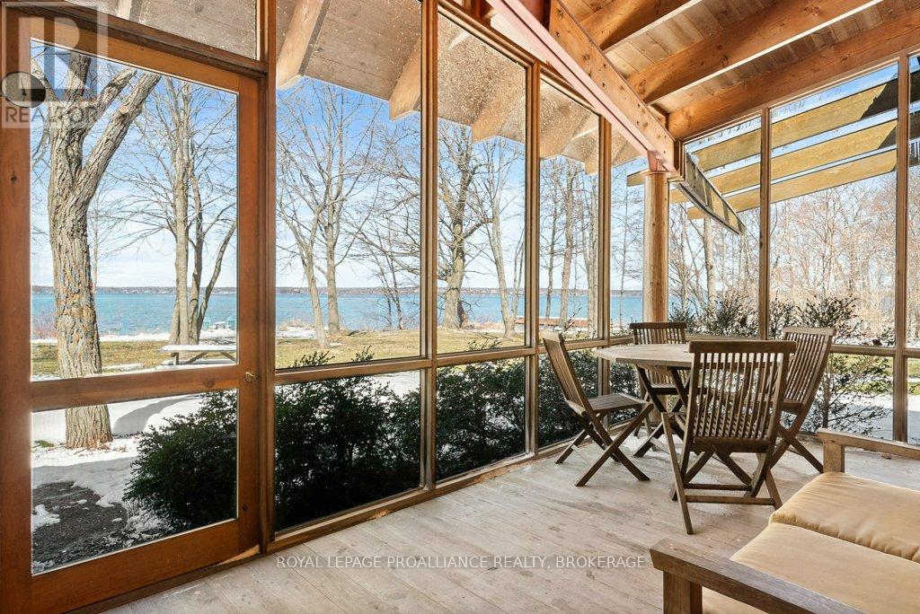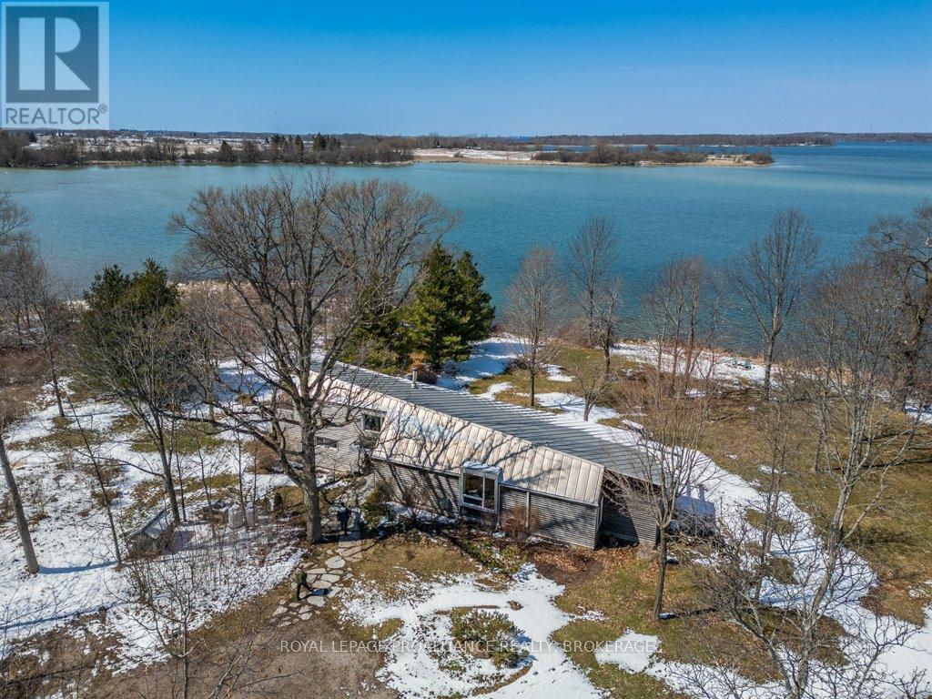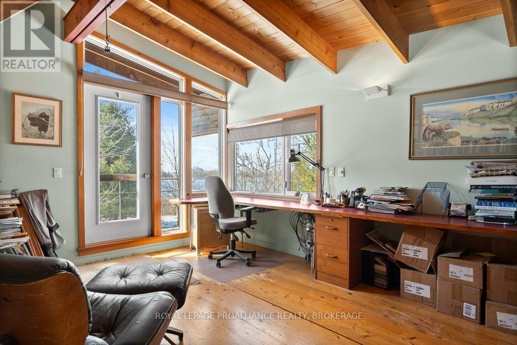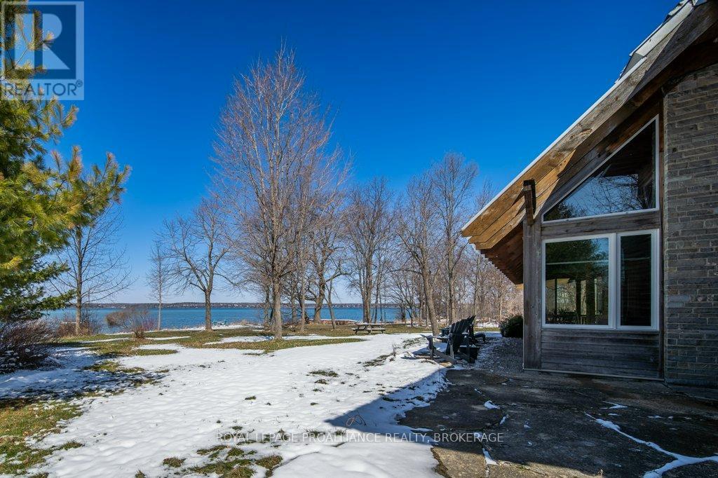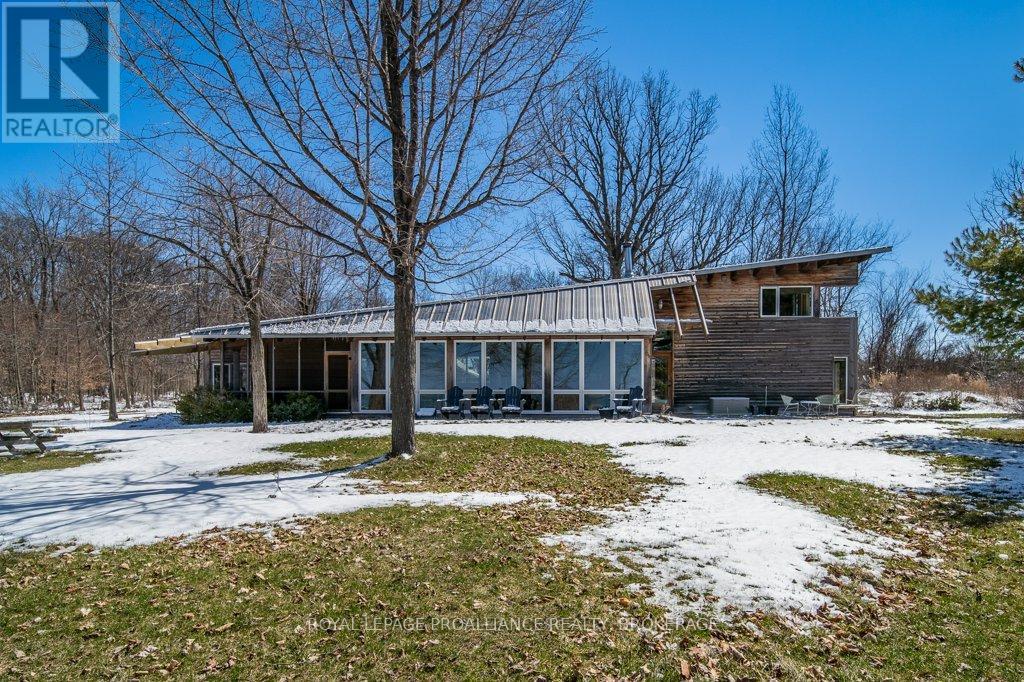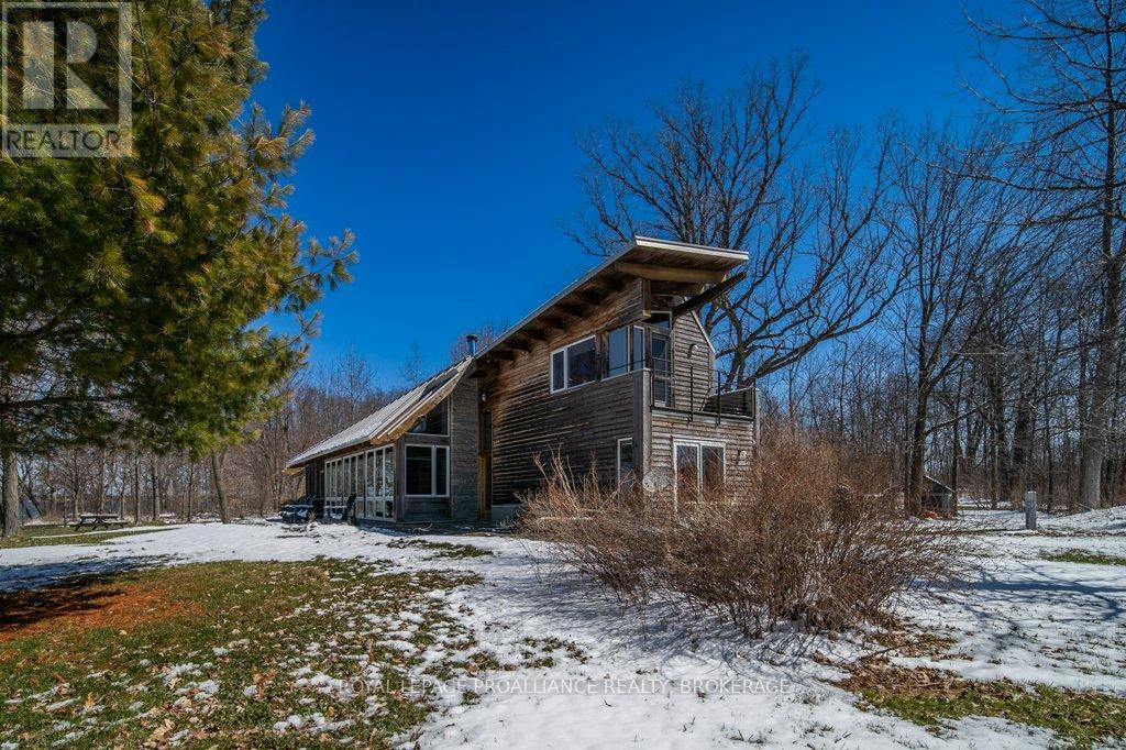 Very private waterfront home, on 24 acres with 505 feet of shoreline on the St. Lawrence River on the north shore of Wolfe Island. This architectural gem is a masterpiece, designed and built by some of the area's finest craftsmen. Its unique design draws inspiration from an upside-down boat, making it truly one-of-a-kind. The red cedar siding and soft-toned sloping steel roof blend seamlessly with the surrounding nature. You'll be amazed by the wall of floor-to-ceiling windows that offer breathtaking views of the bay, river, and countless waterfowl. The home's features include stunning vaulted ceiling with exposed Douglas fir Columns , spruce upper deck, and the open concept kitchen, and dining room that leads out to a cozy screened-in porch, living room with woodstove, and stunning interior limestone chimney. Enjoy the comfort of slab-on-grade heating on the cork and poured concrete flooring. The principal bedroom, with a four-piece ensuite, walk-in closet, and patio door, leads to a sitting area overlooking the water. The open stairwell leads to an office with incredible views and side deck. This space could be easily converted into an additional bedroom. On the other side of the great room, you'll find a guest room with patio doors leading to an outside sitting area and a second full bathroom. The home's layout and design offer ample storage where needed. Outside is a three-bay garage with a workshop, perfect for home improvement projects and storing your toys. The clean waterfront is perfect for swimming, or to jump into your boat and head to Kingston for dinner or down the river to explore the 1000 Islands. Hike your own private trails, and appreciate the decades of love and dedication poured into this wildlife oasis. Watch the breathtaking sunsets over McDonell Bay and the mainland, light a bonfire, and gaze at the stars in the dark night sky. Escape the hustle and bustle of city life, and discover the wonders of this wonderful community. (id:28469)