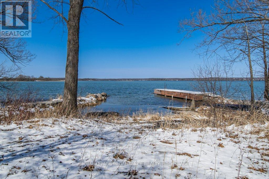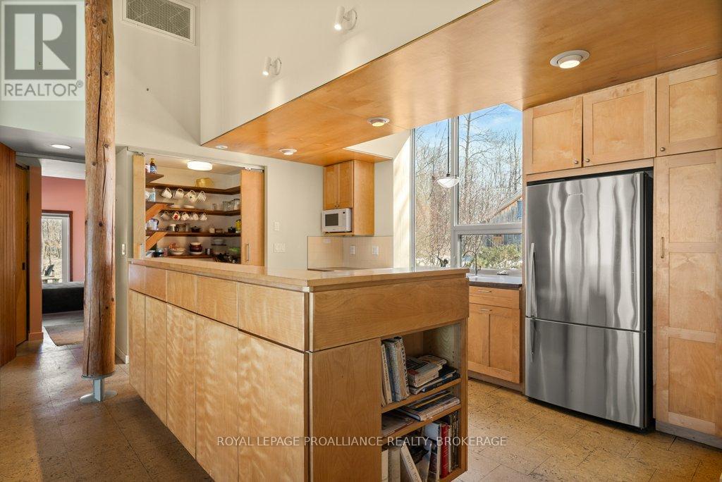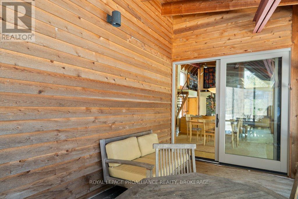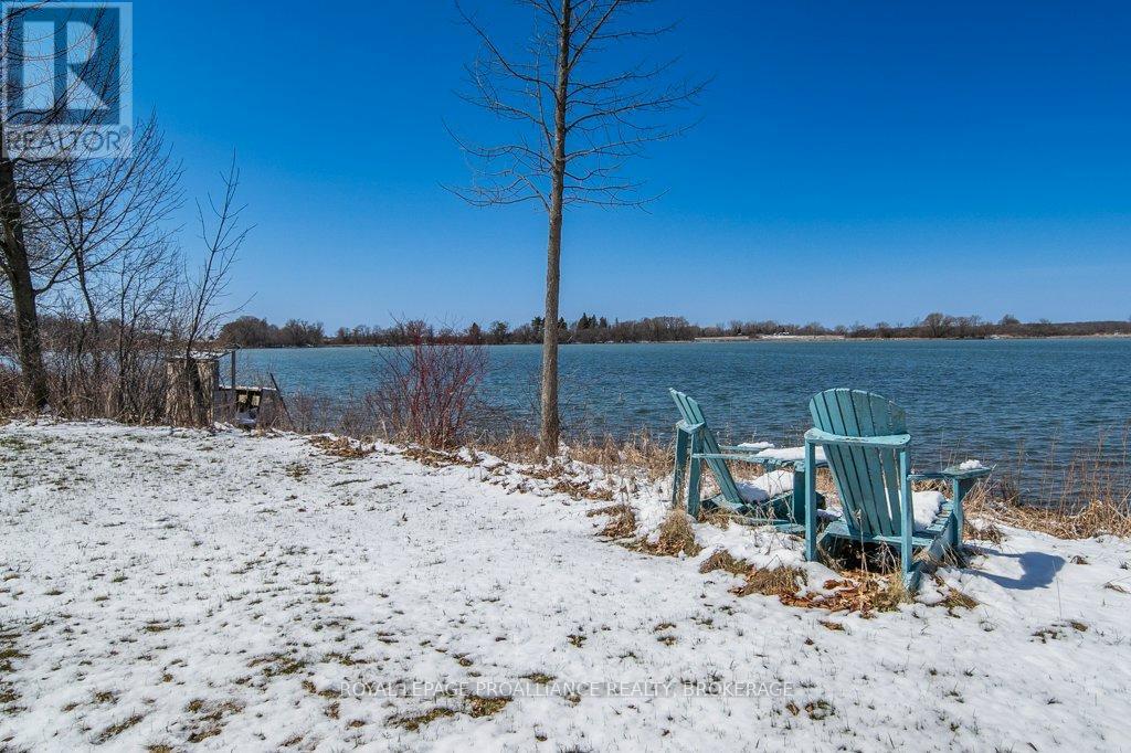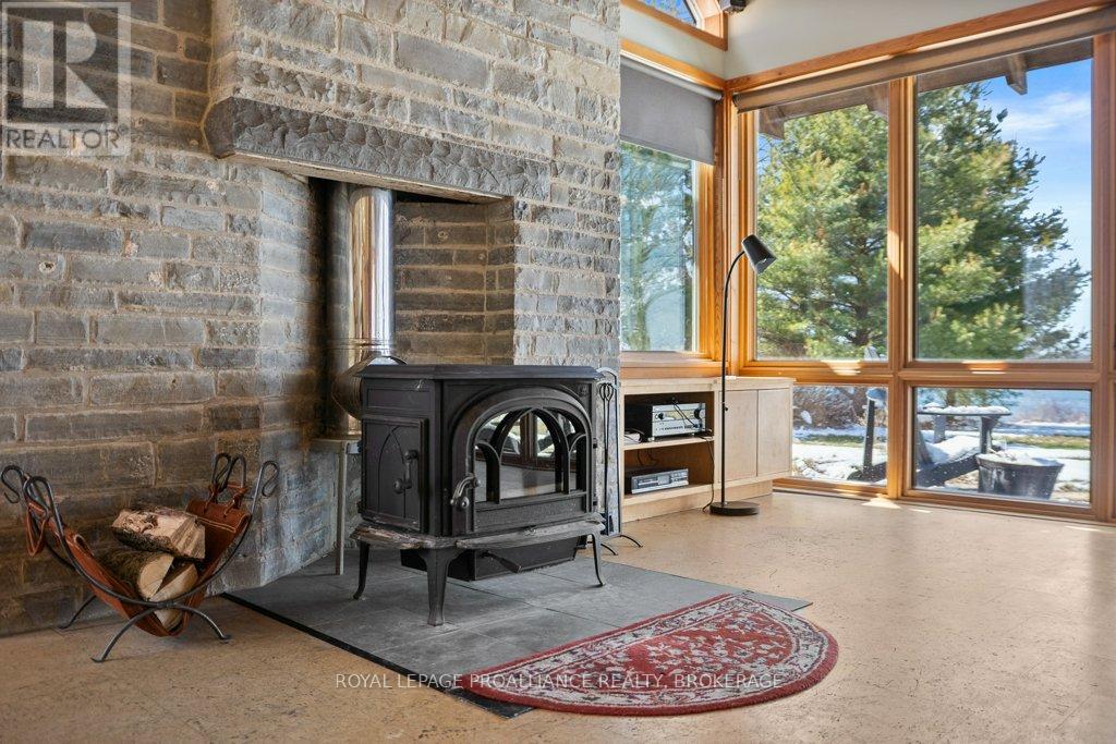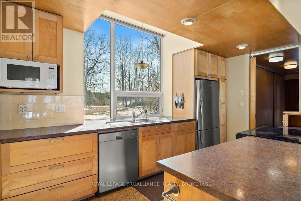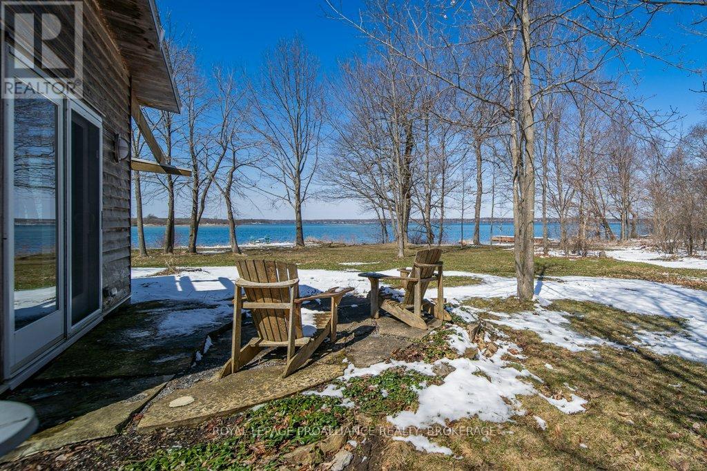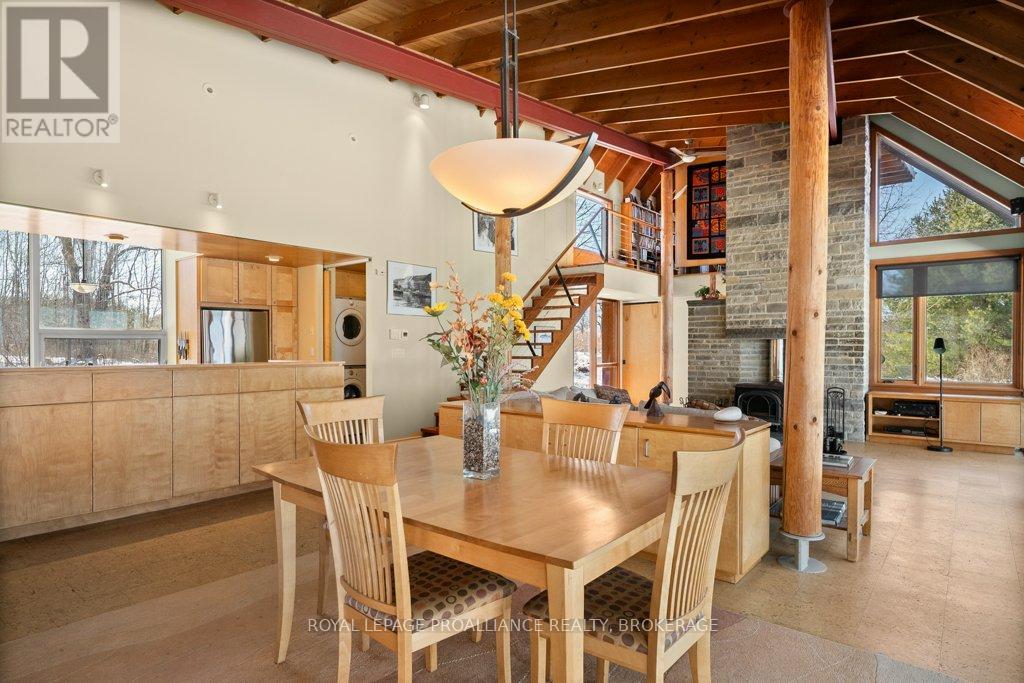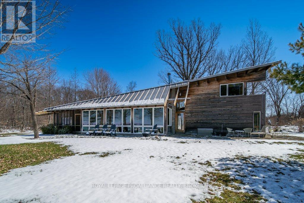 Very private waterfront home, on 24 acres with 505 feet of shoreline on the St. Lawrence River on the north shore of Wolfe Island. This architectural gem is a masterpiece, designed and built by some of the area's finest craftsmen. Its unique design draws inspiration from an upside-down boat, making it truly one-of-a-kind. The red cedar siding and soft-toned sloping steel roof blend seamlessly with the surrounding nature. You'll be amazed by the wall of floor-to-ceiling windows that offer breathtaking views of the bay, river, and countless waterfowl. The home's features include stunning vaulted ceiling with exposed Douglas fir Columns , spruce upper deck, and the open concept kitchen, and dining room that leads out to a cozy screened-in porch, living room with woodstove, and stunning interior limestone chimney. Enjoy the comfort of slab-on-grade heating on the cork and poured concrete flooring. The principal bedroom, with a four-piece ensuite, walk-in closet, and patio door, leads to a sitting area overlooking the water. The open stairwell leads to an office with incredible views and side deck. This space could be easily converted into an additional bedroom. On the other side of the great room, you'll find a guest room with patio doors leading to an outside sitting area and a second full bathroom. The home's layout and design offer ample storage where needed. Outside is a three-bay garage with a workshop, perfect for home improvement projects and storing your toys. The clean waterfront is perfect for swimming, or to jump into your boat and head to Kingston for dinner or down the river to explore the 1000 Islands. Hike your own private trails, and appreciate the decades of love and dedication poured into this wildlife oasis. Watch the breathtaking sunsets over McDonell Bay and the mainland, light a bonfire, and gaze at the stars in the dark night sky. Escape the hustle and bustle of city life, and discover the wonders of this wonderful community. (id:28469)