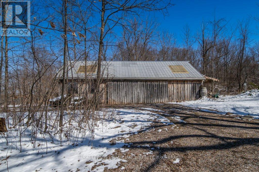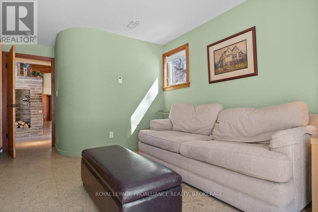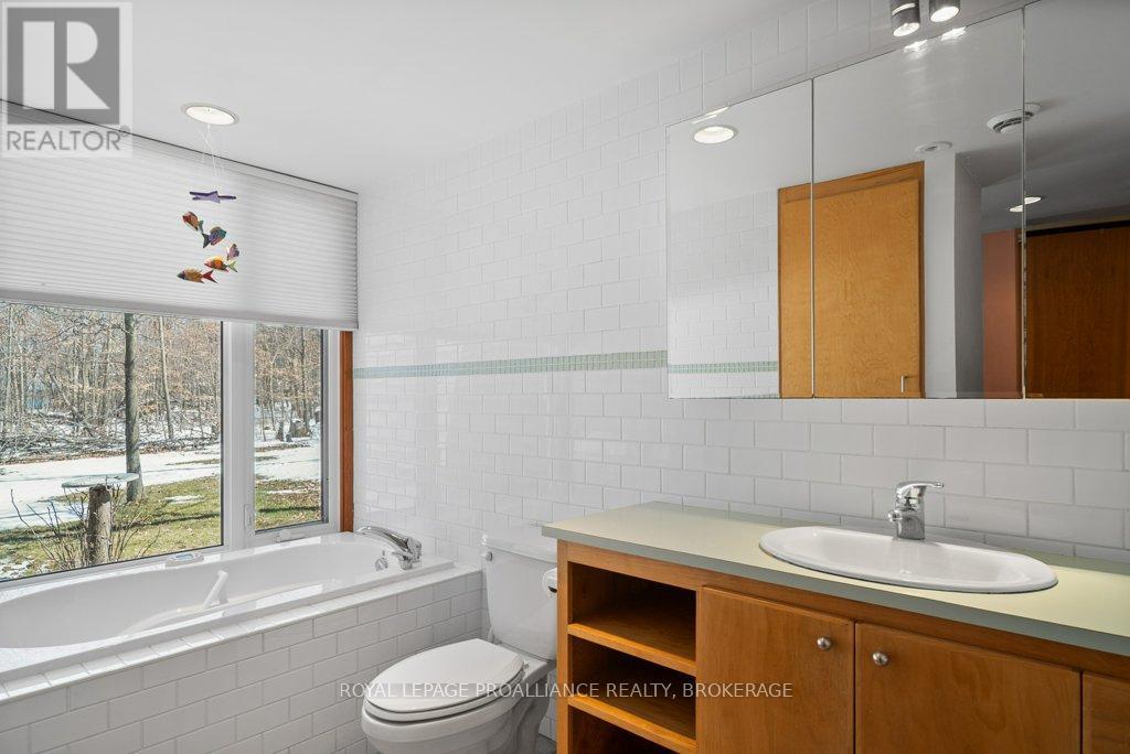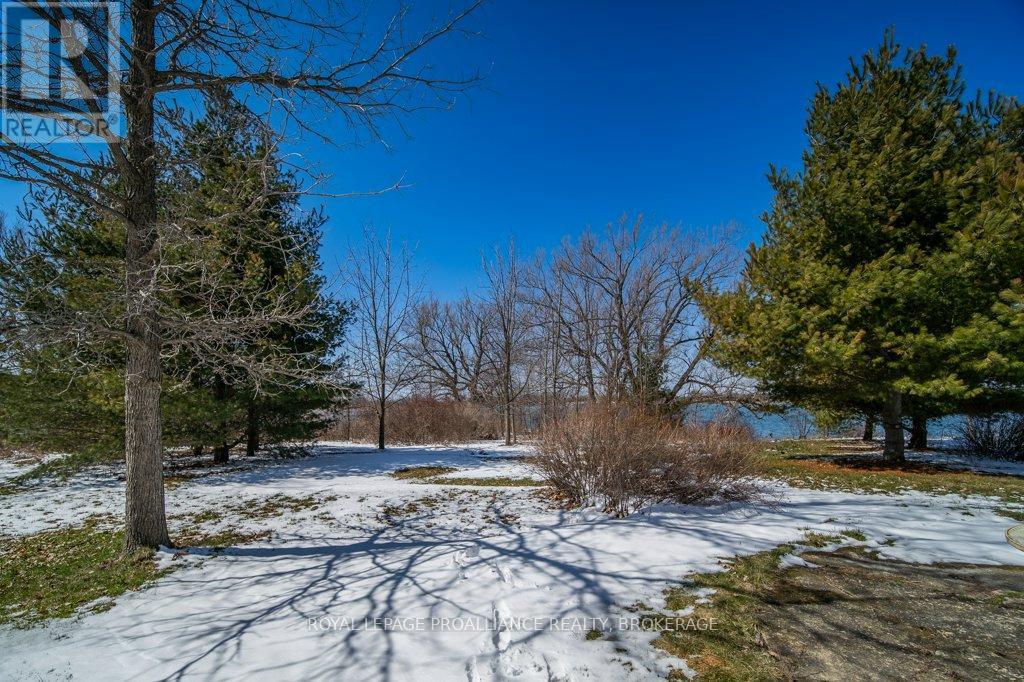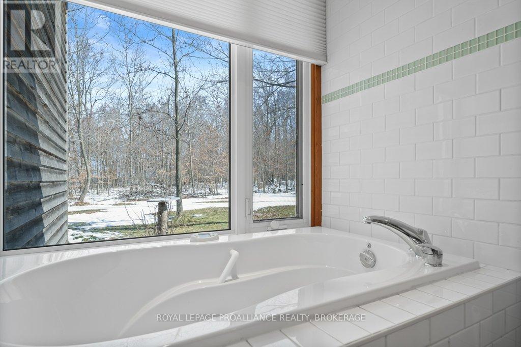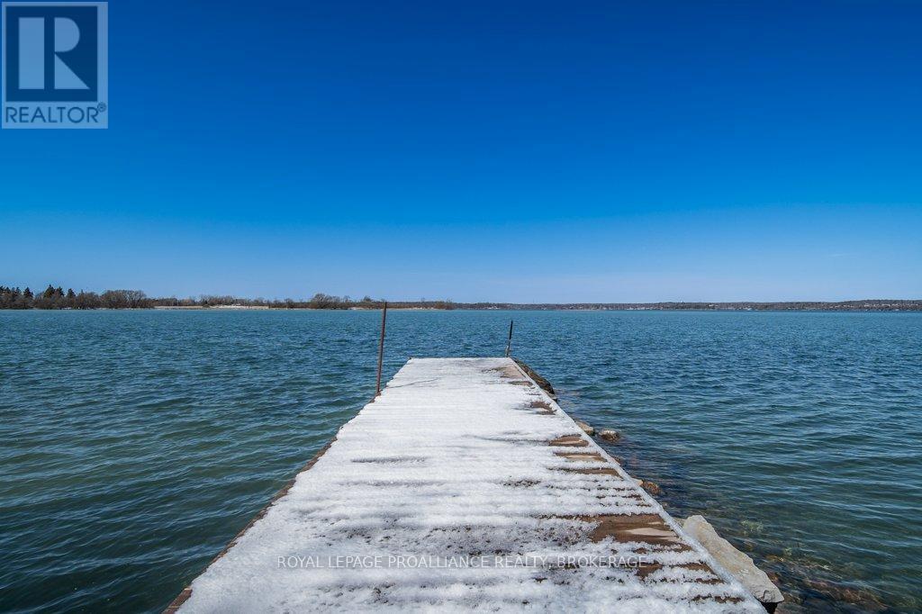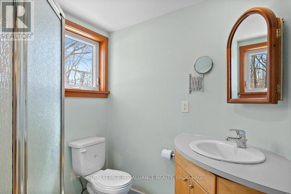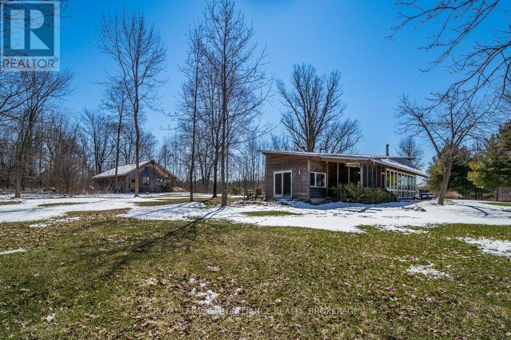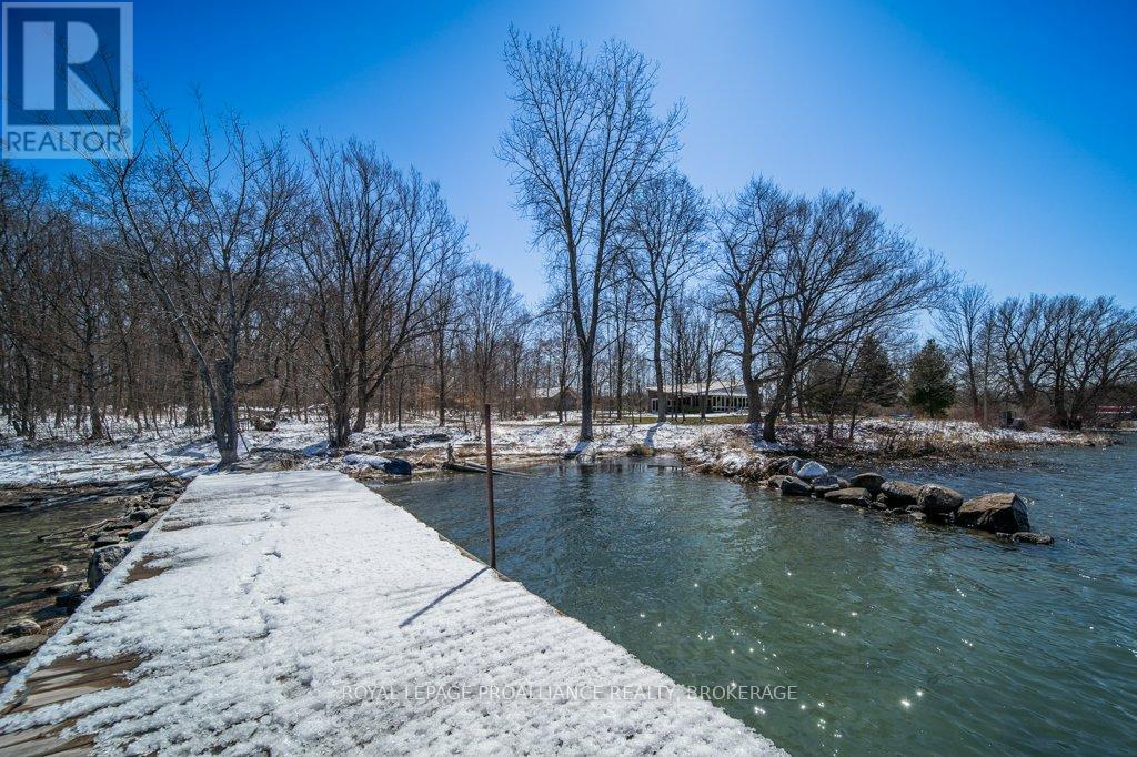 Very private waterfront home, on 24 acres with 505 feet of shoreline on the St. Lawrence River on the north shore of Wolfe Island. This architectural gem is a masterpiece, designed and built by some of the area's finest craftsmen. Its unique design draws inspiration from an upside-down boat, making it truly one-of-a-kind. The red cedar siding and soft-toned sloping steel roof blend seamlessly with the surrounding nature. You'll be amazed by the wall of floor-to-ceiling windows that offer breathtaking views of the bay, river, and countless waterfowl. The home's features include stunning vaulted ceiling with exposed Douglas fir Columns , spruce upper deck, and the open concept kitchen, and dining room that leads out to a cozy screened-in porch, living room with woodstove, and stunning interior limestone chimney. Enjoy the comfort of slab-on-grade heating on the cork and poured concrete flooring. The principal bedroom, with a four-piece ensuite, walk-in closet, and patio door, leads to a sitting area overlooking the water. The open stairwell leads to an office with incredible views and side deck. This space could be easily converted into an additional bedroom. On the other side of the great room, you'll find a guest room with patio doors leading to an outside sitting area and a second full bathroom. The home's layout and design offer ample storage where needed. Outside is a three-bay garage with a workshop, perfect for home improvement projects and storing your toys. The clean waterfront is perfect for swimming, or to jump into your boat and head to Kingston for dinner or down the river to explore the 1000 Islands. Hike your own private trails, and appreciate the decades of love and dedication poured into this wildlife oasis. Watch the breathtaking sunsets over McDonell Bay and the mainland, light a bonfire, and gaze at the stars in the dark night sky. Escape the hustle and bustle of city life, and discover the wonders of this wonderful community. (id:28469)