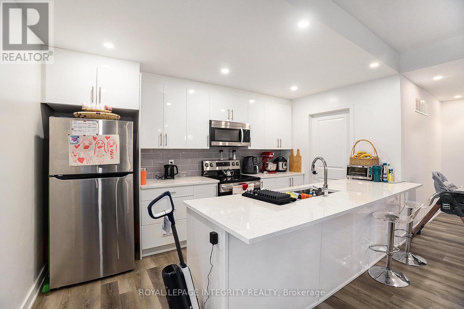 This bright and modern 2-bedroom + den, 1.5-bath lower-level stacked townhome offers stylish living with a spacious open-concept kitchen, living, and dining area. The contemporary kitchen is equipped with sleek stainless steel appliances, perfect for cooking and entertaining. Spacious primary bedroom and second bedroom, and a den that provides a versatile living space. Potlights throughout add to the home's ambiance, and large windows bring in plenty of natural light. Enjoy outdoor living with a private terrace. One parking spot is included. A perfect blend of comfort and convenience! (id:28469)